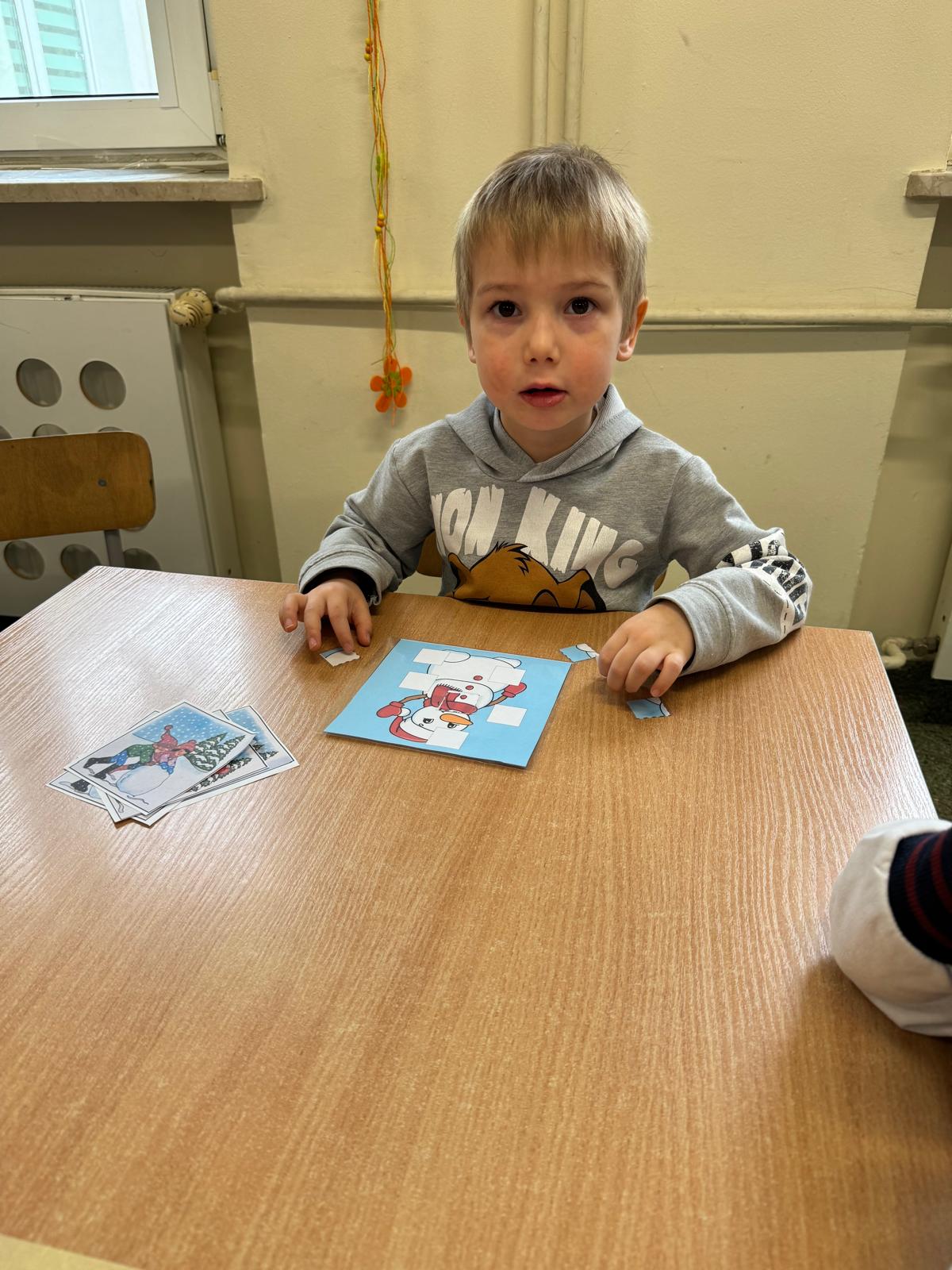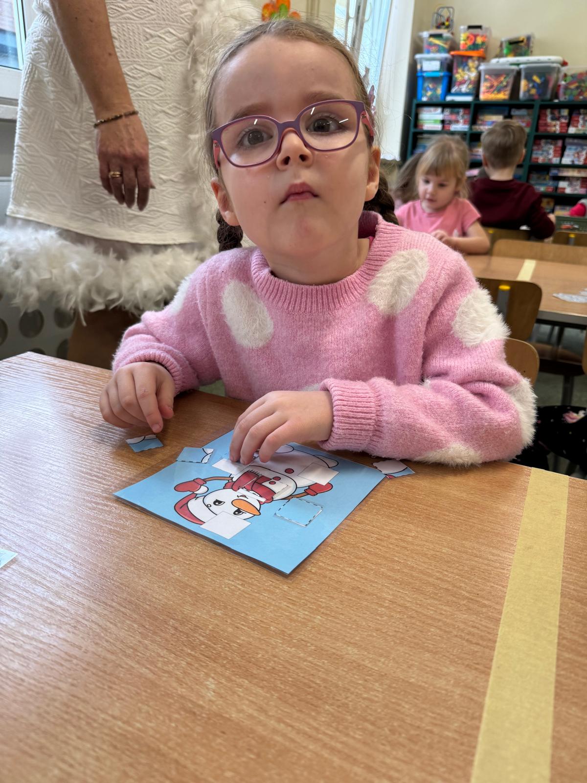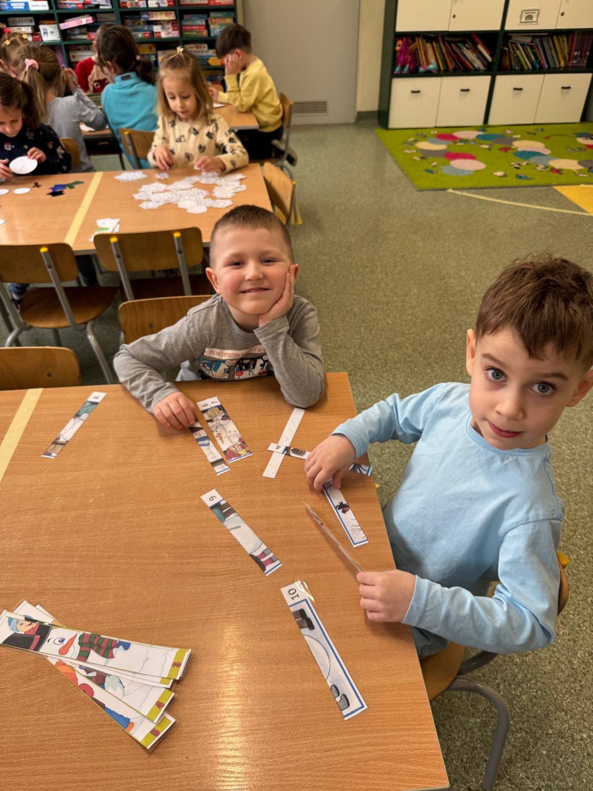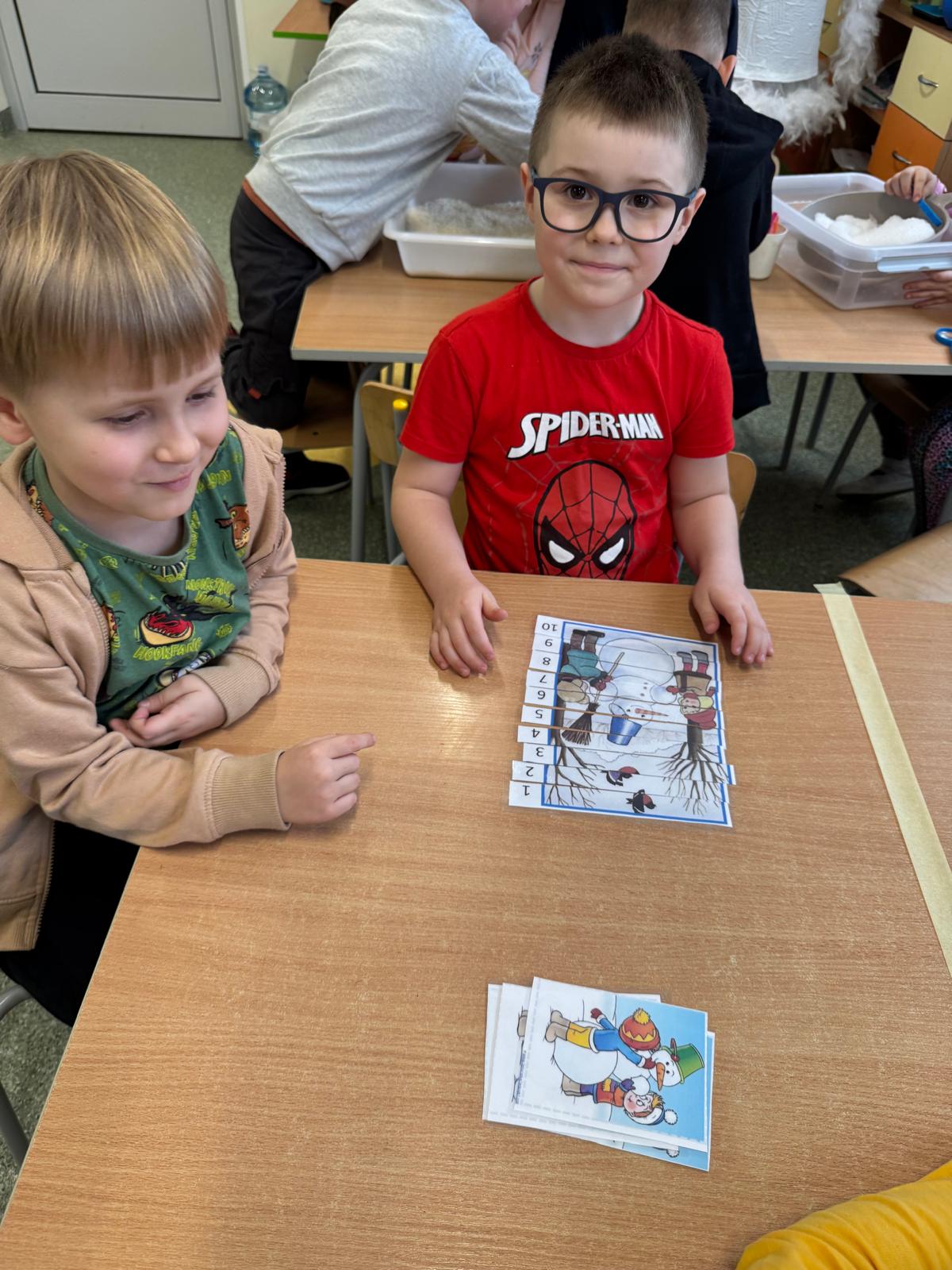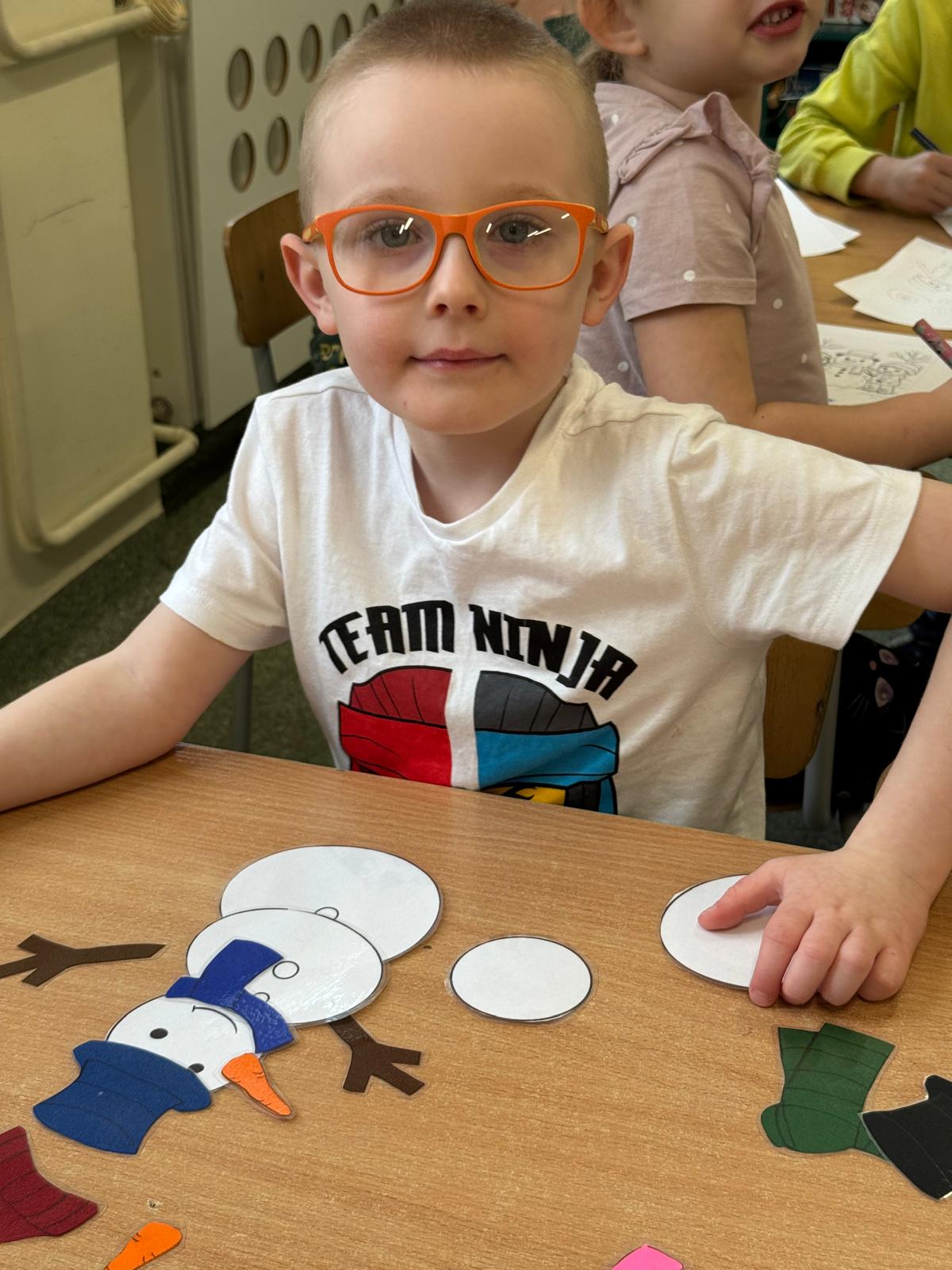 Tutaj przedszkolaki skupiły się na uważnej obserwacji. Dzieci układały zimowe puzzle, ćwicząc przy tym liczenie do 10, kolorowały według kodów i odnajdywały pary takich samych śnieżynek. Z lupami w dłoniach badały strukturę śniegu, sprawdzając, jakie tajemnice kryje w sobie biały puch. Na koniec pokonały pełen zakrętów tor przeszkód.