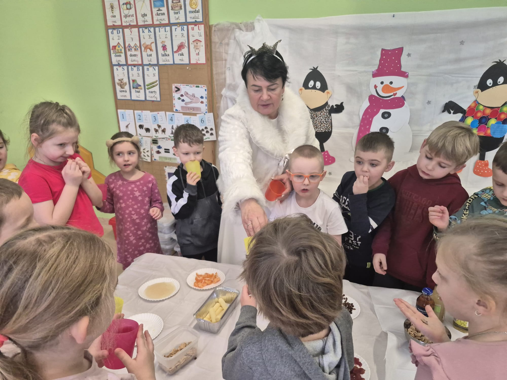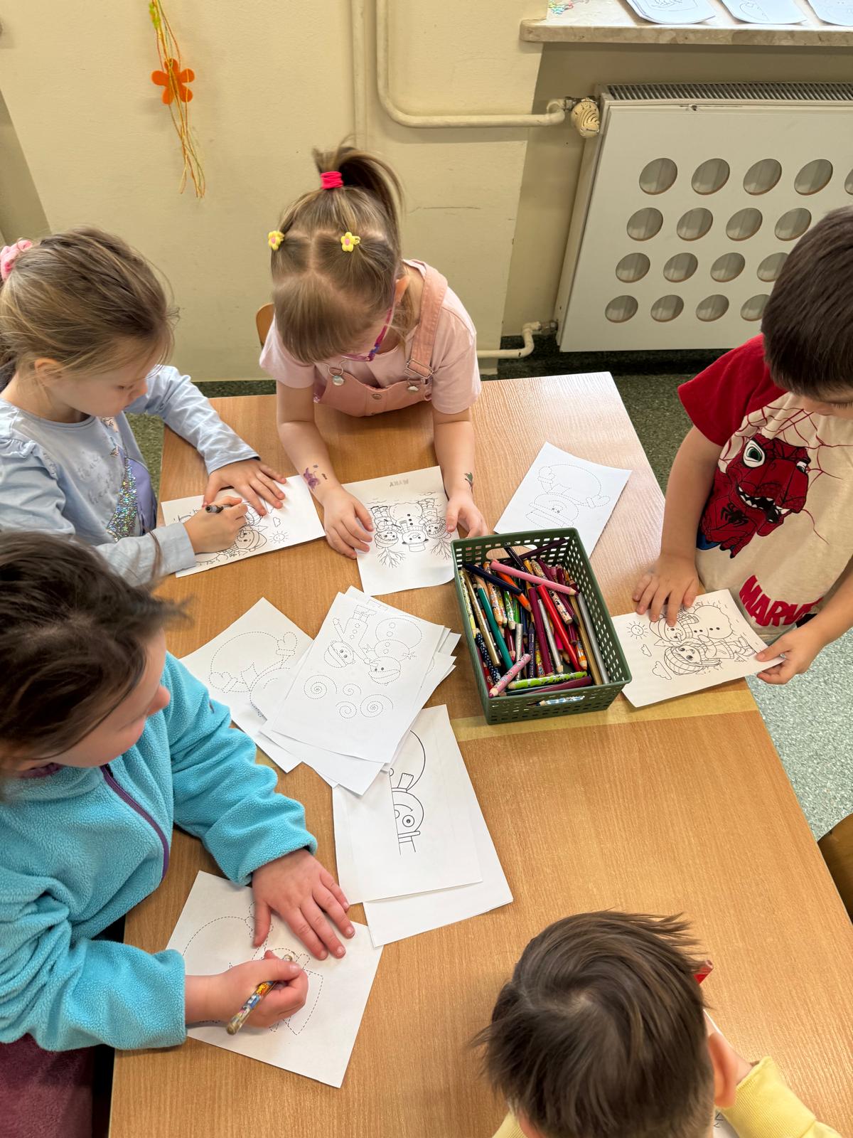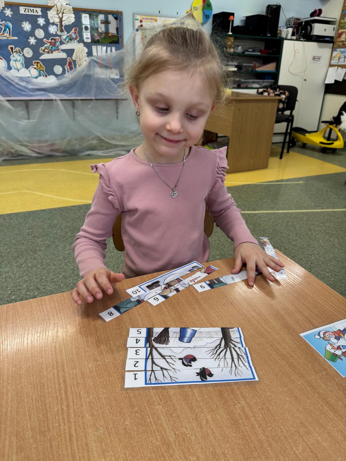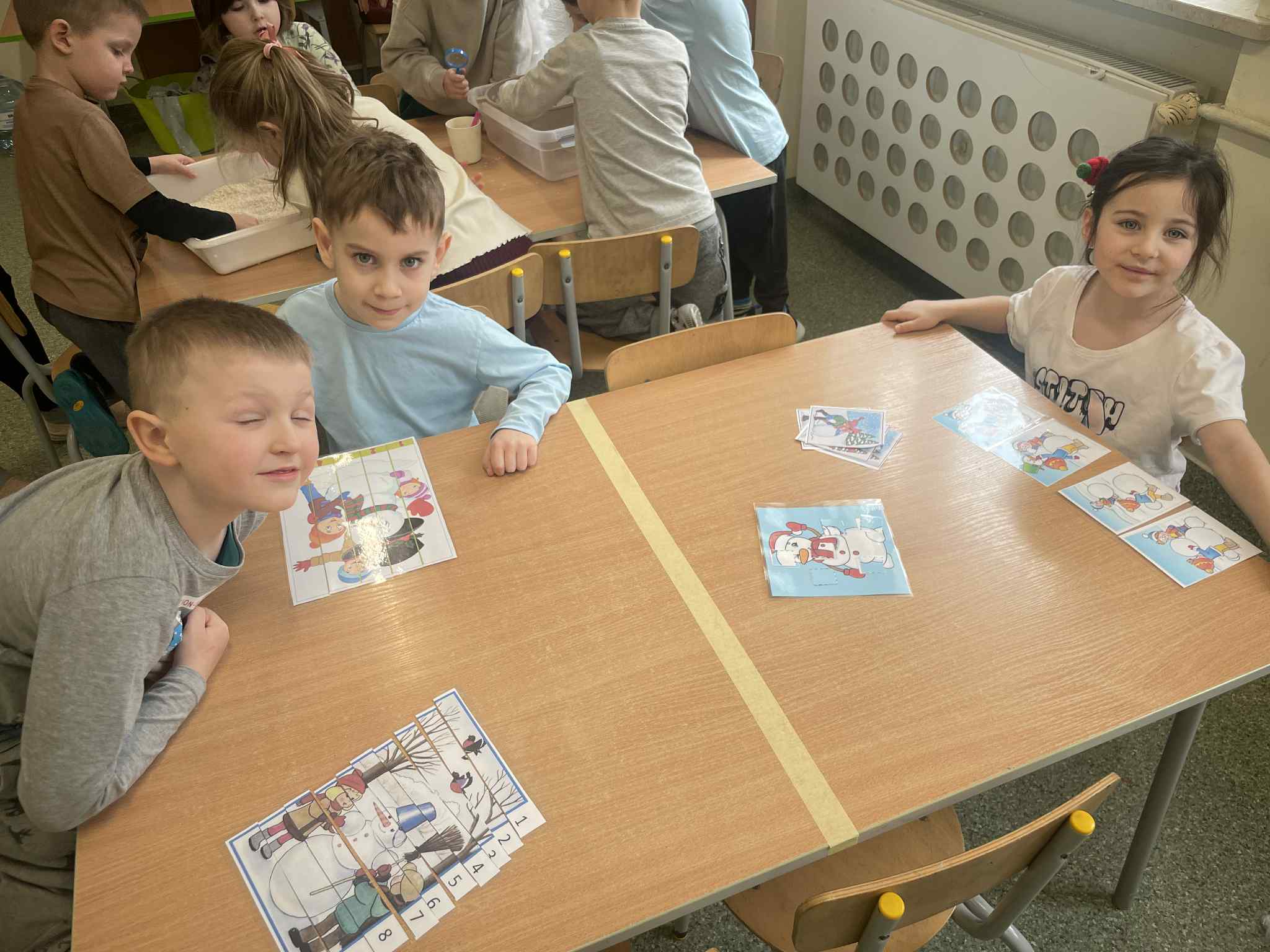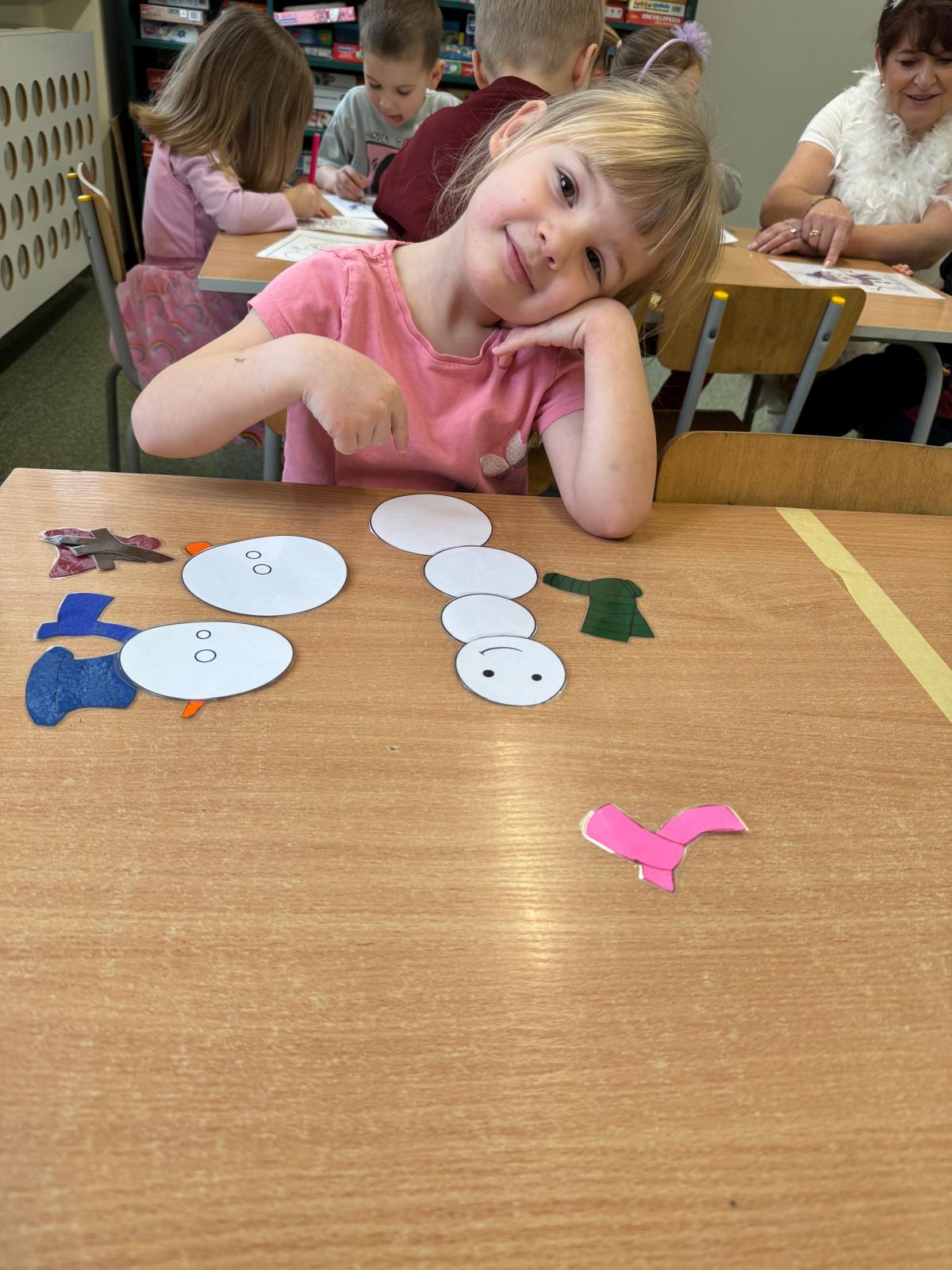 Tutaj przedszkolaki skupiły się na uważnej obserwacji. Dzieci układały zimowe puzzle, ćwicząc przy tym liczenie do 10, kolorowały według kodów i odnajdywały pary takich samych śnieżynek. Z lupami w dłoniach badały strukturę śniegu, sprawdzając, jakie tajemnice kryje w sobie biały puch. Na koniec pokonały pełen zakrętów tor przeszkód.