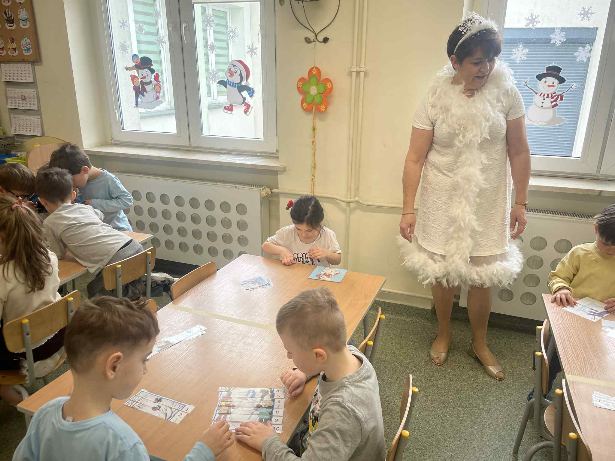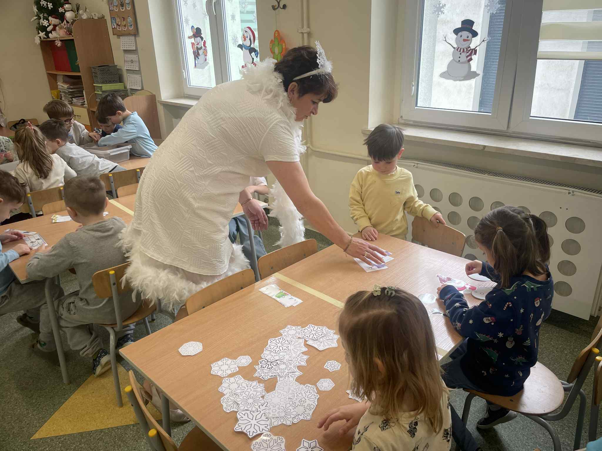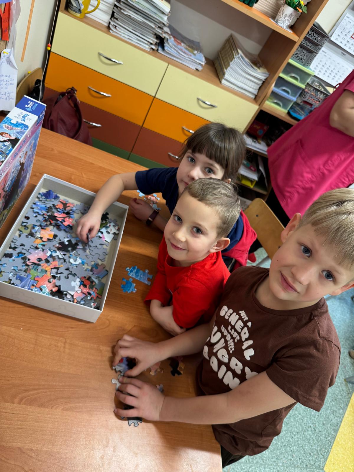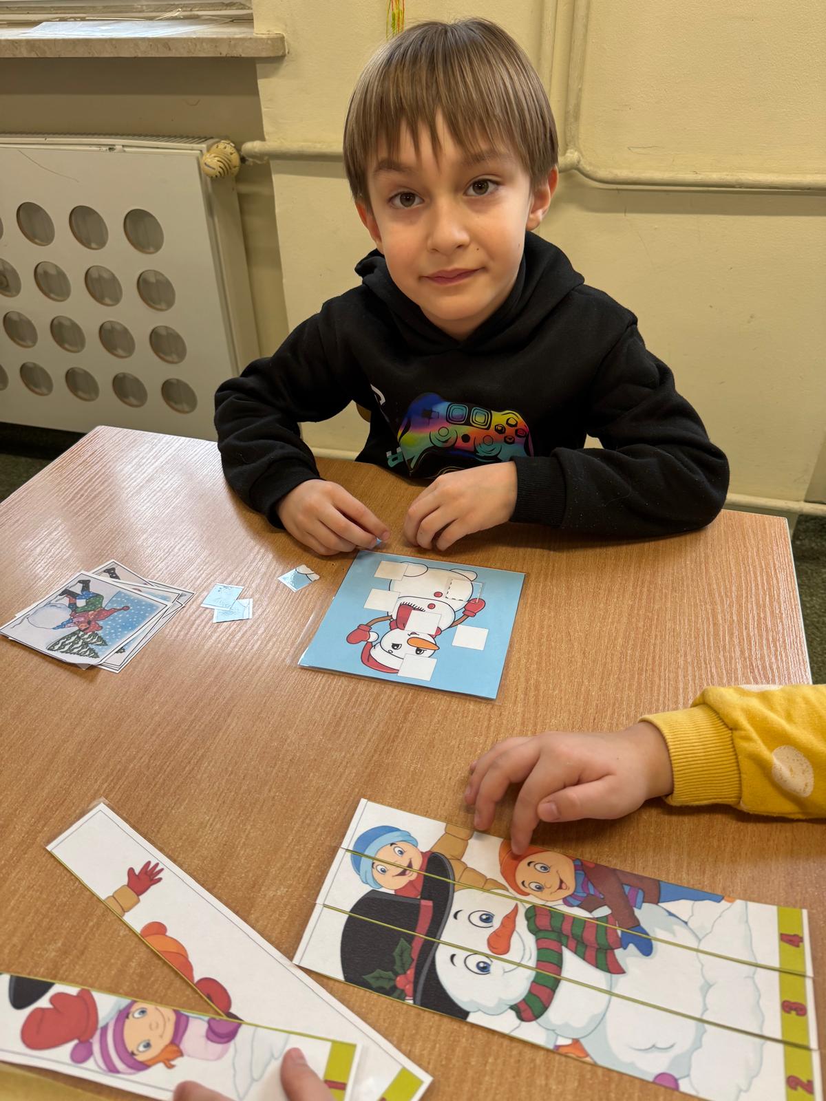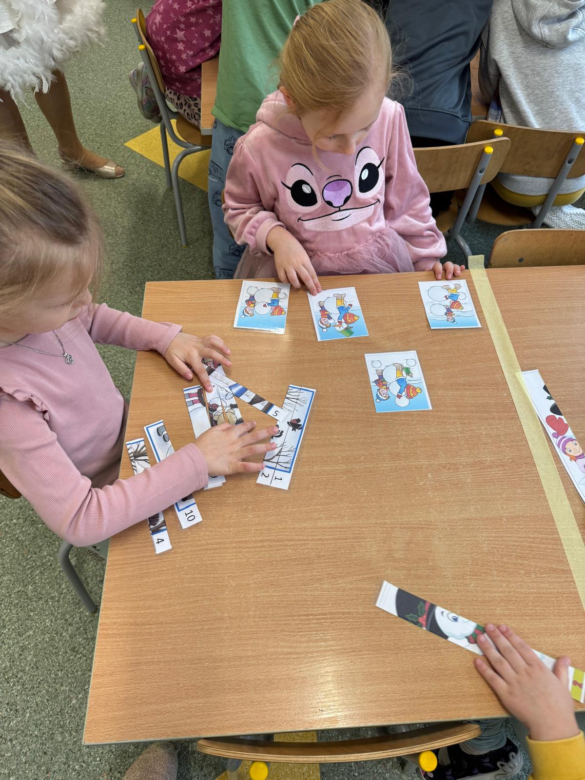 Tutaj przedszkolaki skupiły się na uważnej obserwacji. Dzieci układały zimowe puzzle, ćwicząc przy tym liczenie do 10, kolorowały według kodów i odnajdywały pary takich samych śnieżynek. Z lupami w dłoniach badały strukturę śniegu, sprawdzając, jakie tajemnice kryje w sobie biały puch. Na koniec pokonały pełen zakrętów tor przeszkód.