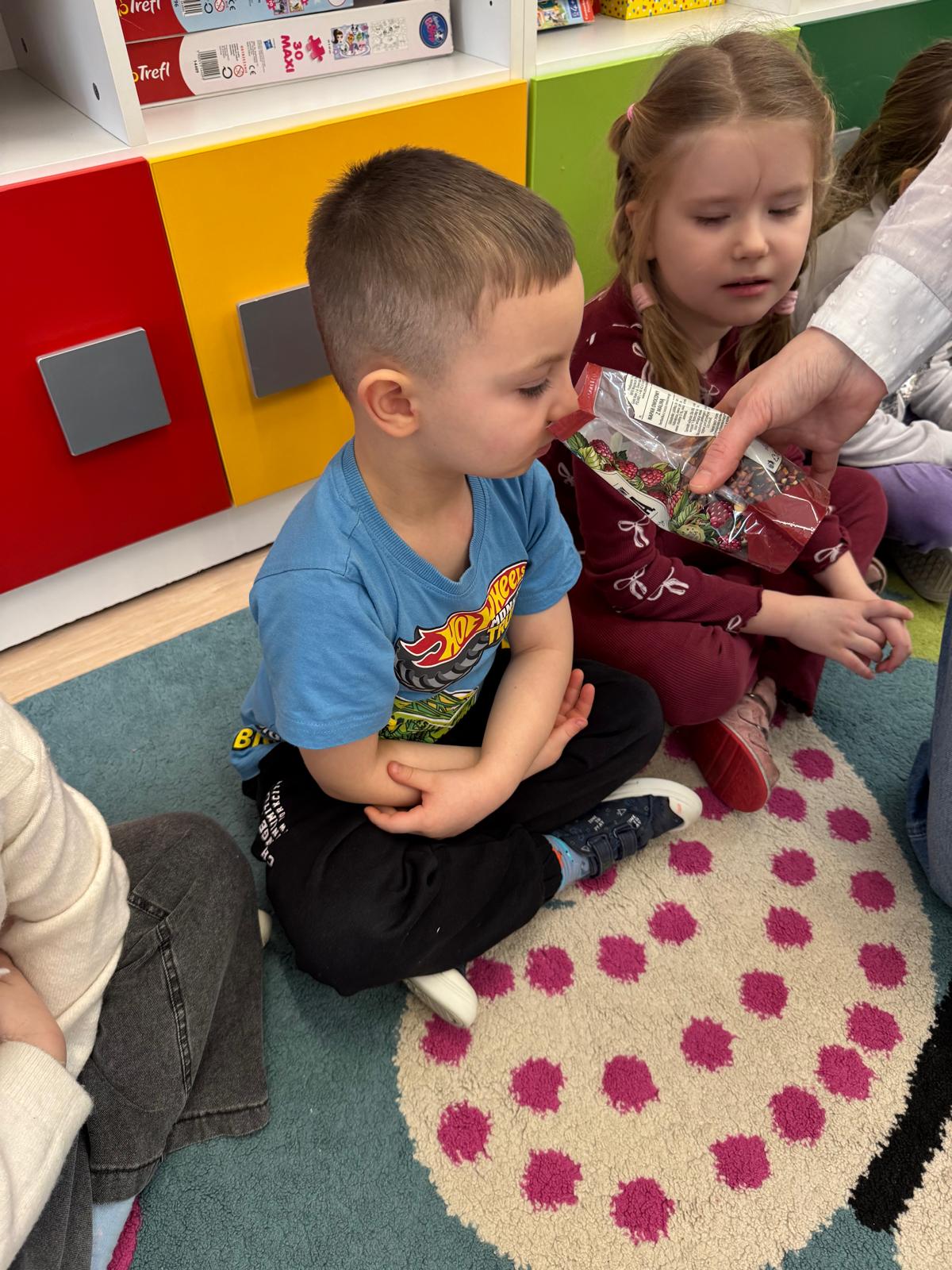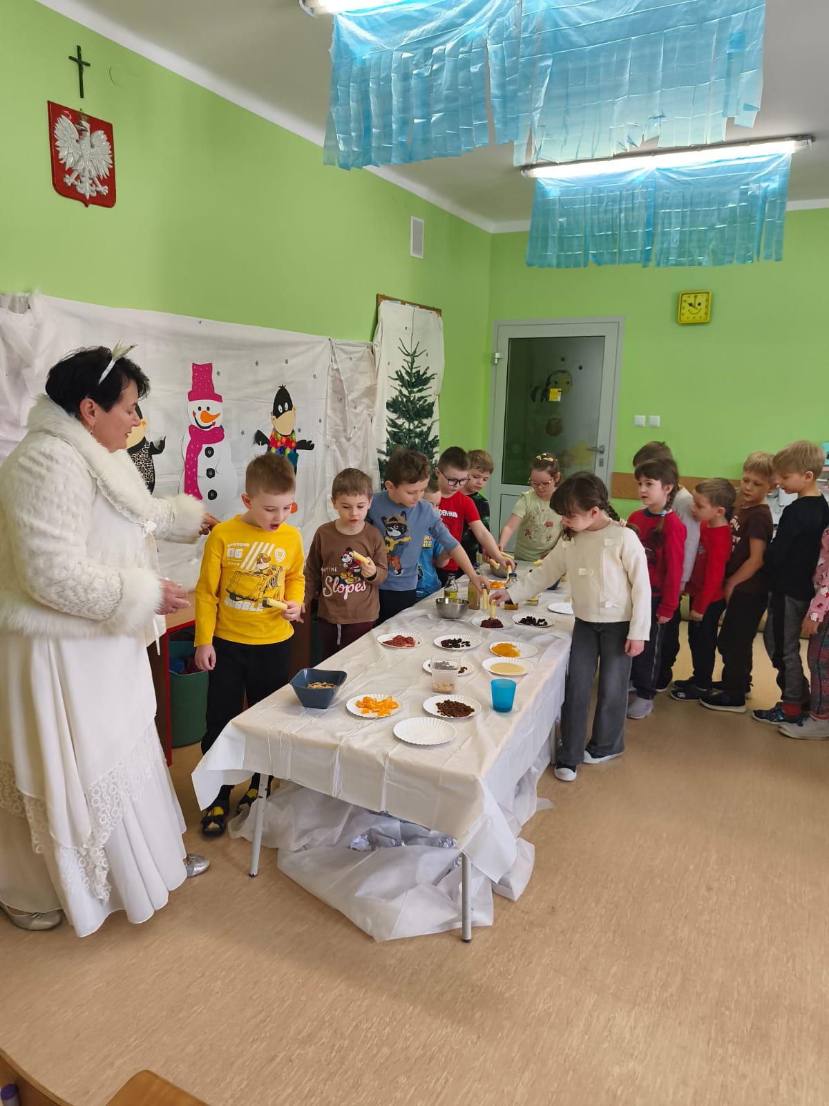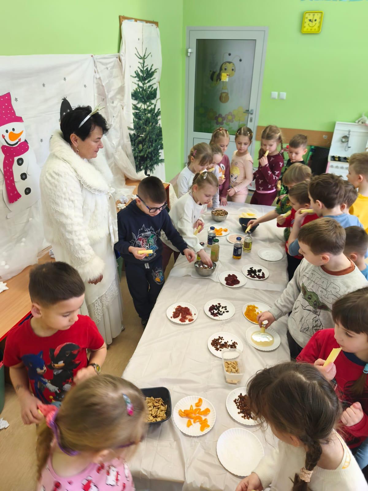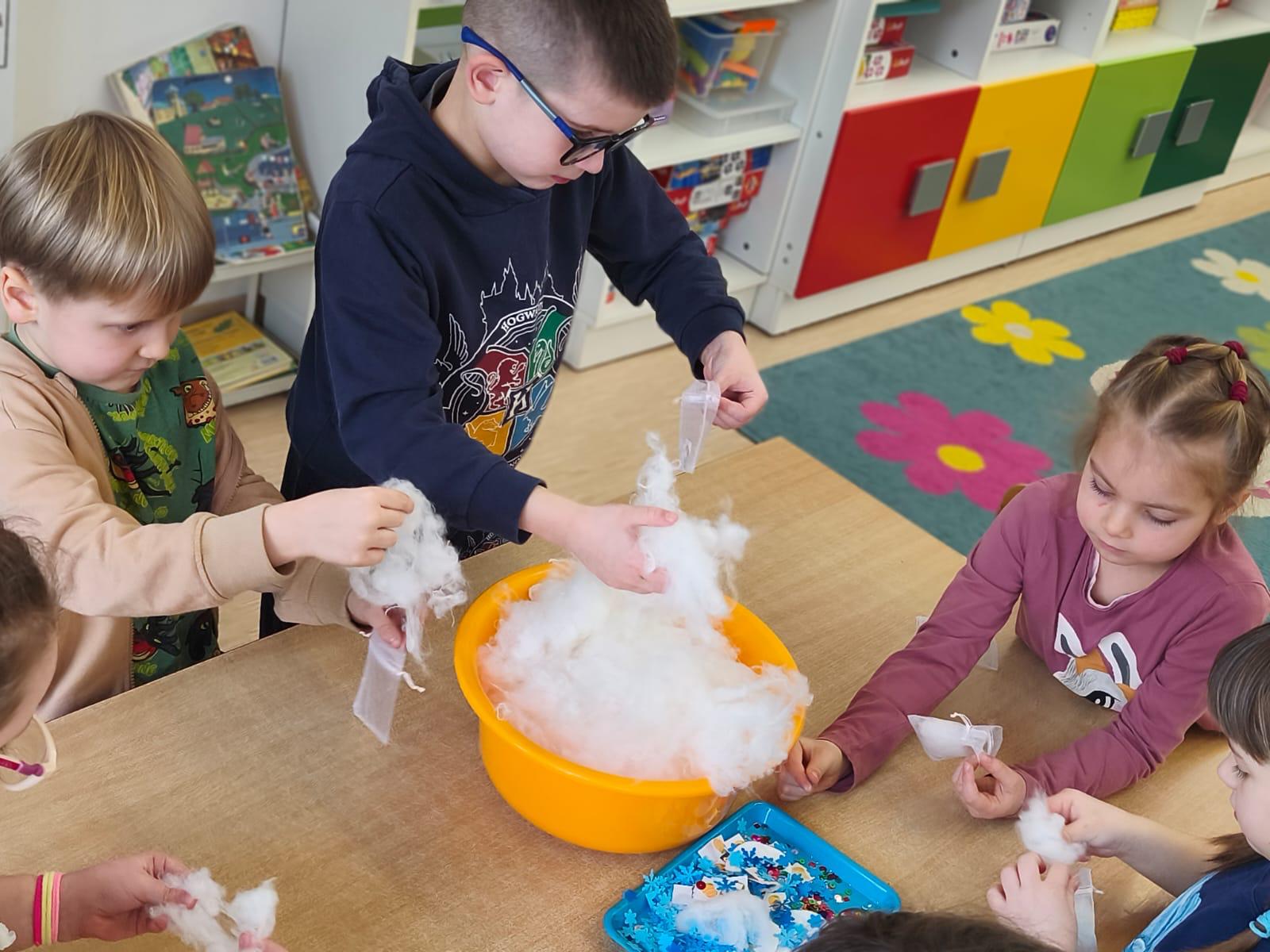 Przedszkolaki zamieniły się w małych odkrywców zapachów. Poznawały aromaty kojarzące się z zimowym czasem, takie jak goździki, cynamon, świerkowe igliwie czy suszone pomarańcze, a nawet zimowe herbatki. Dzieci stworzyły własne, pachnące woreczki sensoryczne, dzięki którym zabrały zapach zimy prosto do swoich domów.