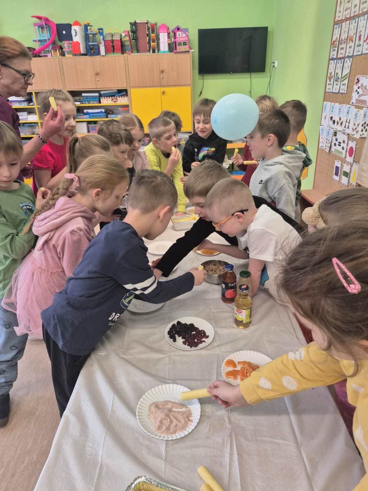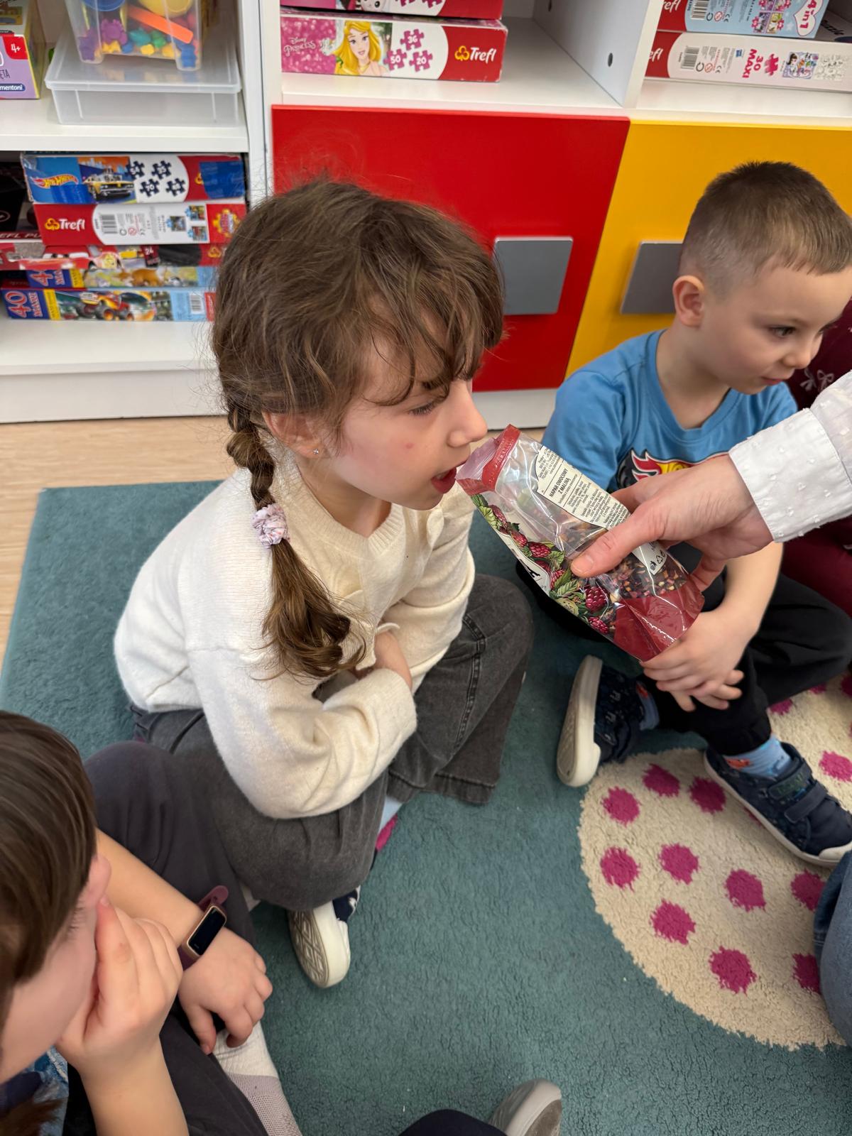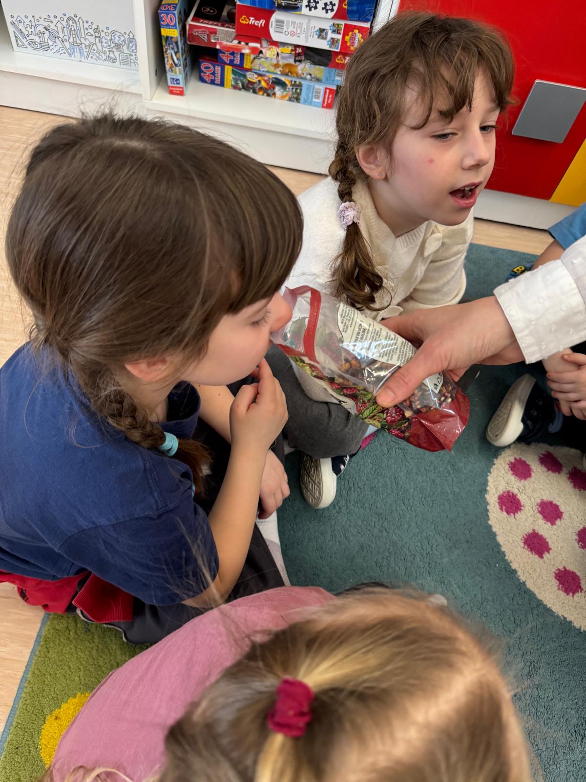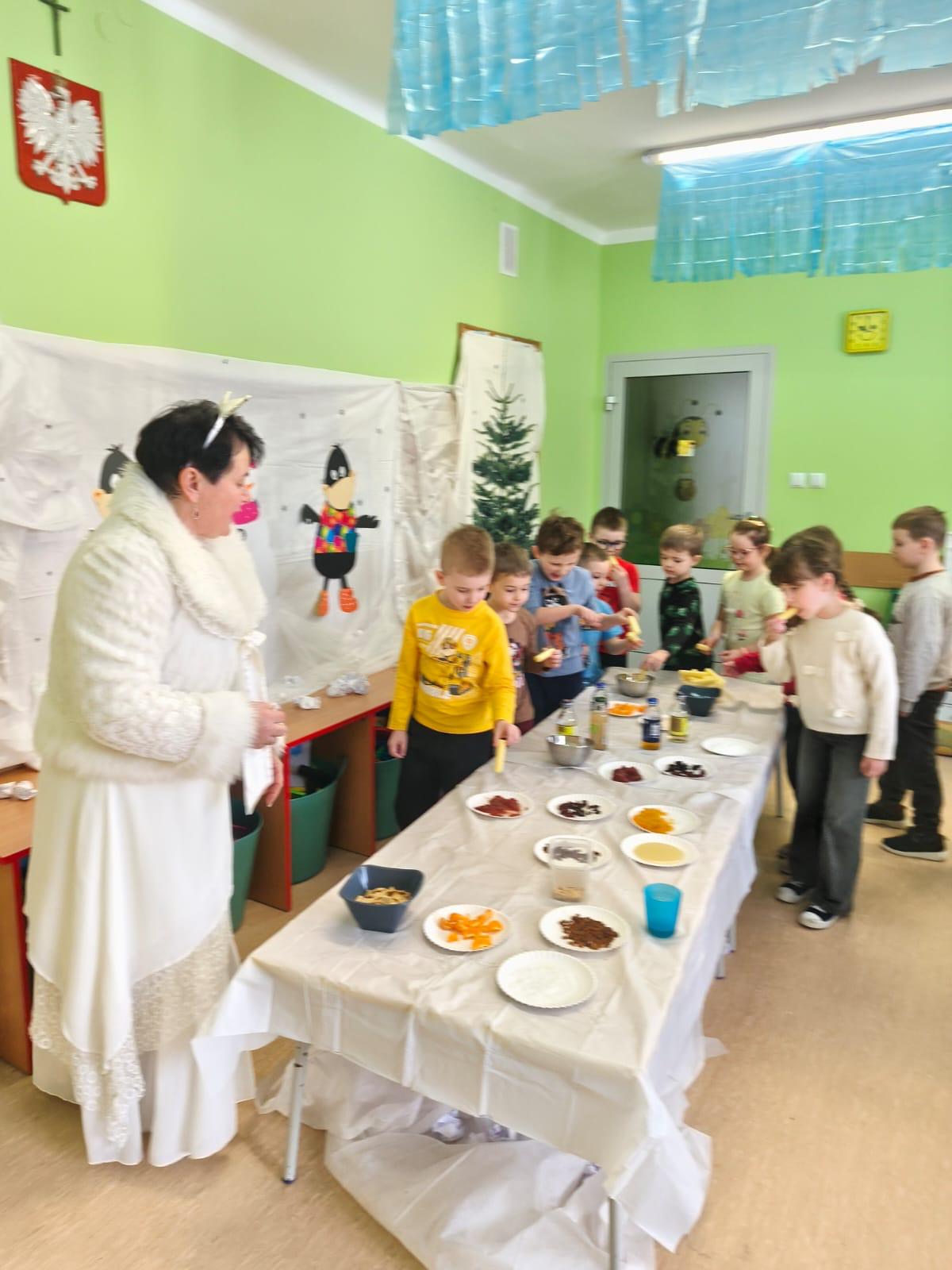 Przedszkolaki zamieniły się w małych odkrywców zapachów. Poznawały aromaty kojarzące się z zimowym czasem, takie jak goździki, cynamon, świerkowe igliwie czy suszone pomarańcze, a nawet zimowe herbatki. Dzieci stworzyły własne, pachnące woreczki sensoryczne, dzięki którym zabrały zapach zimy prosto do swoich domów.