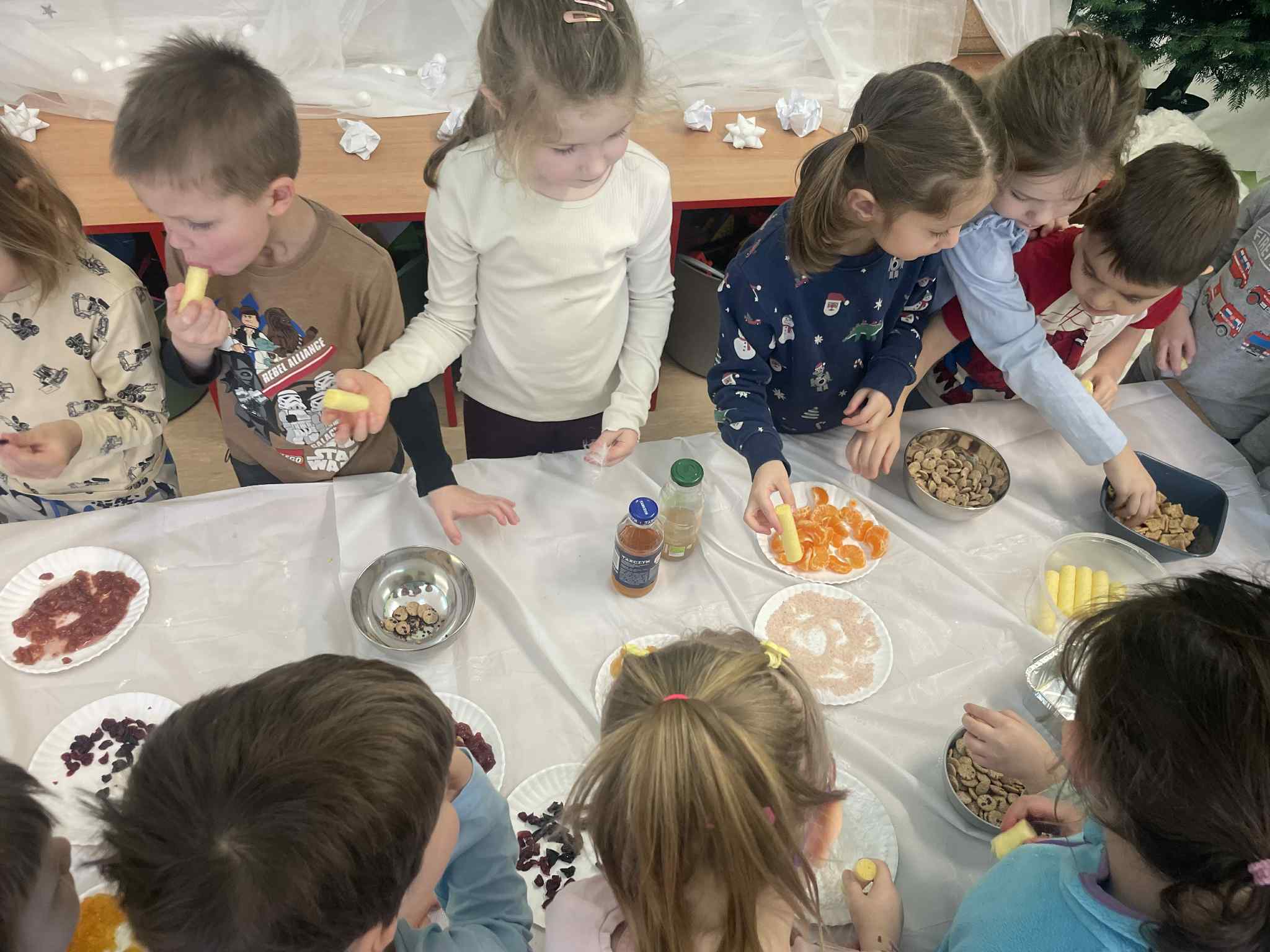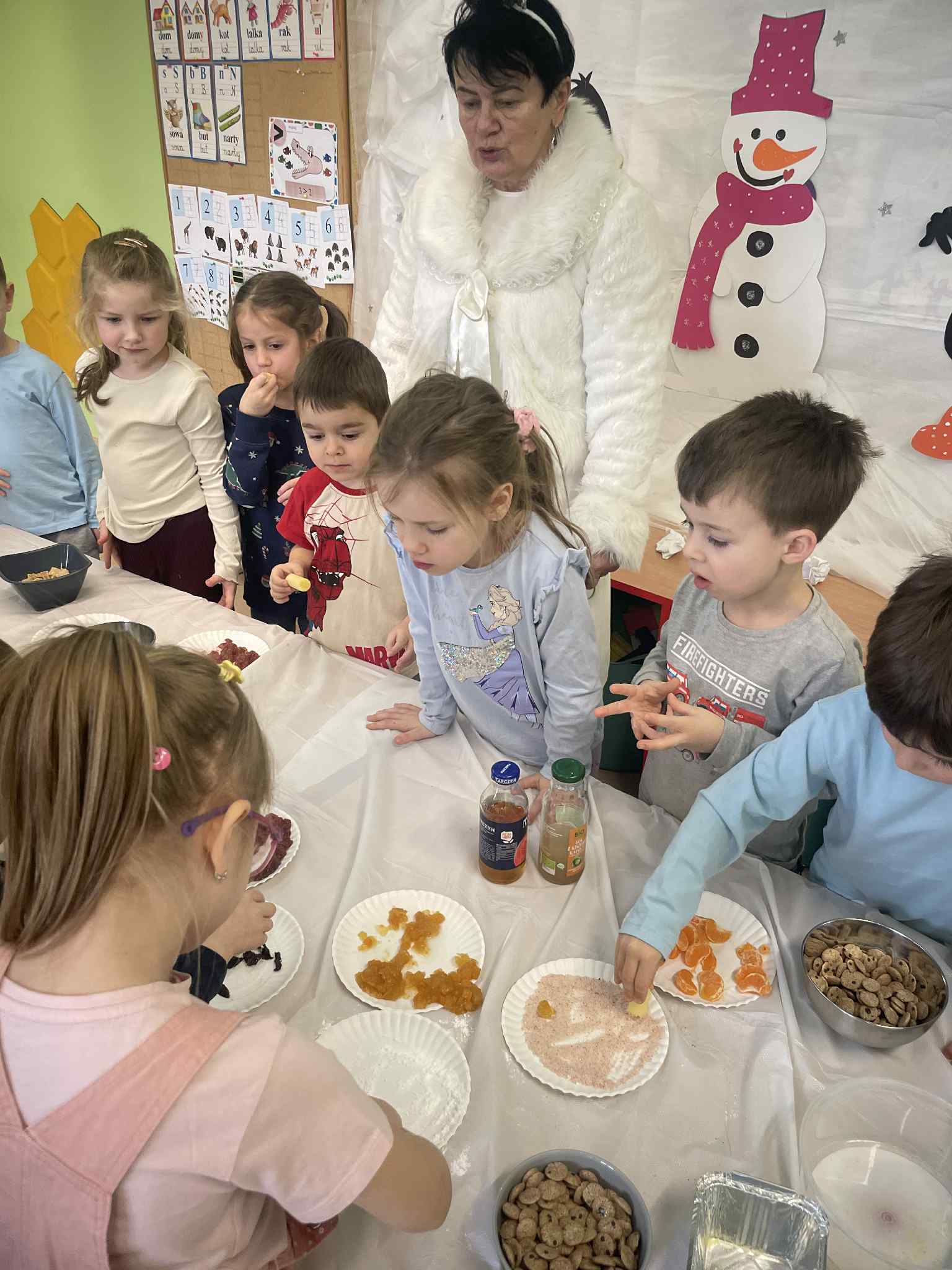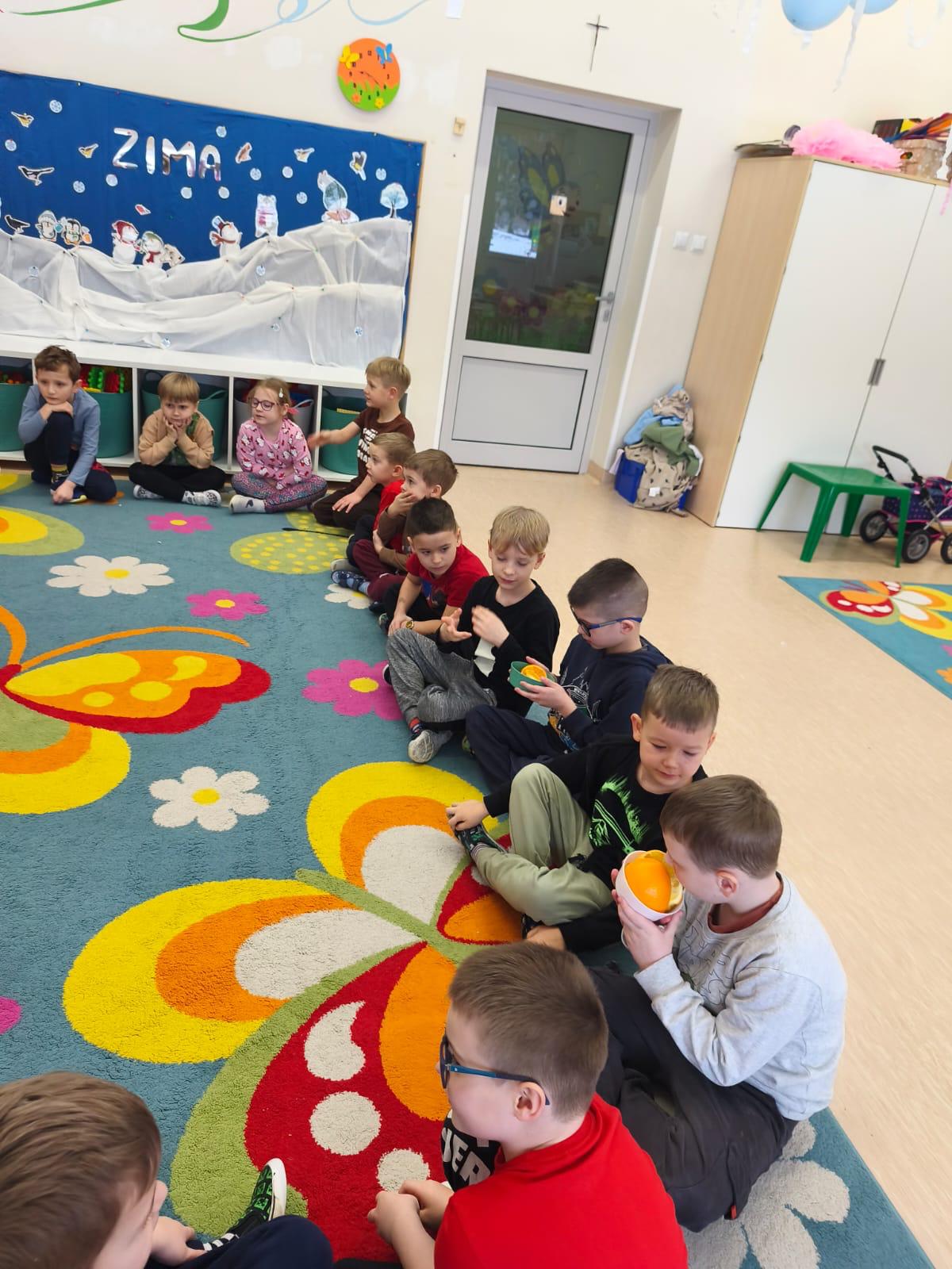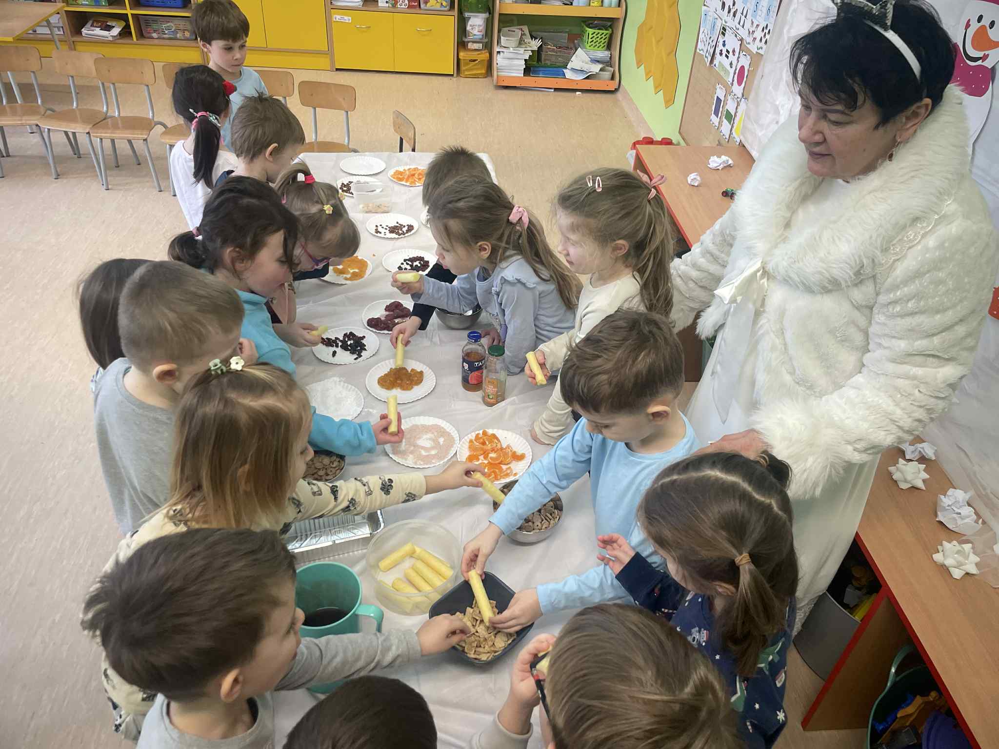 Przedszkolaki zamieniły się w małych odkrywców zapachów. Poznawały aromaty kojarzące się z zimowym czasem, takie jak goździki, cynamon, świerkowe igliwie czy suszone pomarańcze, a nawet zimowe herbatki. Dzieci stworzyły własne, pachnące woreczki sensoryczne, dzięki którym zabrały zapach zimy prosto do swoich domów.