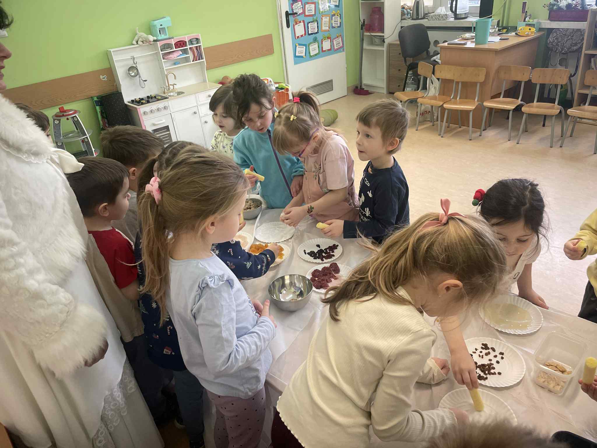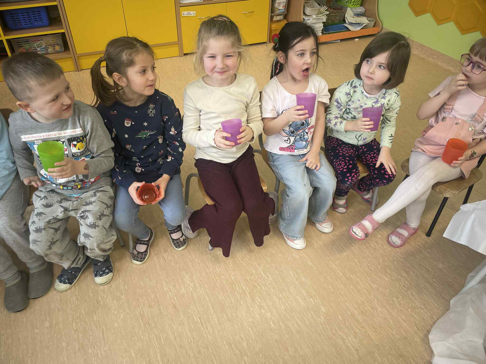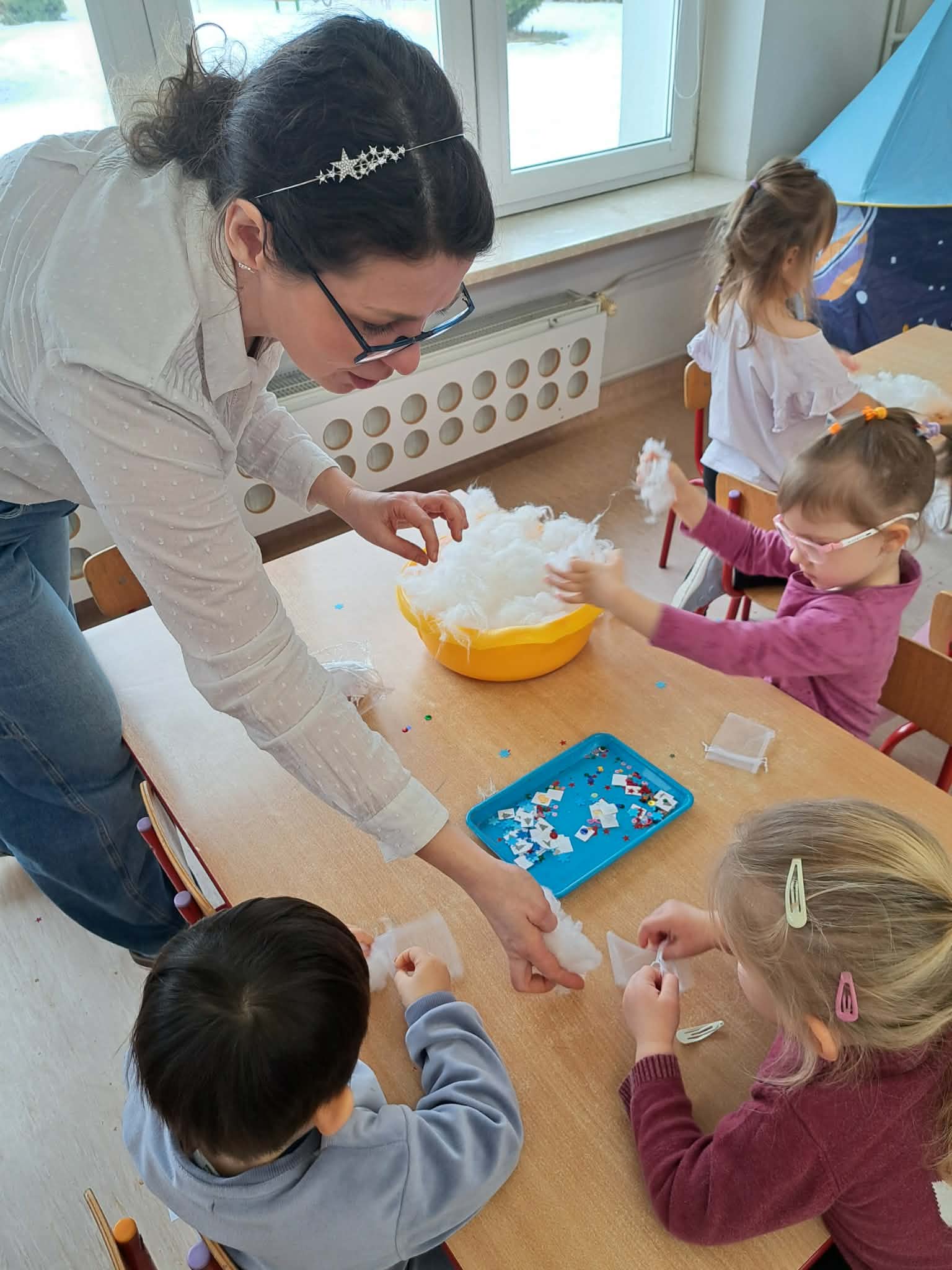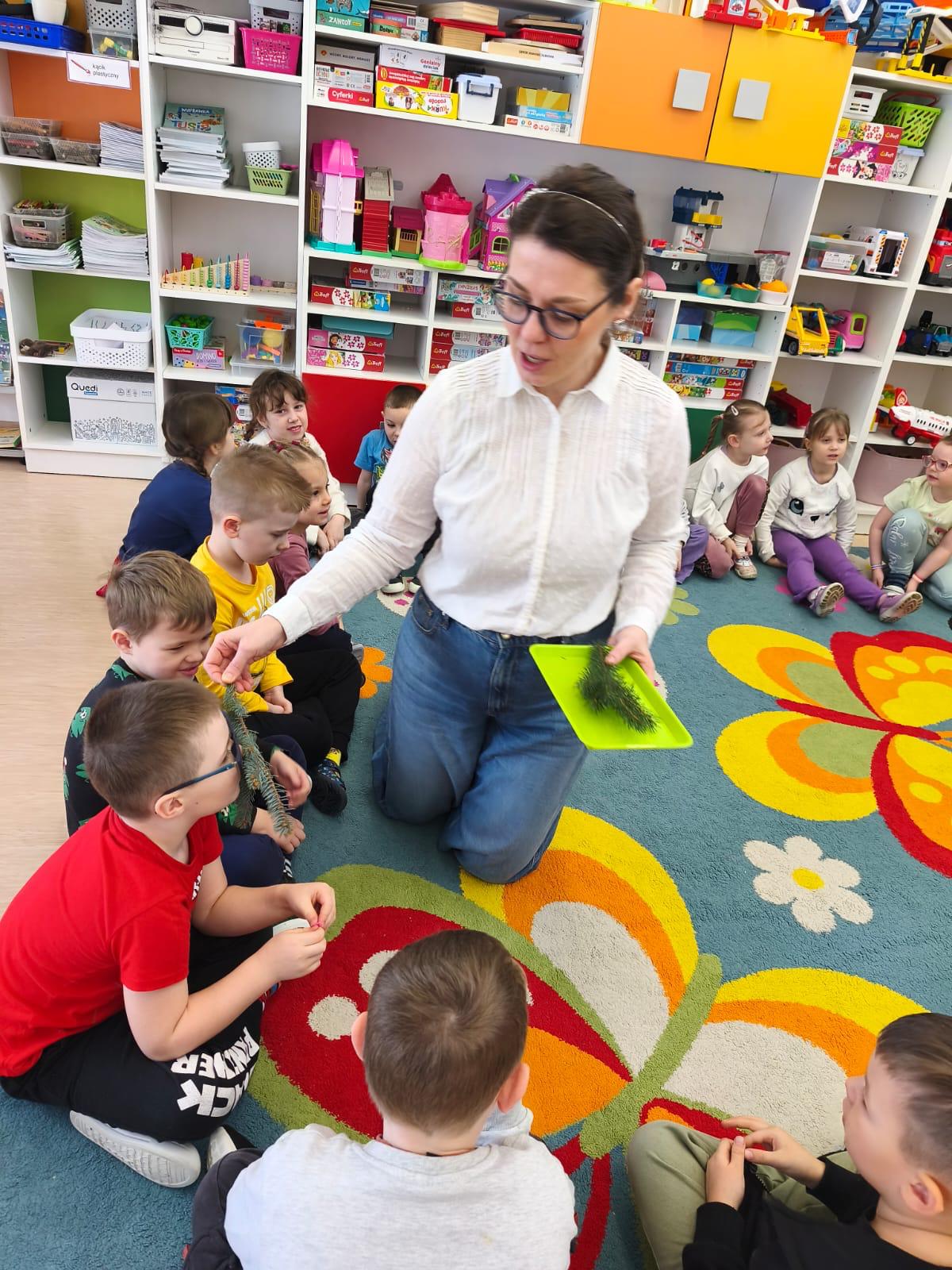 Przedszkolaki zamieniły się w małych odkrywców zapachów. Poznawały aromaty kojarzące się z zimowym czasem, takie jak goździki, cynamon, świerkowe igliwie czy suszone pomarańcze, a nawet zimowe herbatki. Dzieci stworzyły własne, pachnące woreczki sensoryczne, dzięki którym zabrały zapach zimy prosto do swoich domów.