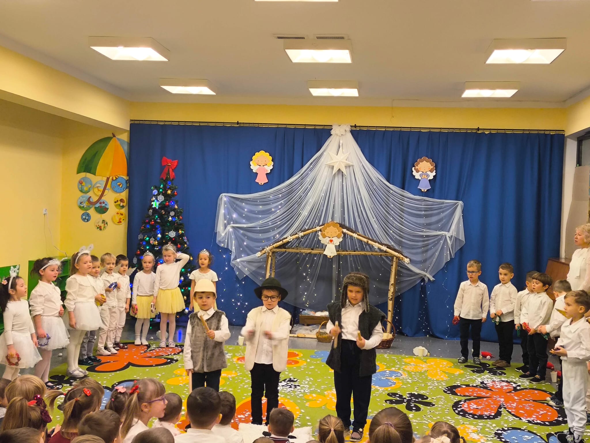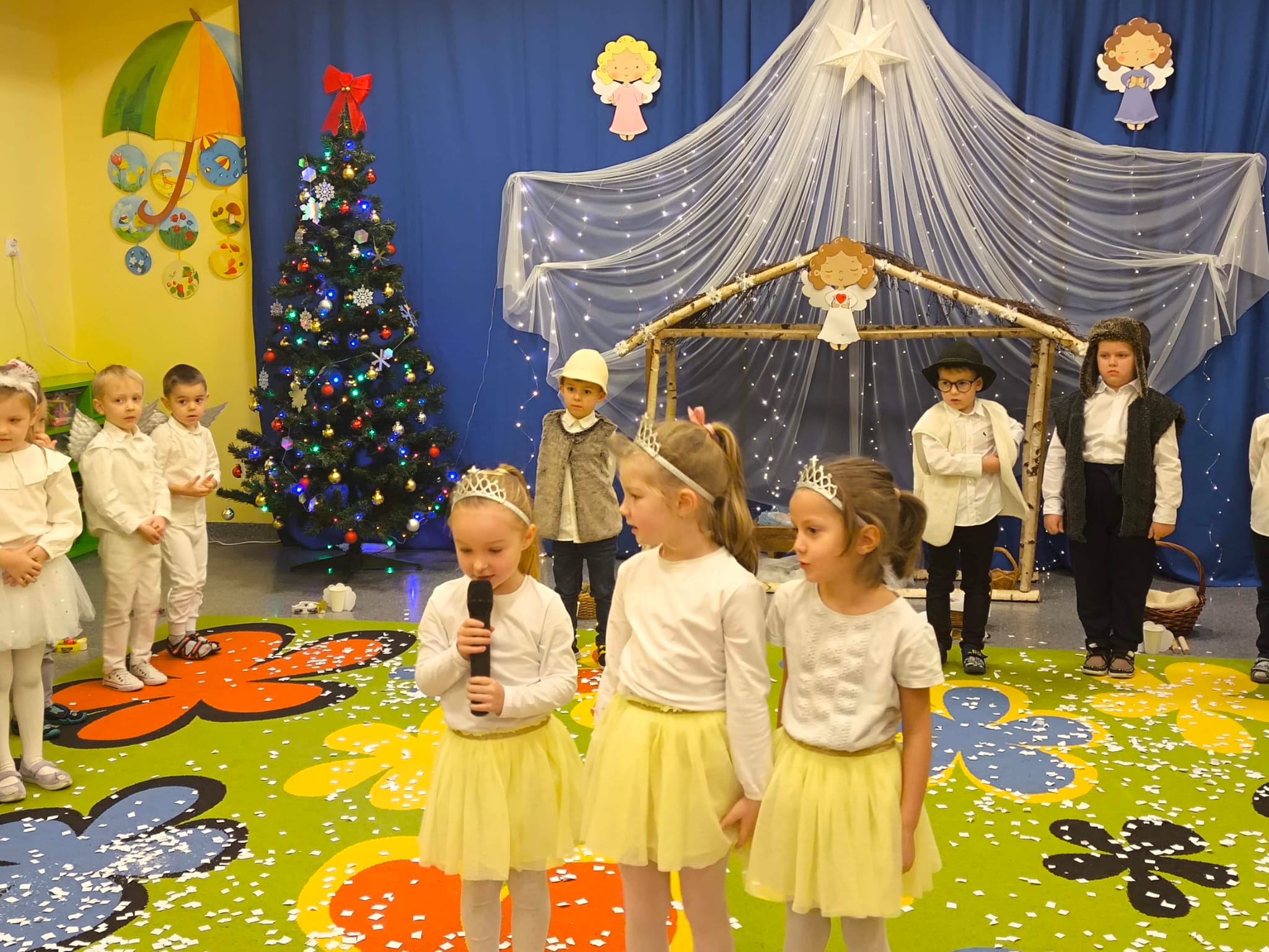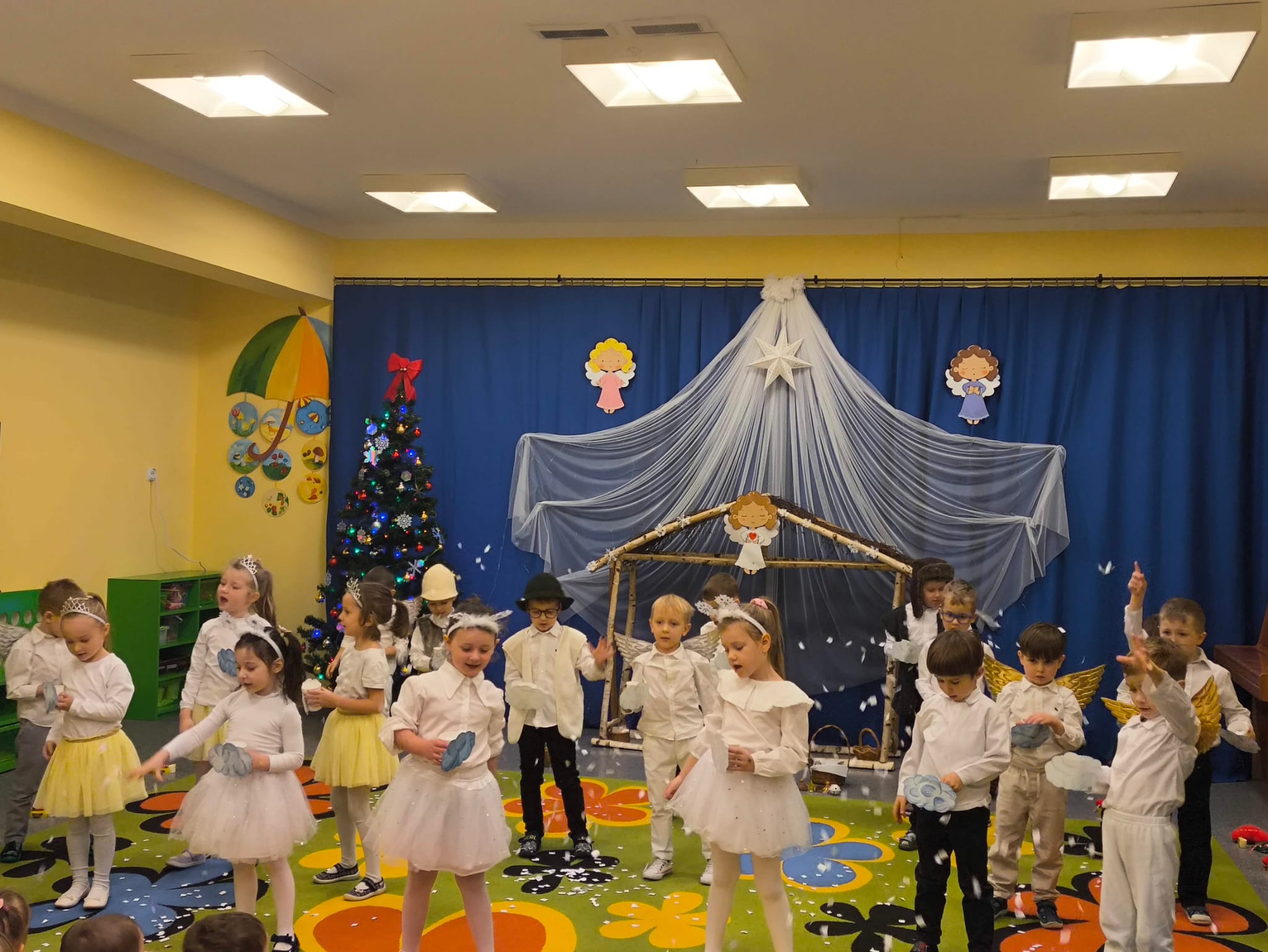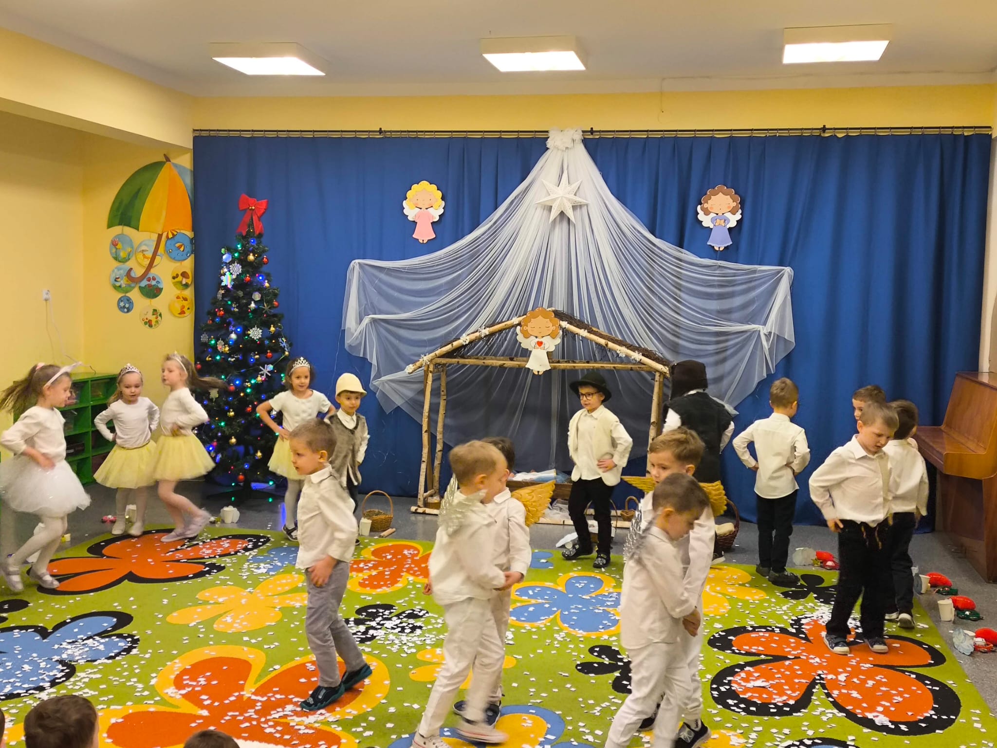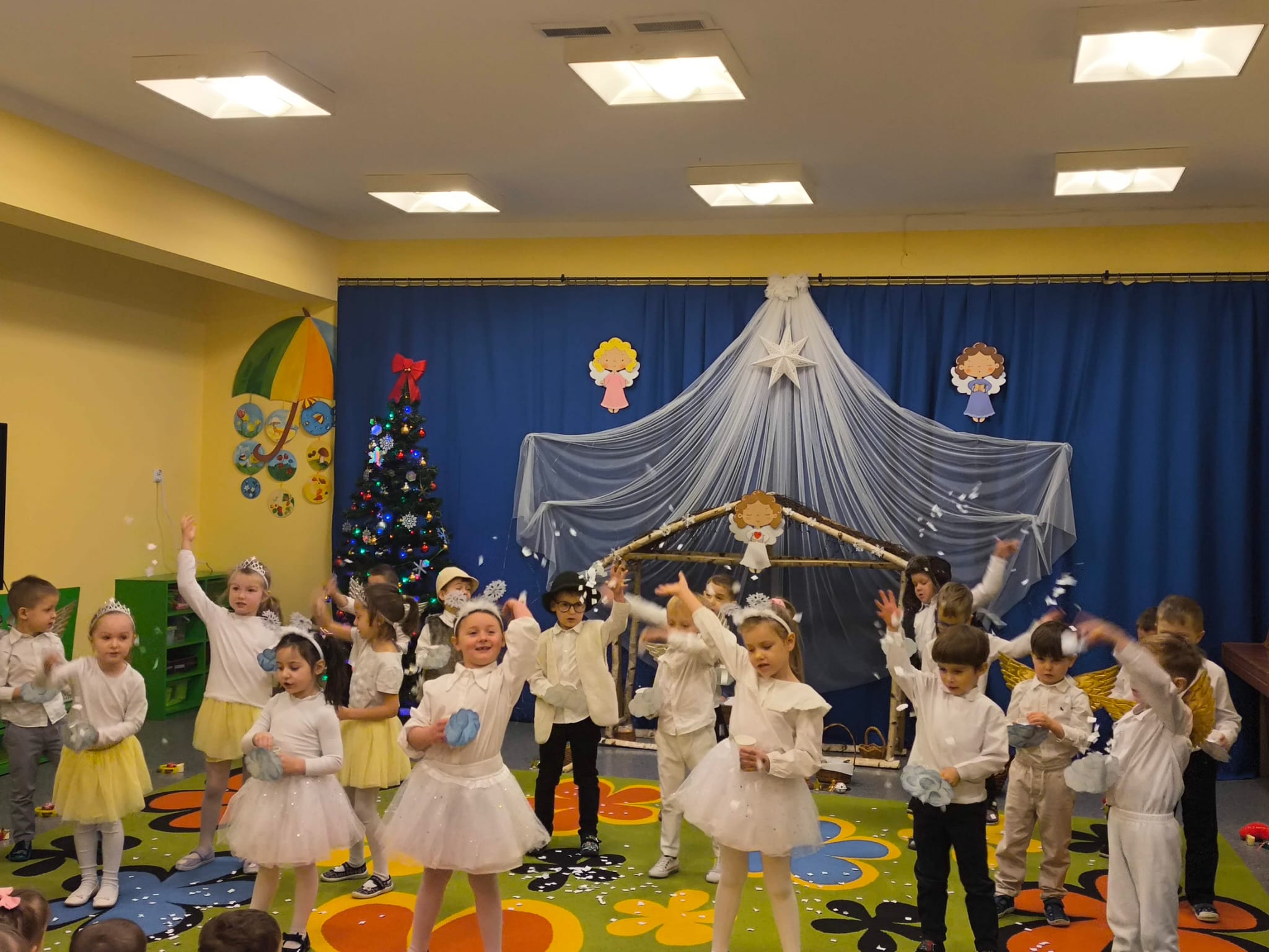 Już od pierwszych chwil na scenie pojawiły się pełne wdzięku śnieżynki, które lekkim, tanecznym krokiem wprowadziły wszystkich w zimowy, bajkowy nastrój. Tuż za nimi rozbłysły gwiazdeczki, migocząc jak prawdziwe niebo nad Betlejem. Ich uśmiechy i energia sprawiły, że każdy widz poczuł magię nadchodzących świąt.
