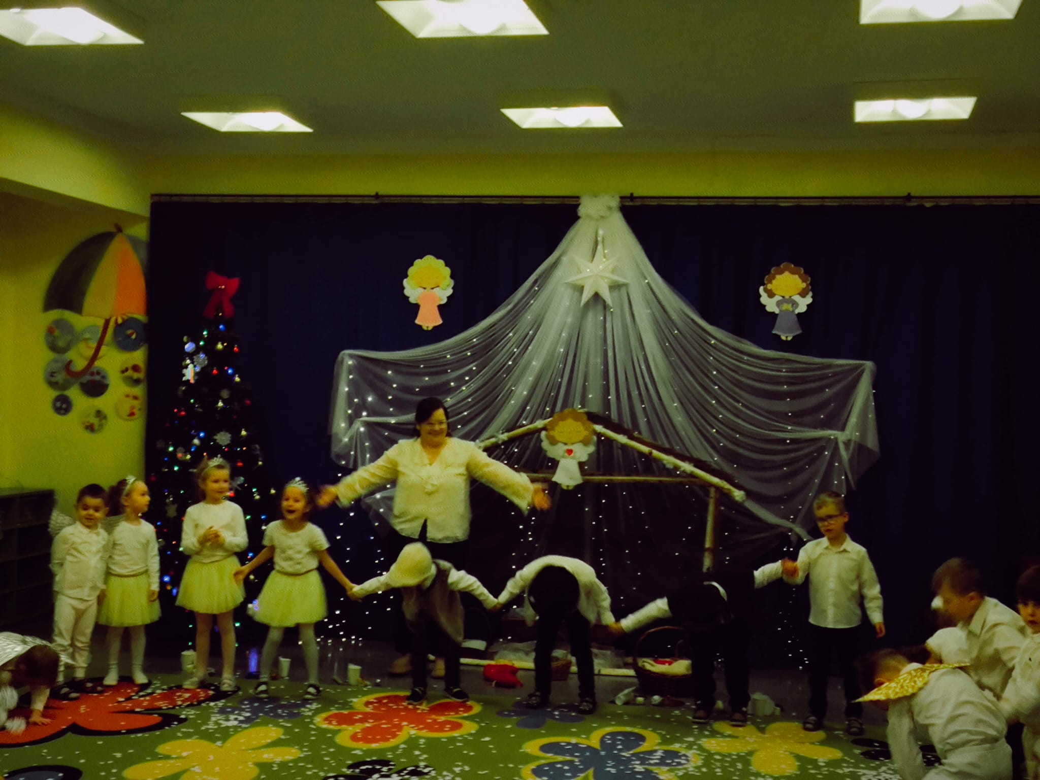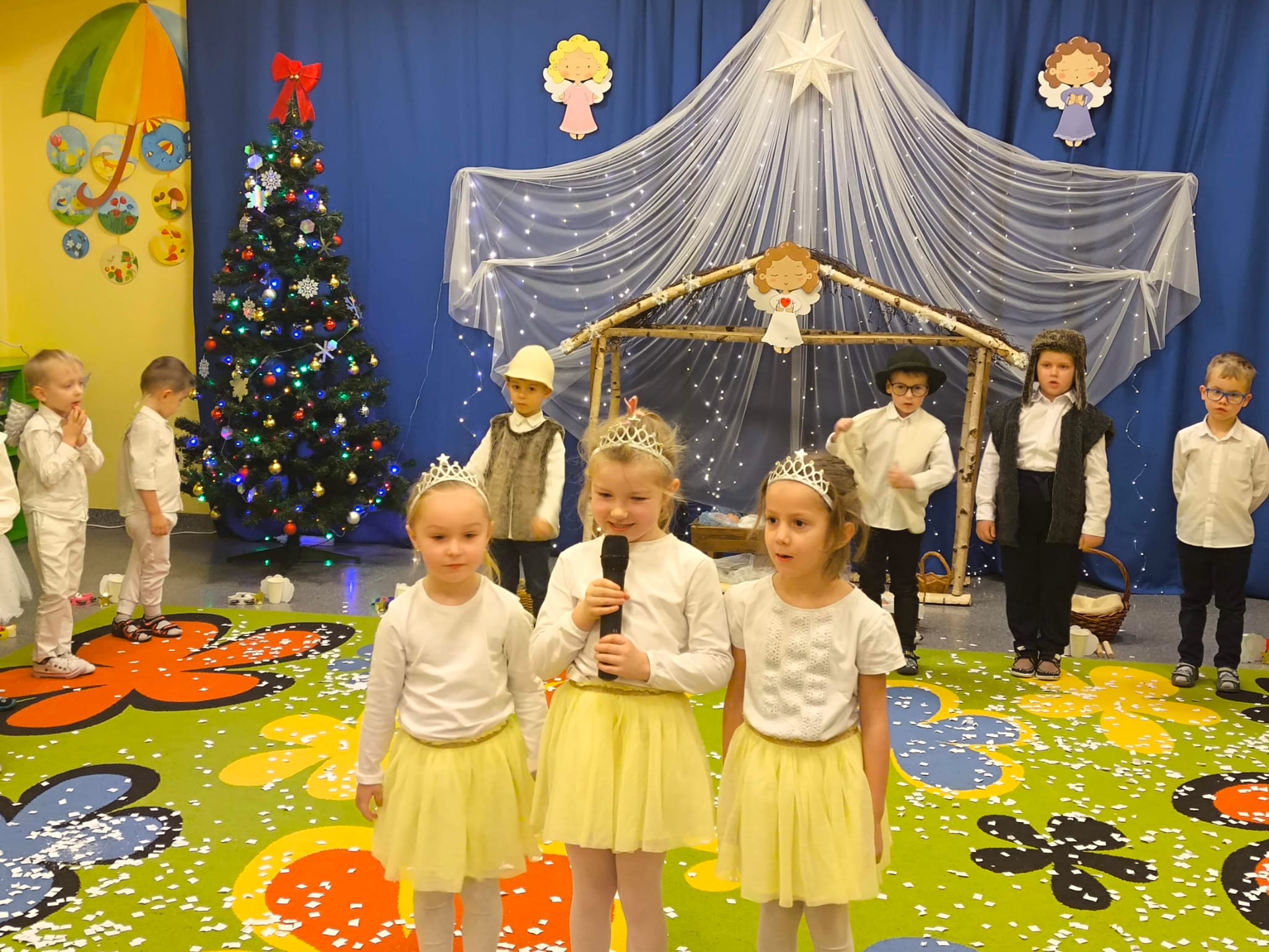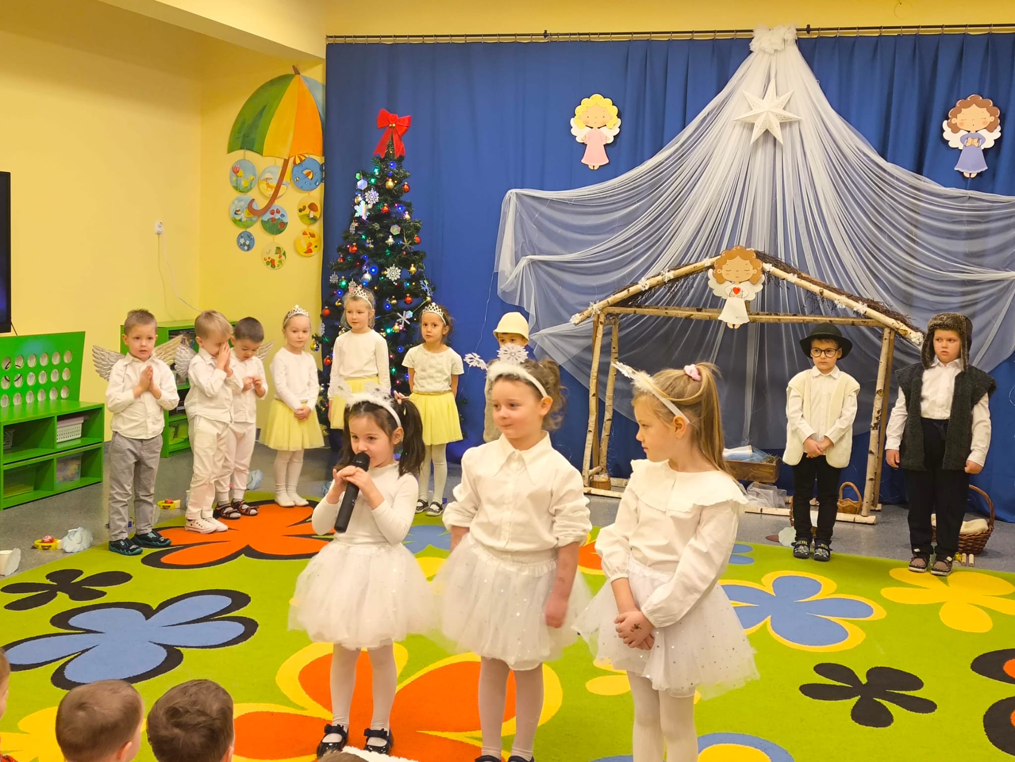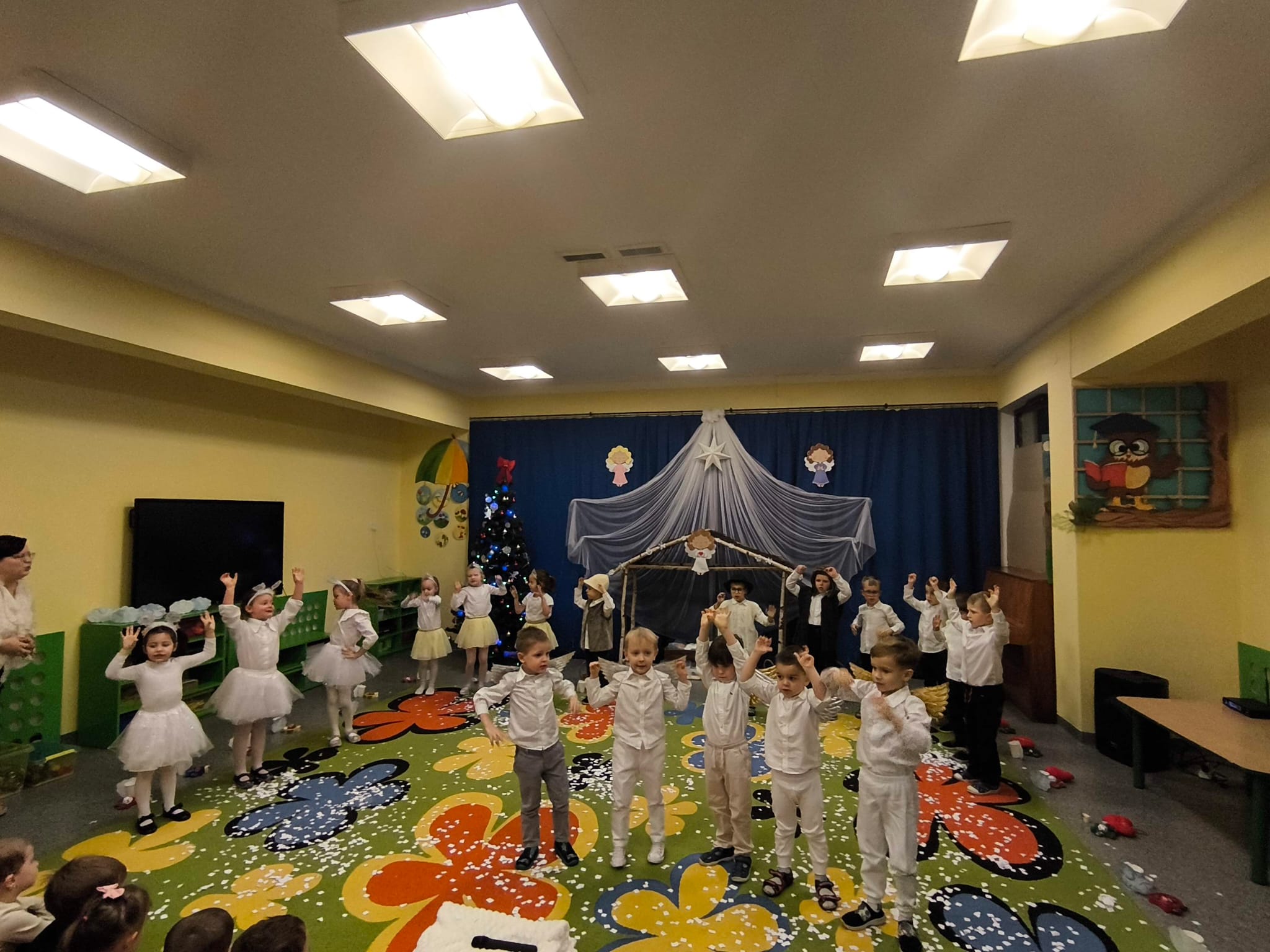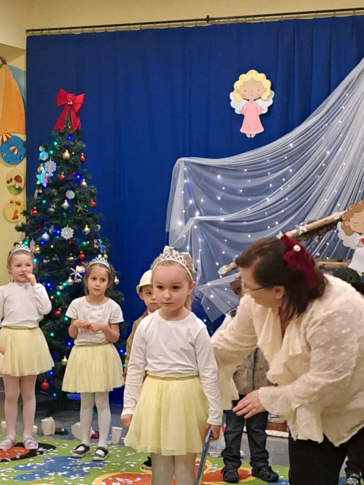 Już od pierwszych chwil na scenie pojawiły się pełne wdzięku śnieżynki, które lekkim, tanecznym krokiem wprowadziły wszystkich w zimowy, bajkowy nastrój. Tuż za nimi rozbłysły gwiazdeczki, migocząc jak prawdziwe niebo nad Betlejem. Ich uśmiechy i energia sprawiły, że każdy widz poczuł magię nadchodzących świąt.