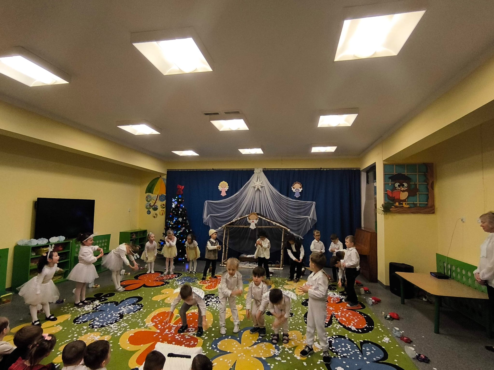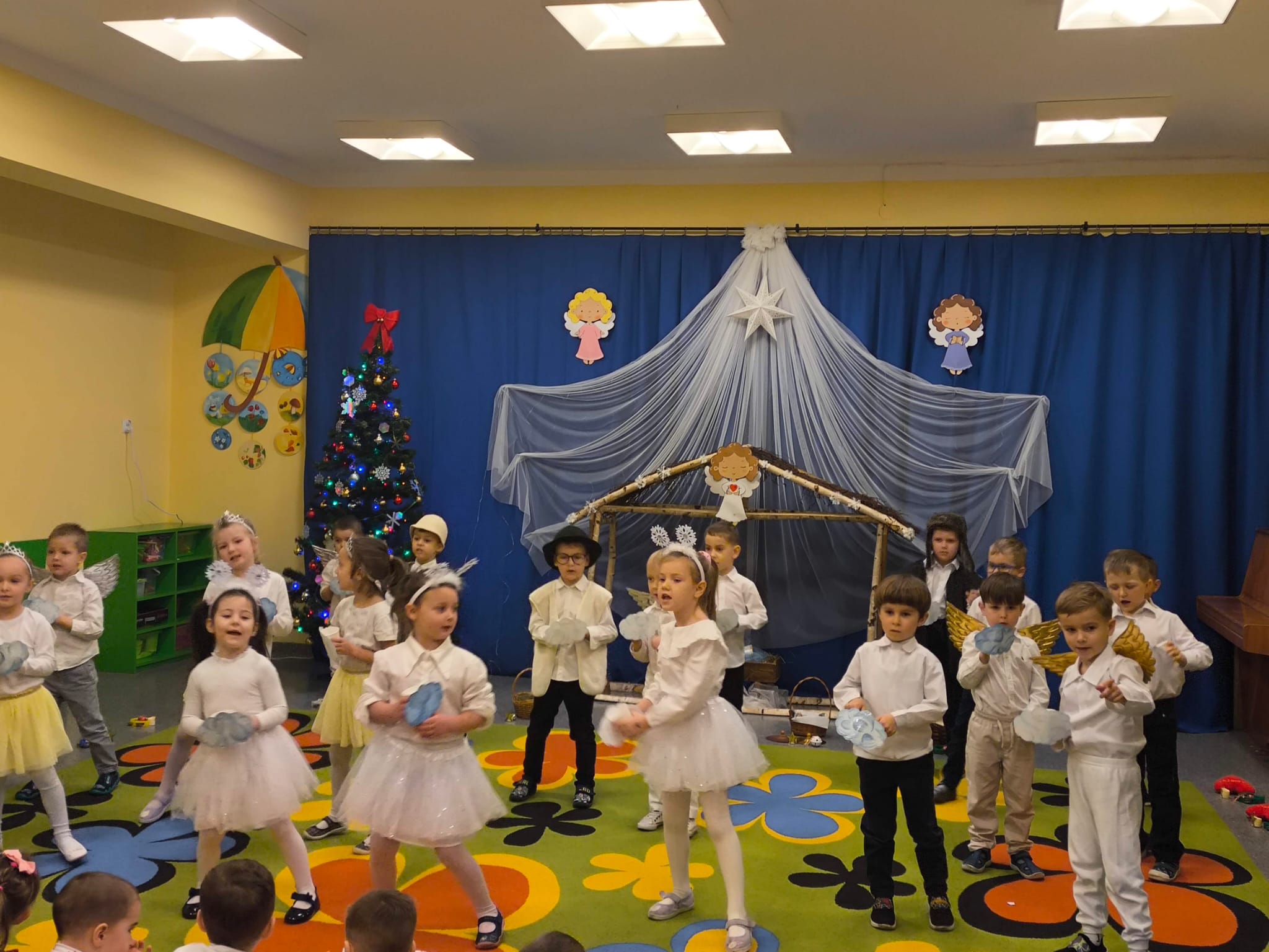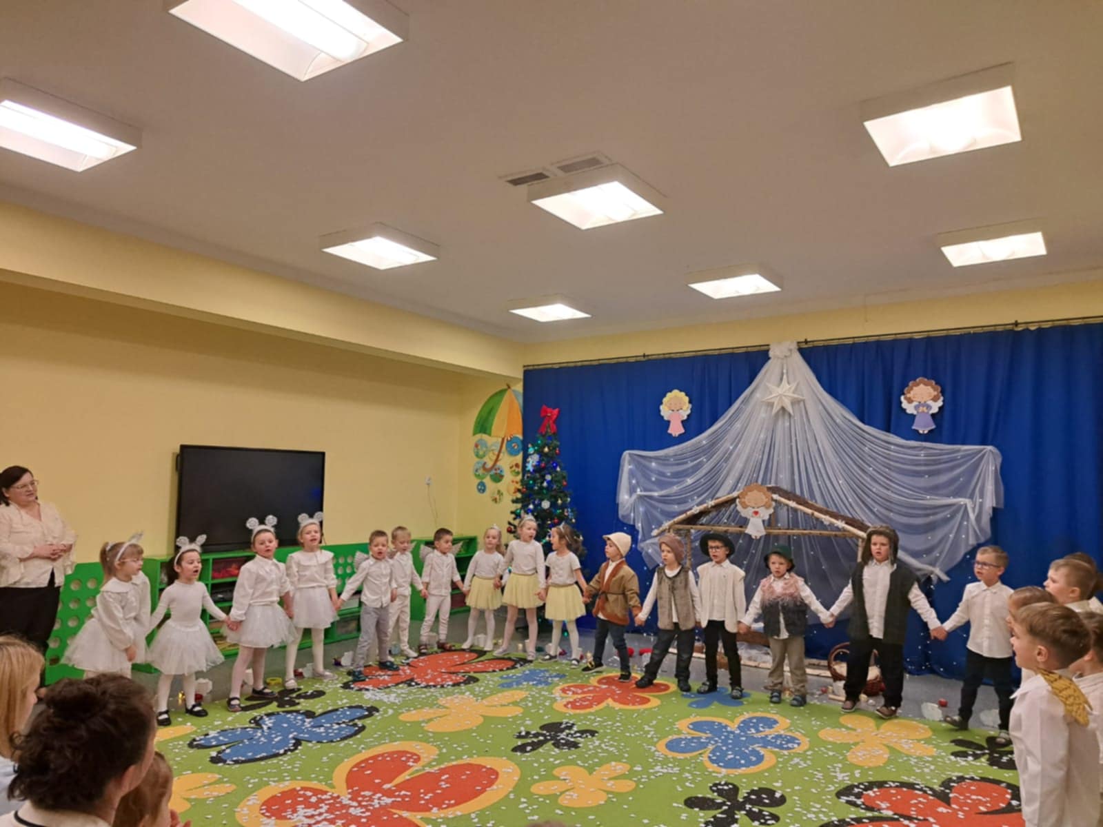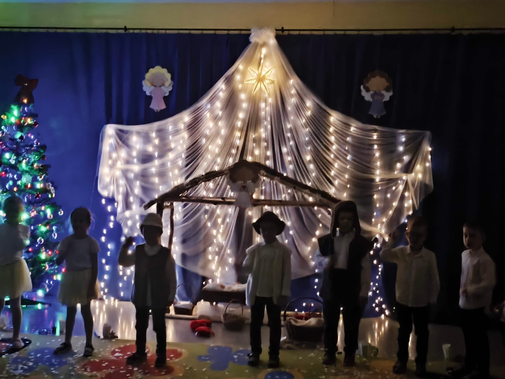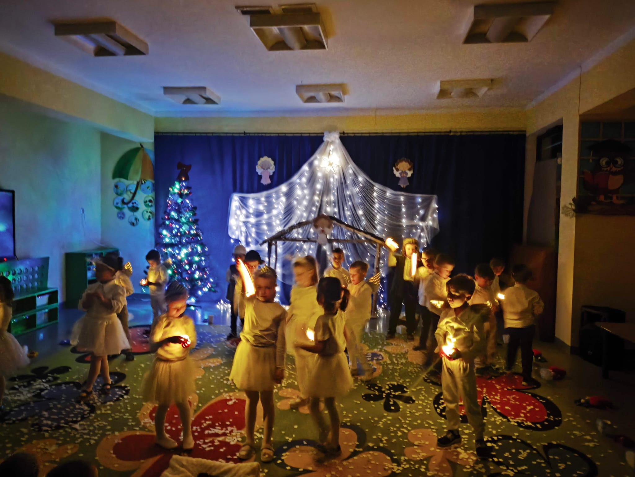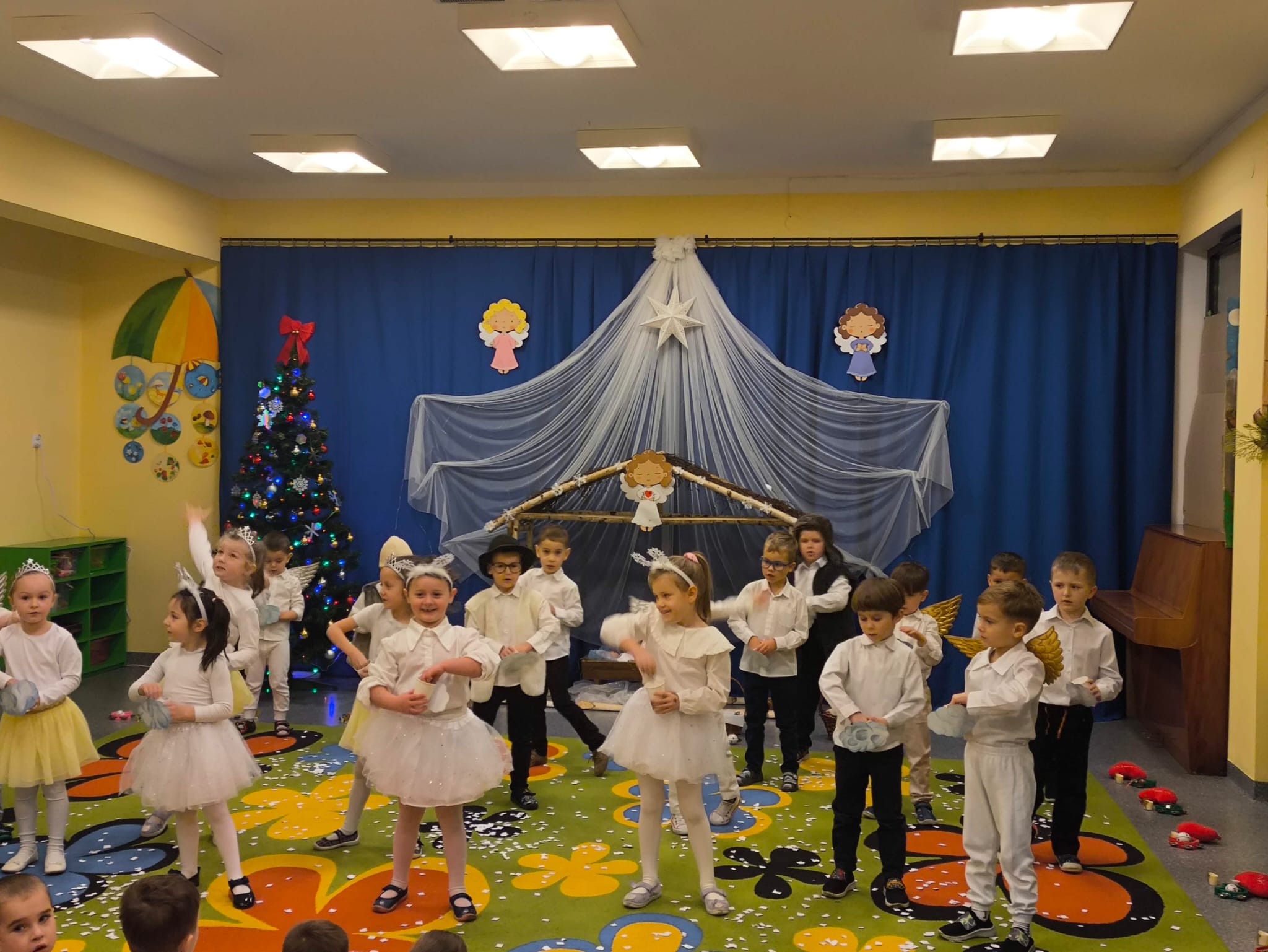 Już od pierwszych chwil na scenie pojawiły się pełne wdzięku śnieżynki, które lekkim, tanecznym krokiem wprowadziły wszystkich w zimowy, bajkowy nastrój. Tuż za nimi rozbłysły gwiazdeczki, migocząc jak prawdziwe niebo nad Betlejem. Ich uśmiechy i energia sprawiły, że każdy widz poczuł magię nadchodzących świąt.