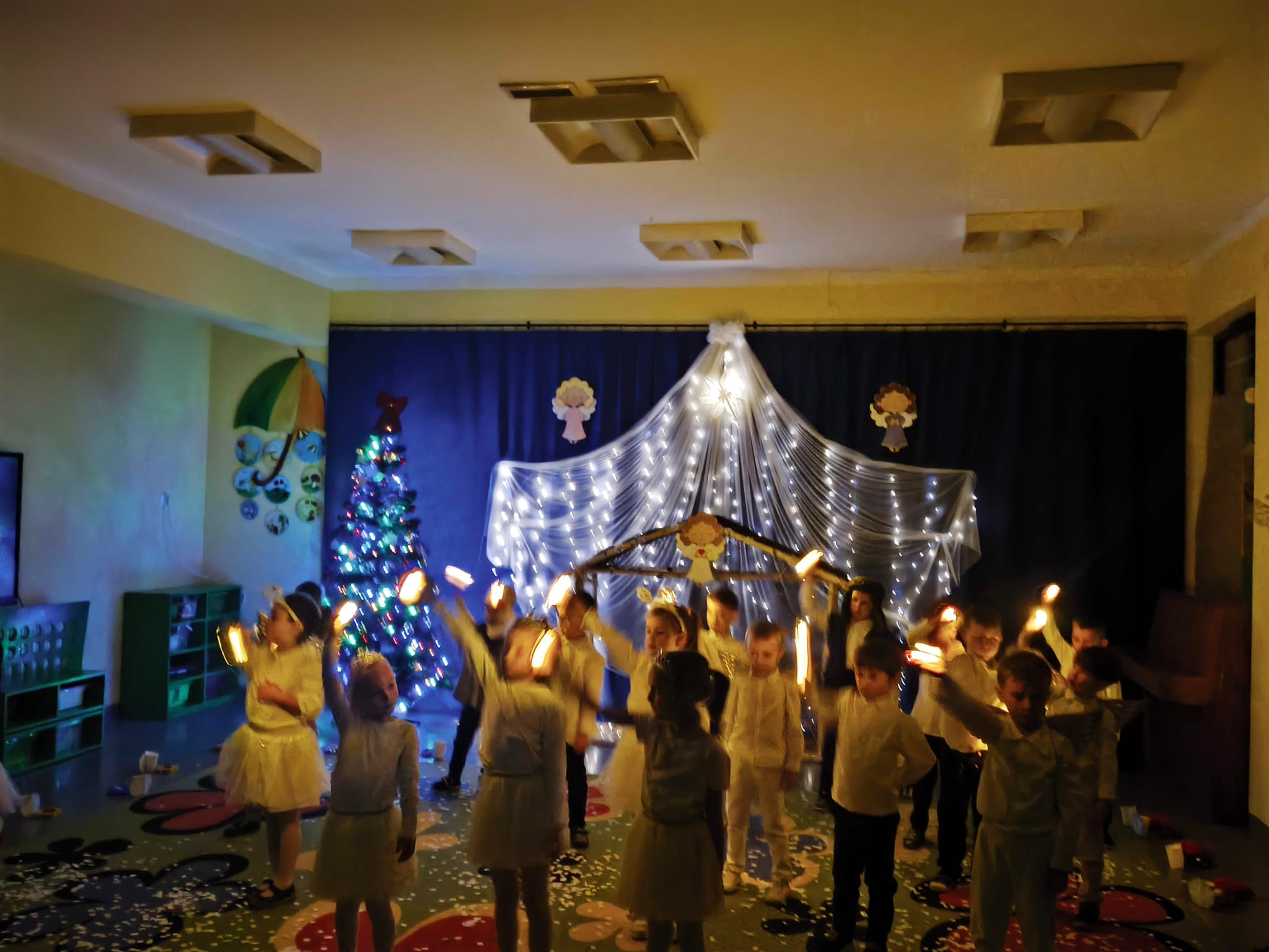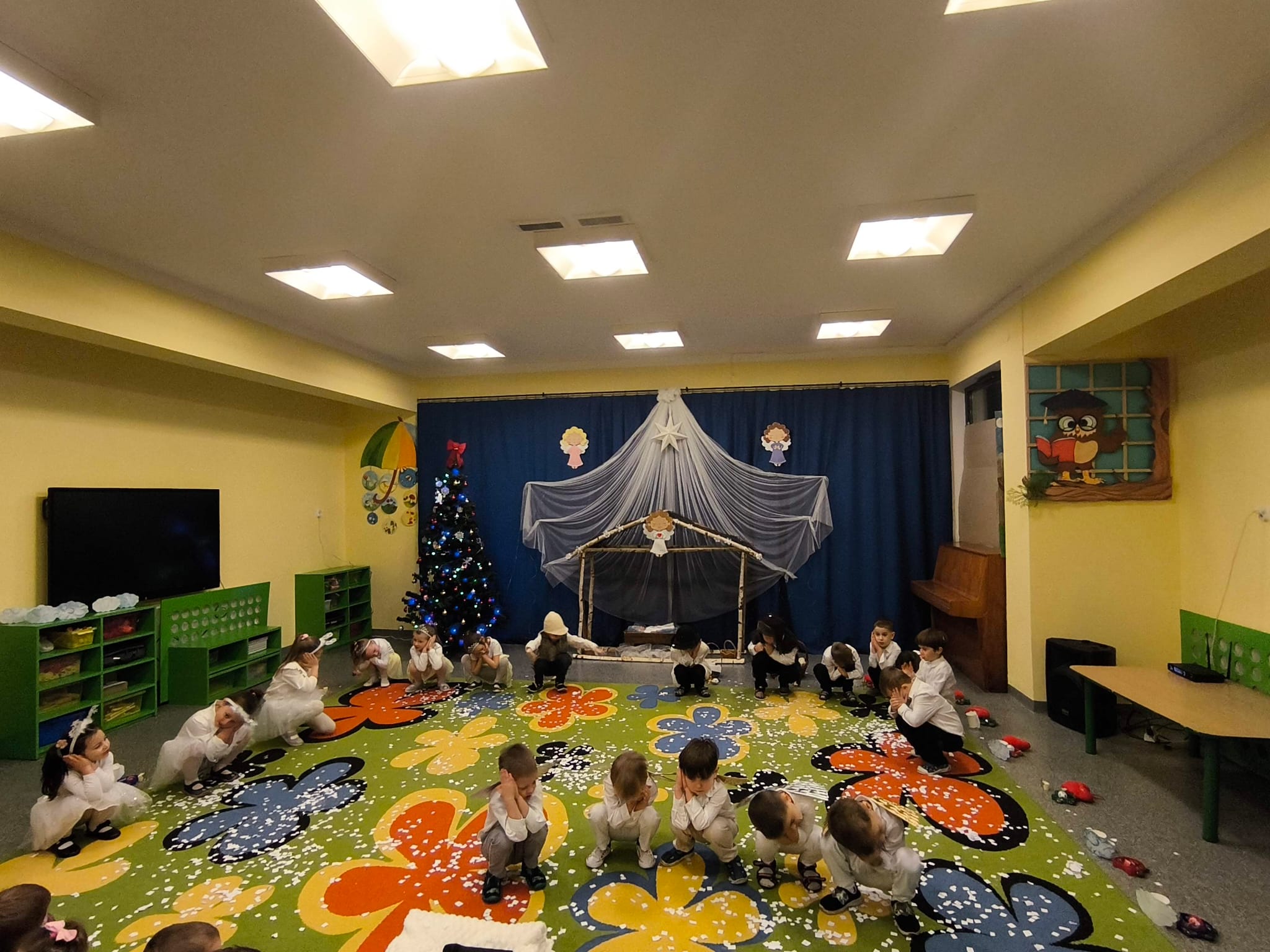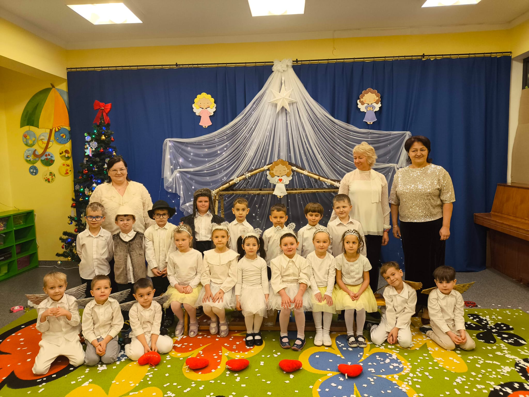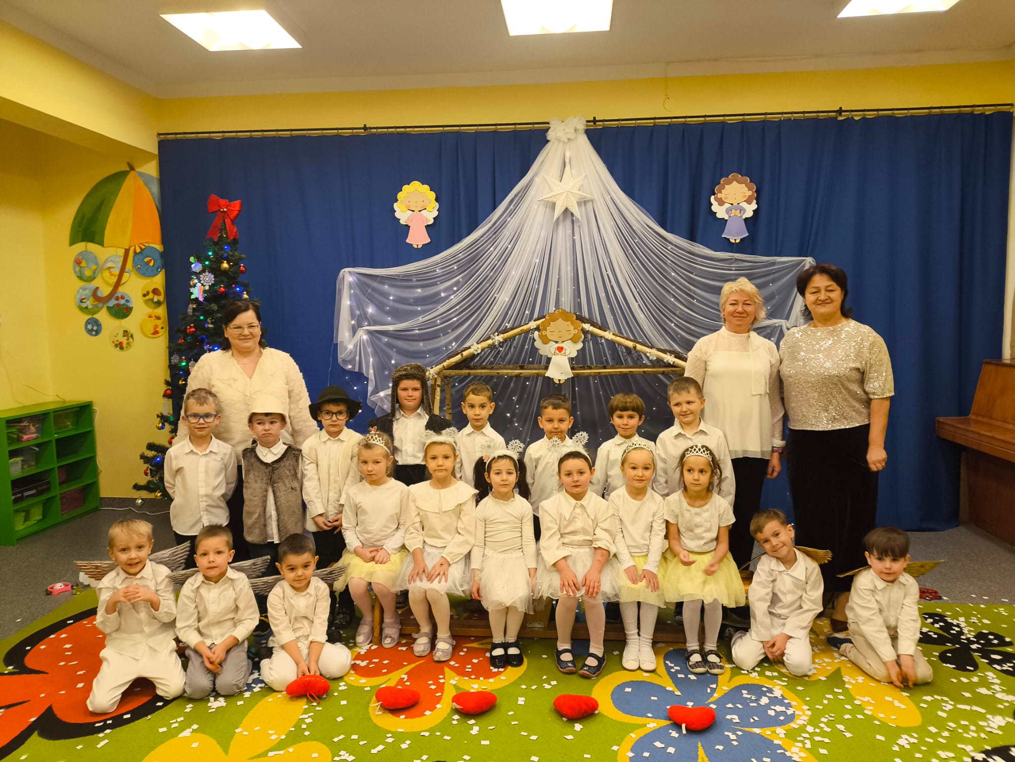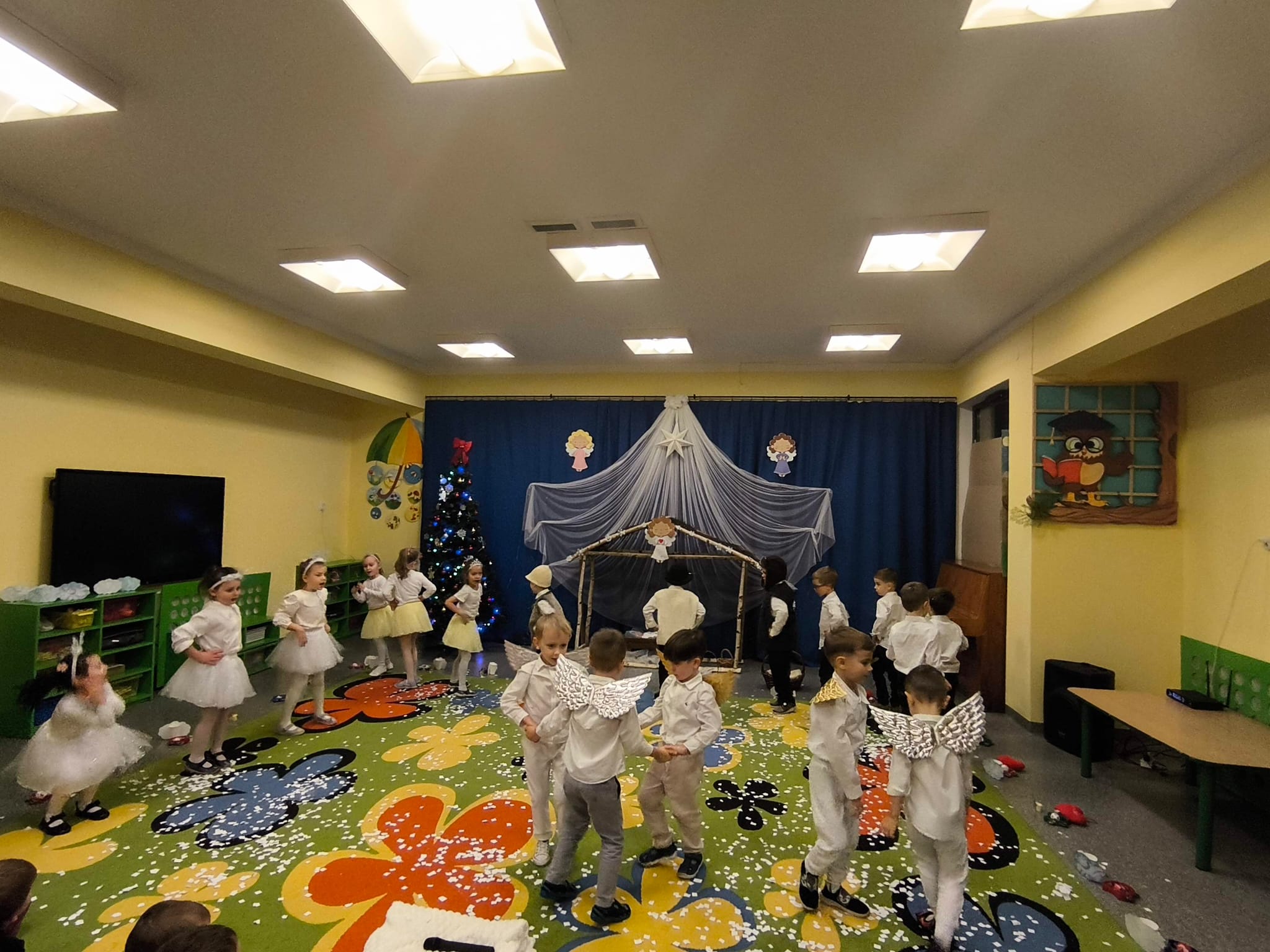 Już od pierwszych chwil na scenie pojawiły się pełne wdzięku śnieżynki, które lekkim, tanecznym krokiem wprowadziły wszystkich w zimowy, bajkowy nastrój. Tuż za nimi rozbłysły gwiazdeczki, migocząc jak prawdziwe niebo nad Betlejem. Ich uśmiechy i energia sprawiły, że każdy widz poczuł magię nadchodzących świąt.