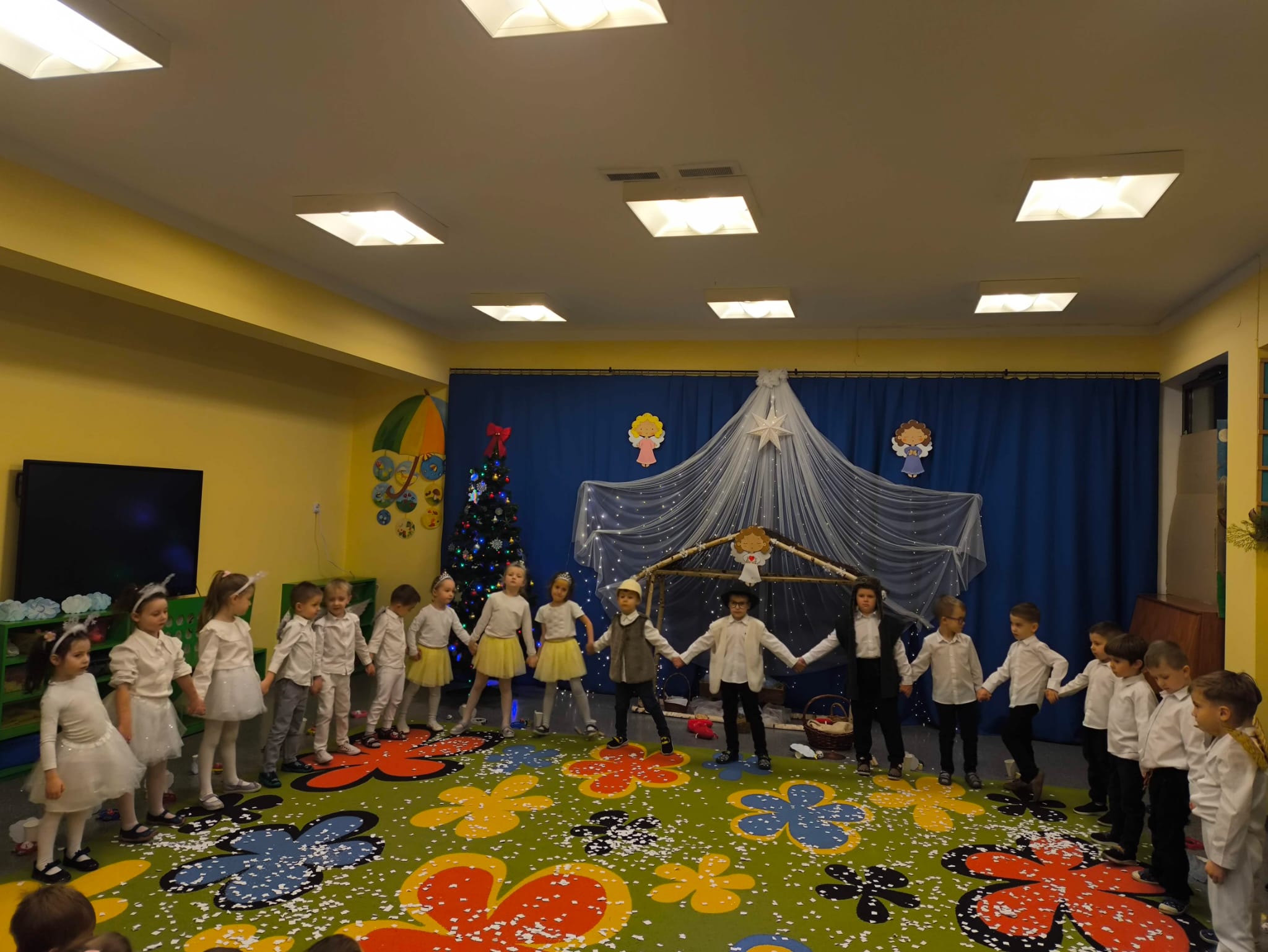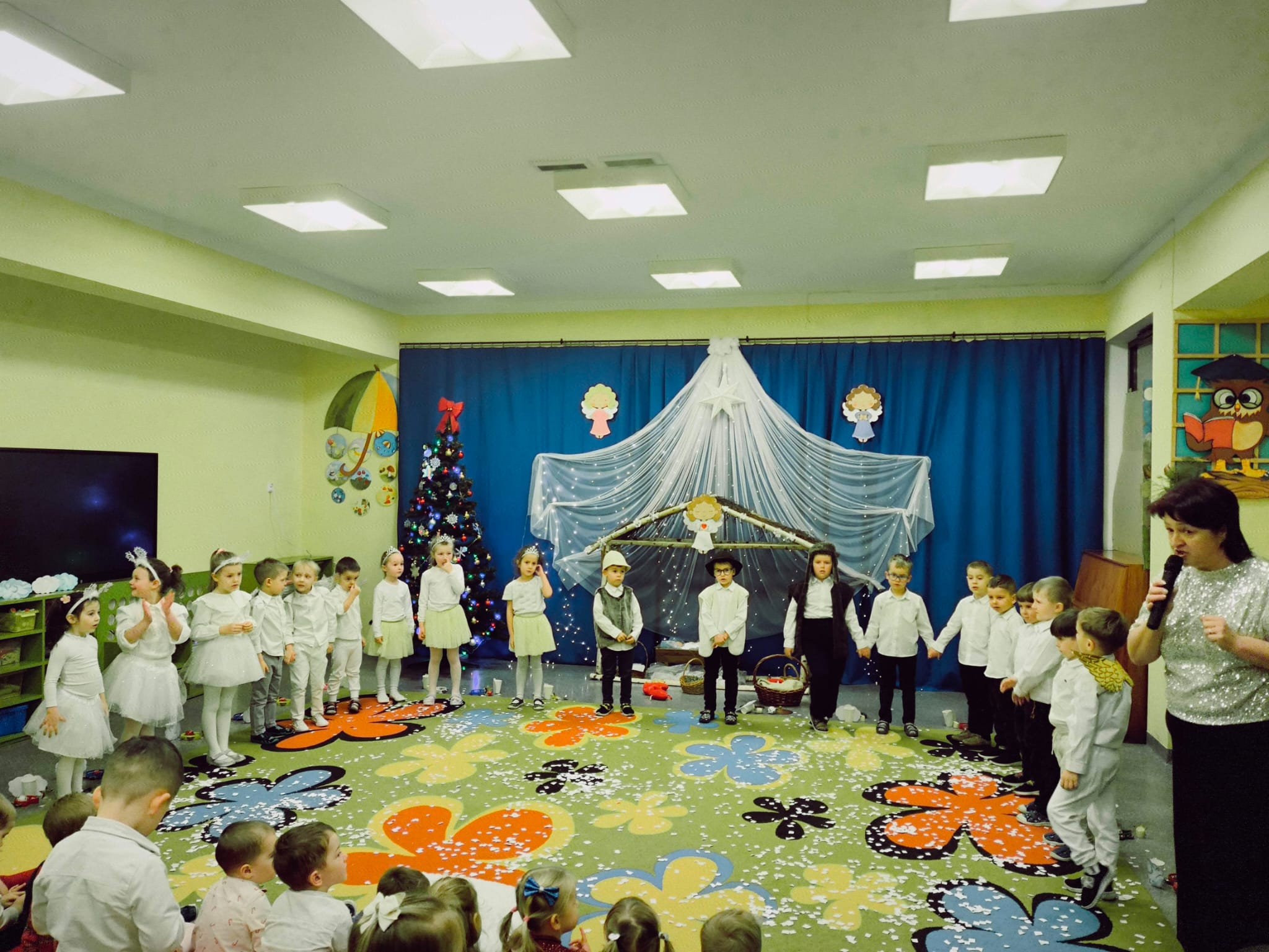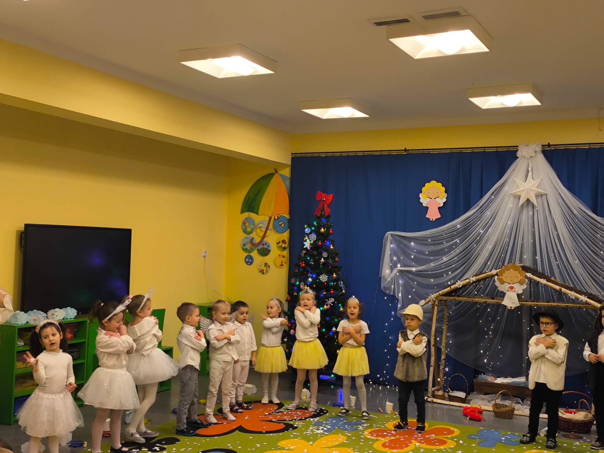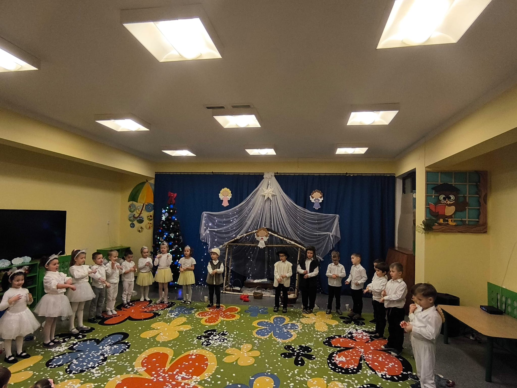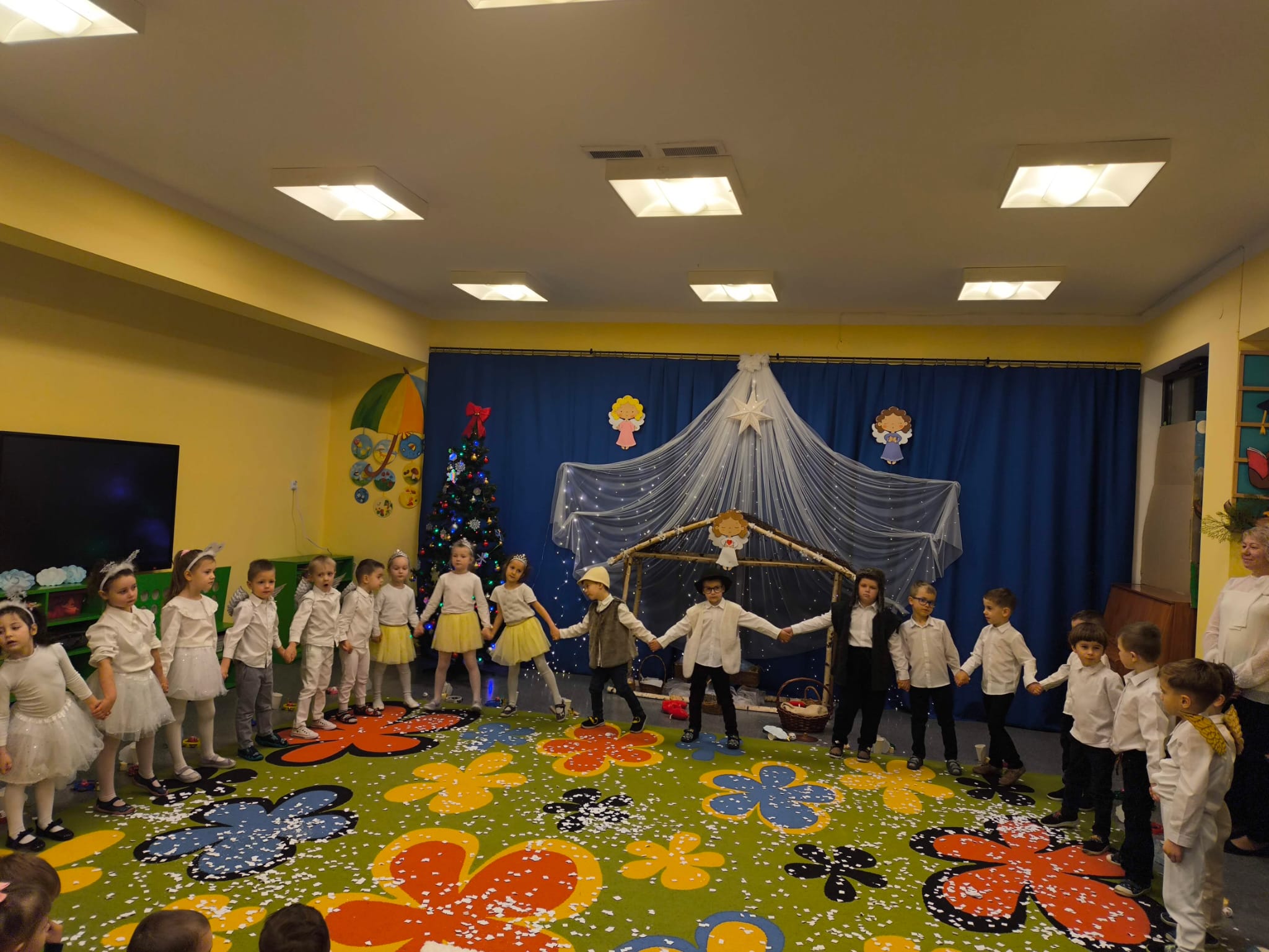 Już od pierwszych chwil na scenie pojawiły się pełne wdzięku śnieżynki, które lekkim, tanecznym krokiem wprowadziły wszystkich w zimowy, bajkowy nastrój. Tuż za nimi rozbłysły gwiazdeczki, migocząc jak prawdziwe niebo nad Betlejem. Ich uśmiechy i energia sprawiły, że każdy widz poczuł magię nadchodzących świąt.