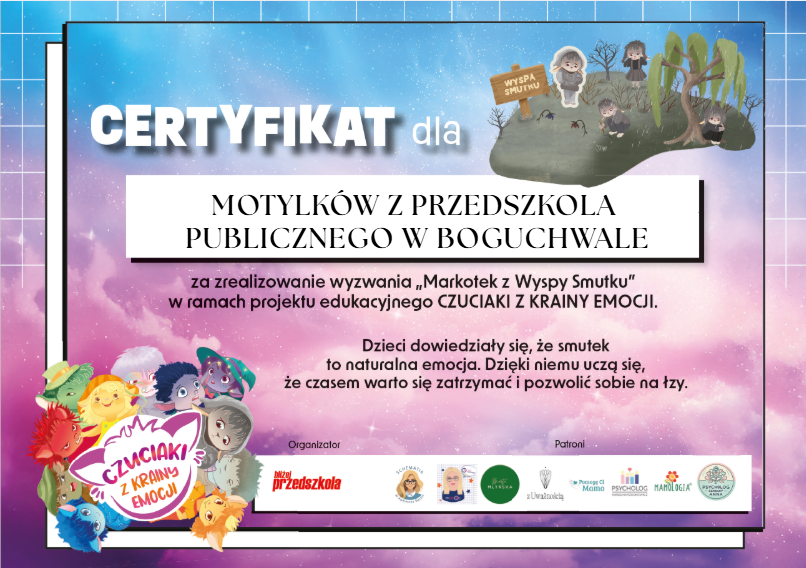 Grupa Motylków rozpoczęła w tym roku szkolnym realizację Ogólnopolskiego Projektu Edukacyjnego „Czuciaki z Krainy Emocji”. Jest to podróż do niezwykłego świata emocji.
