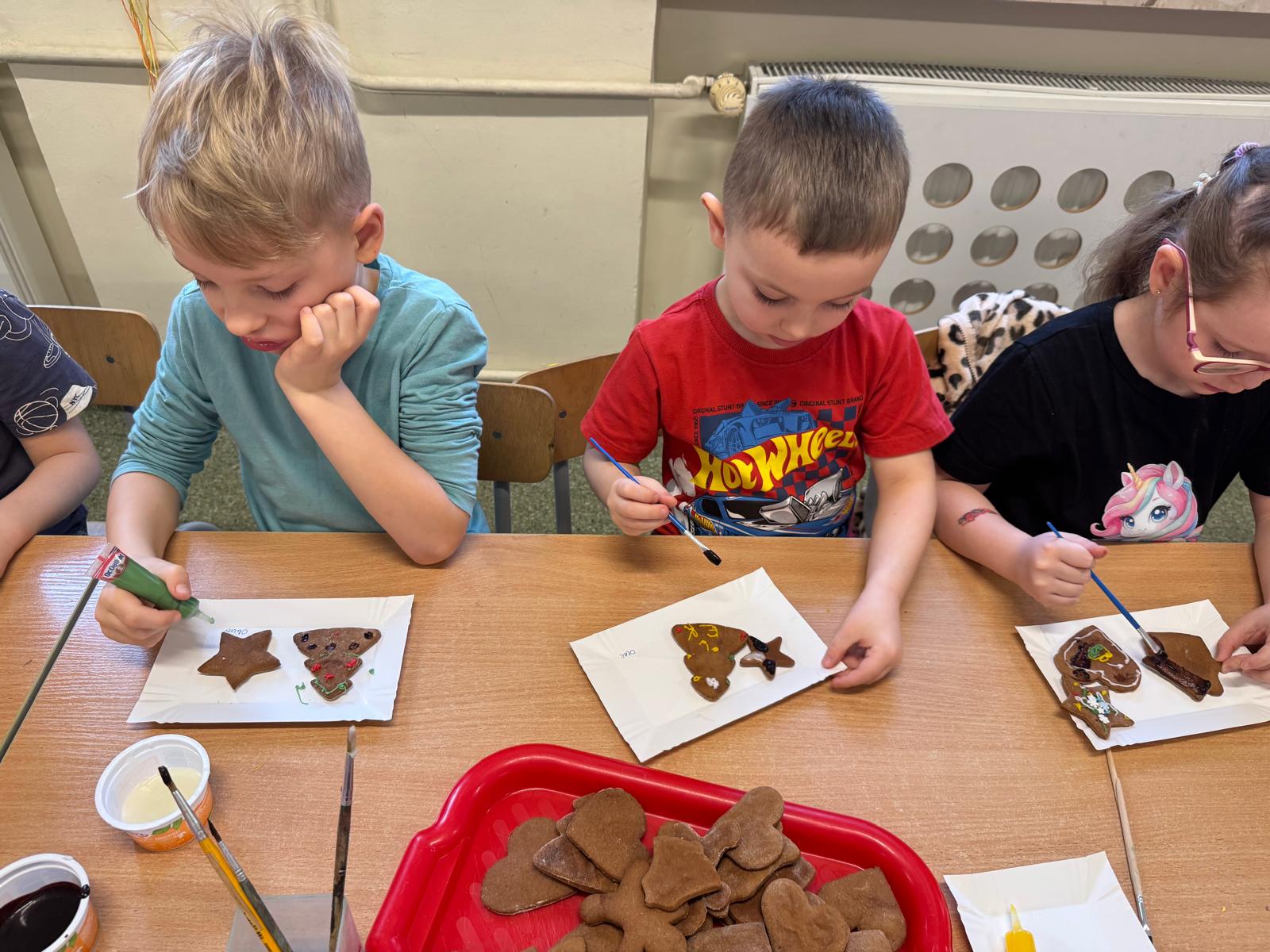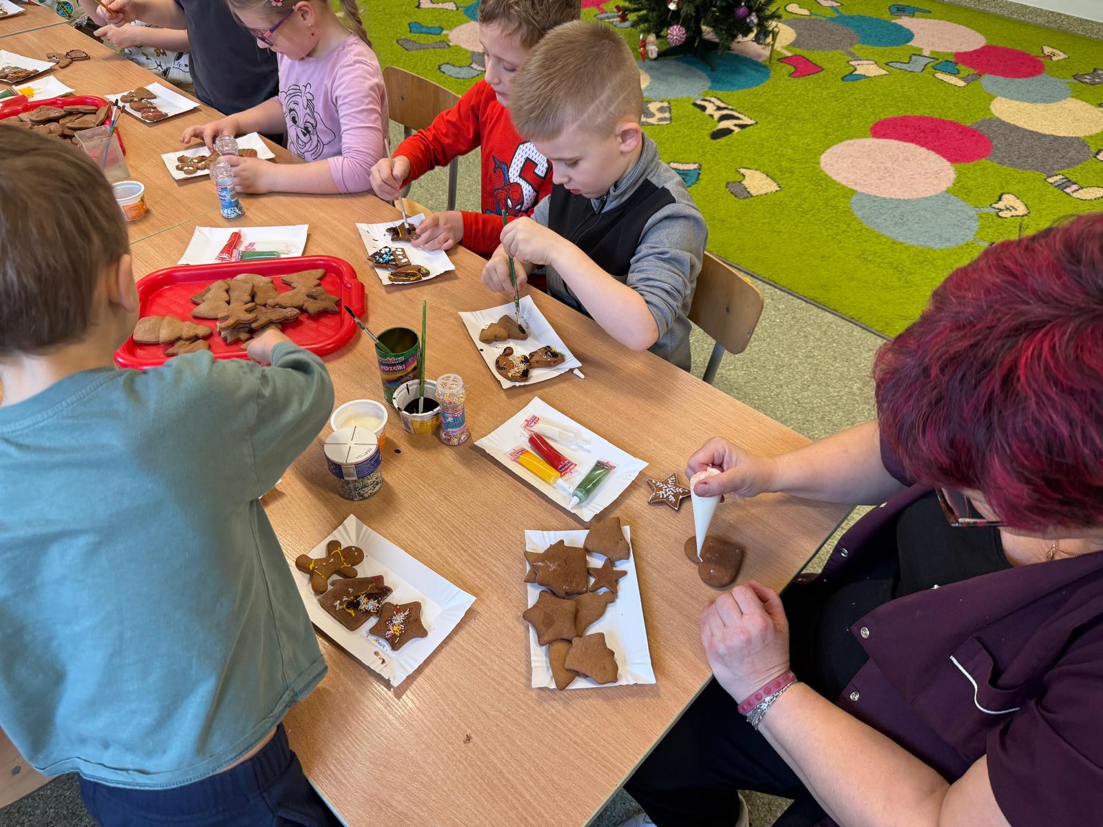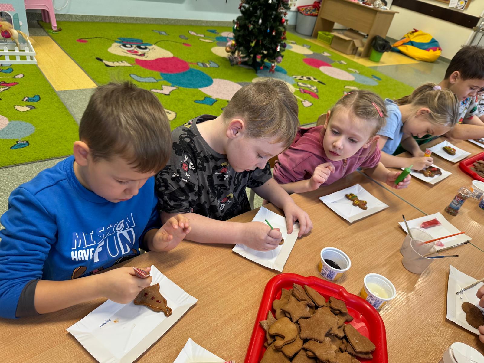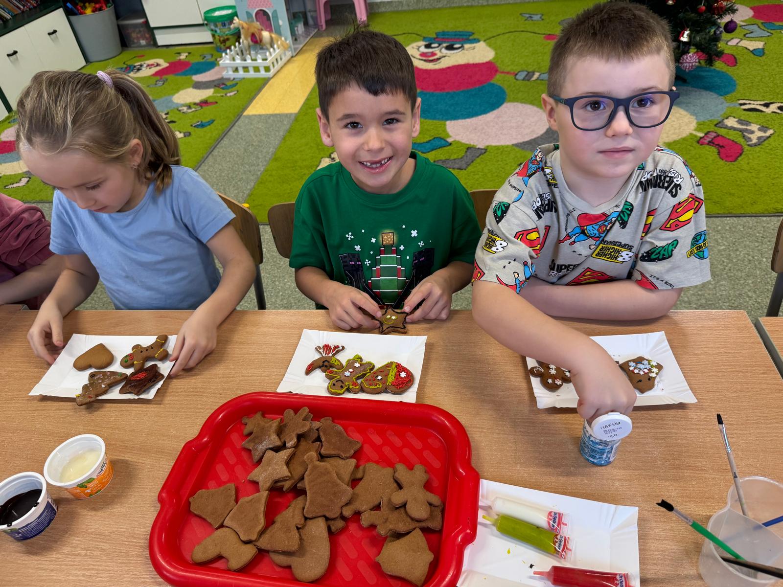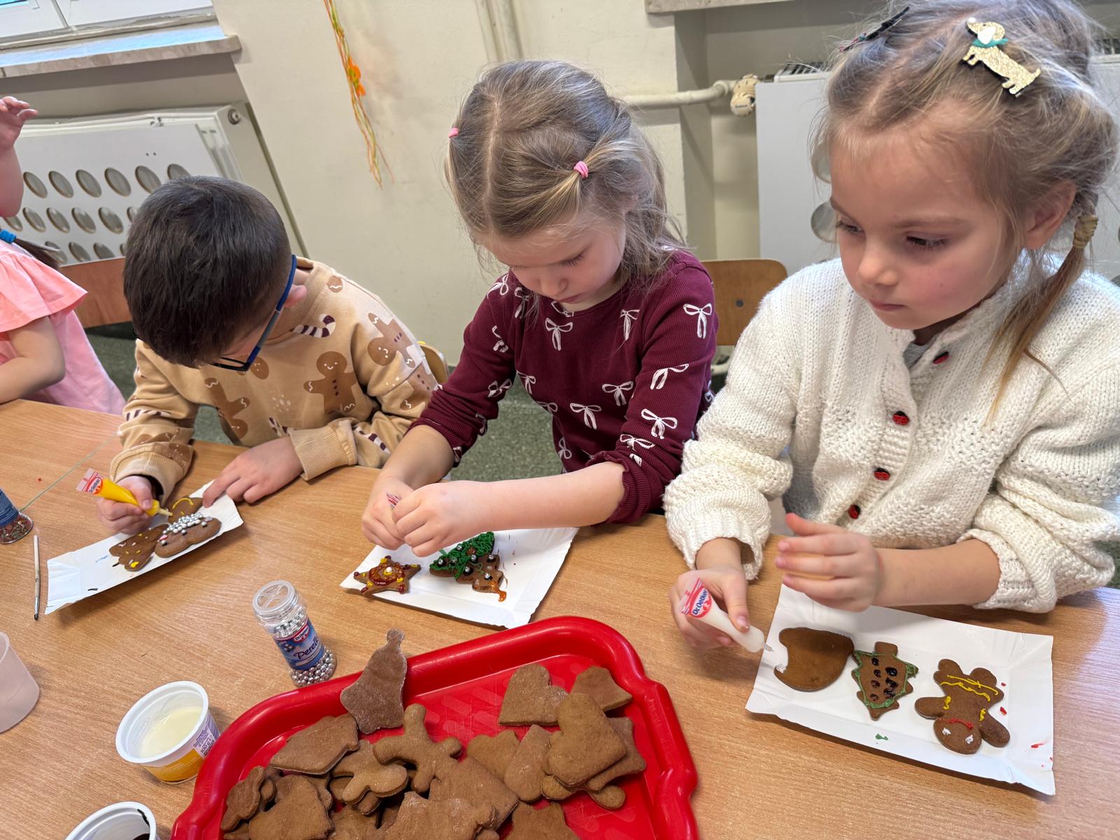 Dzieci zamieniły się w małych cukierników — wałkowały ciasto, wykrawały świąteczne kształty, a potem z dumą dekorowały pierniczki kolorowymi lukrami i posypkami. W całej sali unosił się zapach świąt.