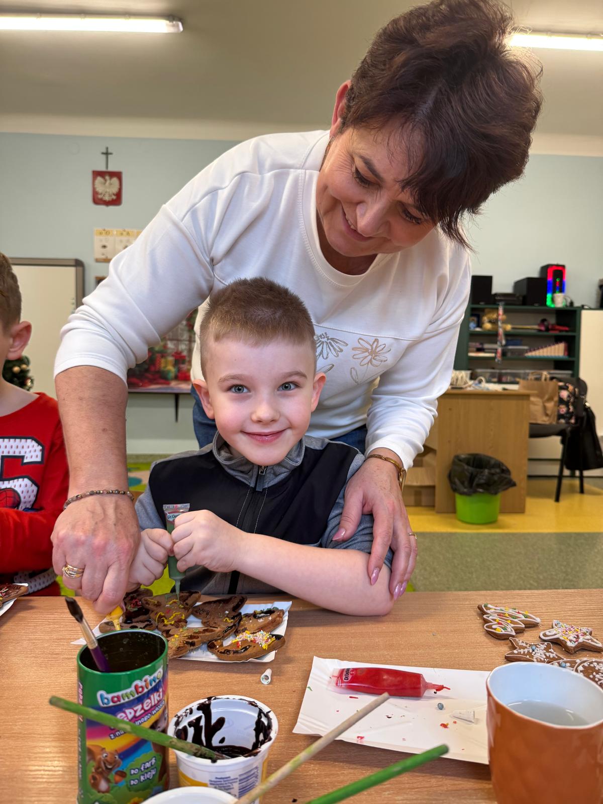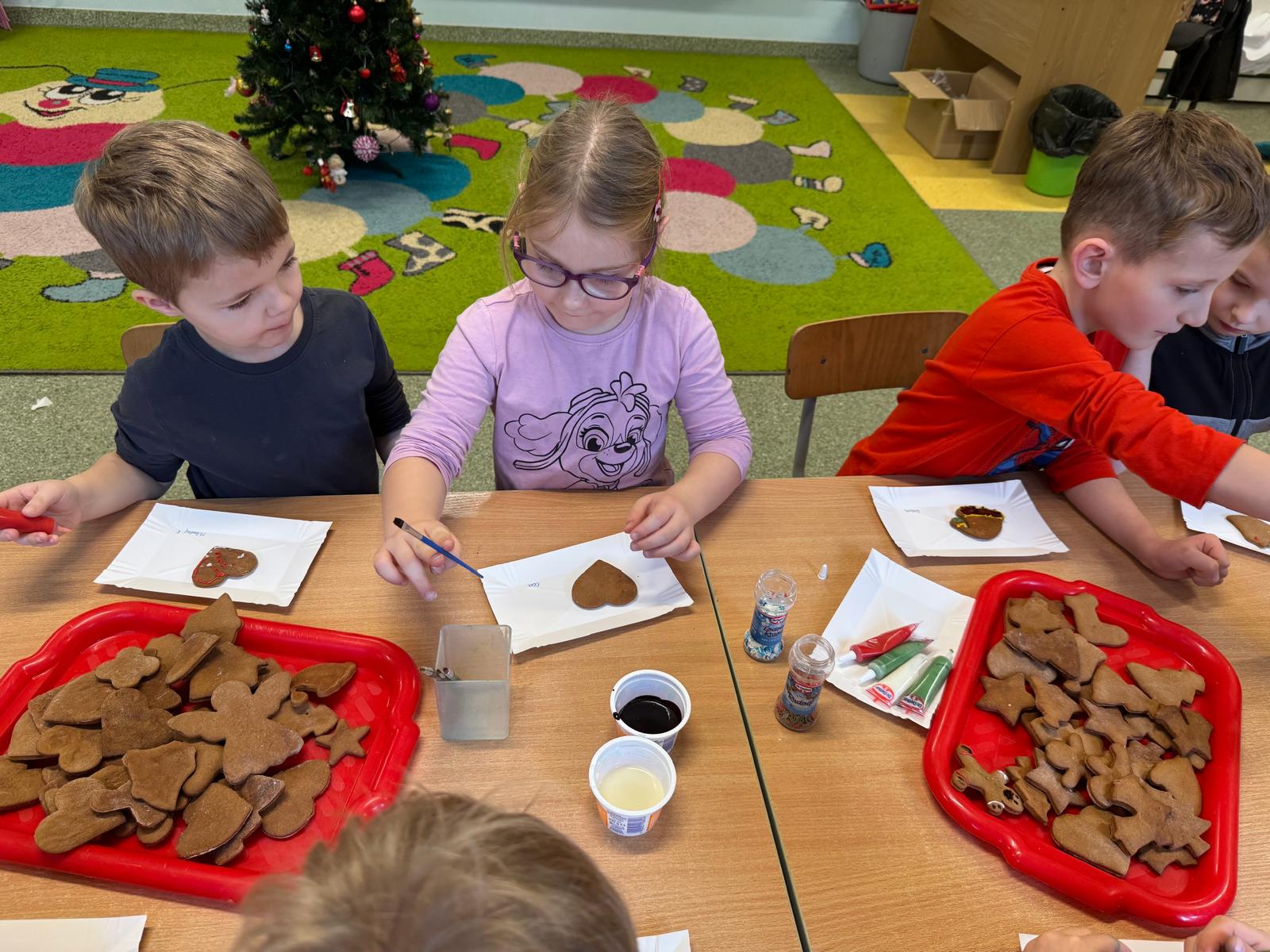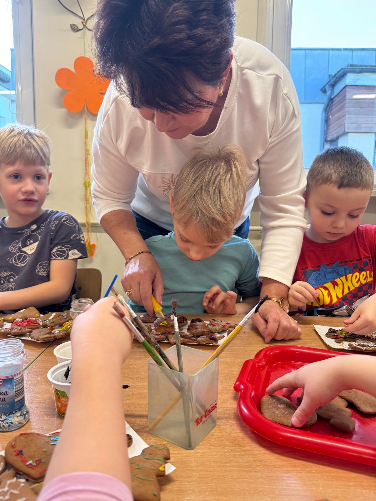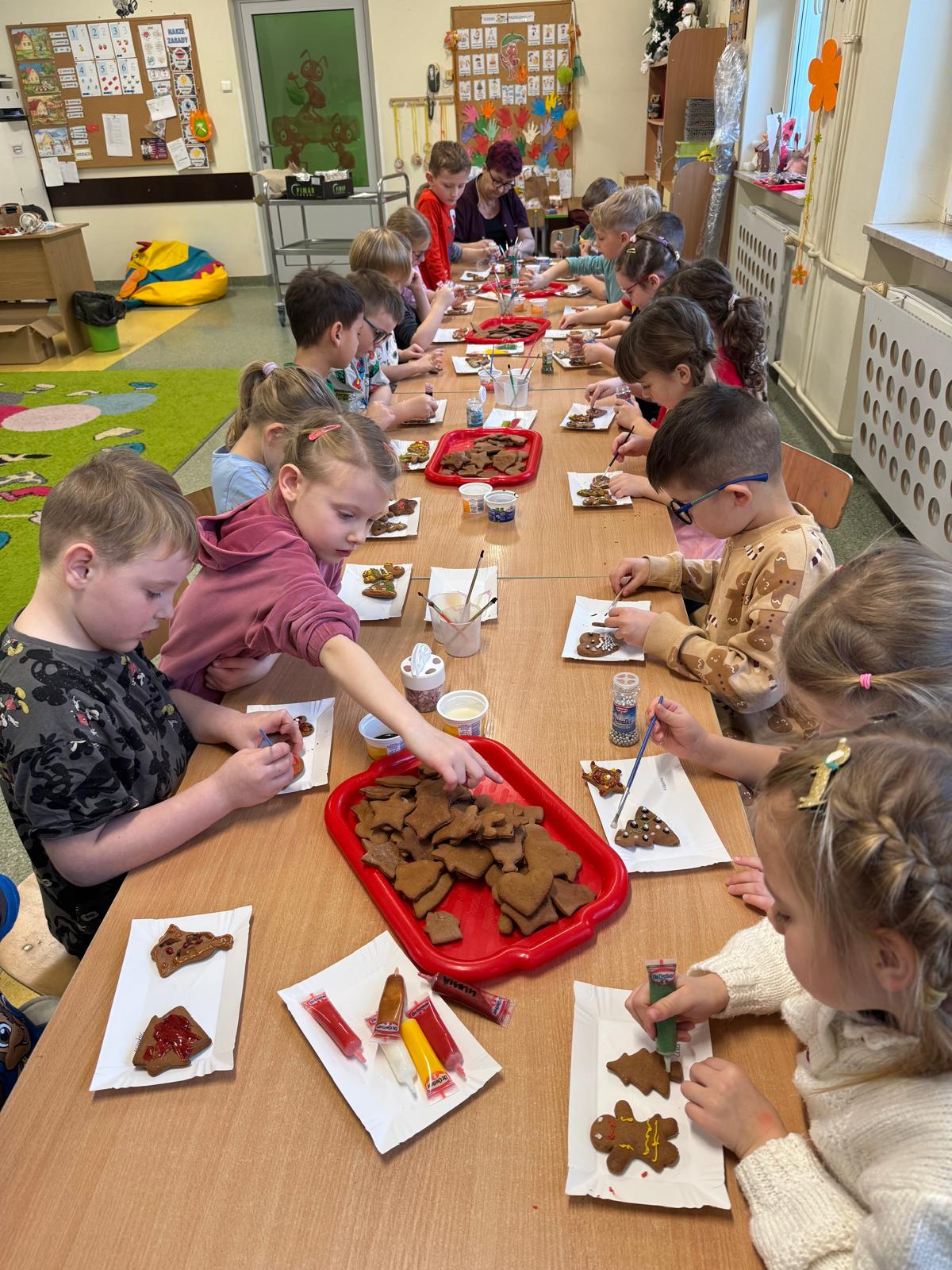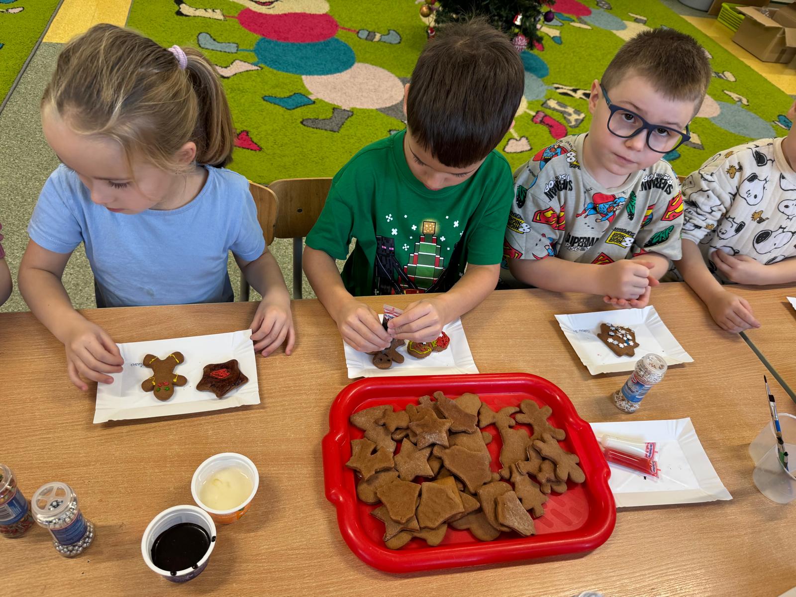 Dzieci zamieniły się w małych cukierników — wałkowały ciasto, wykrawały świąteczne kształty, a potem z dumą dekorowały pierniczki kolorowymi lukrami i posypkami. W całej sali unosił się zapach świąt.
