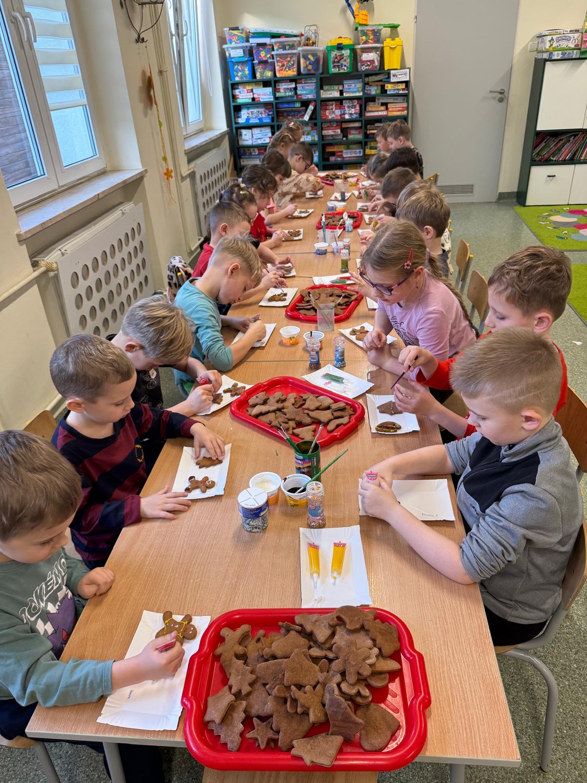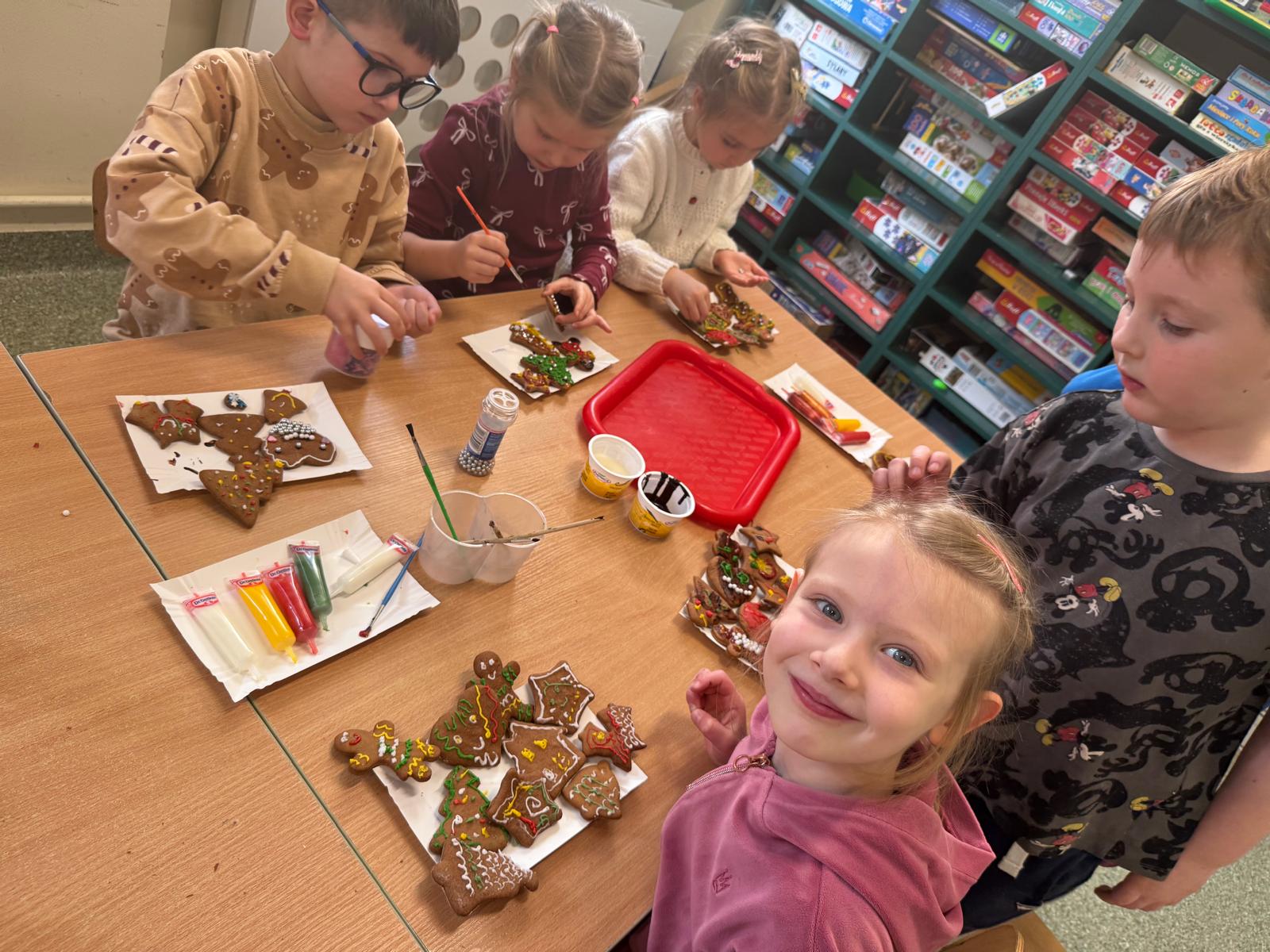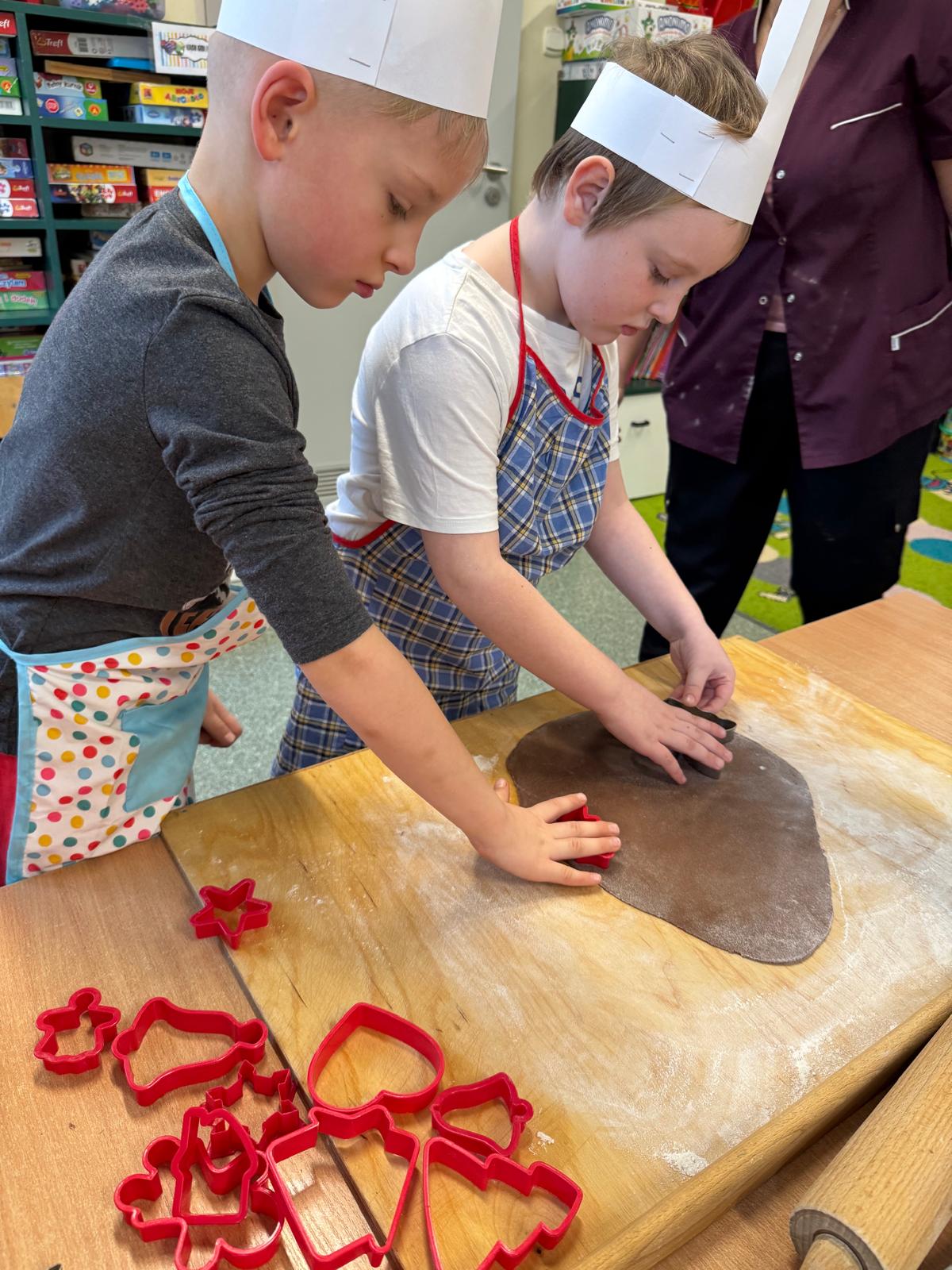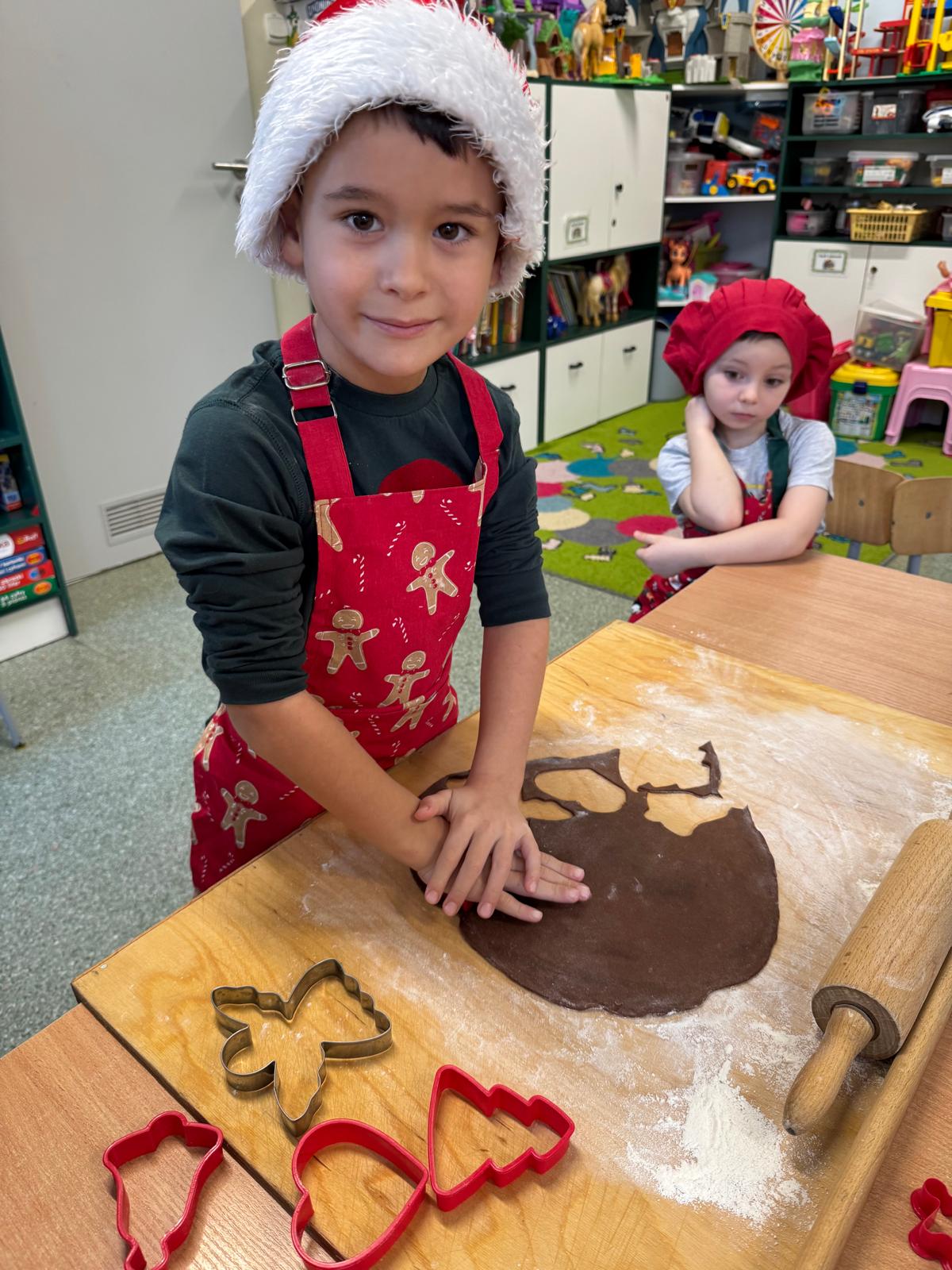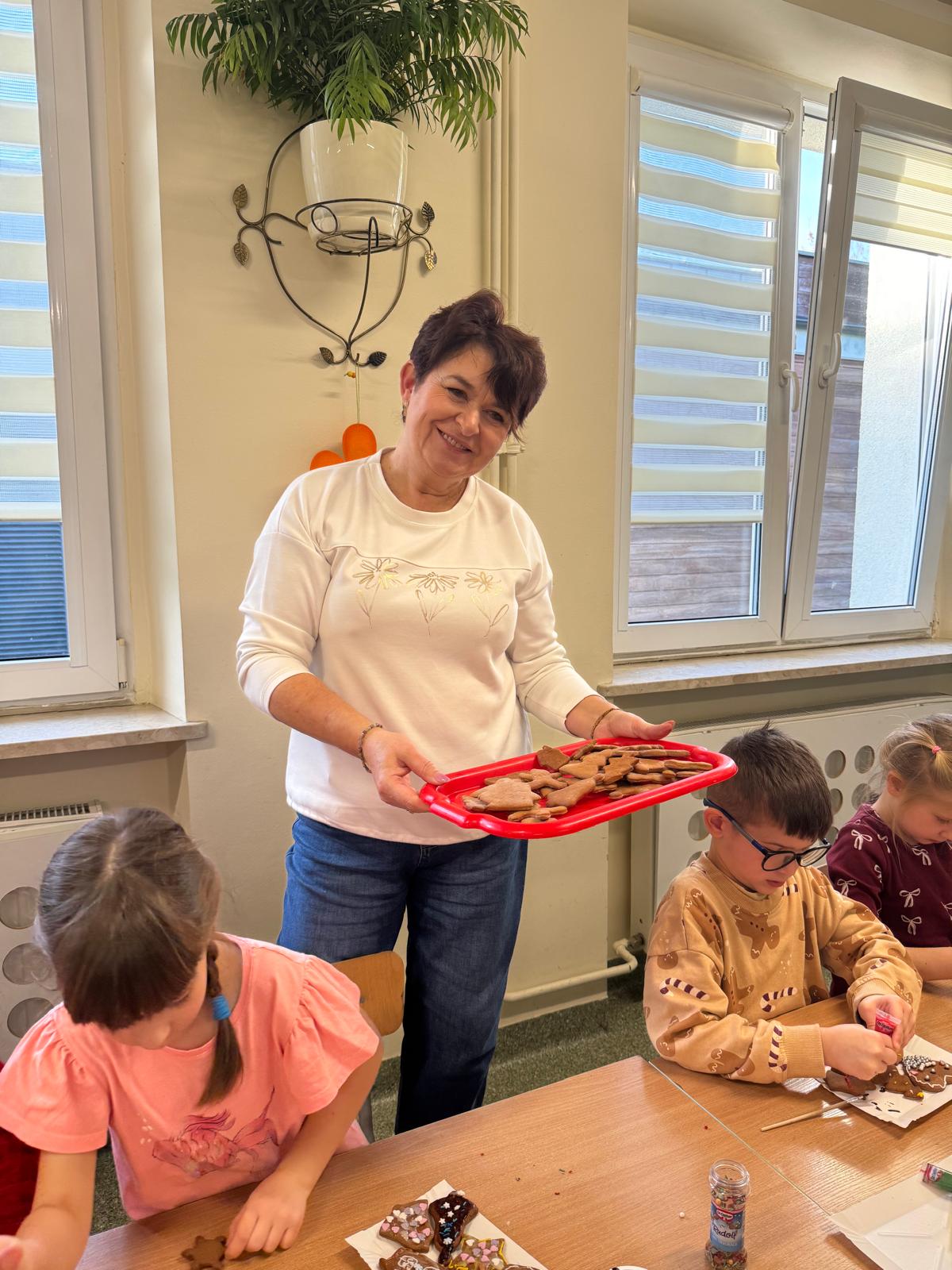 Dzieci zamieniły się w małych cukierników — wałkowały ciasto, wykrawały świąteczne kształty, a potem z dumą dekorowały pierniczki kolorowymi lukrami i posypkami. W całej sali unosił się zapach świąt.