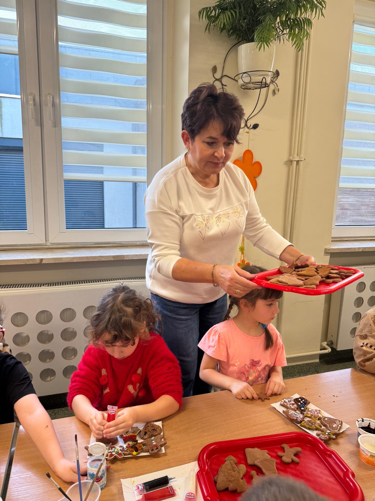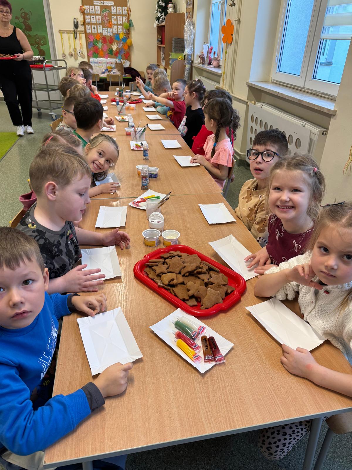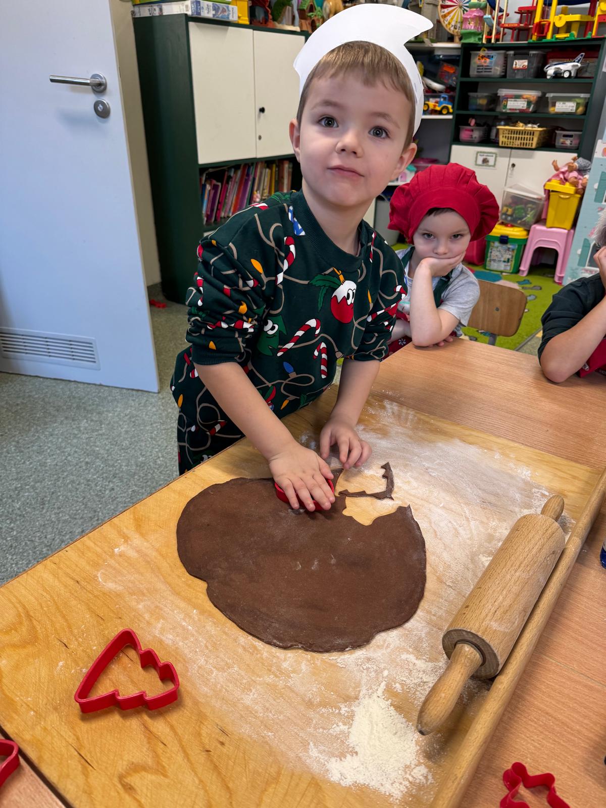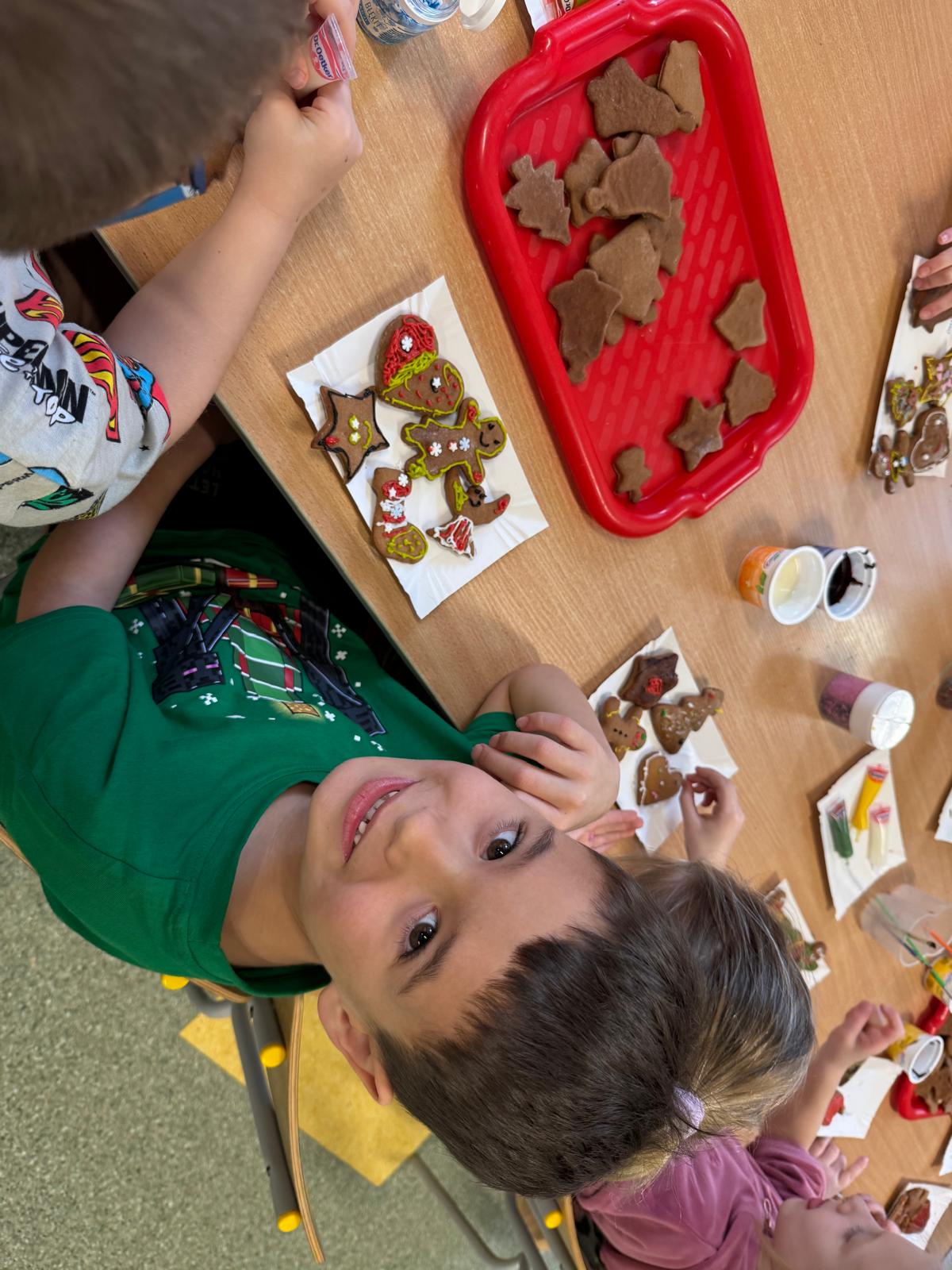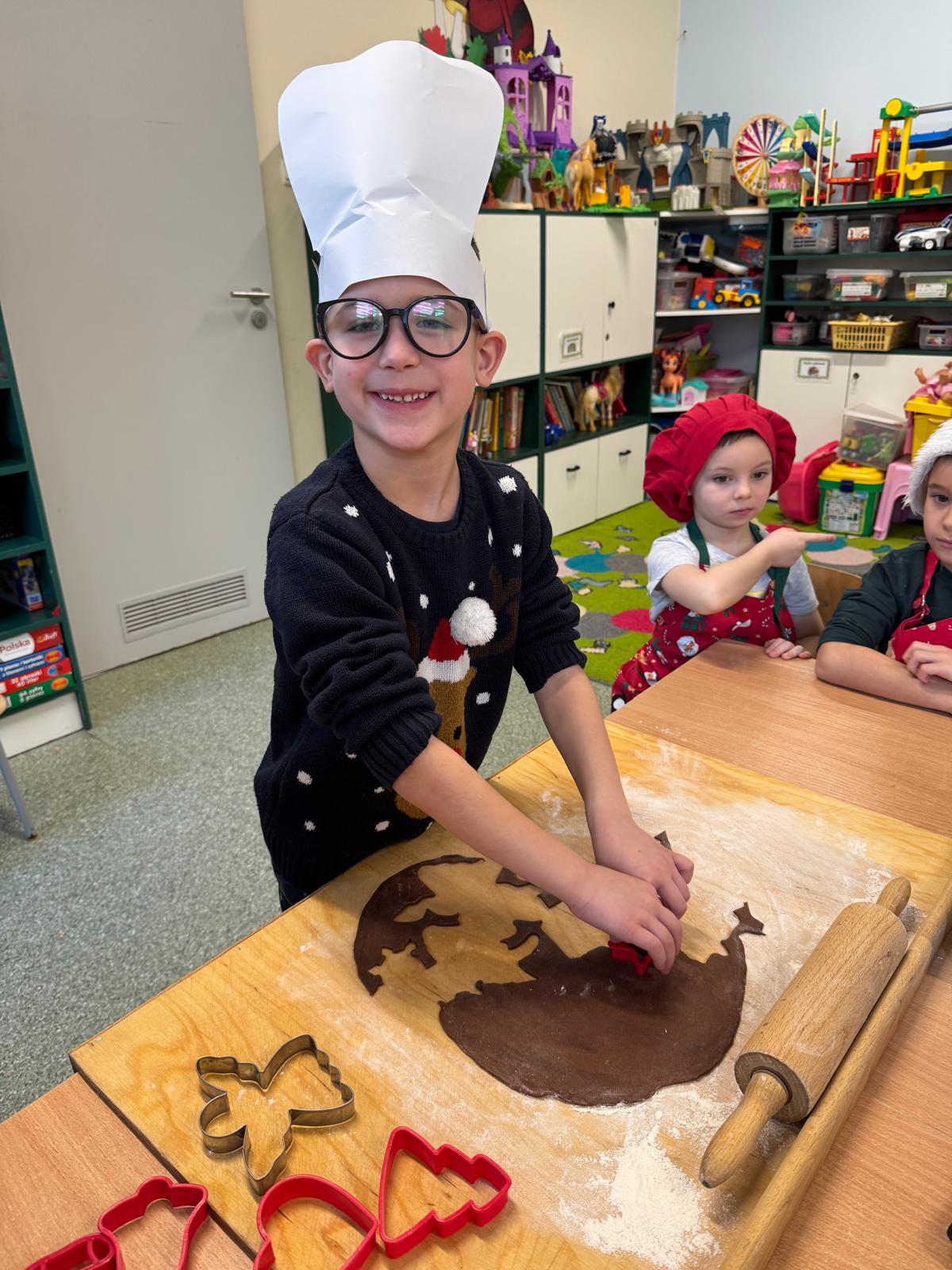 Dzieci zamieniły się w małych cukierników — wałkowały ciasto, wykrawały świąteczne kształty, a potem z dumą dekorowały pierniczki kolorowymi lukrami i posypkami. W całej sali unosił się zapach świąt.