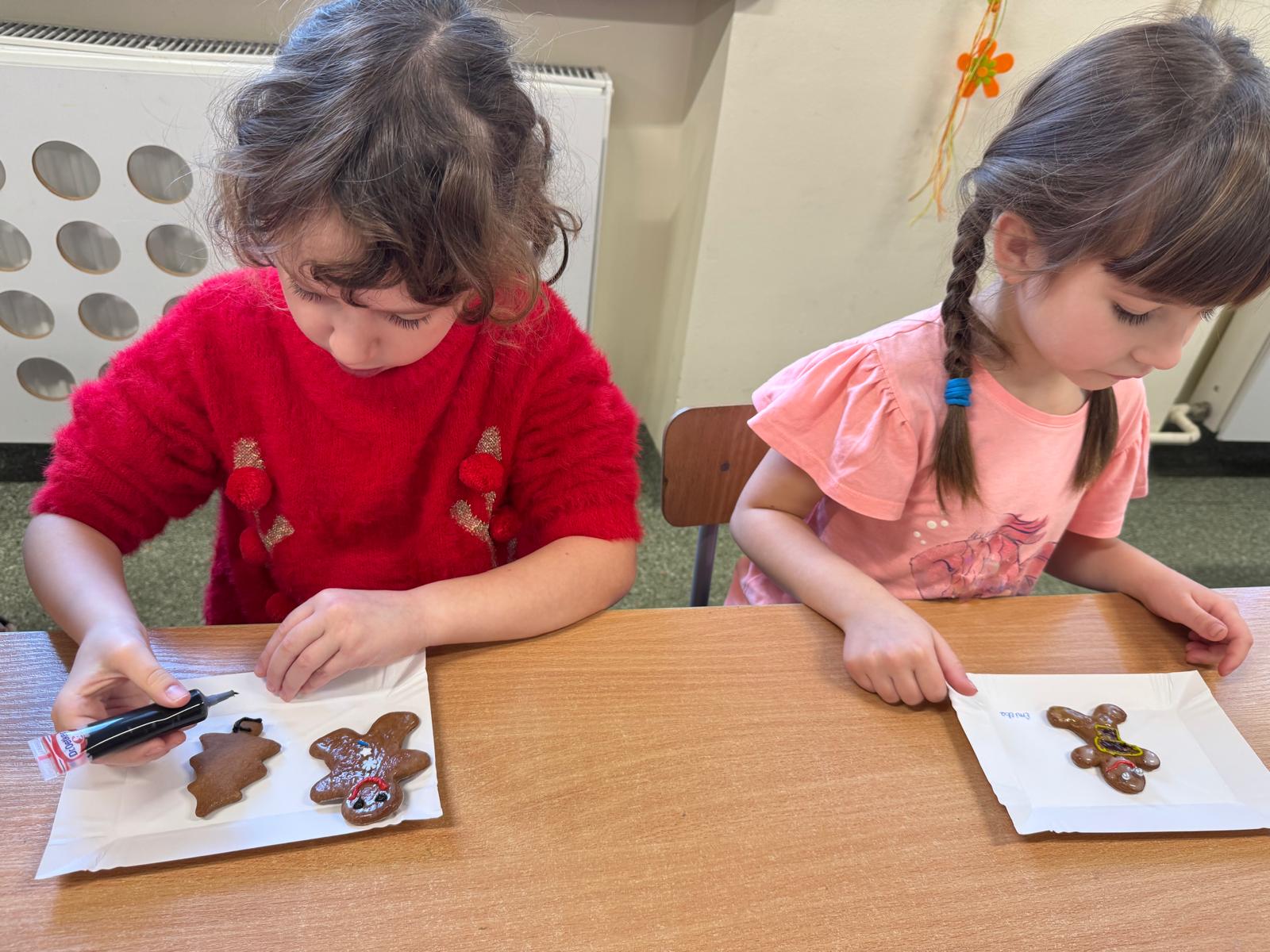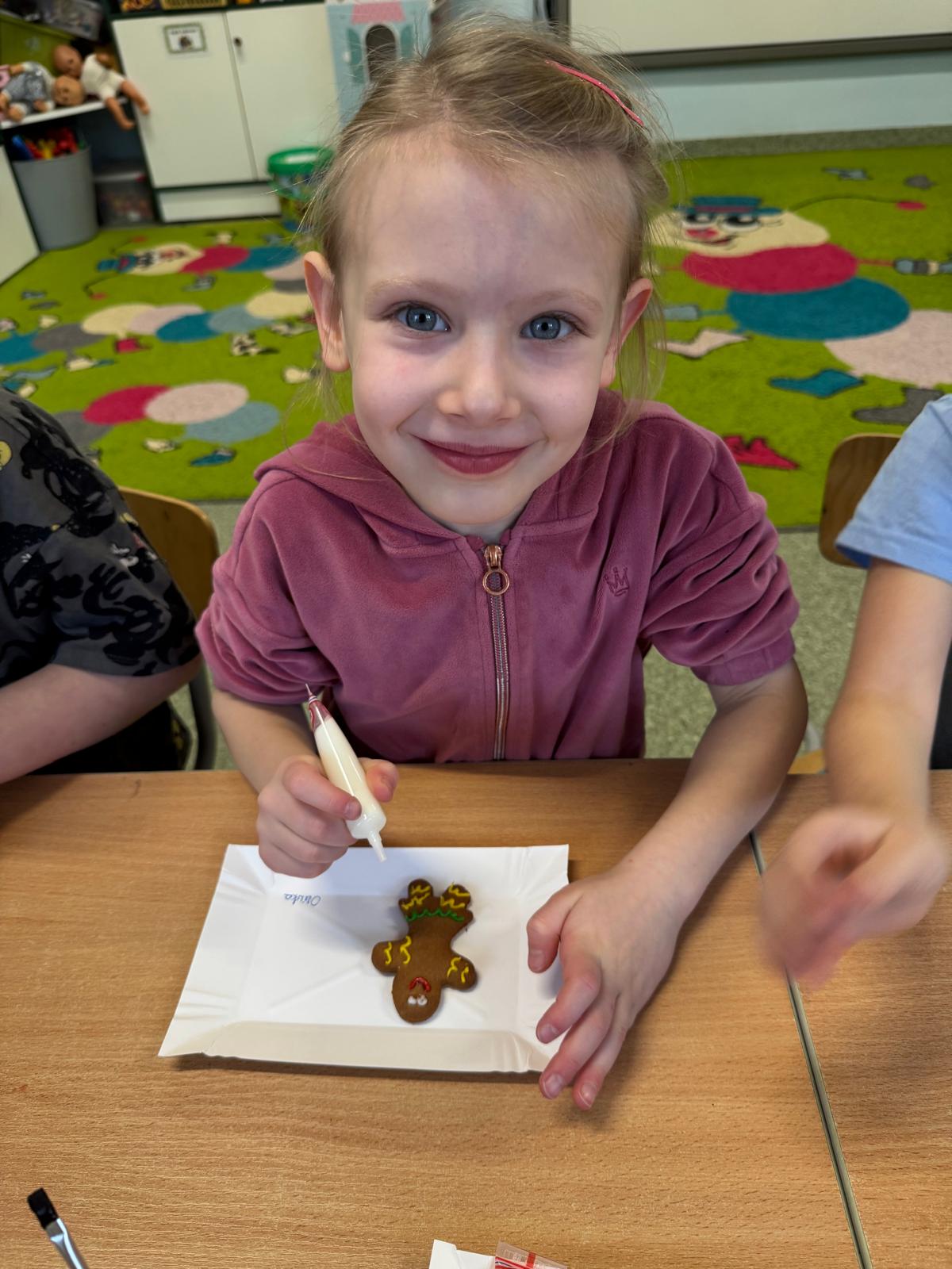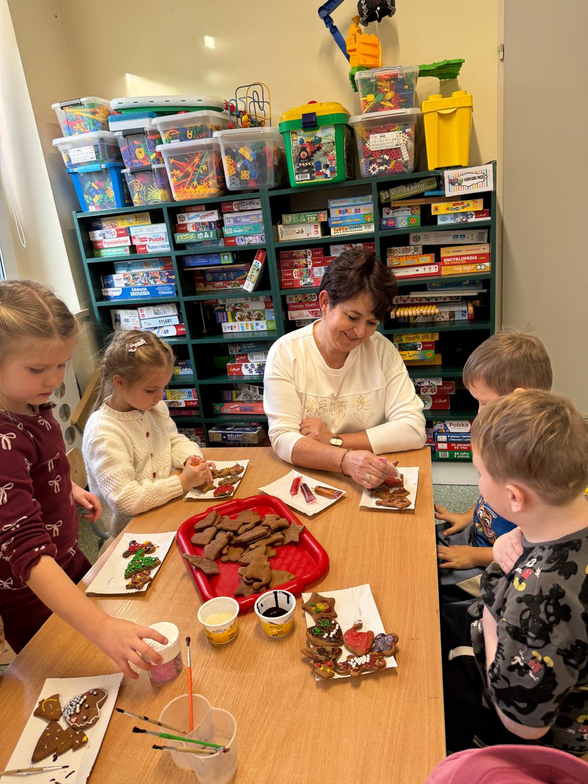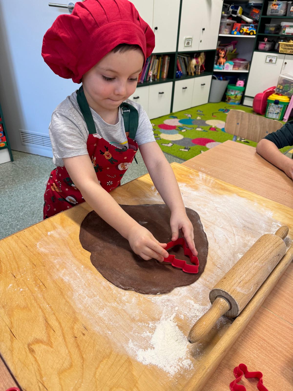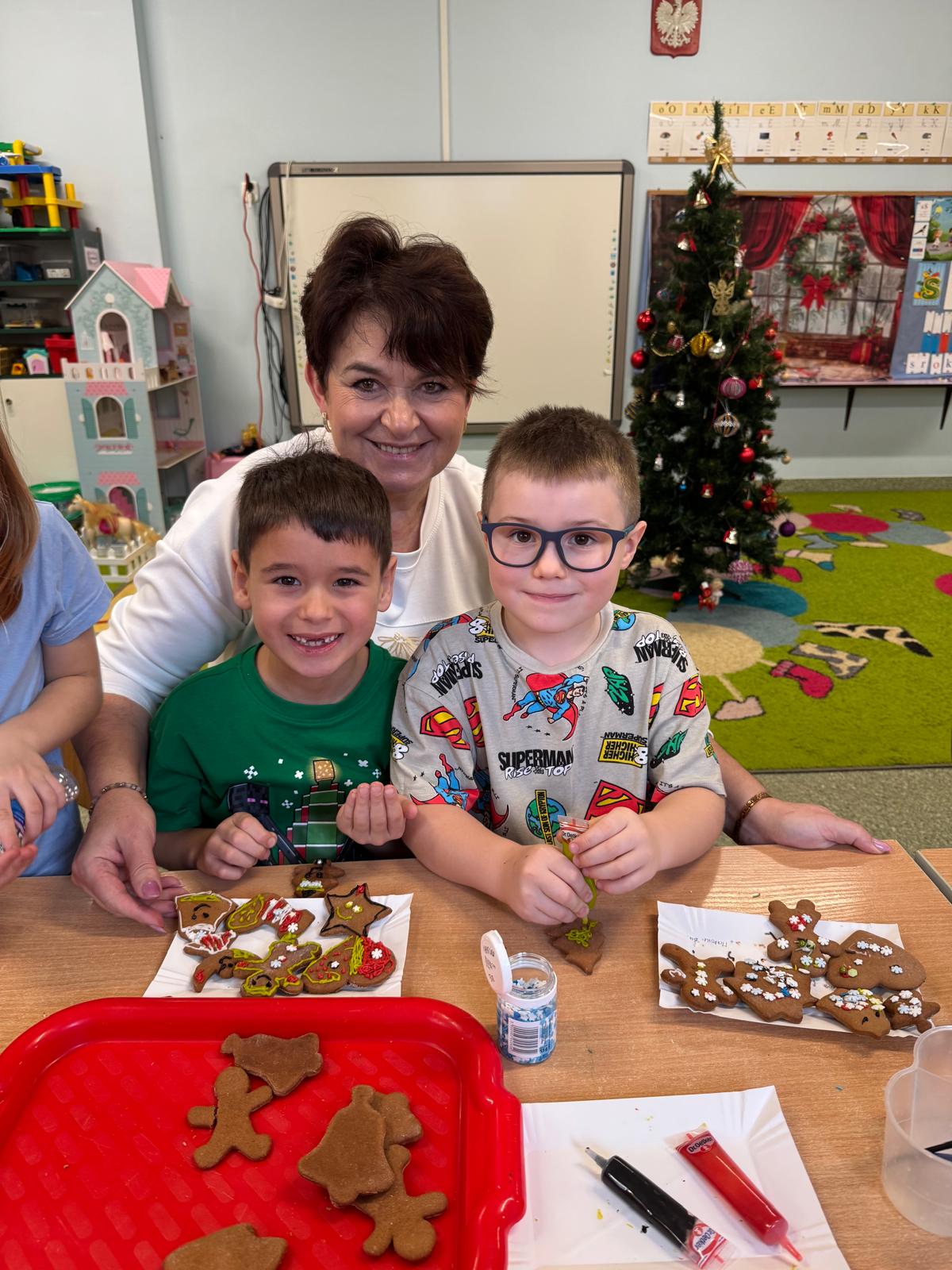 Dzieci zamieniły się w małych cukierników — wałkowały ciasto, wykrawały świąteczne kształty, a potem z dumą dekorowały pierniczki kolorowymi lukrami i posypkami. W całej sali unosił się zapach świąt.