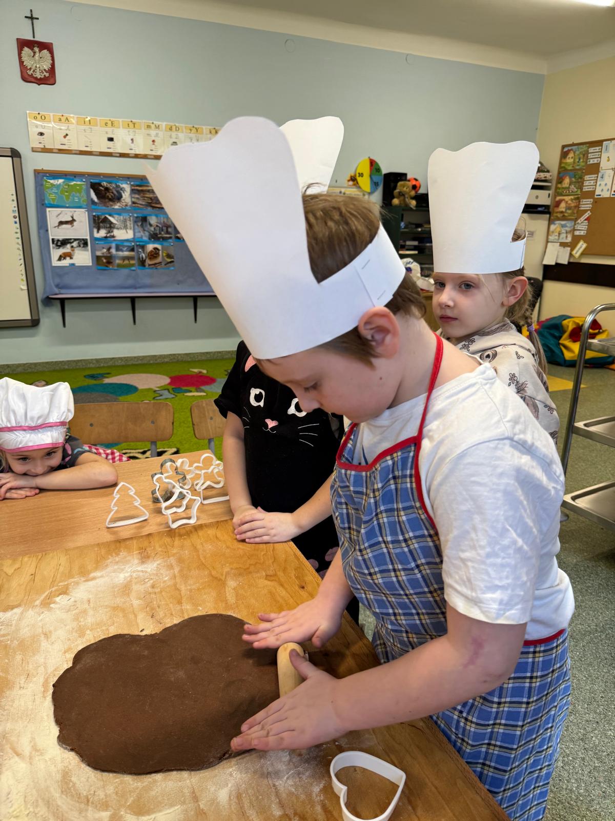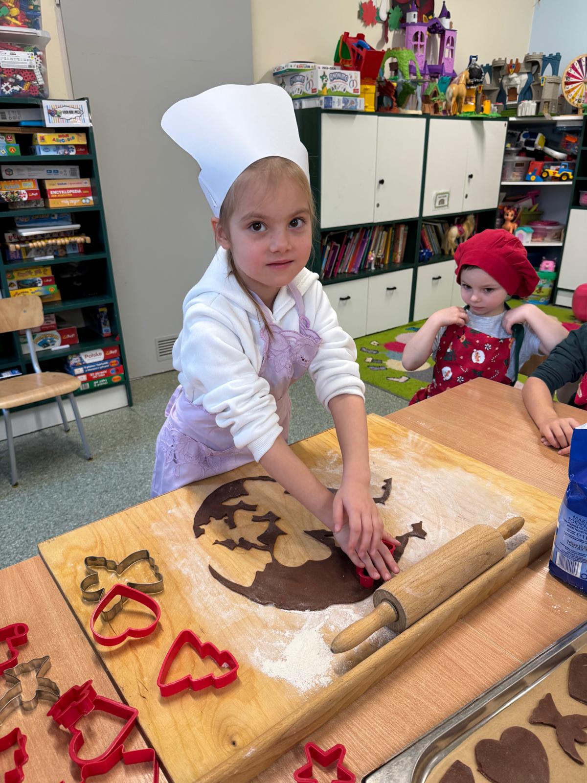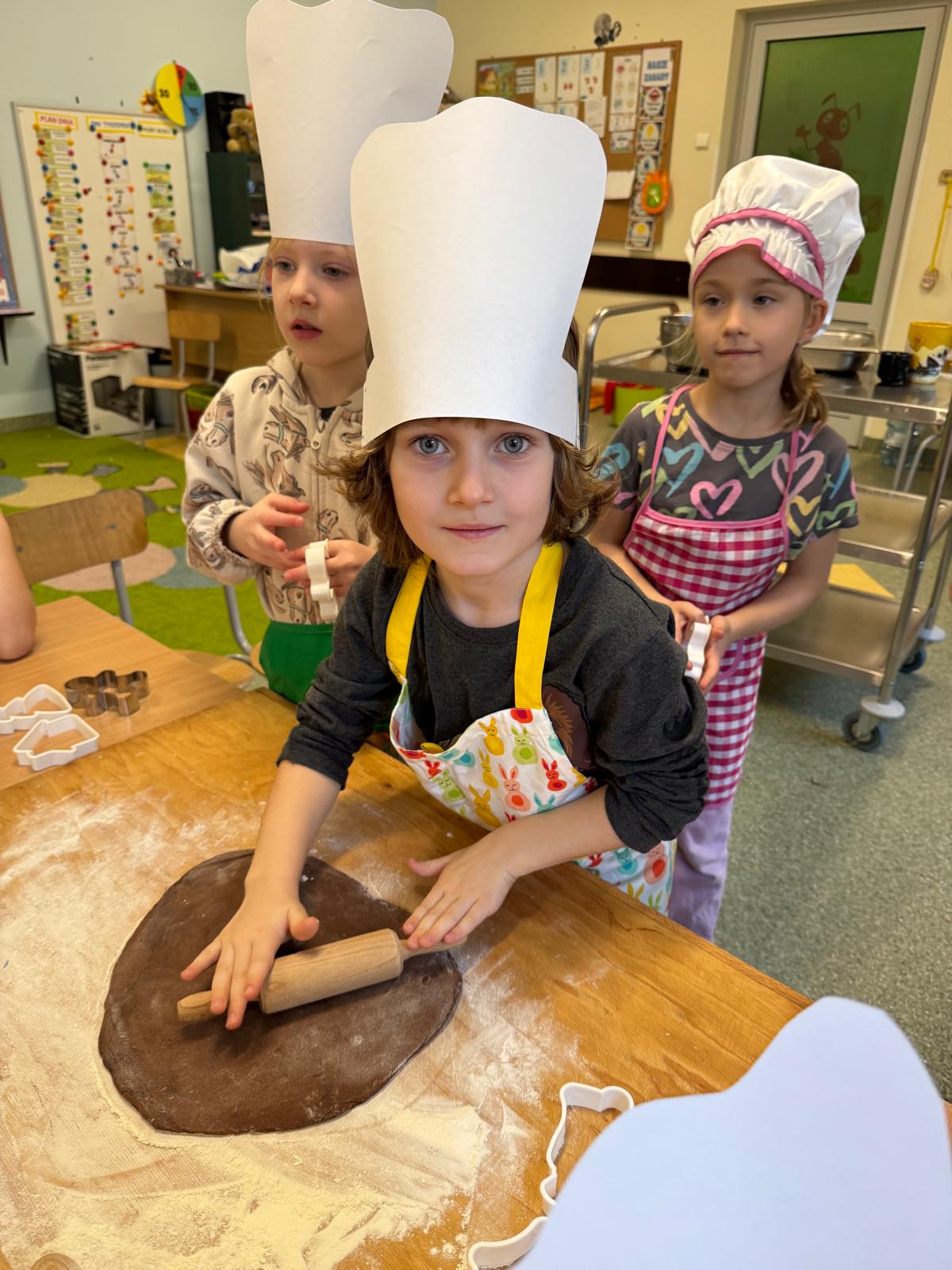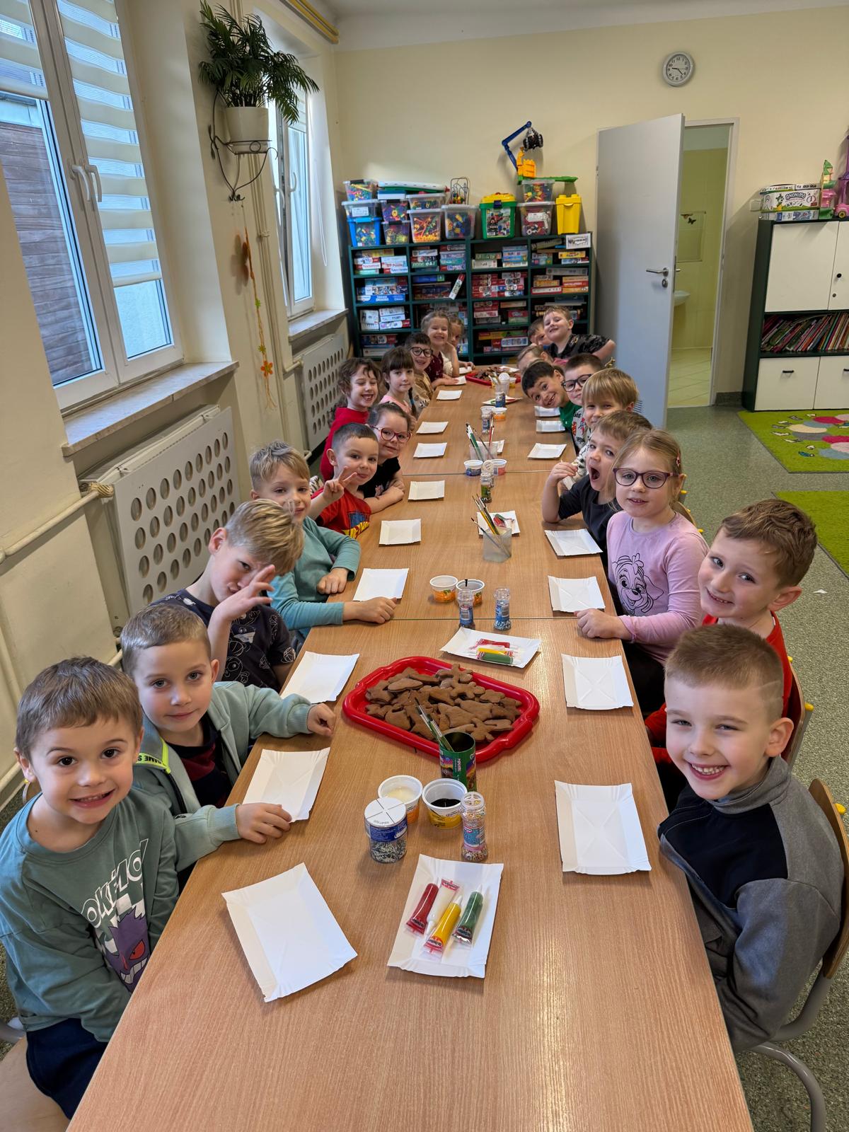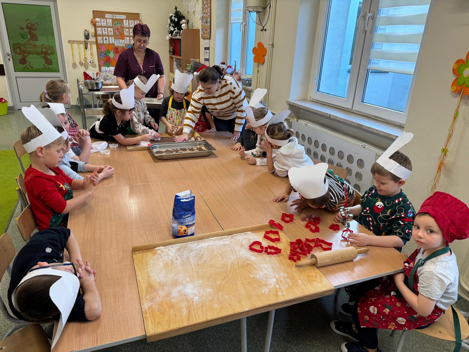 Dzieci zamieniły się w małych cukierników — wałkowały ciasto, wykrawały świąteczne kształty, a potem z dumą dekorowały pierniczki kolorowymi lukrami i posypkami. W całej sali unosił się zapach świąt.