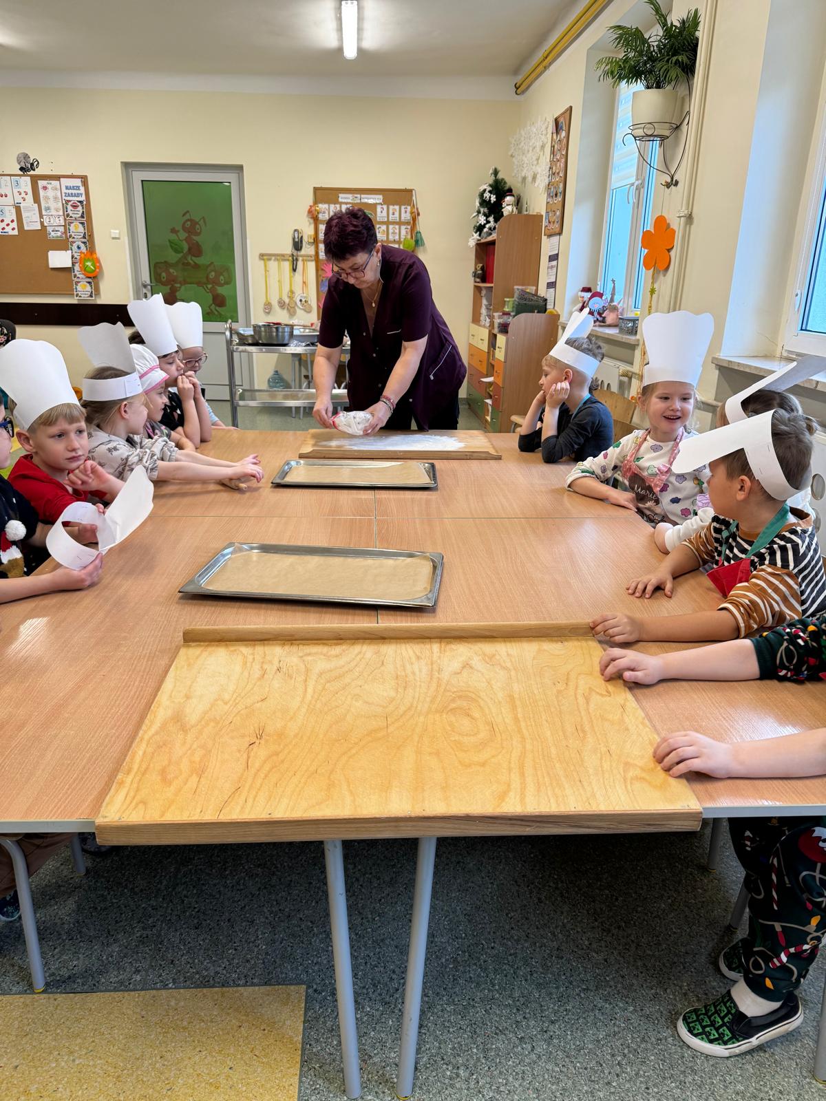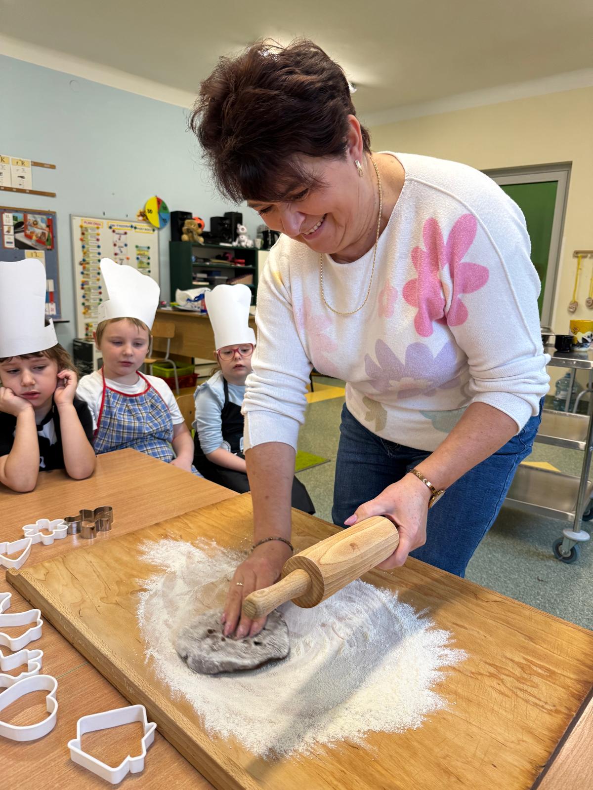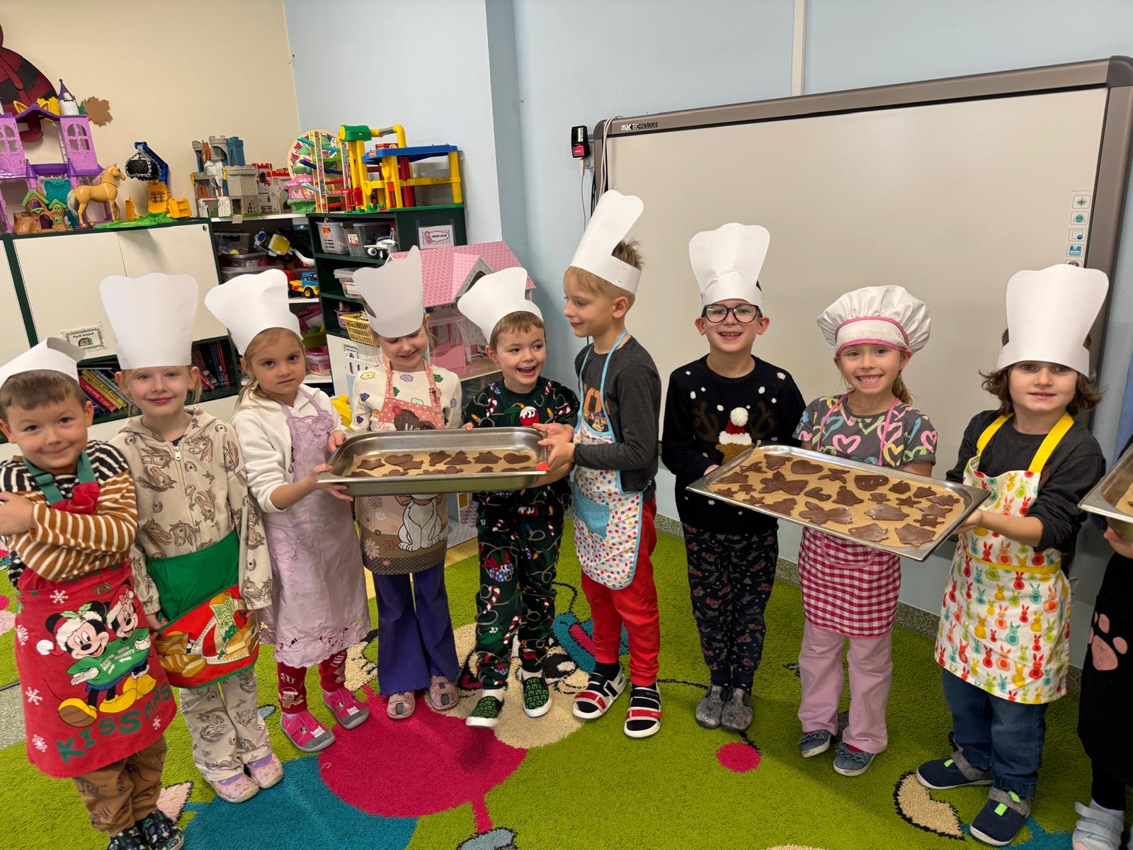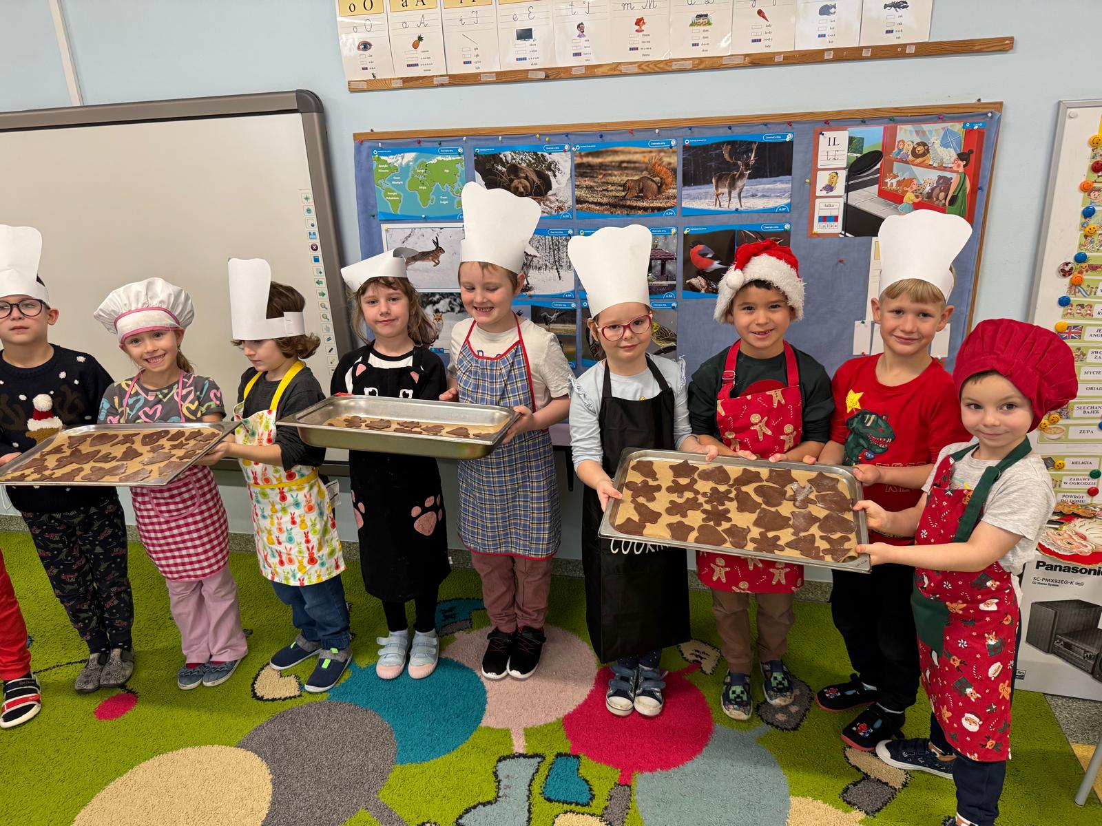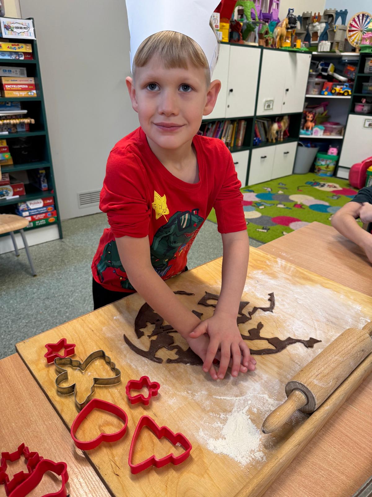 Dzieci zamieniły się w małych cukierników — wałkowały ciasto, wykrawały świąteczne kształty, a potem z dumą dekorowały pierniczki kolorowymi lukrami i posypkami. W całej sali unosił się zapach świąt.