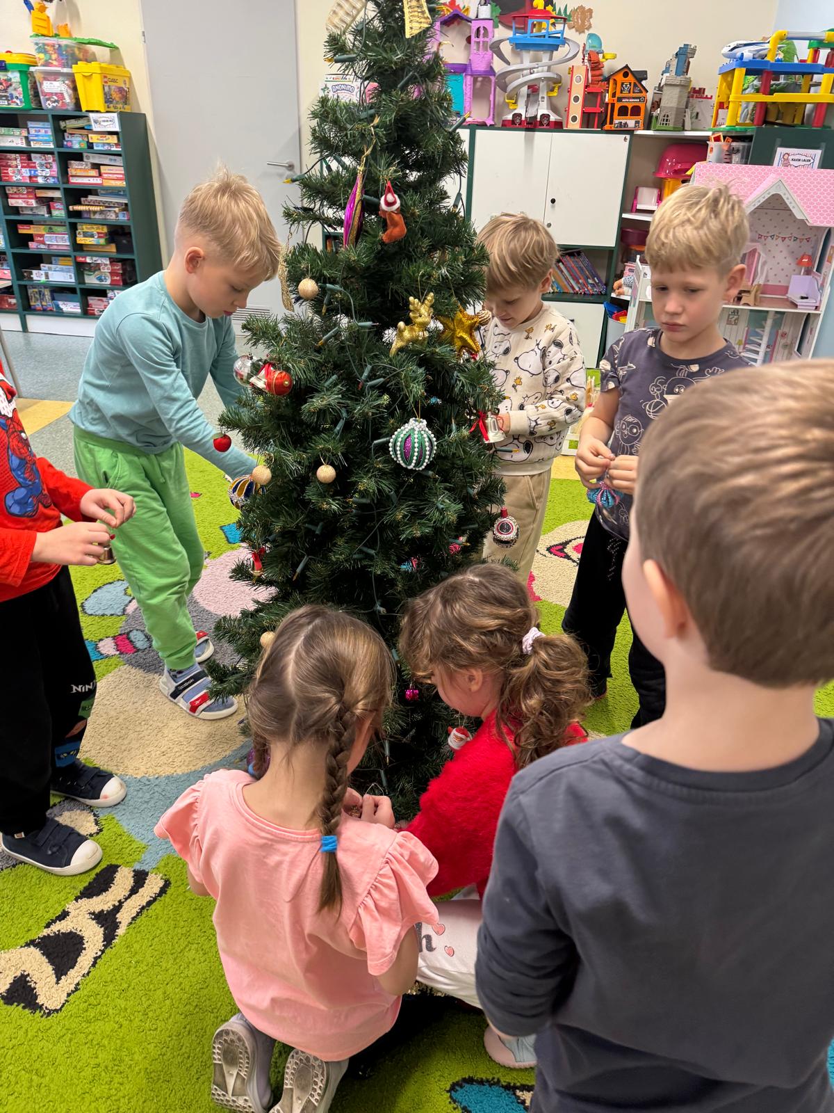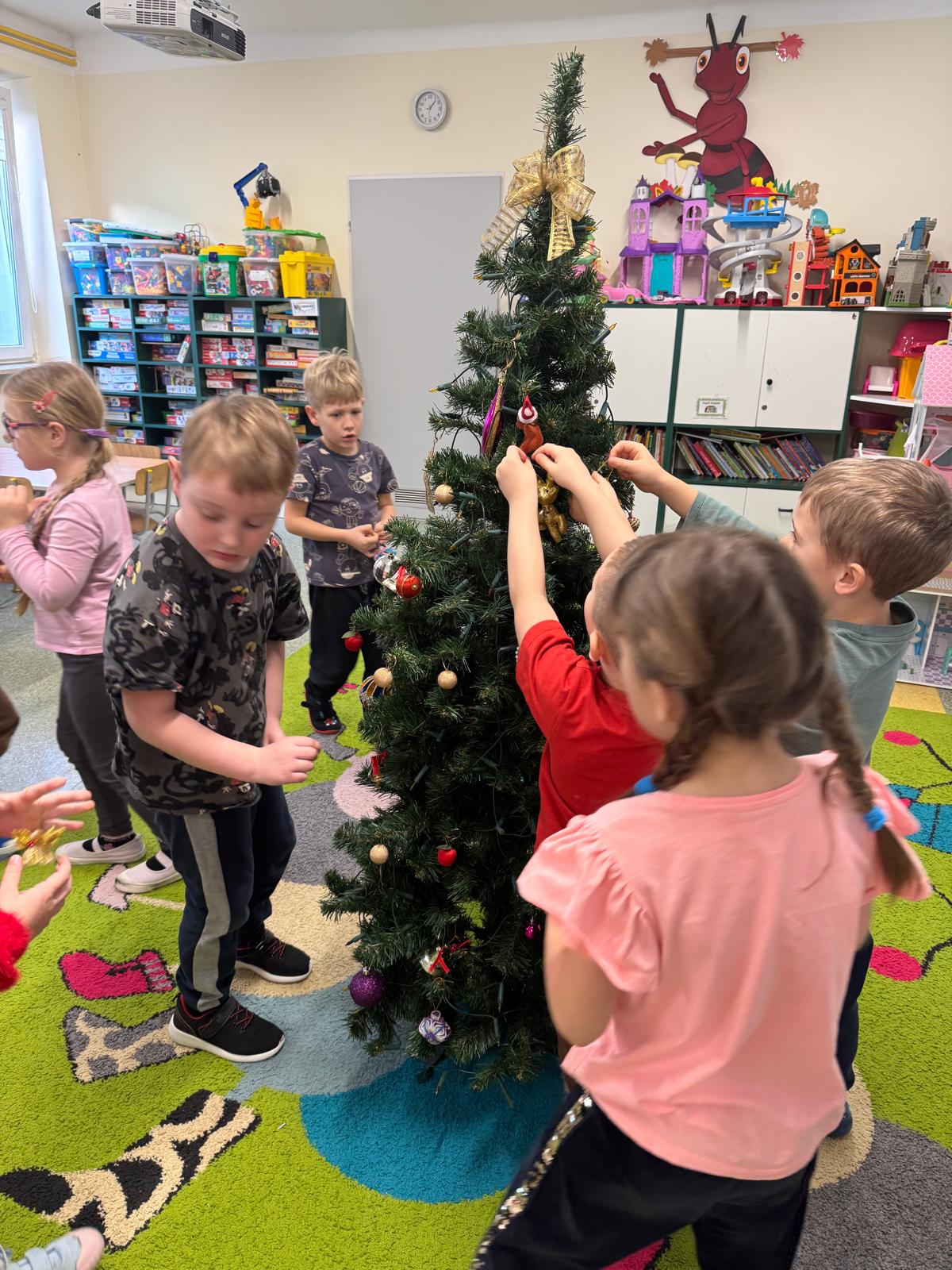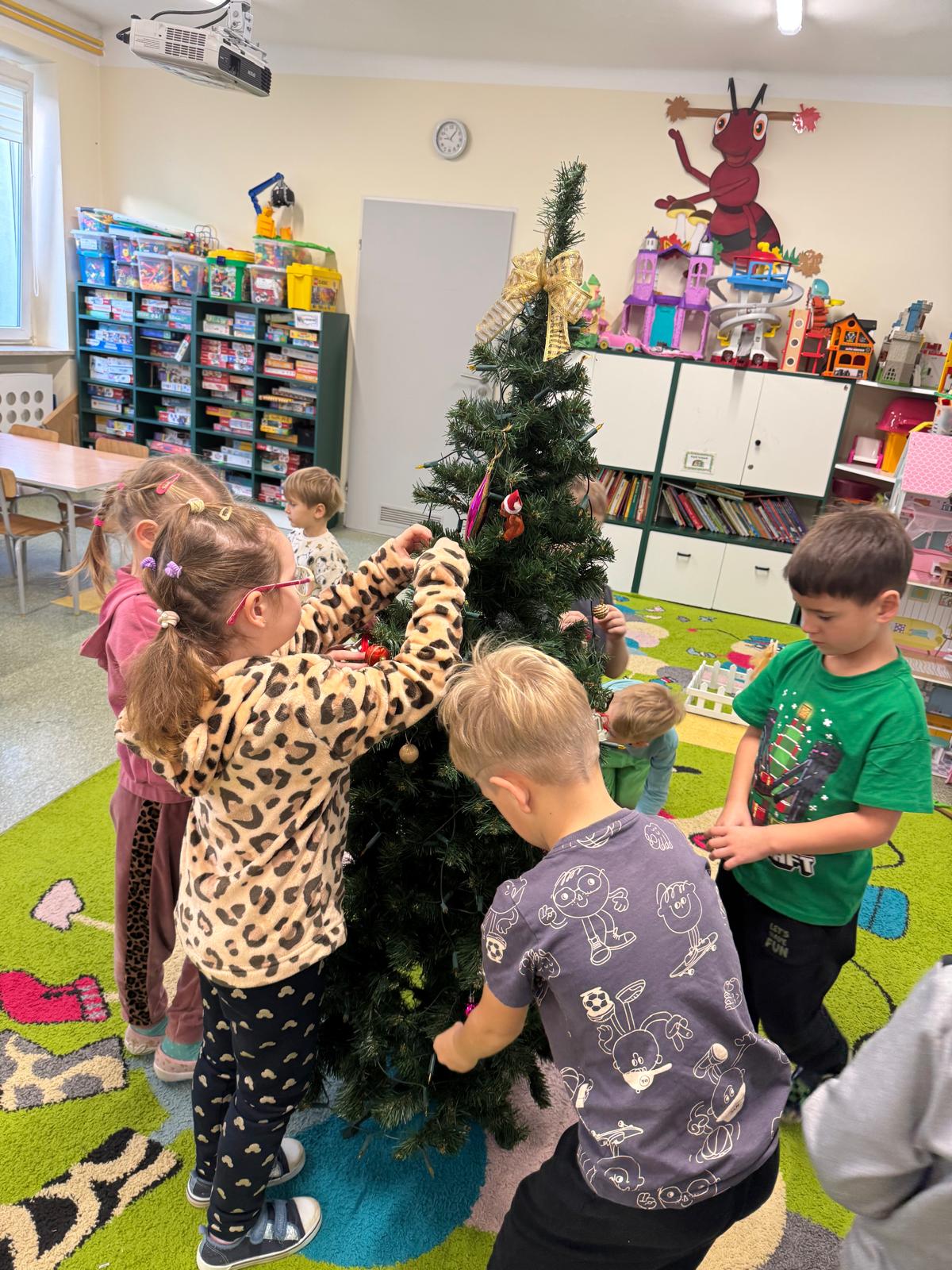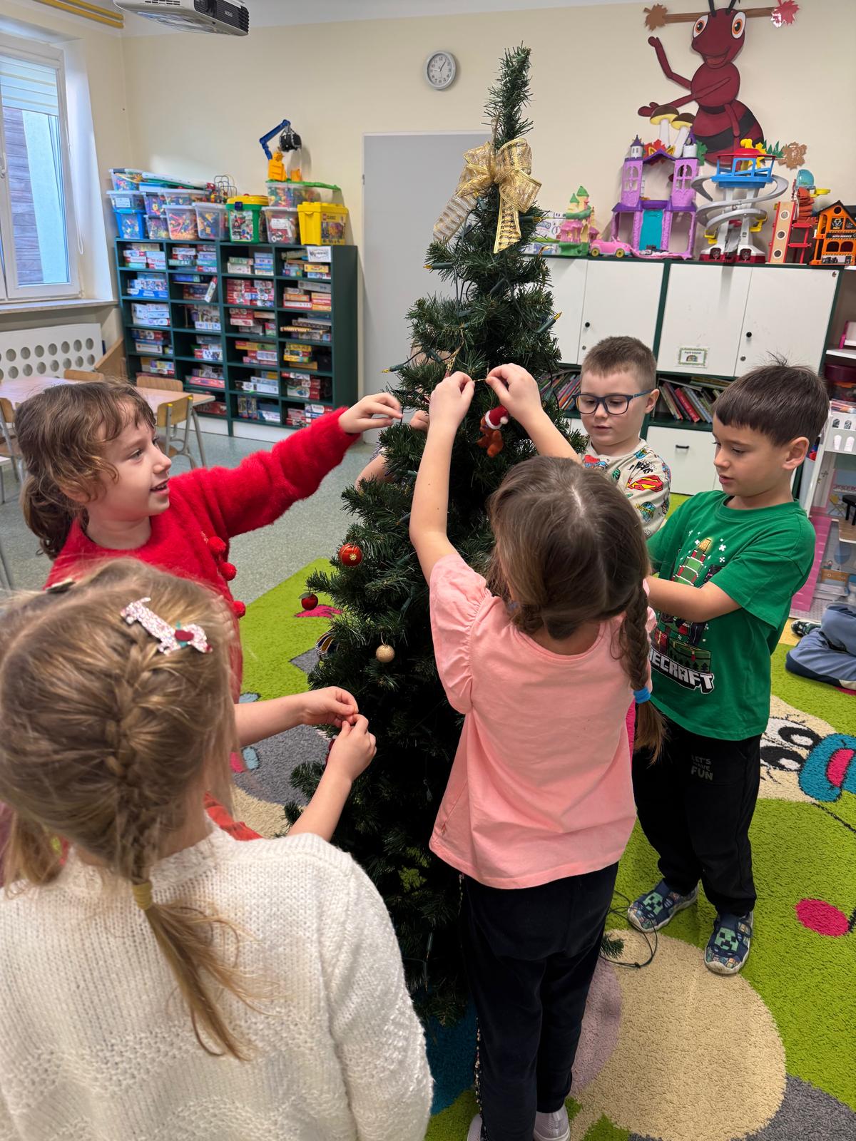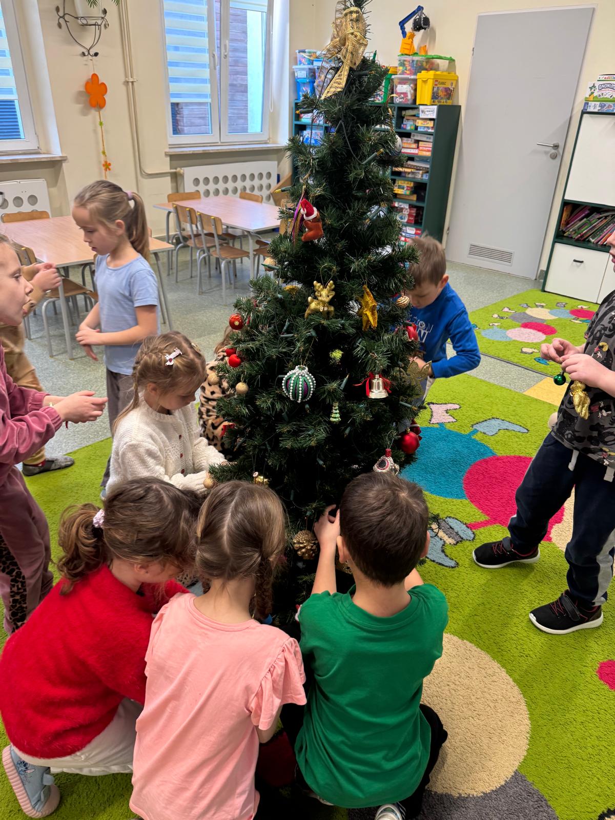 Najwięcej emocji wzbudziło wspólne ubieranie choinki. Dzieci zawieszały bombki, łańcuchy i własnoręcznie wykonane ozdoby. Na koniec na czubku drzewka pojawiła się błyszcząca gwiazda — symbol świątecznej magii.