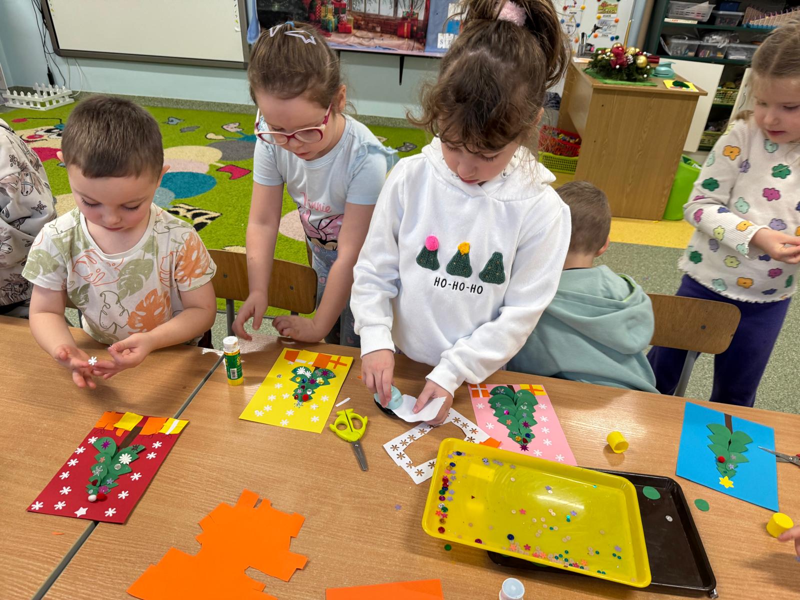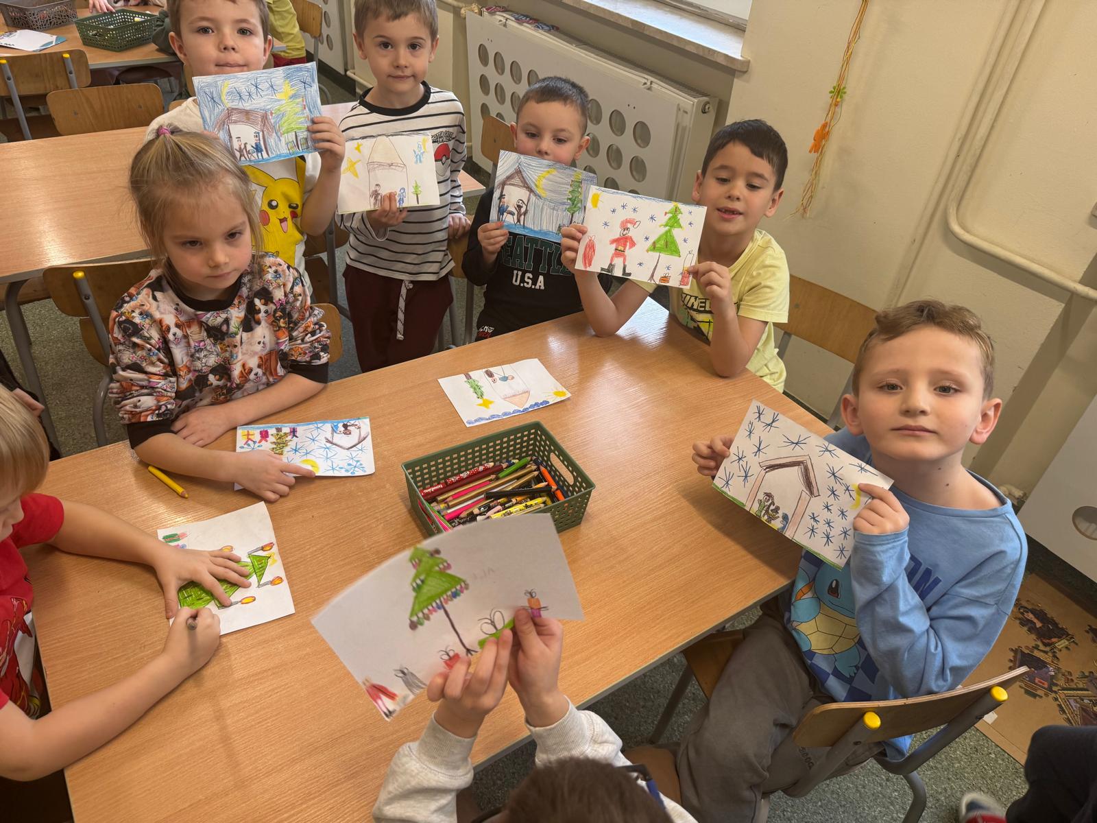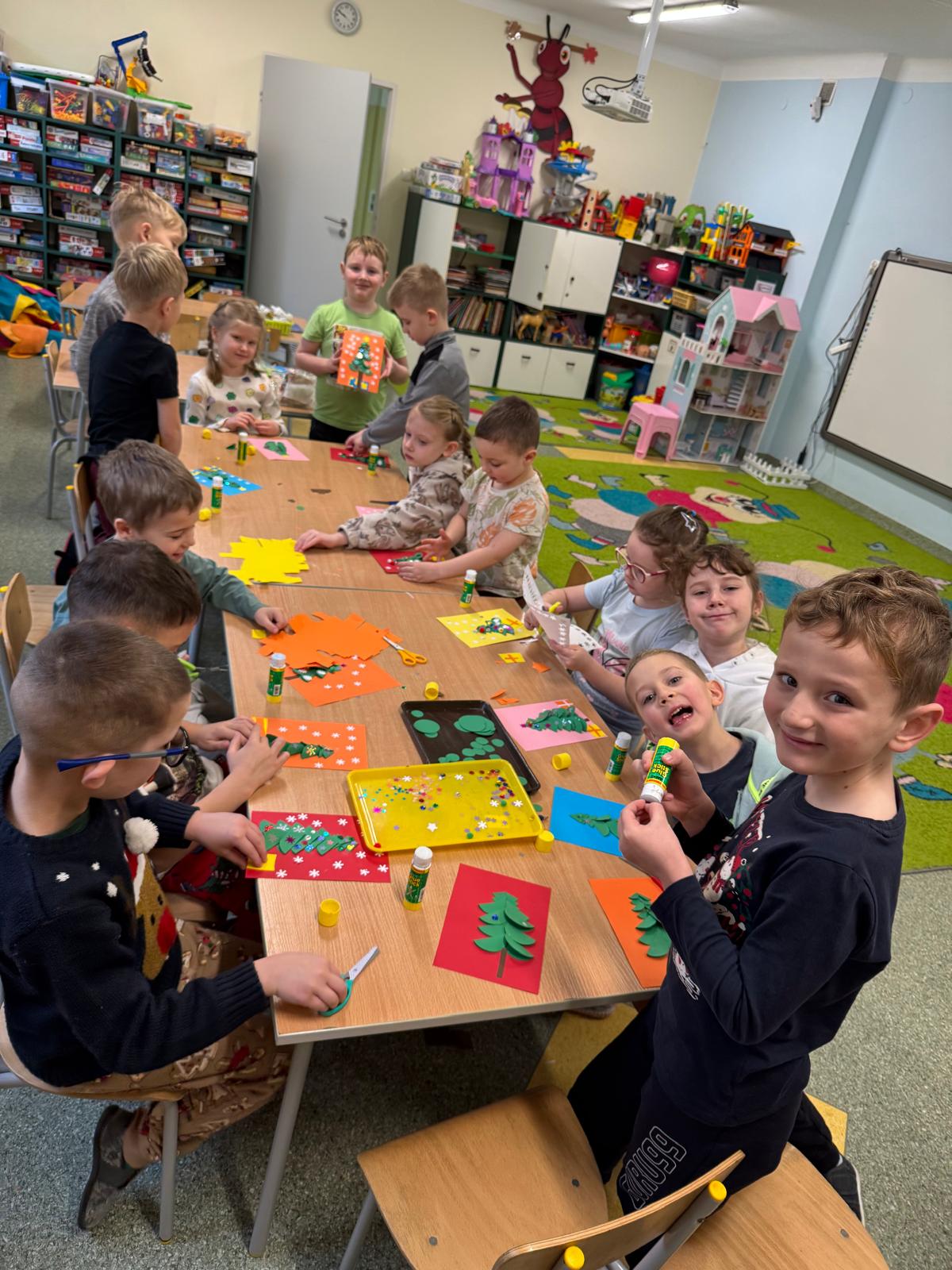 Mróweczki przygotowały również własnoręczne kartki świąteczne. Każda była wyjątkowa — pełna kolorów, brokatu i dziecięcej wyobraźni. To piękny sposób, by podzielić się dobrem i radością.