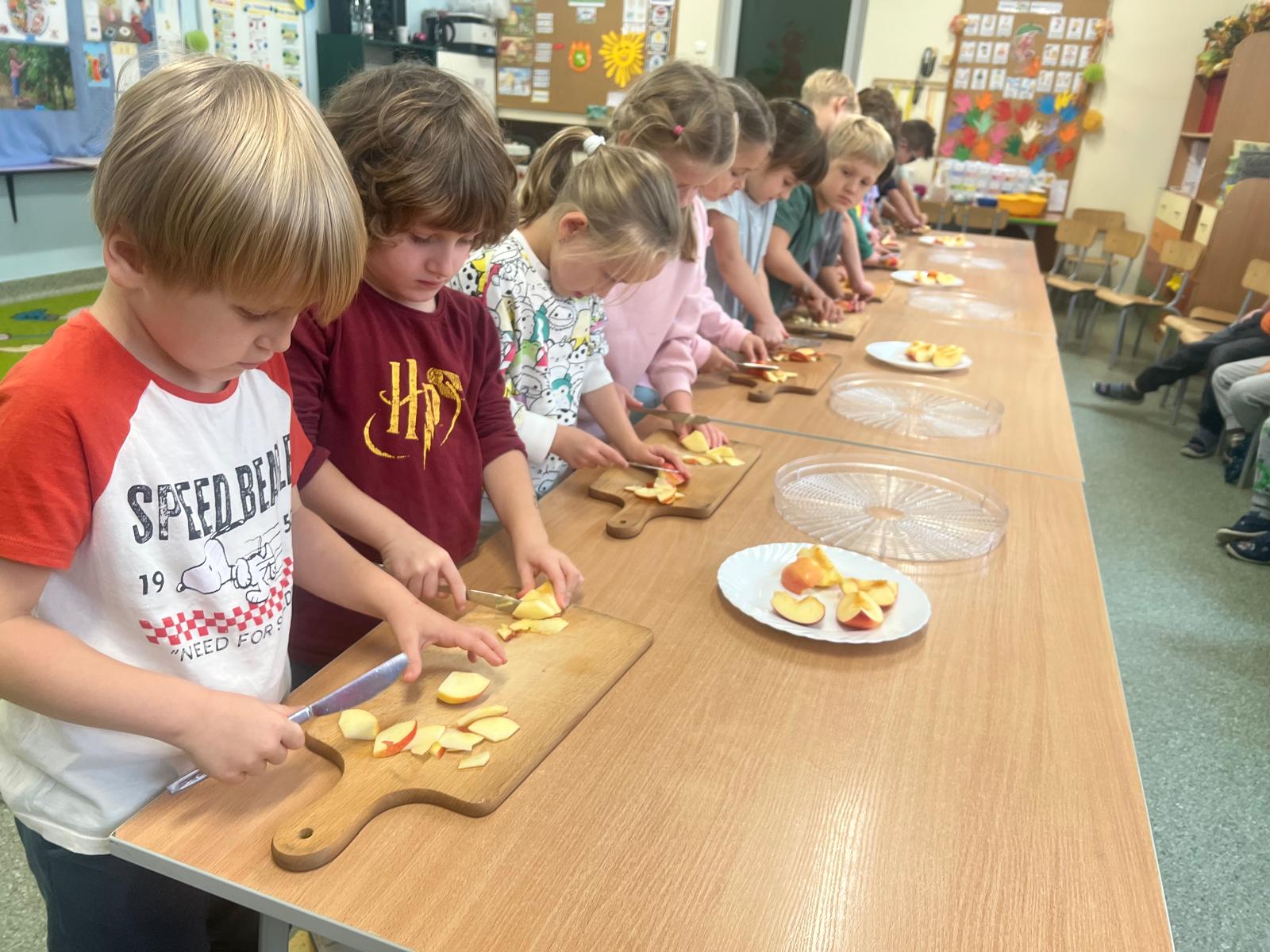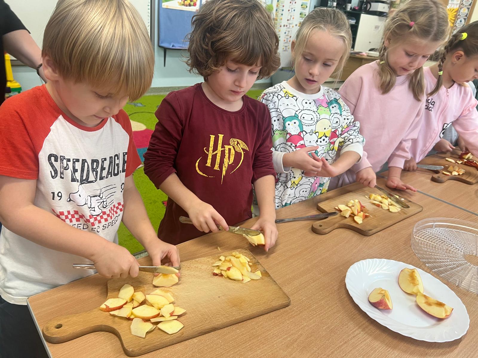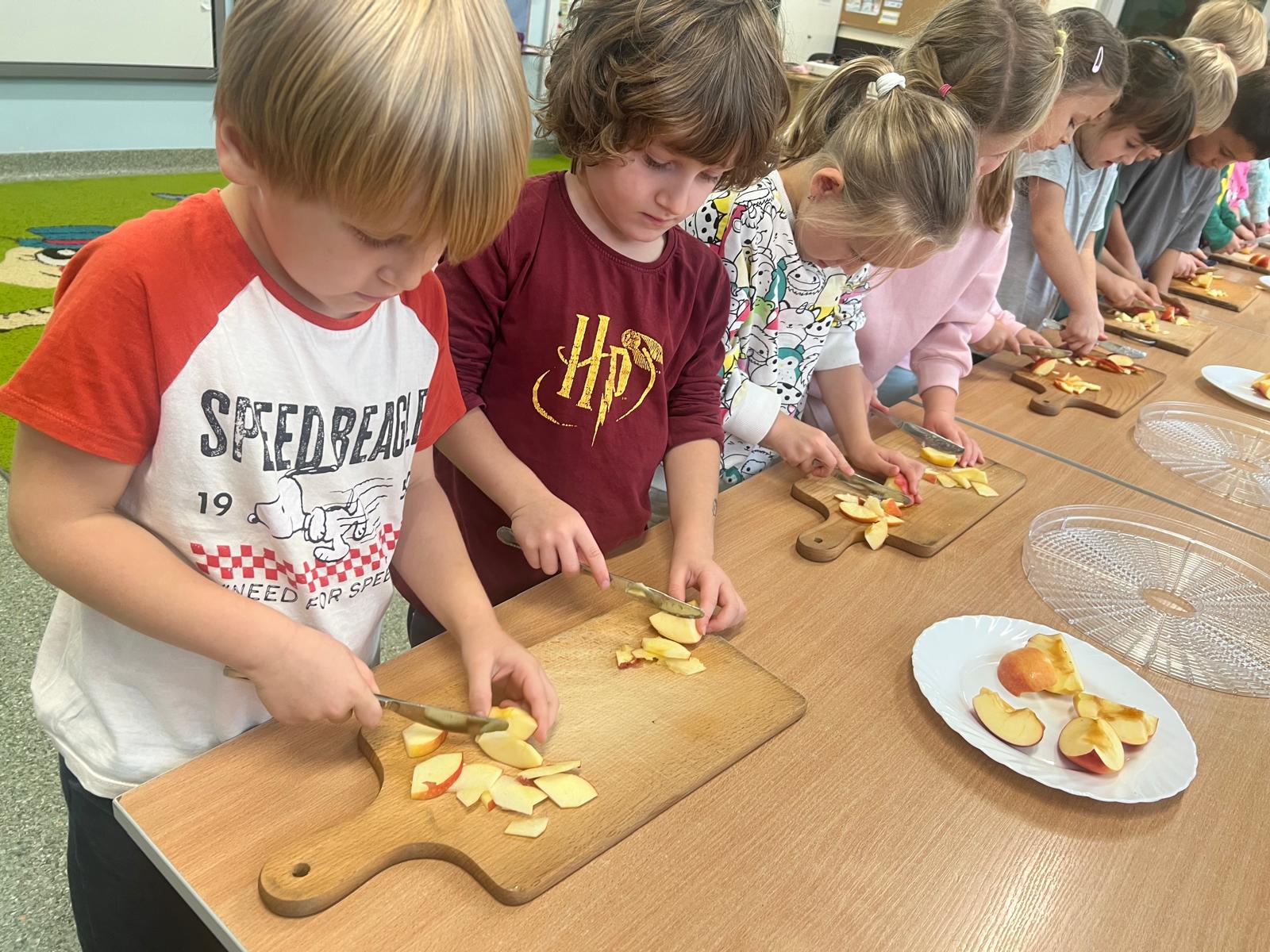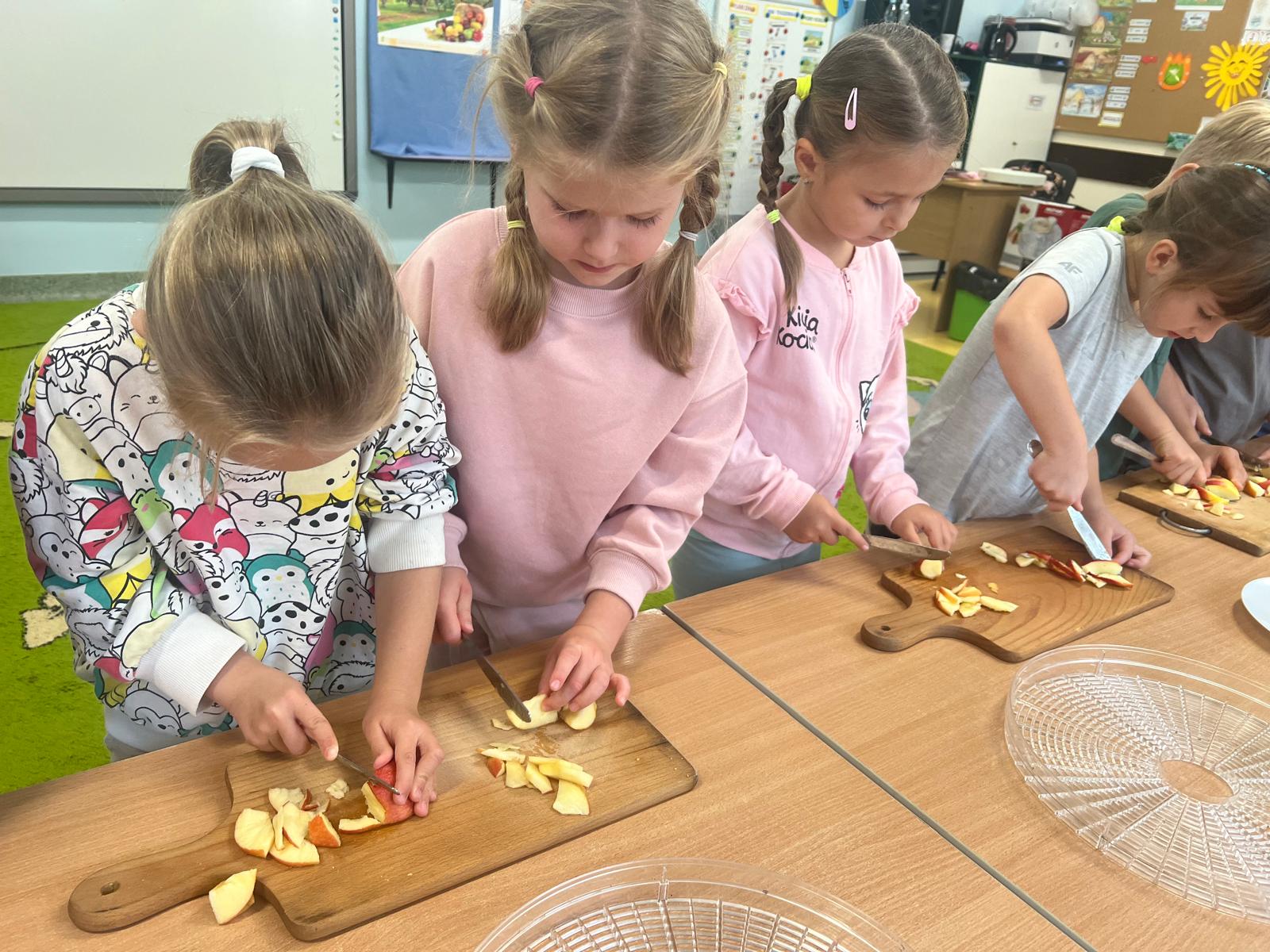 Ćwiczyły sprawność dłoni i nadgarstka, krojąc jabłka na cienkie plasterki – z pełnym skupieniem i ogromną radością.