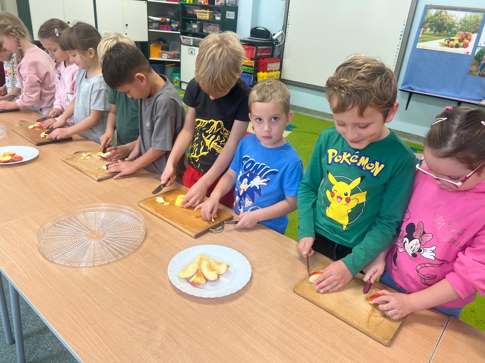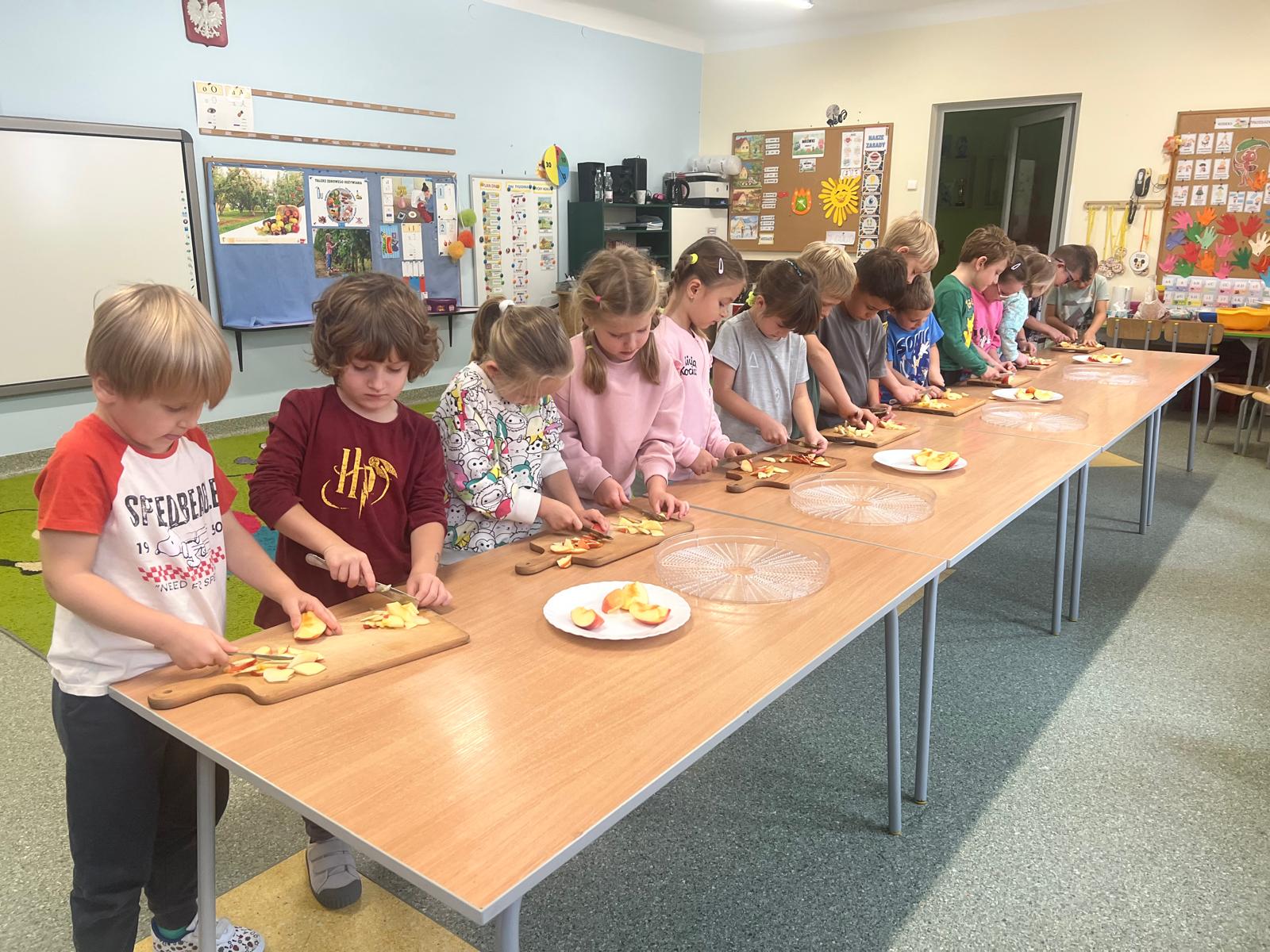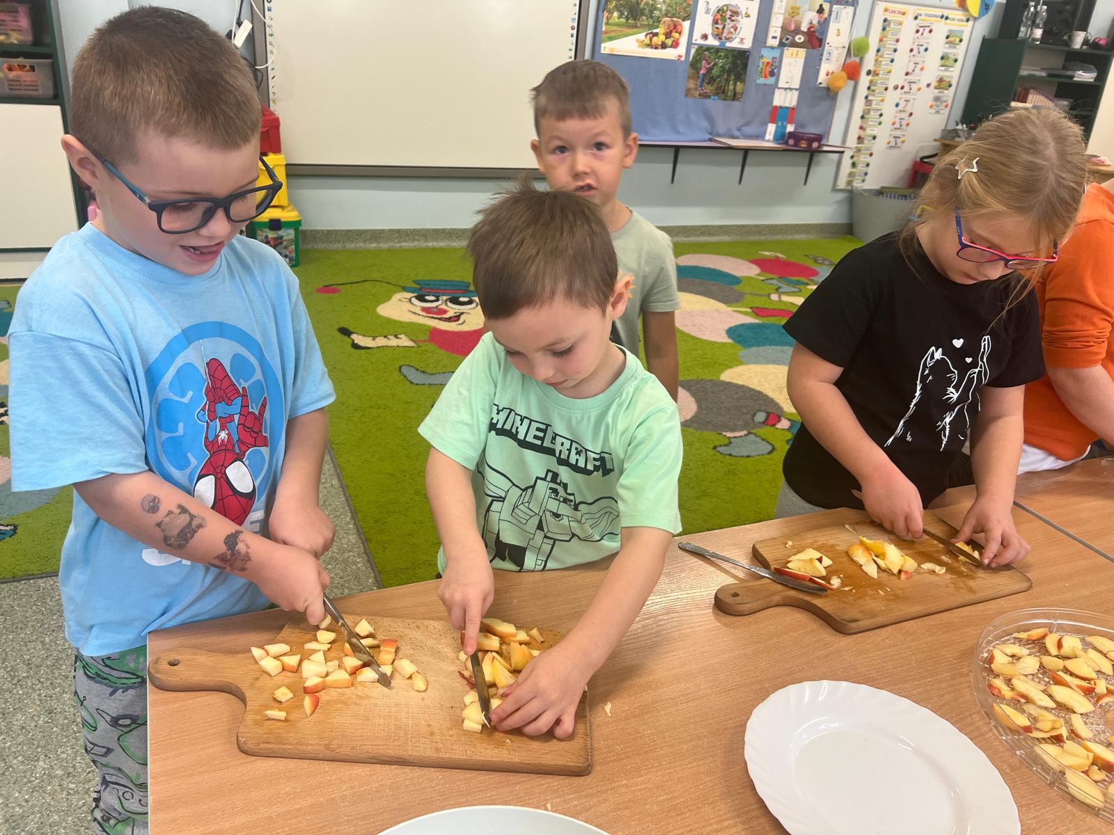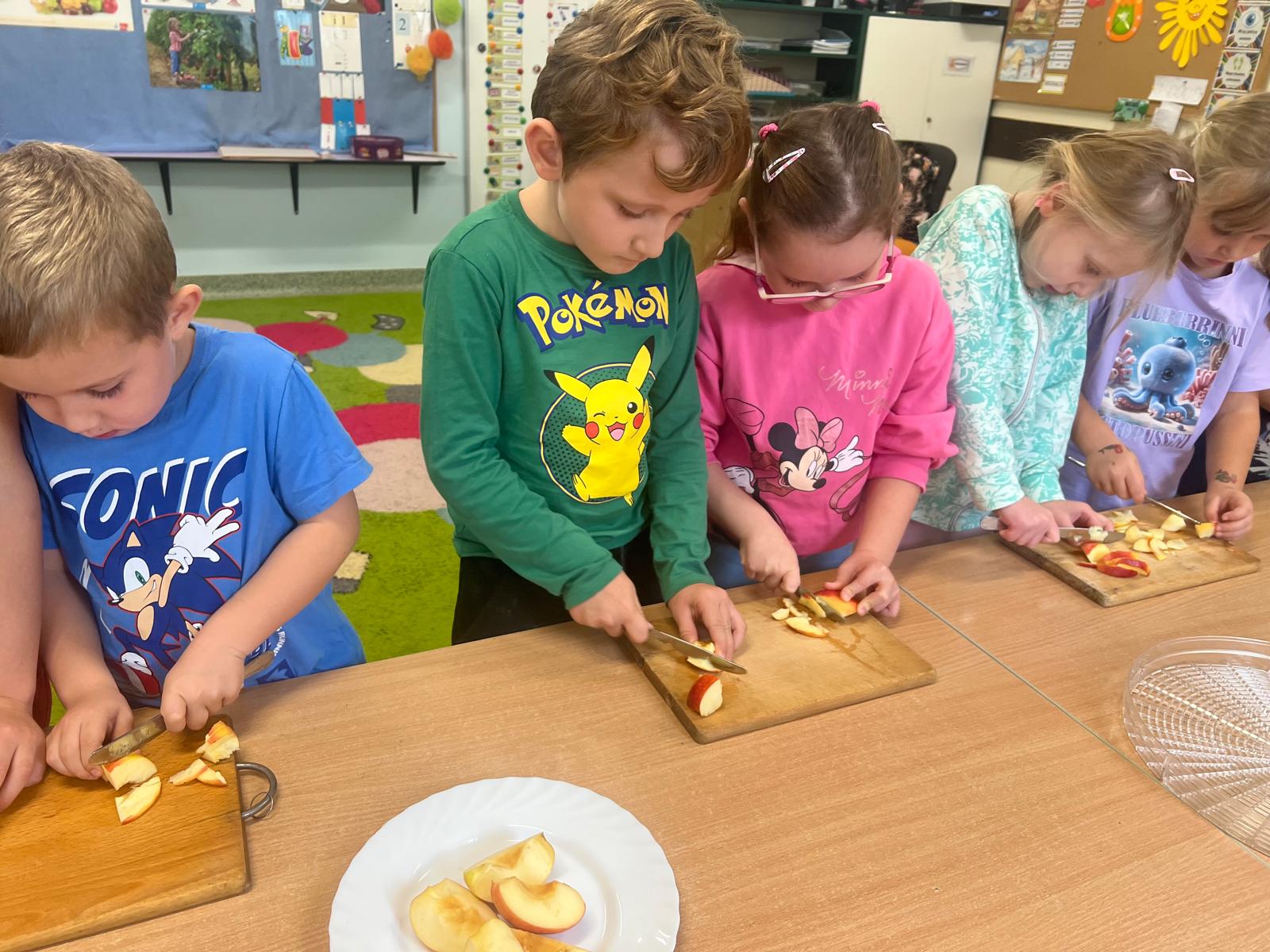 Ćwiczyły sprawność dłoni i nadgarstka, krojąc jabłka na cienkie plasterki – z pełnym skupieniem i ogromną radością.