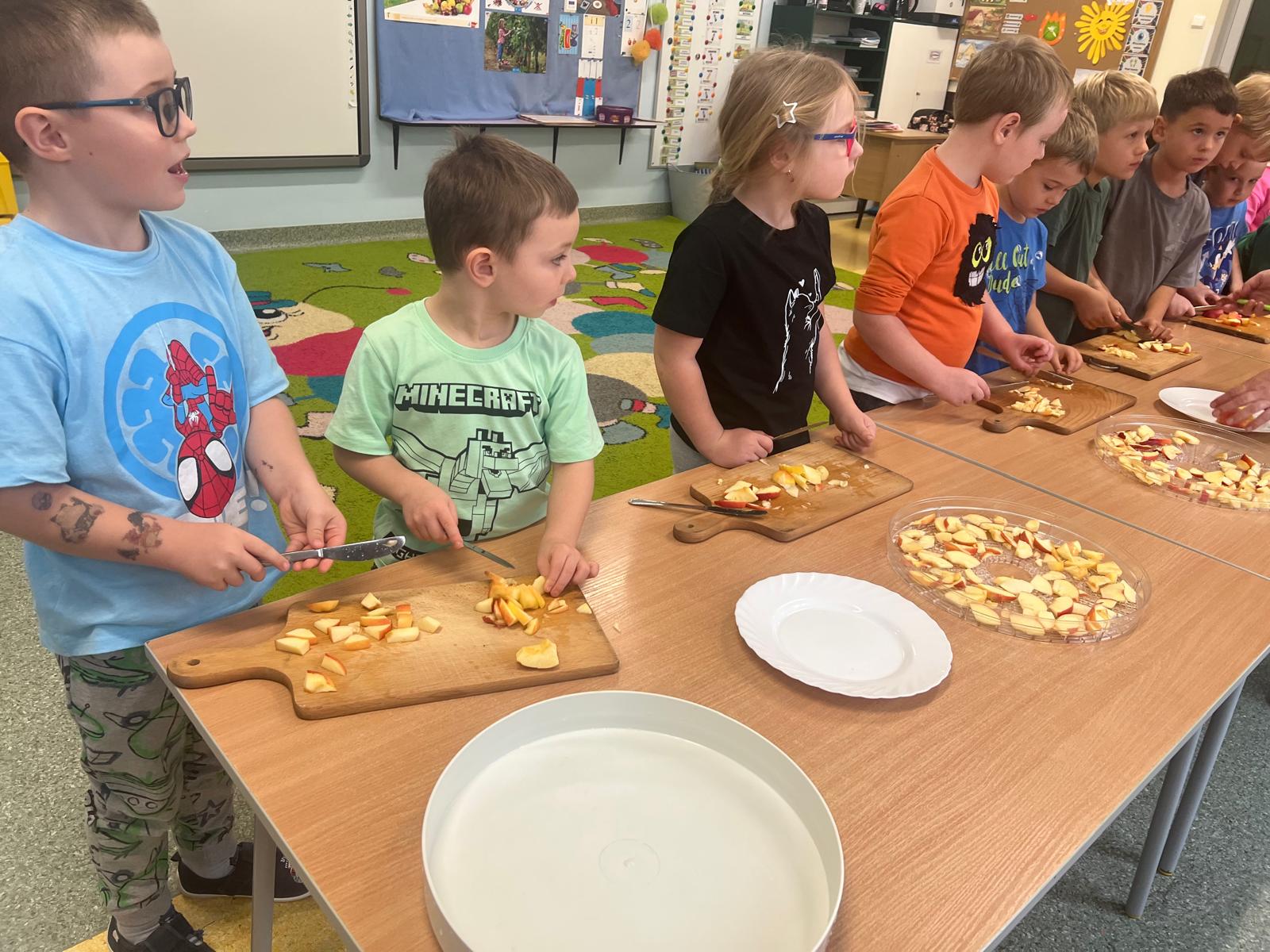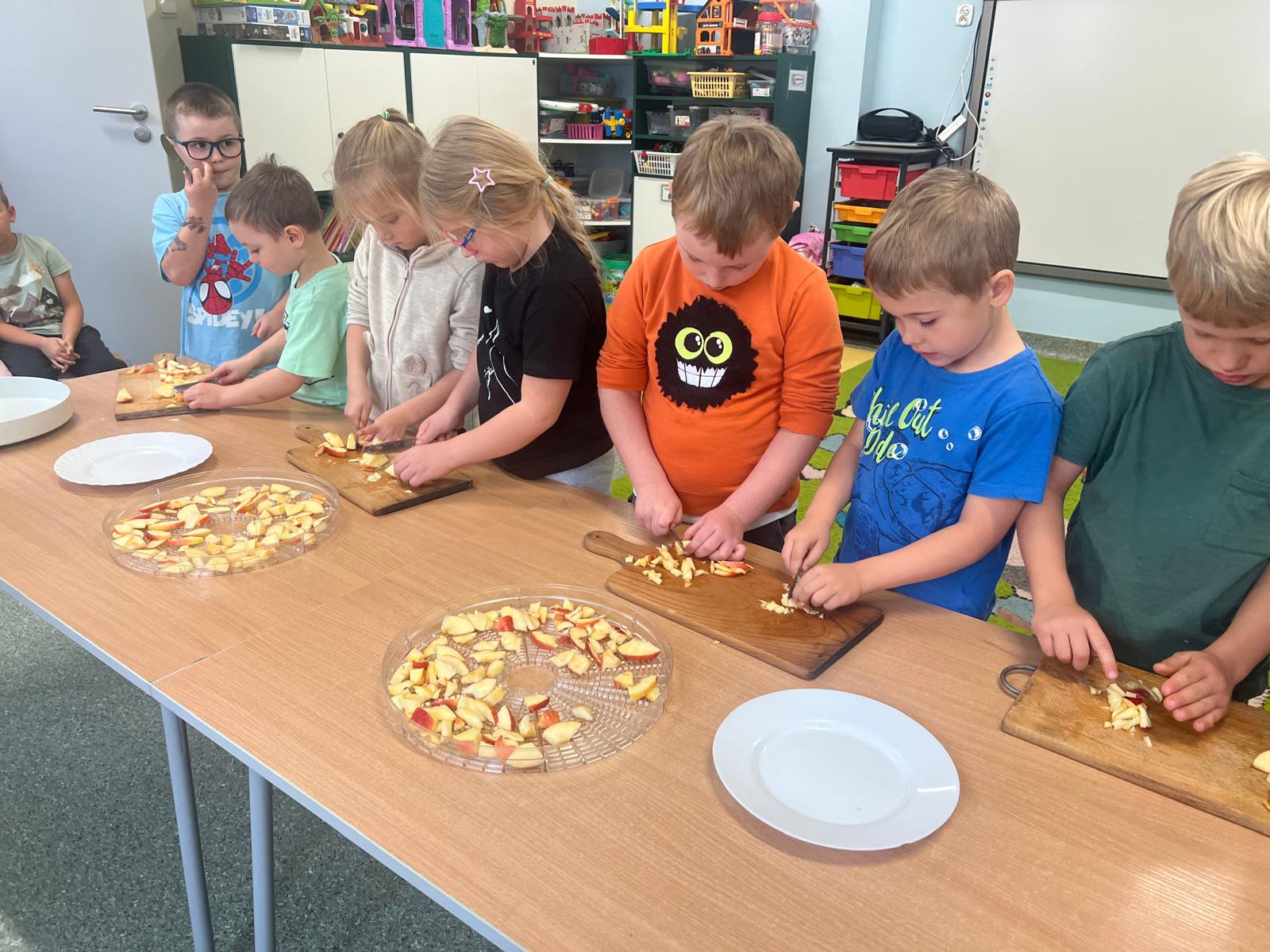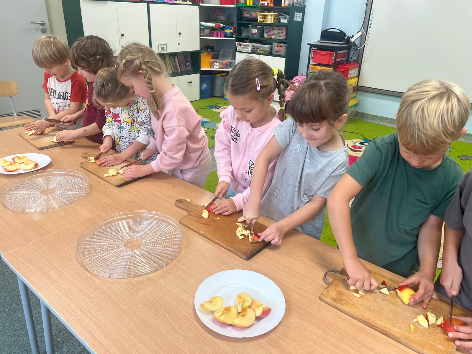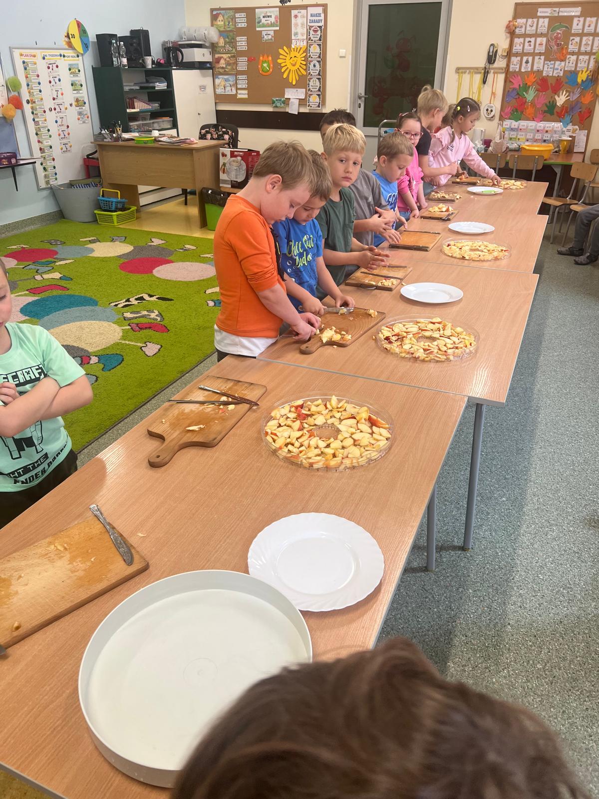 Ćwiczyły sprawność dłoni i nadgarstka, krojąc jabłka na cienkie plasterki – z pełnym skupieniem i ogromną radością.