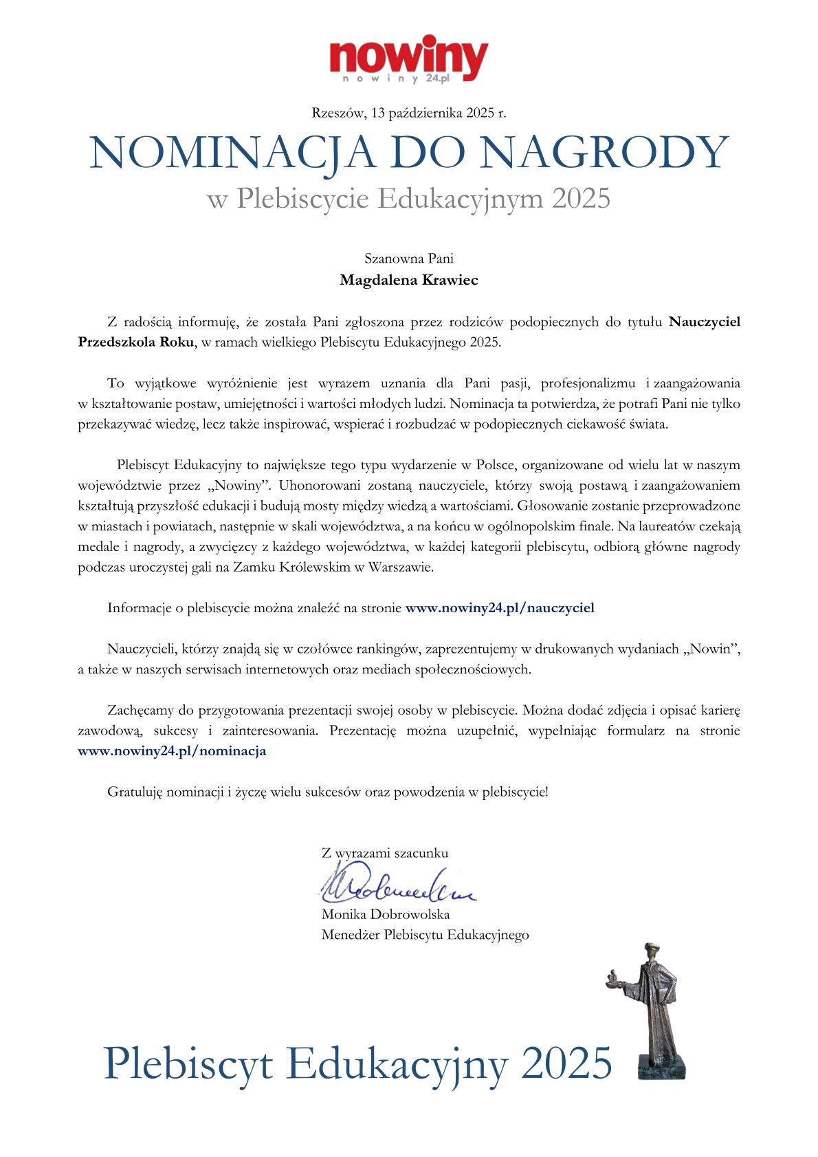 Z ogromną radością pragniemy podzielić się z Państwem wspaniałą wiadomością! Nasze Przedszkole zostało nominowane w plebiscycie edukacyjnym w kategorii "Przedszkole Roku 2025", organizowanym przez redakcję Nowin. To dla nas ogromne wyróżnienie i dowód na to, że nasza codzienna praca, zaangażowanie i pasja są doceniane!