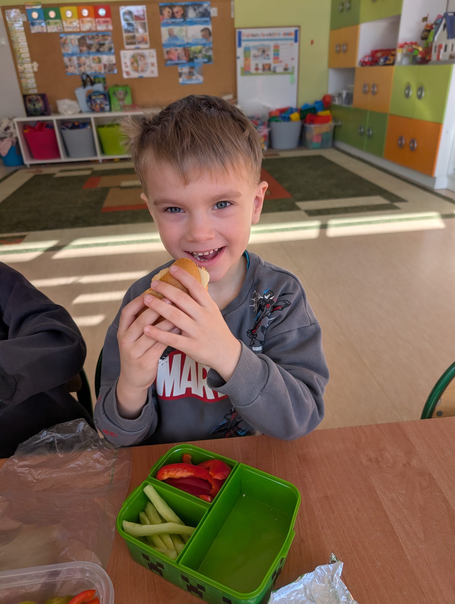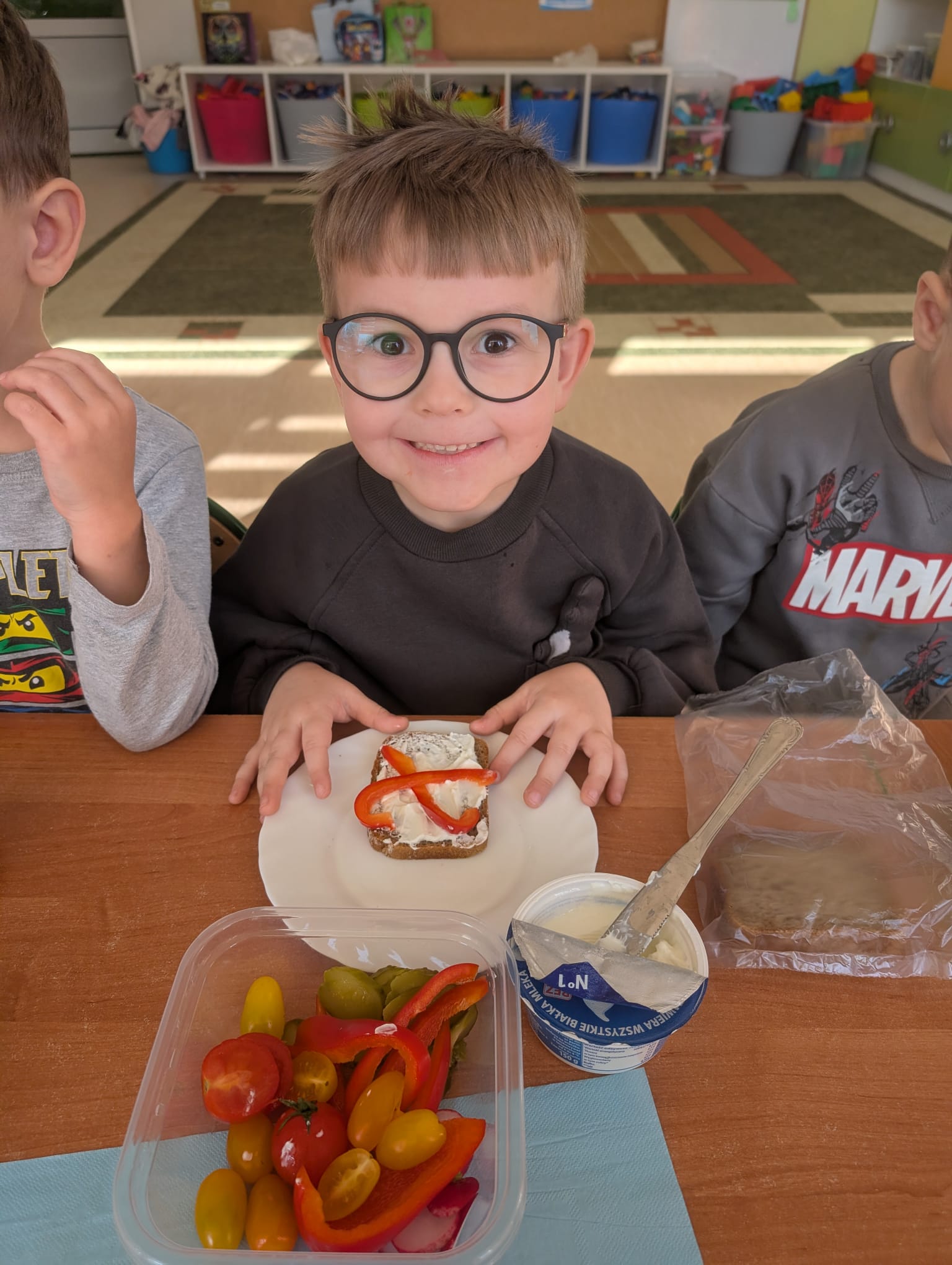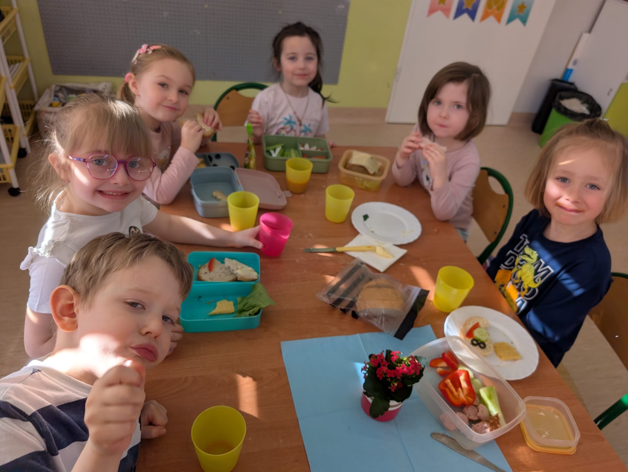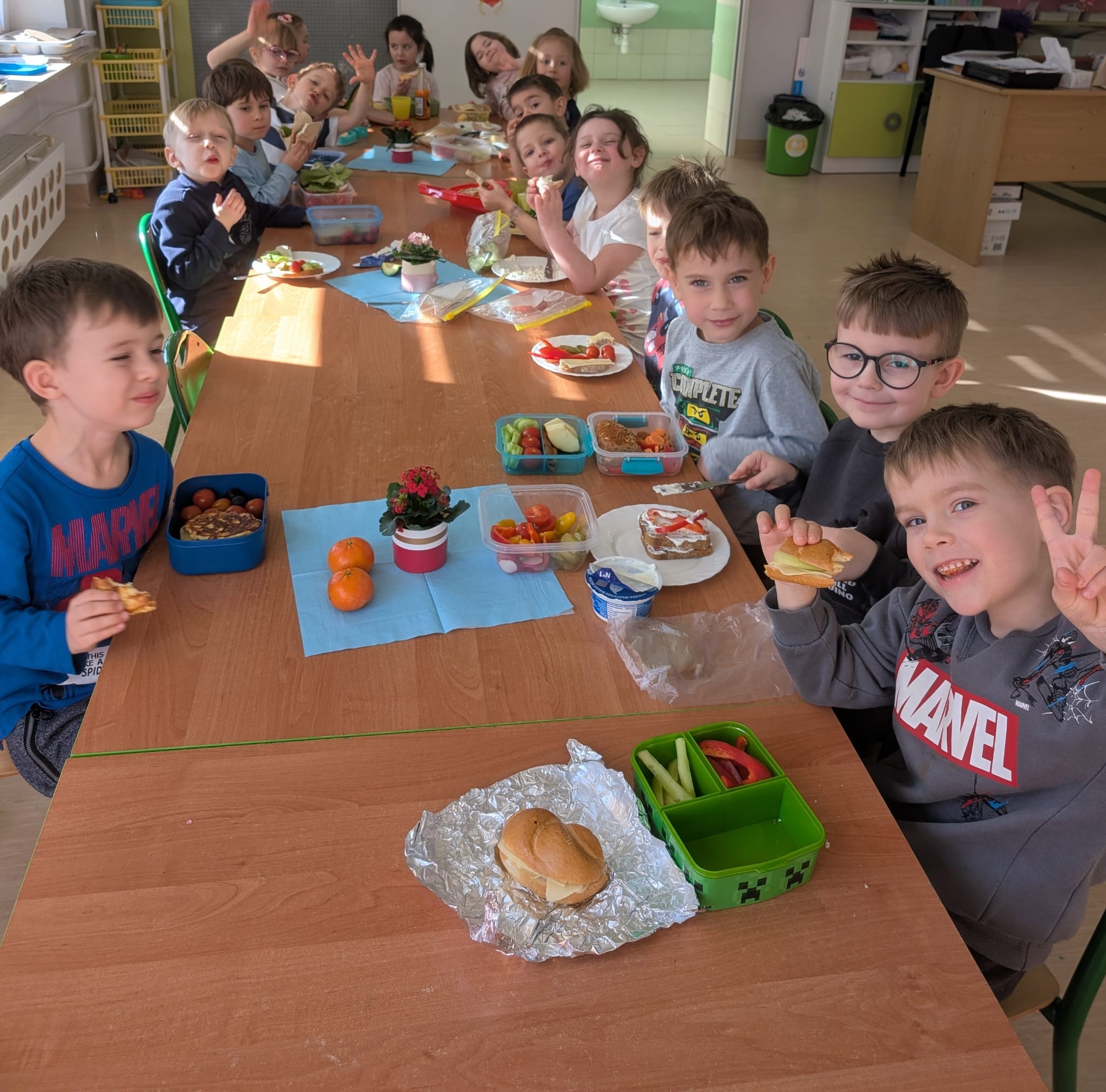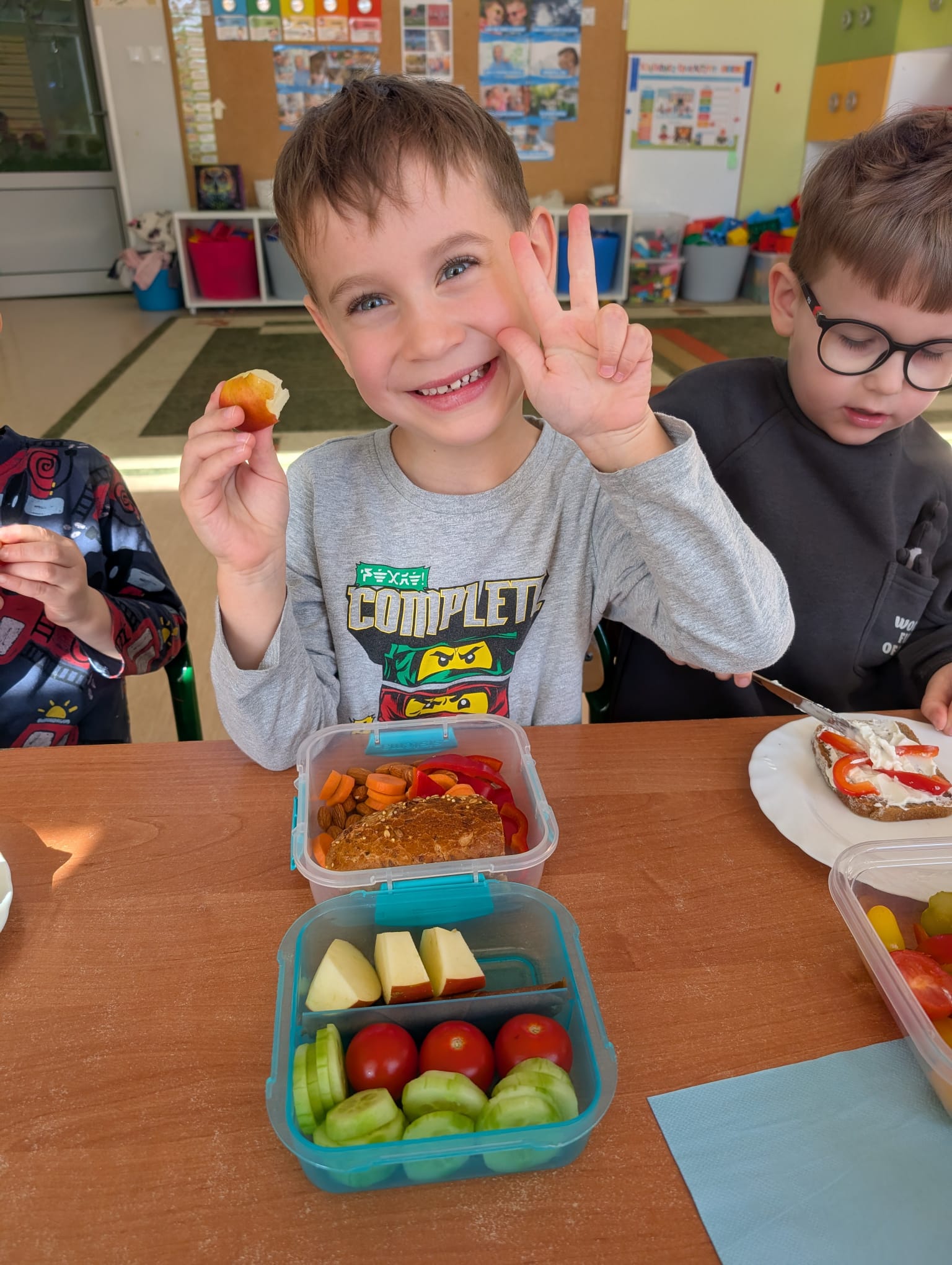 Podczas wspólnego posiłku sala wypełniła się zapachami świeżych warzyw i owoców. „Żabki” z dumą prezentowały swoje posiłki kolegom, opowiadając o ich składnikach. Najpiękniejszym widokiem była jednak umiejętność dzielenia się – wymiana plasterkiem papryki czy kawałkiem ogórka pokazała, jak silne są więzi w naszej grupie.