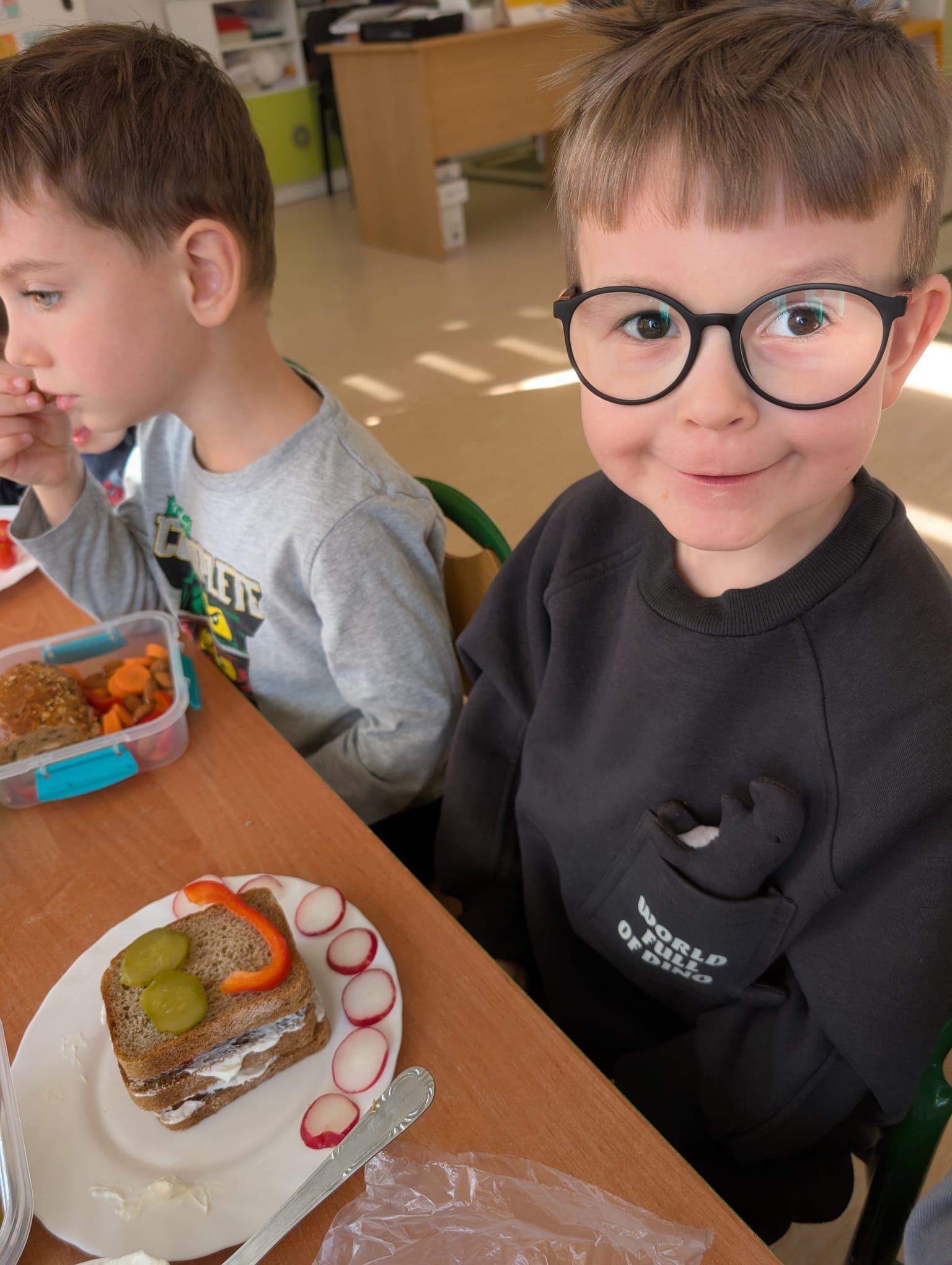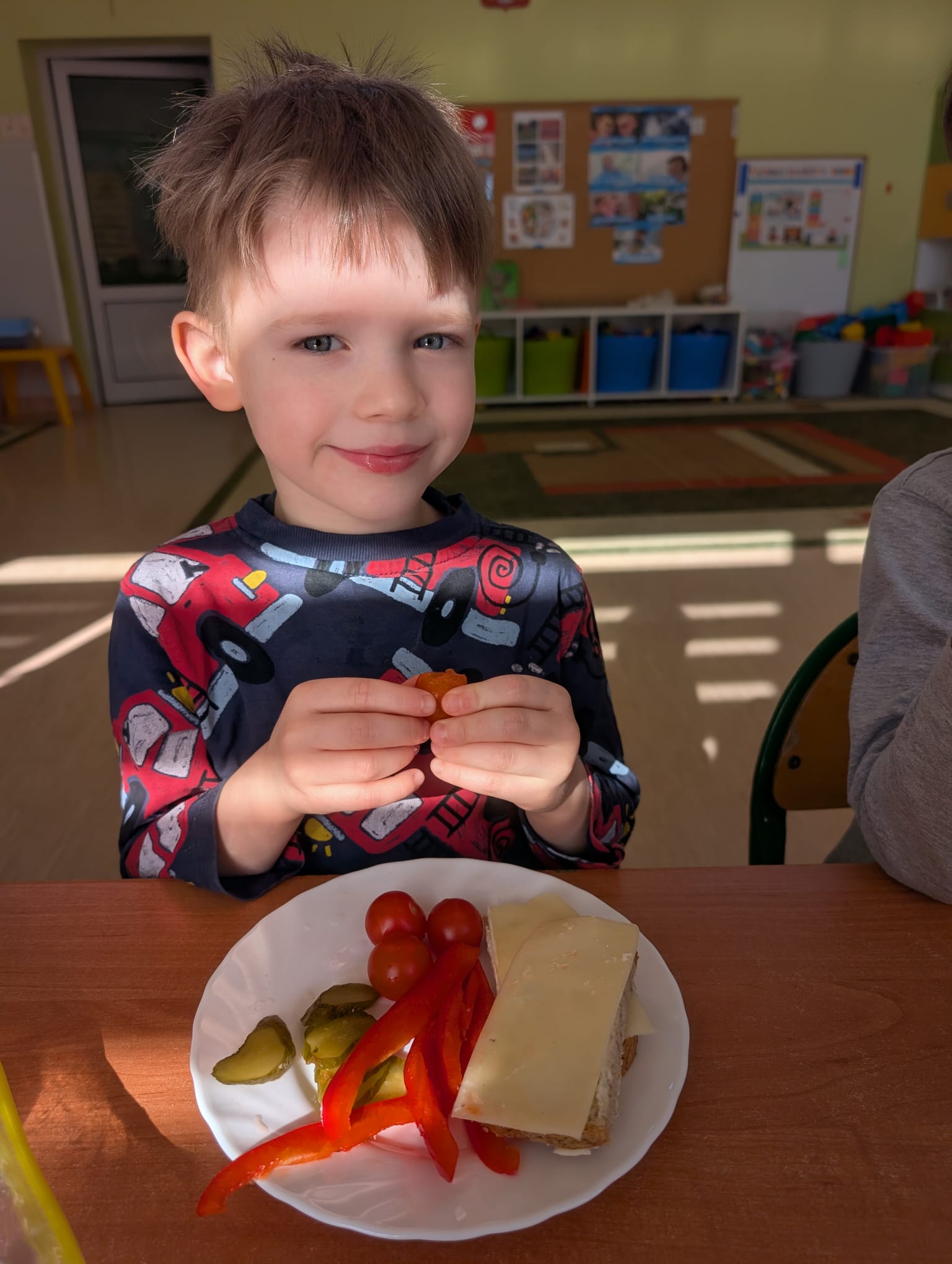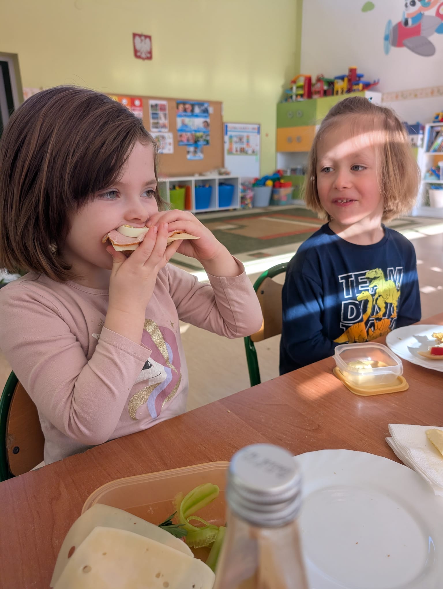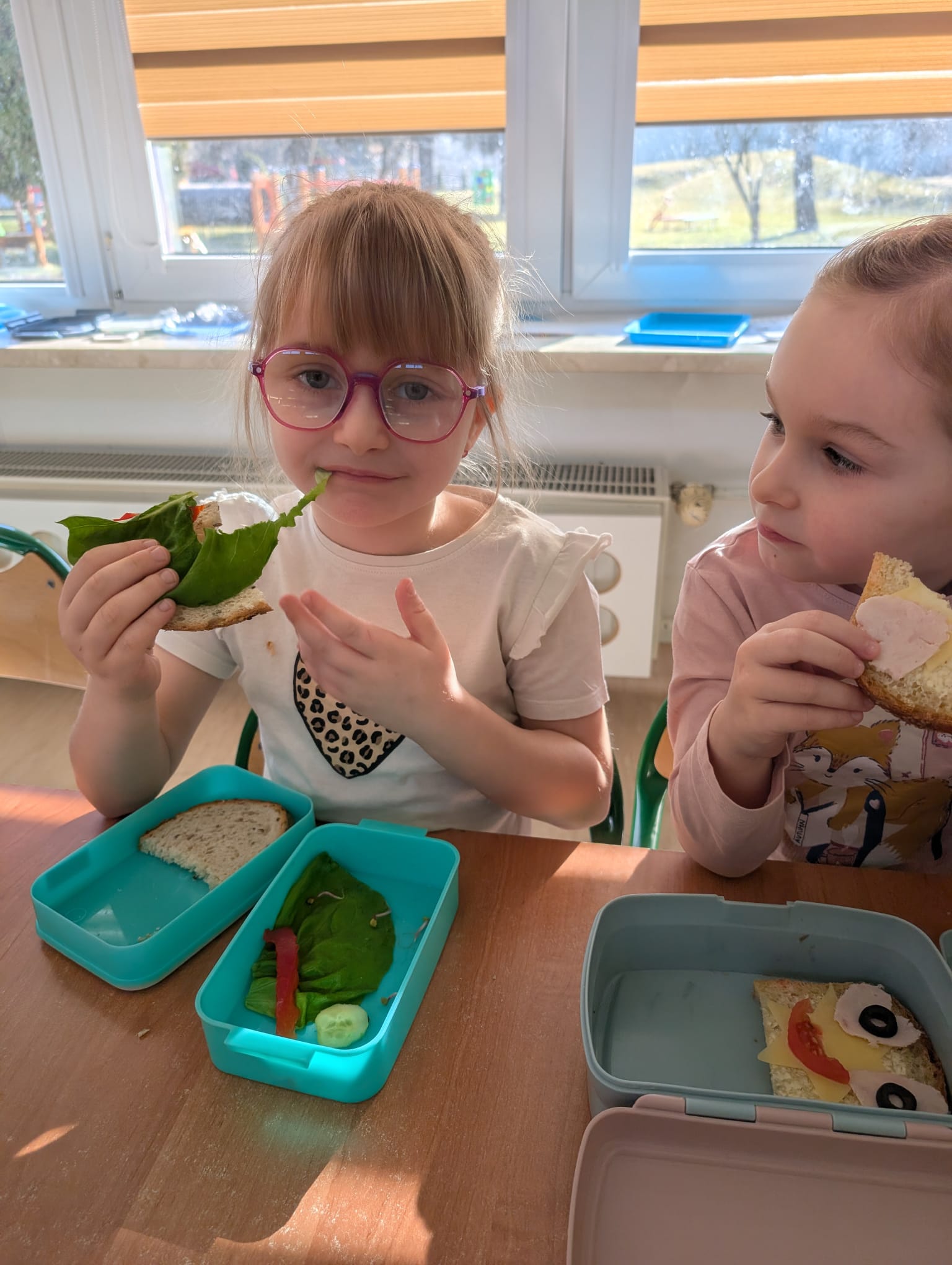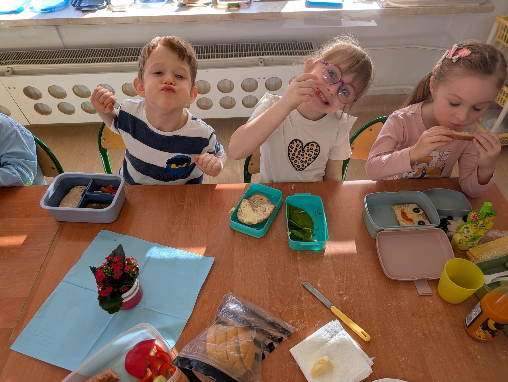 Podczas wspólnego posiłku sala wypełniła się zapachami świeżych warzyw i owoców. „Żabki” z dumą prezentowały swoje posiłki kolegom, opowiadając o ich składnikach. Najpiękniejszym widokiem była jednak umiejętność dzielenia się – wymiana plasterkiem papryki czy kawałkiem ogórka pokazała, jak silne są więzi w naszej grupie.
