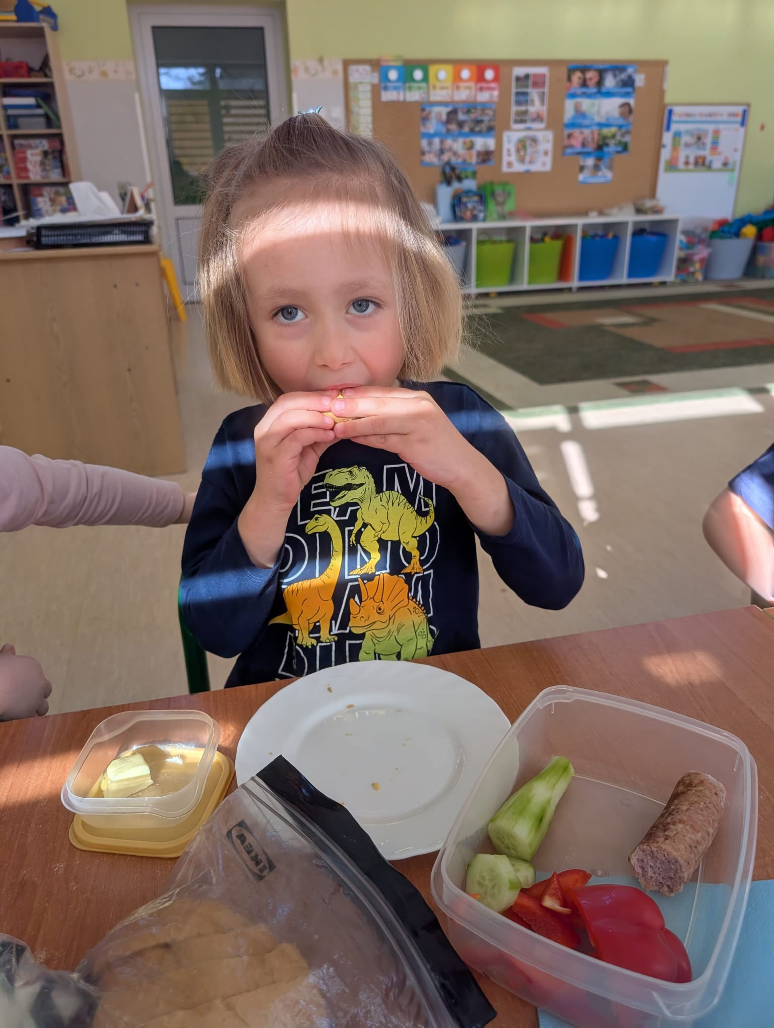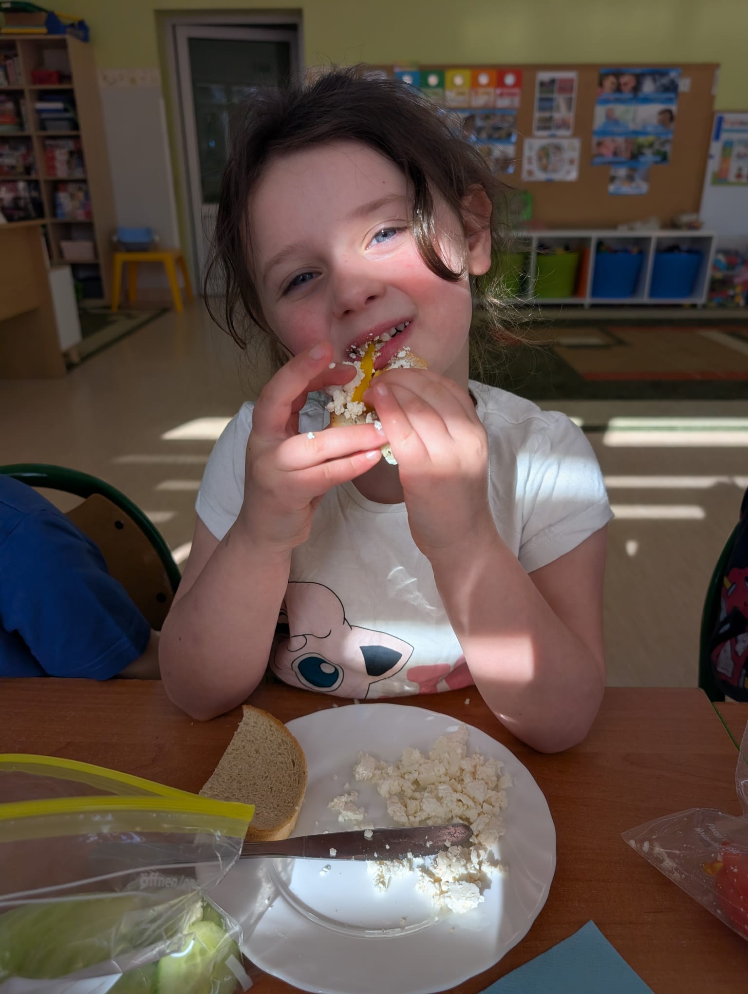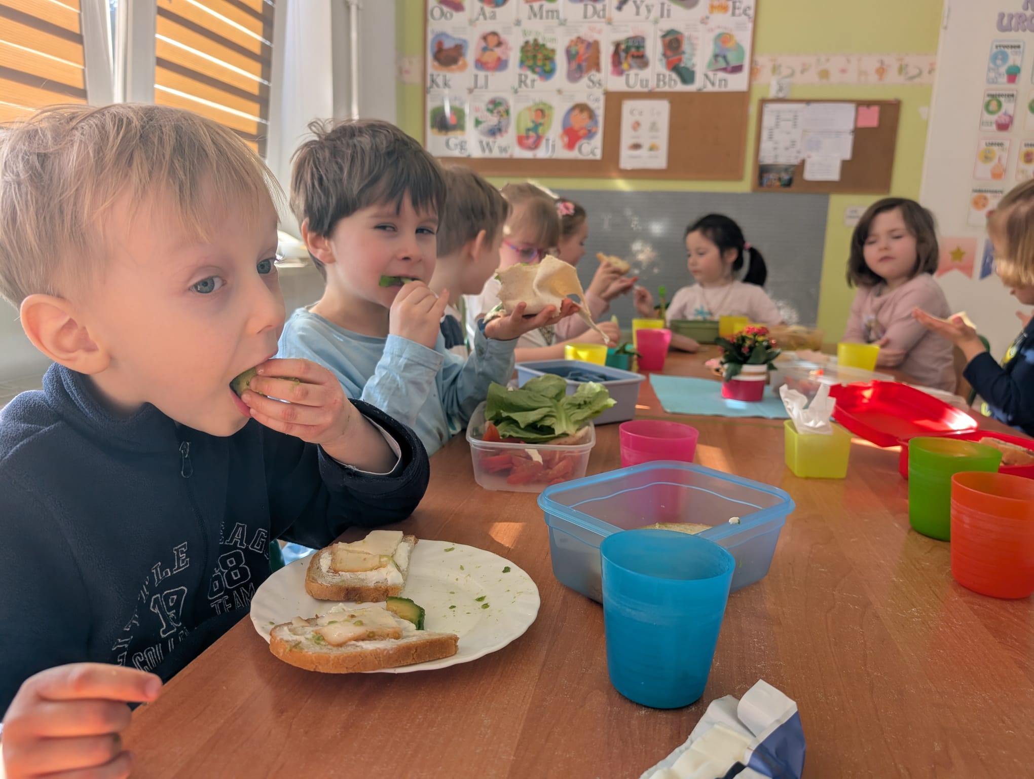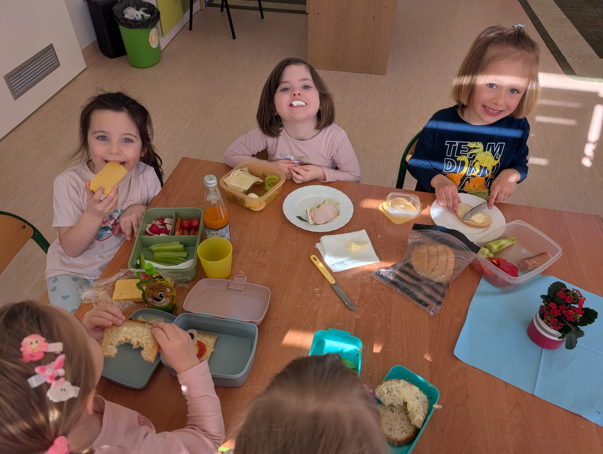 Podczas wspólnego posiłku sala wypełniła się zapachami świeżych warzyw i owoców. „Żabki” z dumą prezentowały swoje posiłki kolegom, opowiadając o ich składnikach. Najpiękniejszym widokiem była jednak umiejętność dzielenia się – wymiana plasterkiem papryki czy kawałkiem ogórka pokazała, jak silne są więzi w naszej grupie.