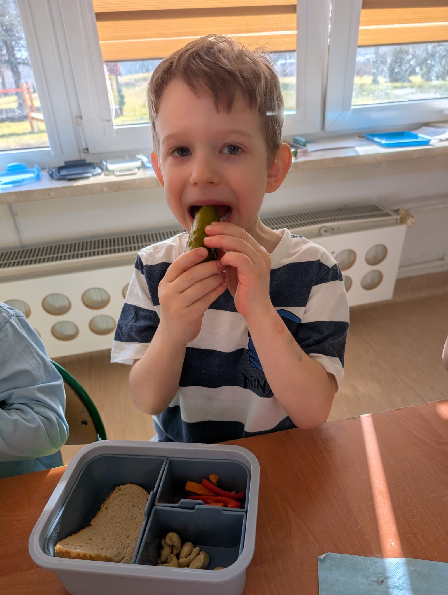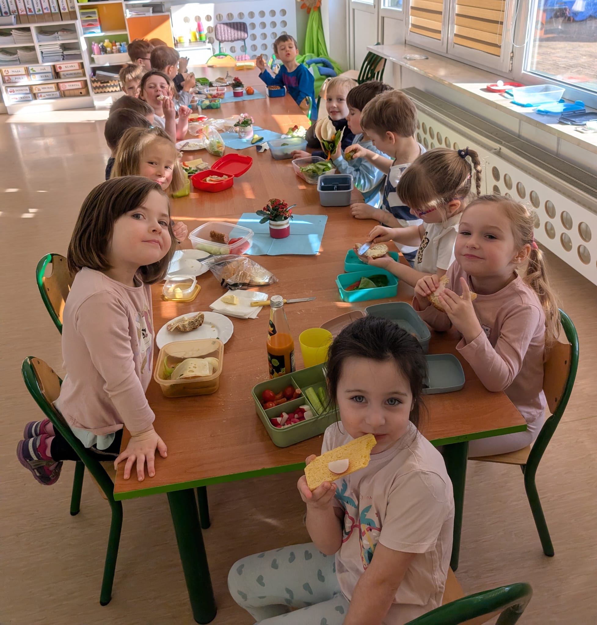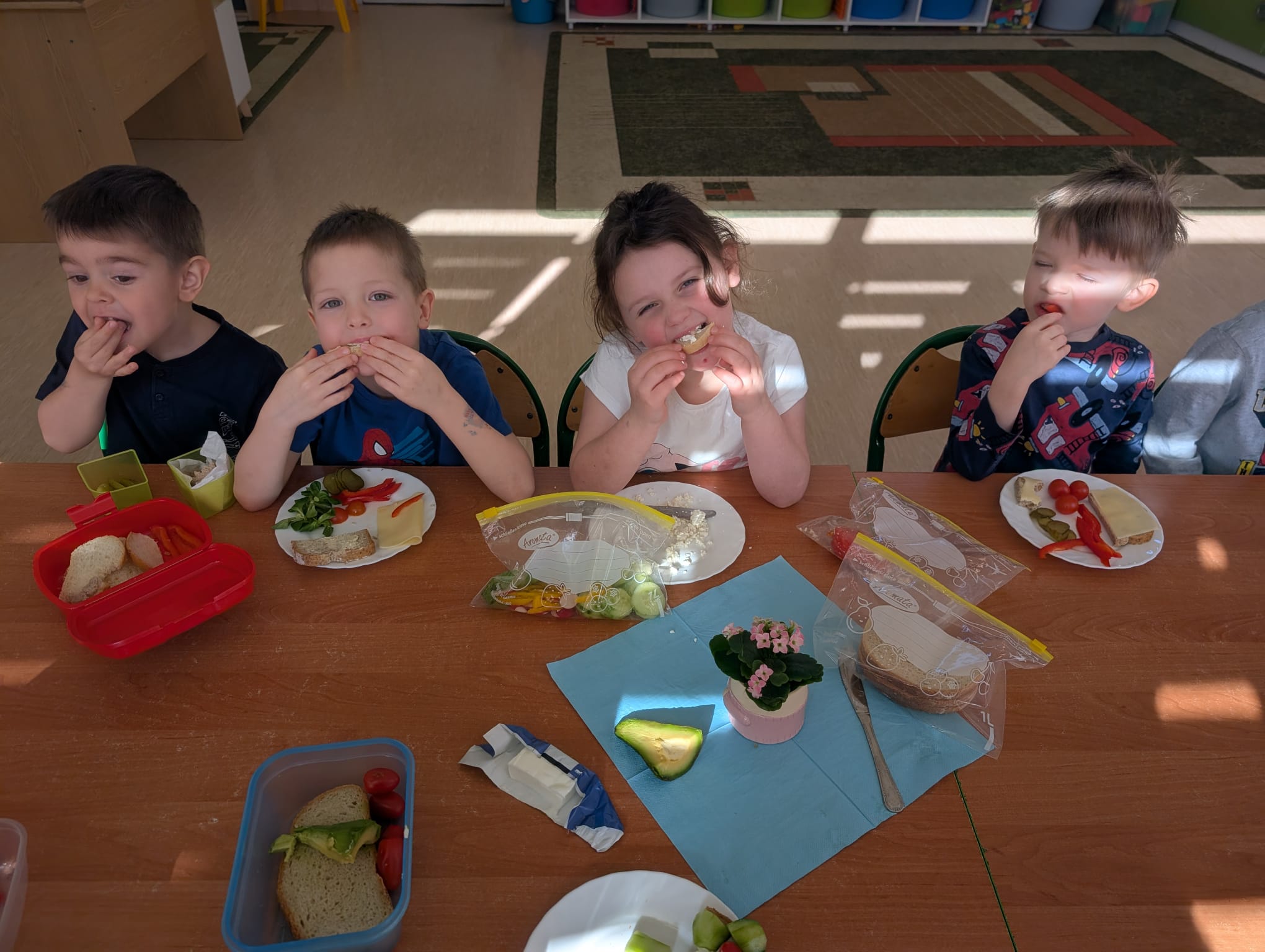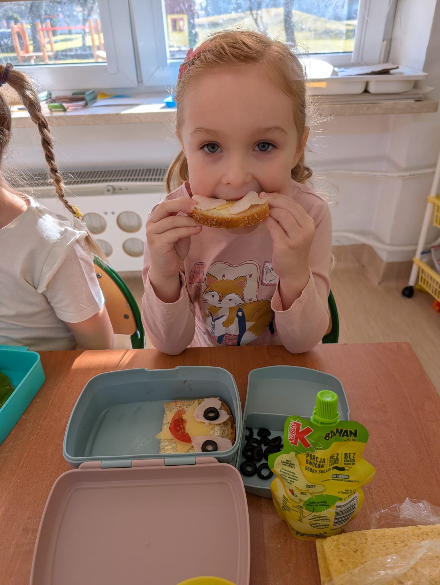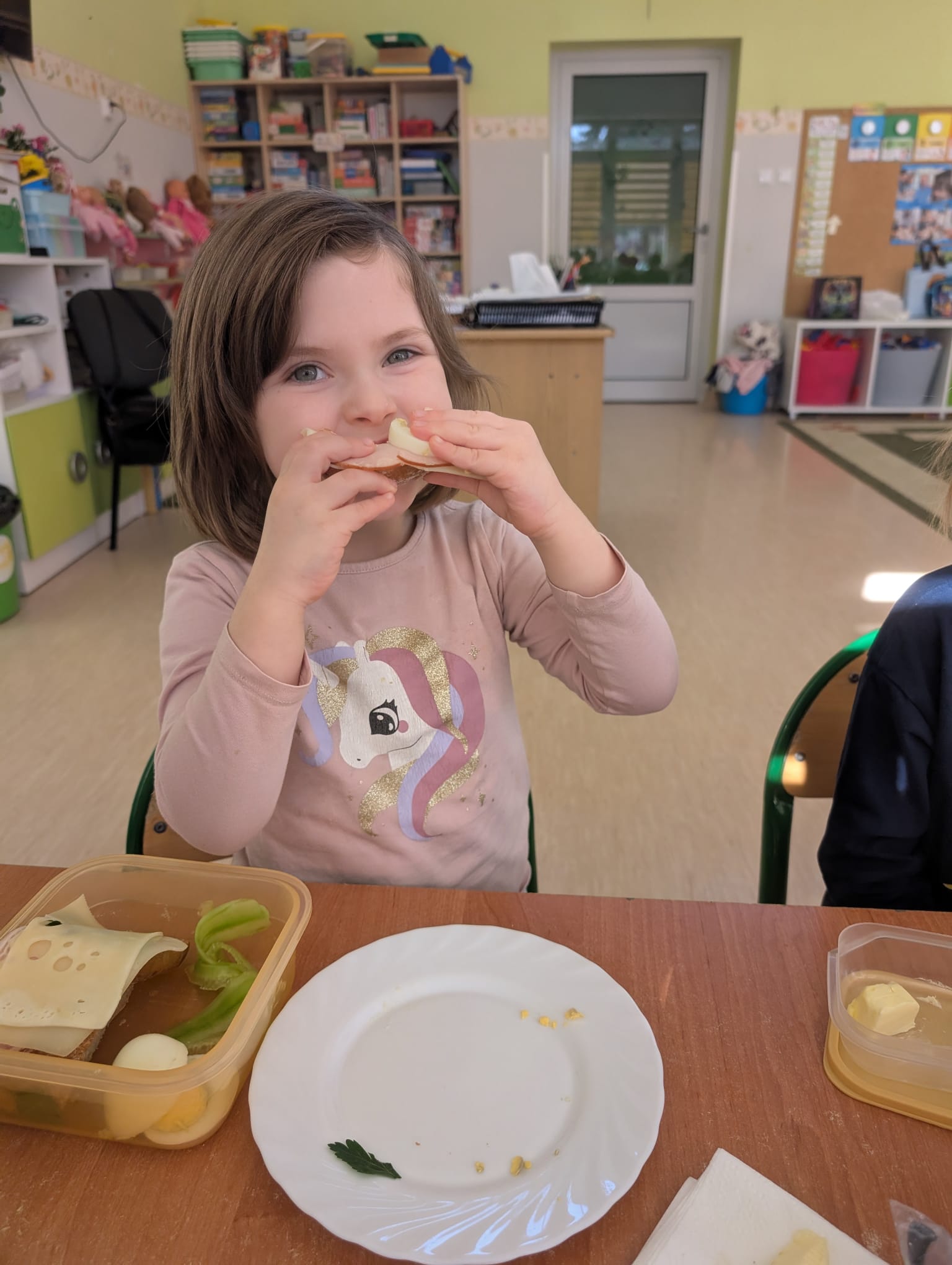 Podczas wspólnego posiłku sala wypełniła się zapachami świeżych warzyw i owoców. „Żabki” z dumą prezentowały swoje posiłki kolegom, opowiadając o ich składnikach. Najpiękniejszym widokiem była jednak umiejętność dzielenia się – wymiana plasterkiem papryki czy kawałkiem ogórka pokazała, jak silne są więzi w naszej grupie.