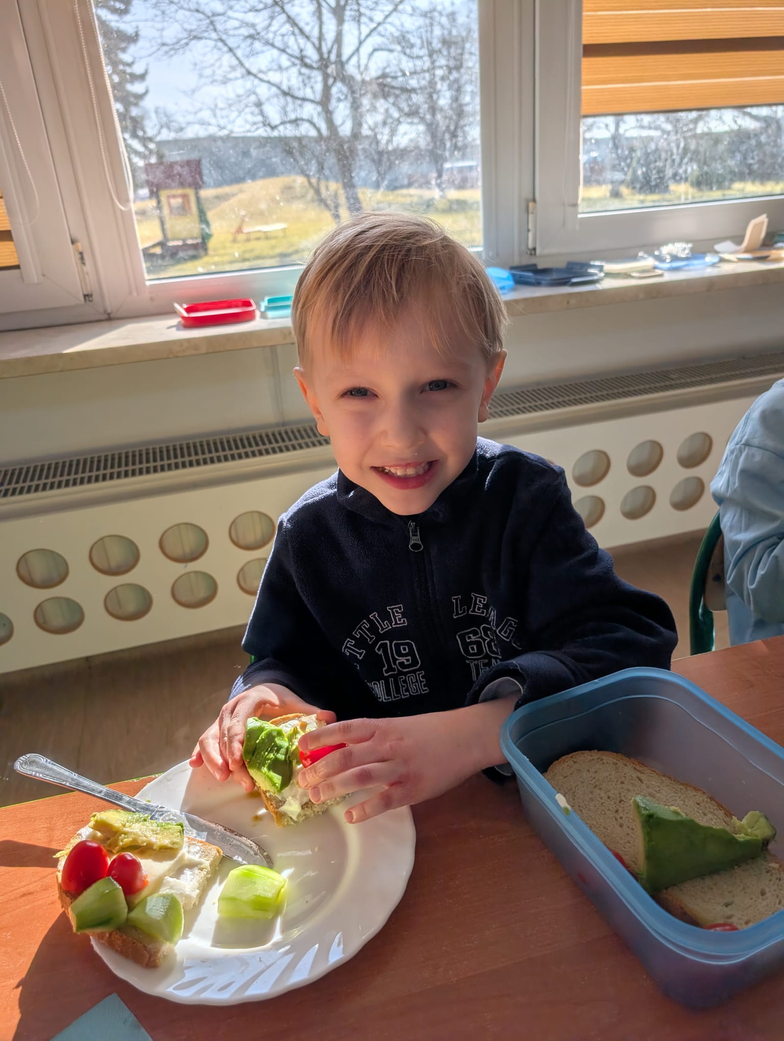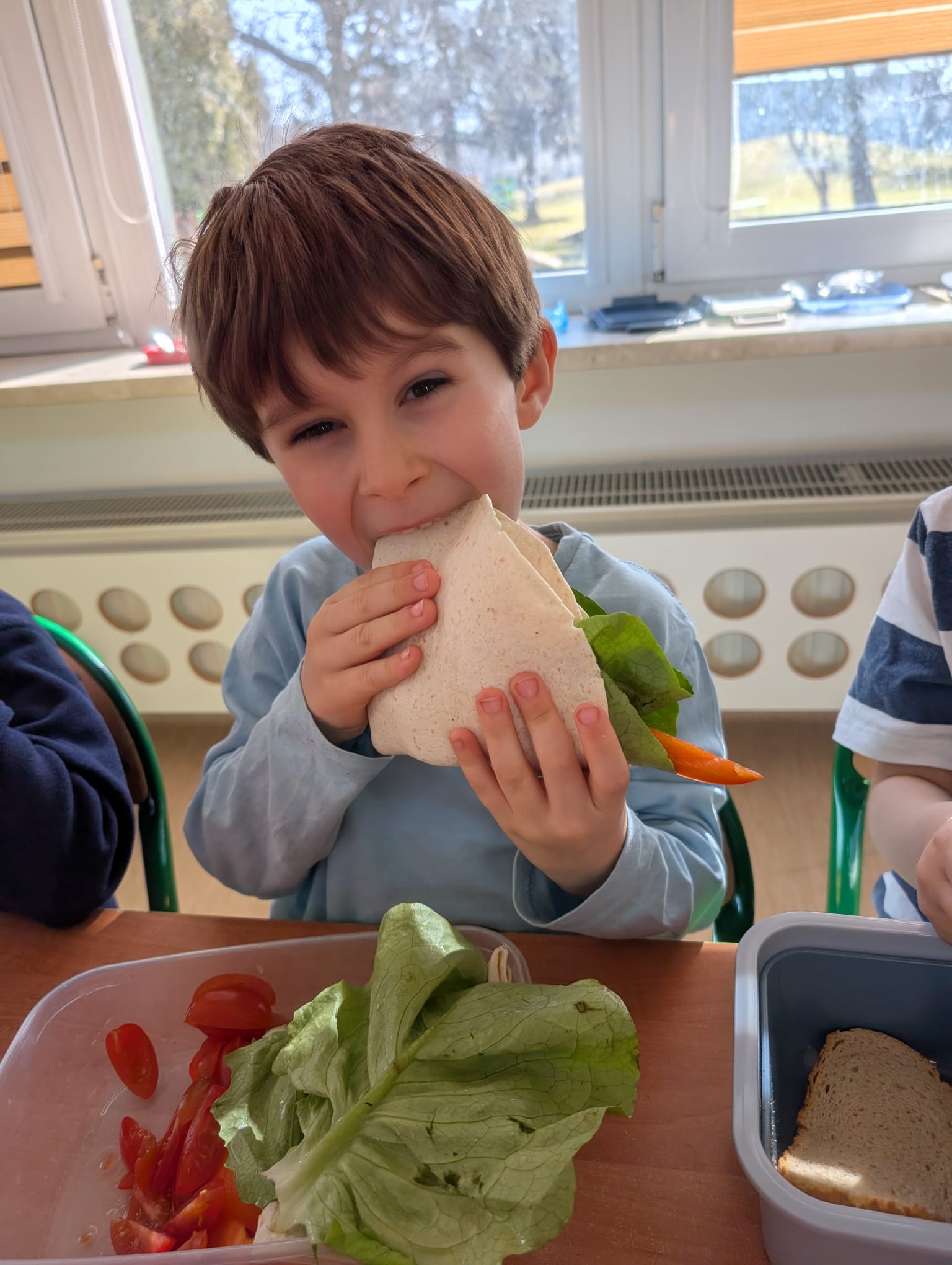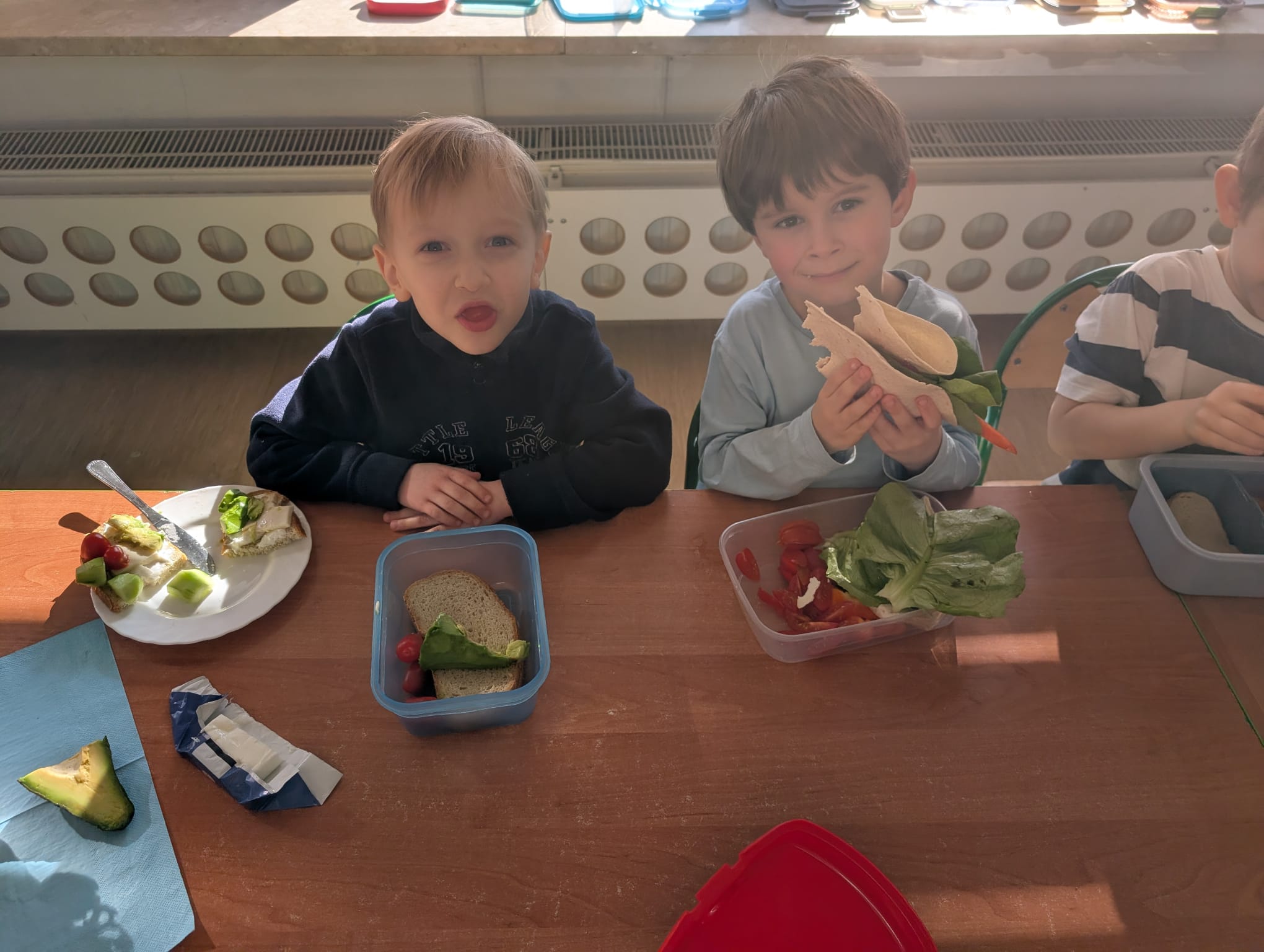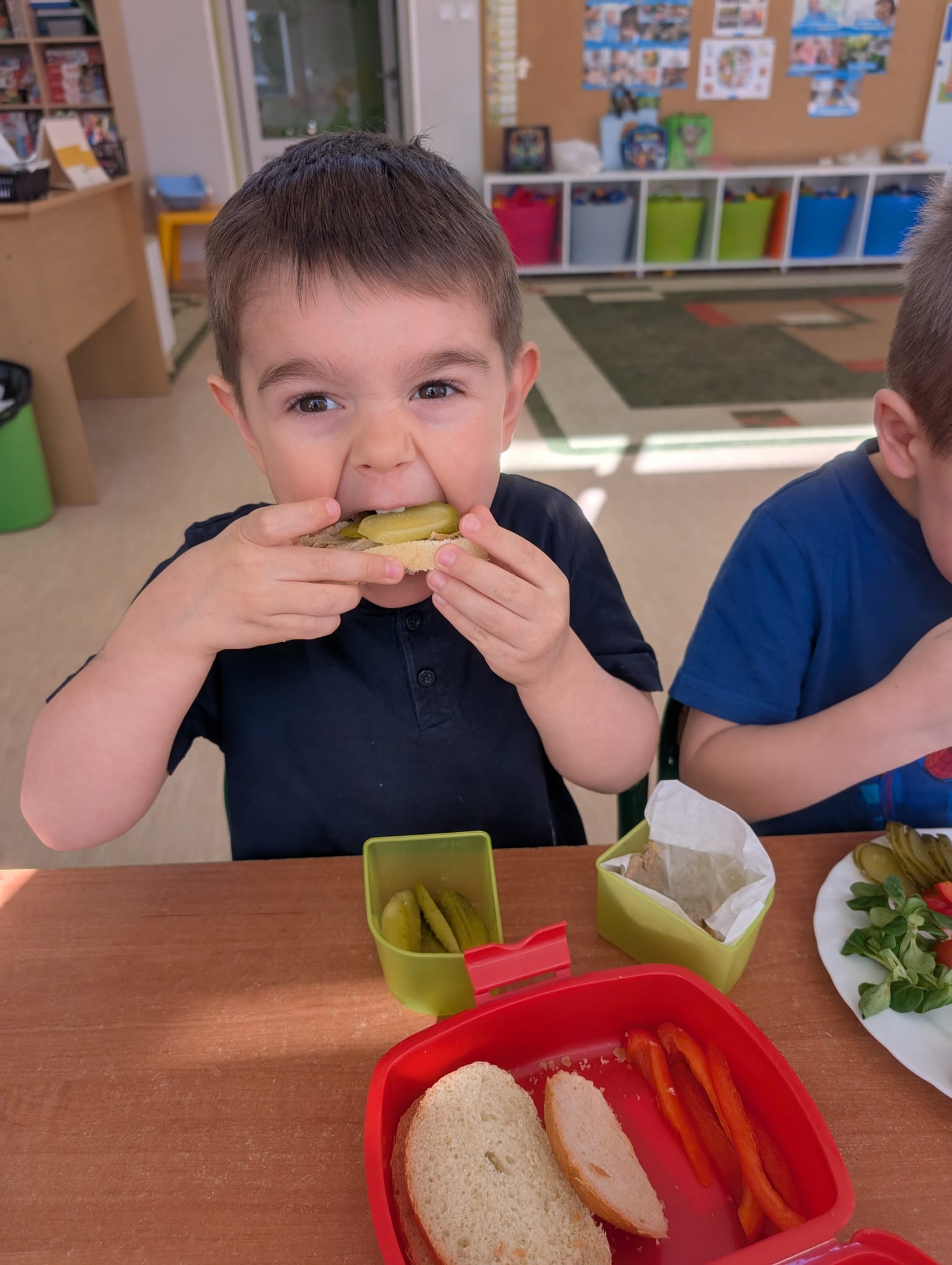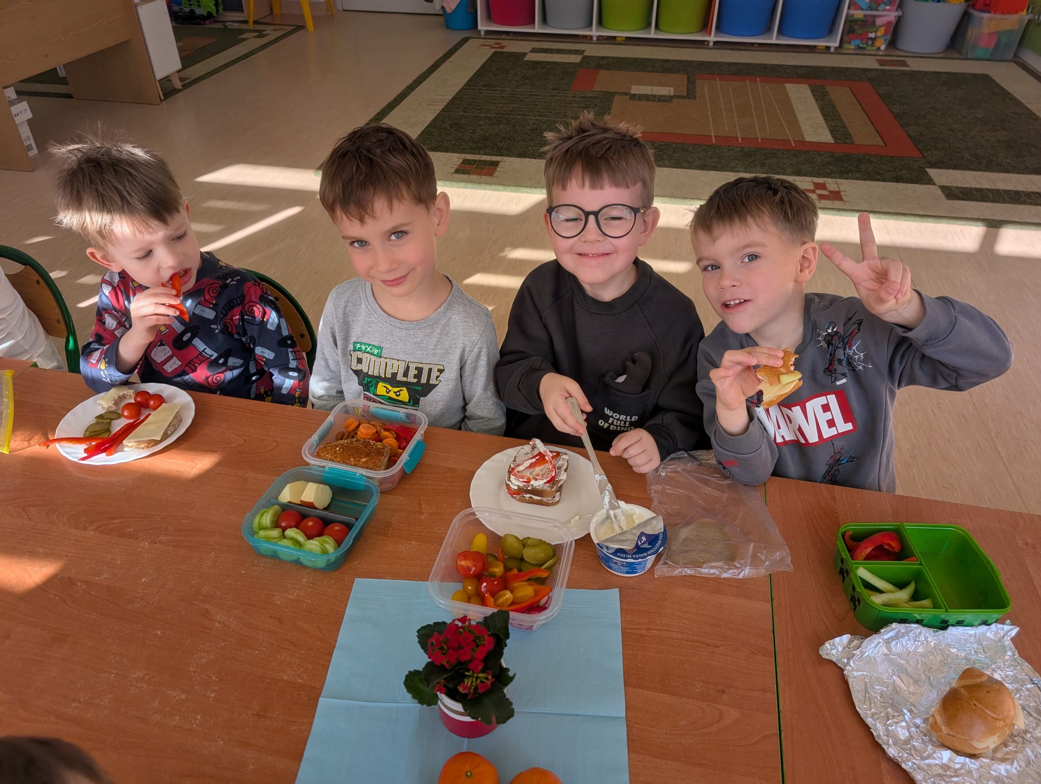 Podczas wspólnego posiłku sala wypełniła się zapachami świeżych warzyw i owoców. „Żabki” z dumą prezentowały swoje posiłki kolegom, opowiadając o ich składnikach. Najpiękniejszym widokiem była jednak umiejętność dzielenia się – wymiana plasterkiem papryki czy kawałkiem ogórka pokazała, jak silne są więzi w naszej grupie.