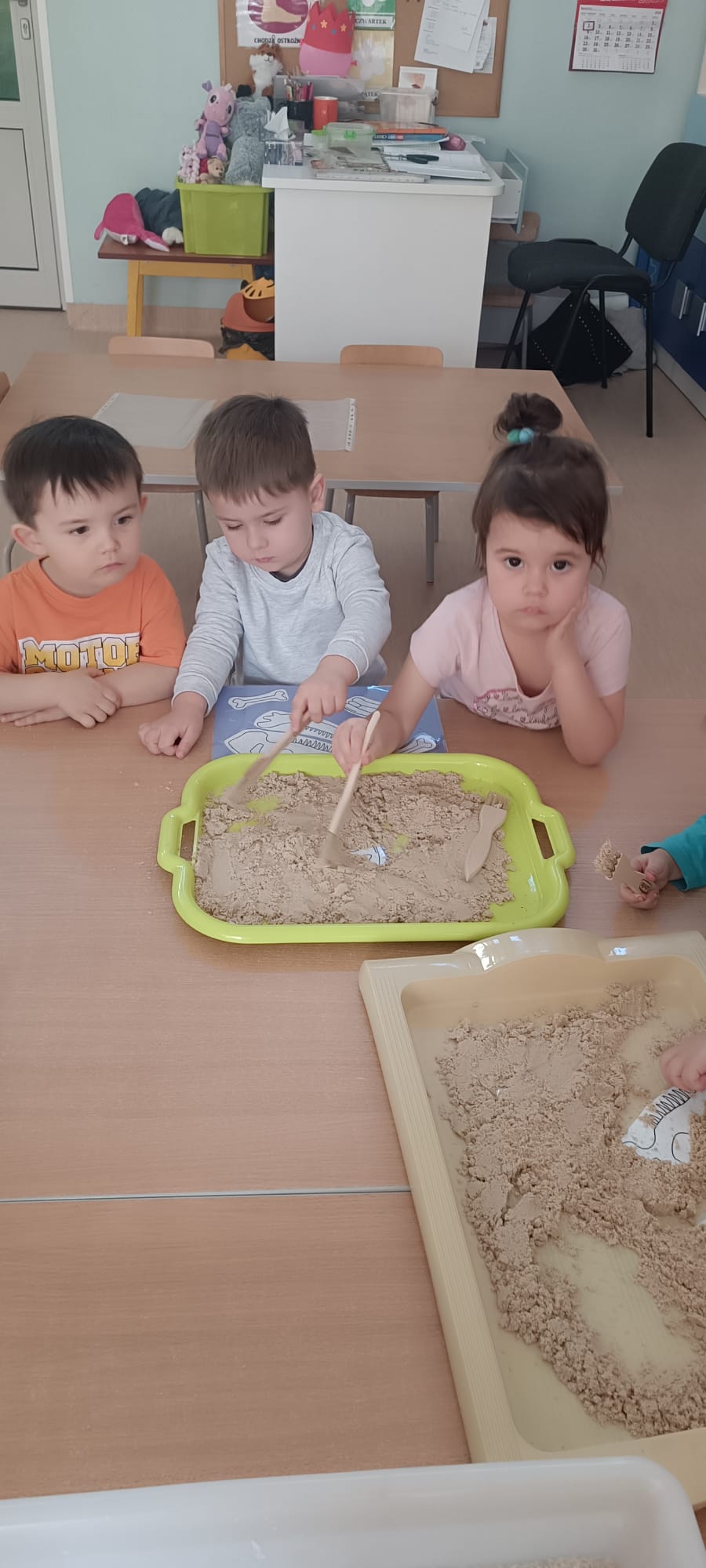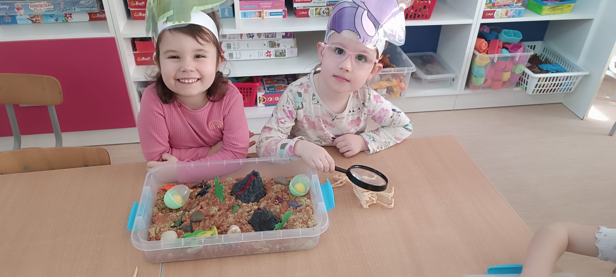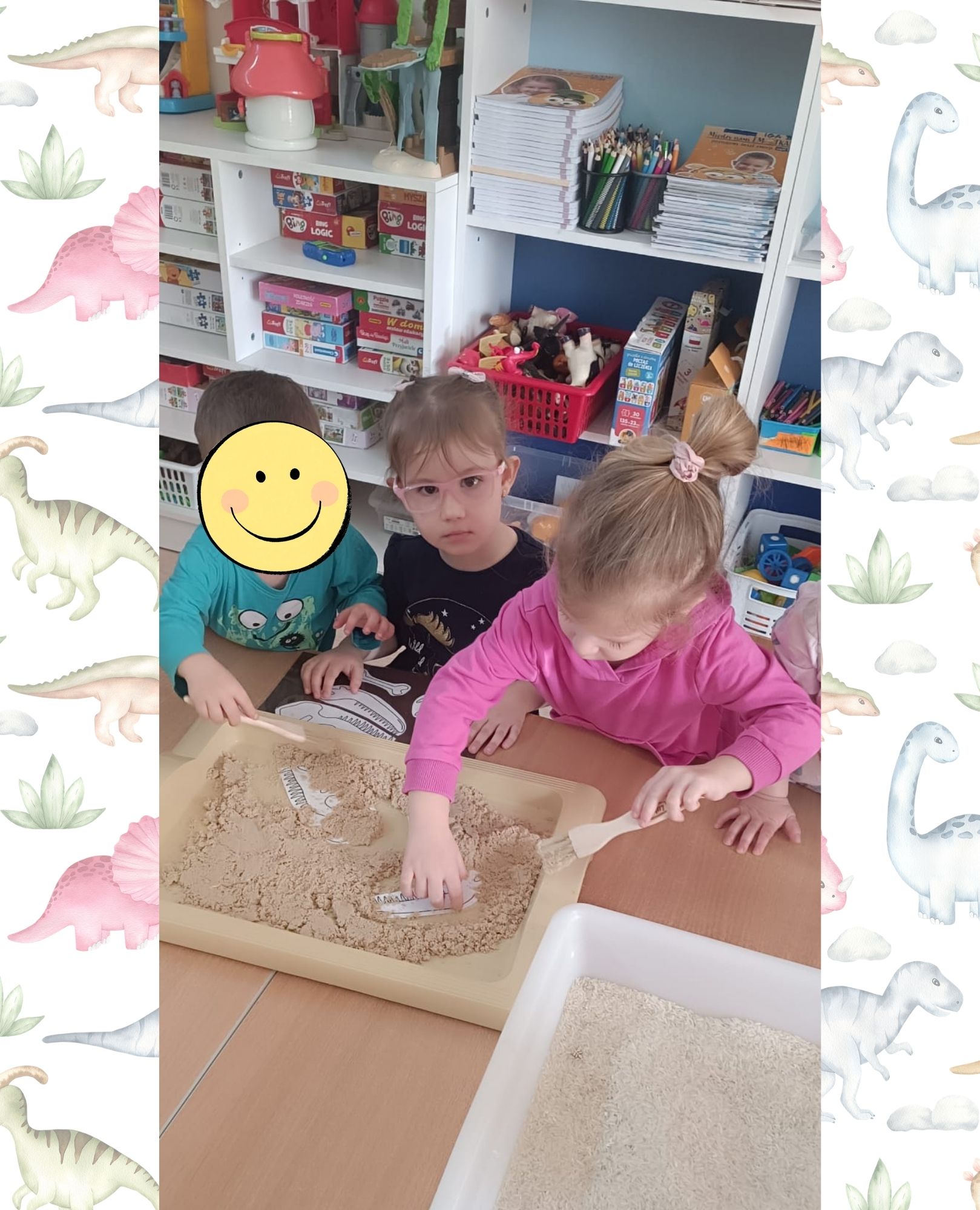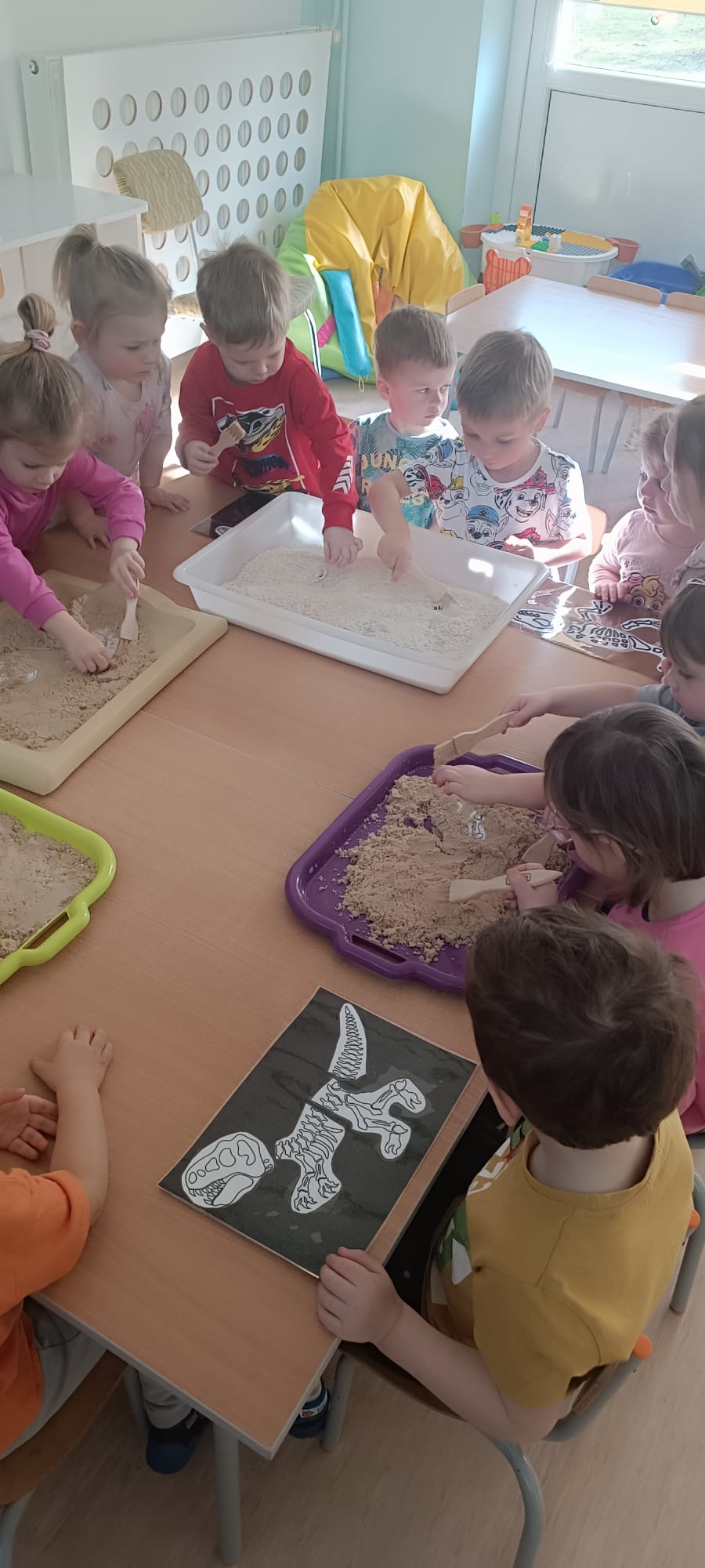 Eksplorowały piasek kinetyczny, w którym poszukiwały ukrytych jaj dinozaurów. Ta zabawa sensoryczna nie tylko dostarczyła mnóstwo frajdy, ale przede wszystkim stymulowała zmysł dotyku i rozwijała motorykę małą.