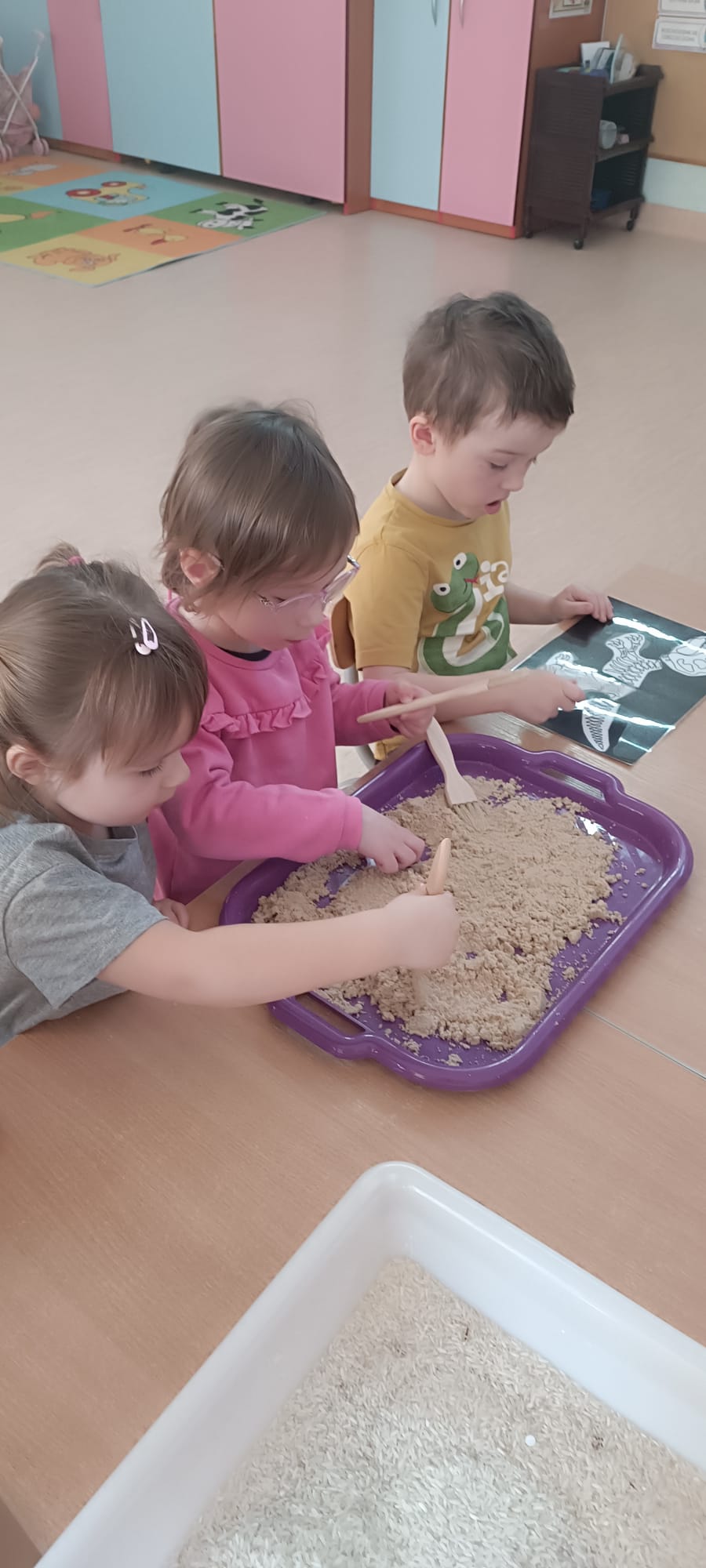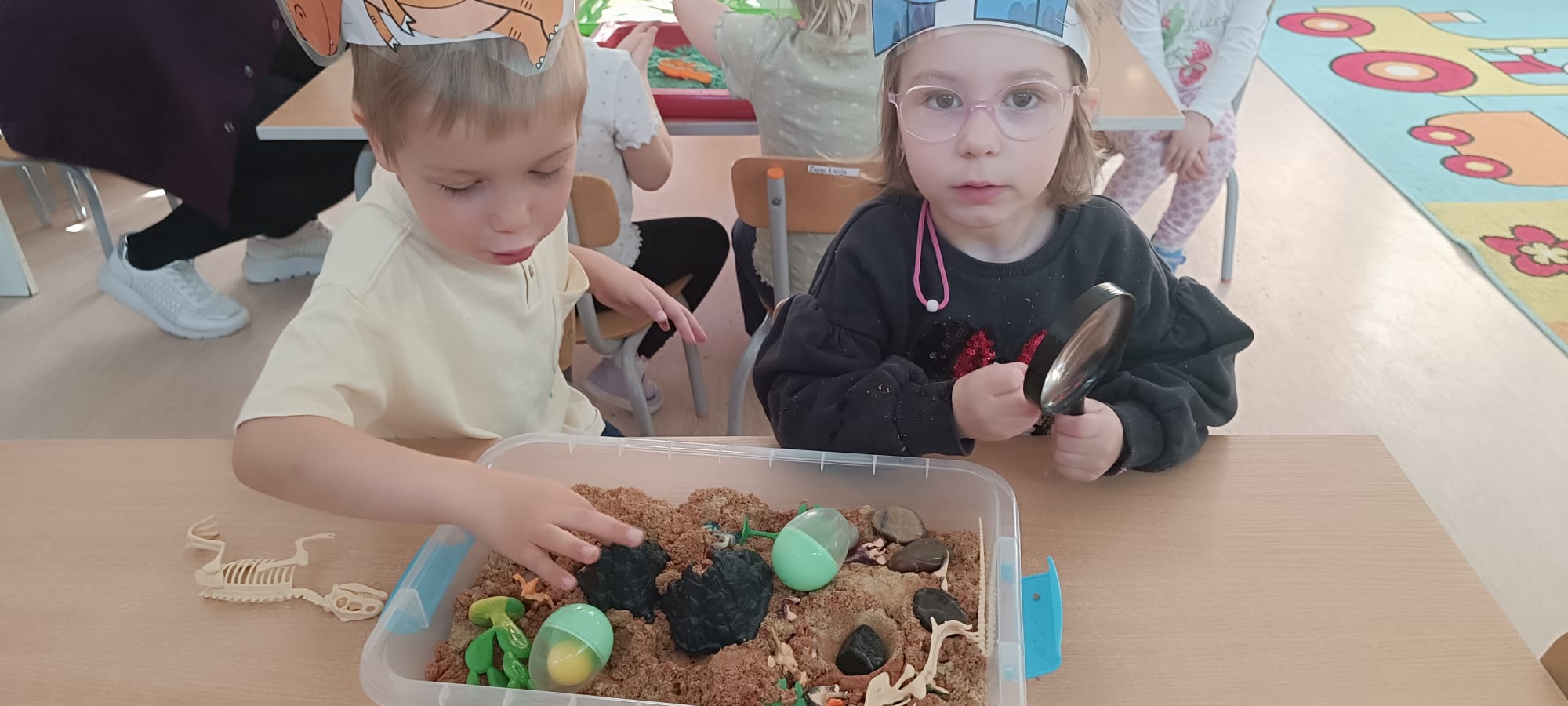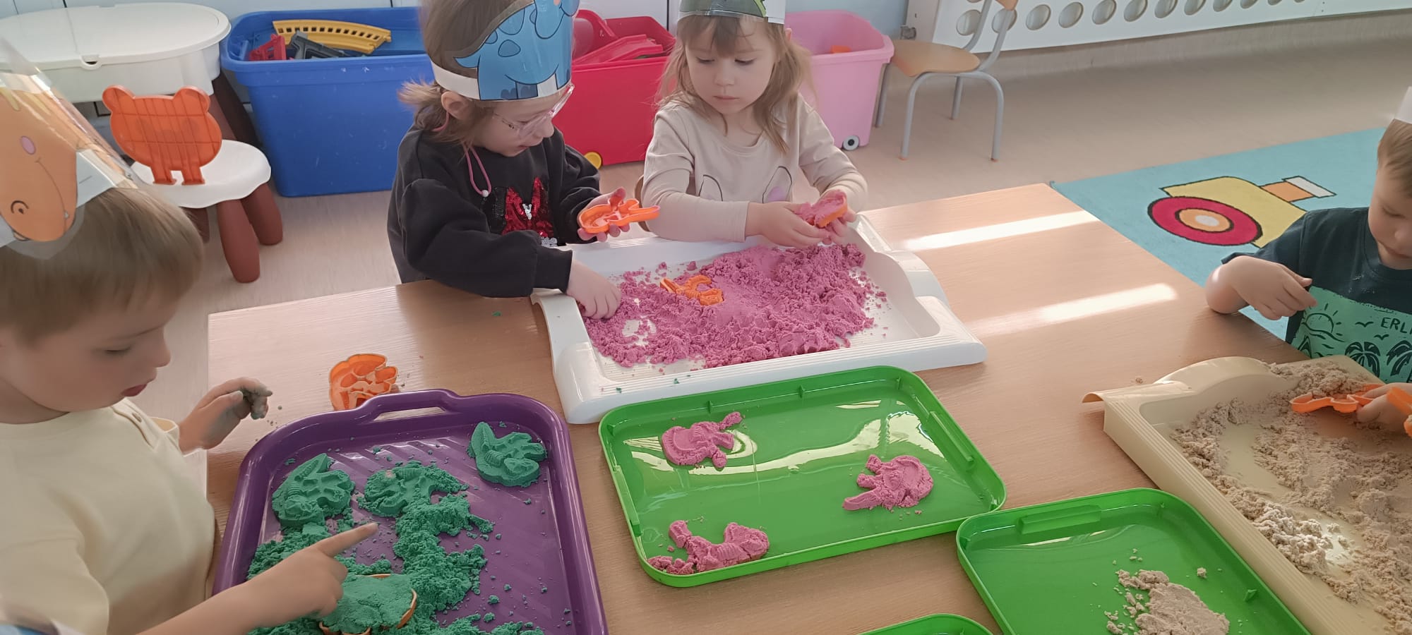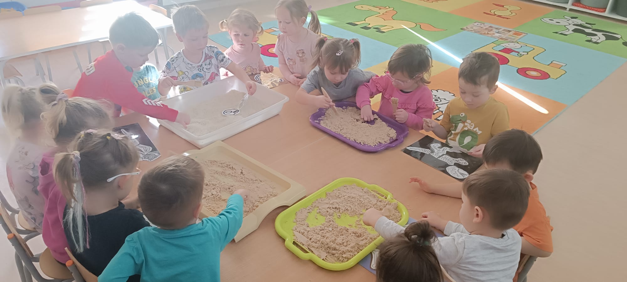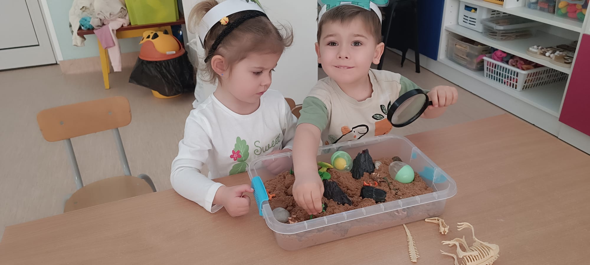Eksplorowały piasek kinetyczny, w którym poszukiwały ukrytych jaj dinozaurów. Ta zabawa sensoryczna nie tylko dostarczyła mnóstwo frajdy, ale przede wszystkim stymulowała zmysł dotyku i rozwijała motorykę małą.