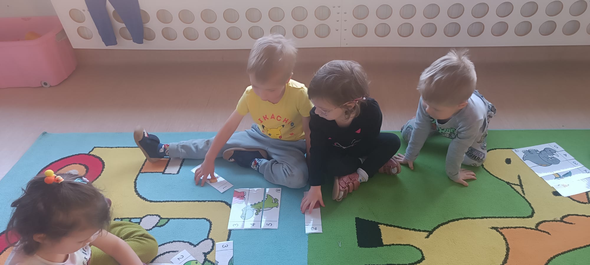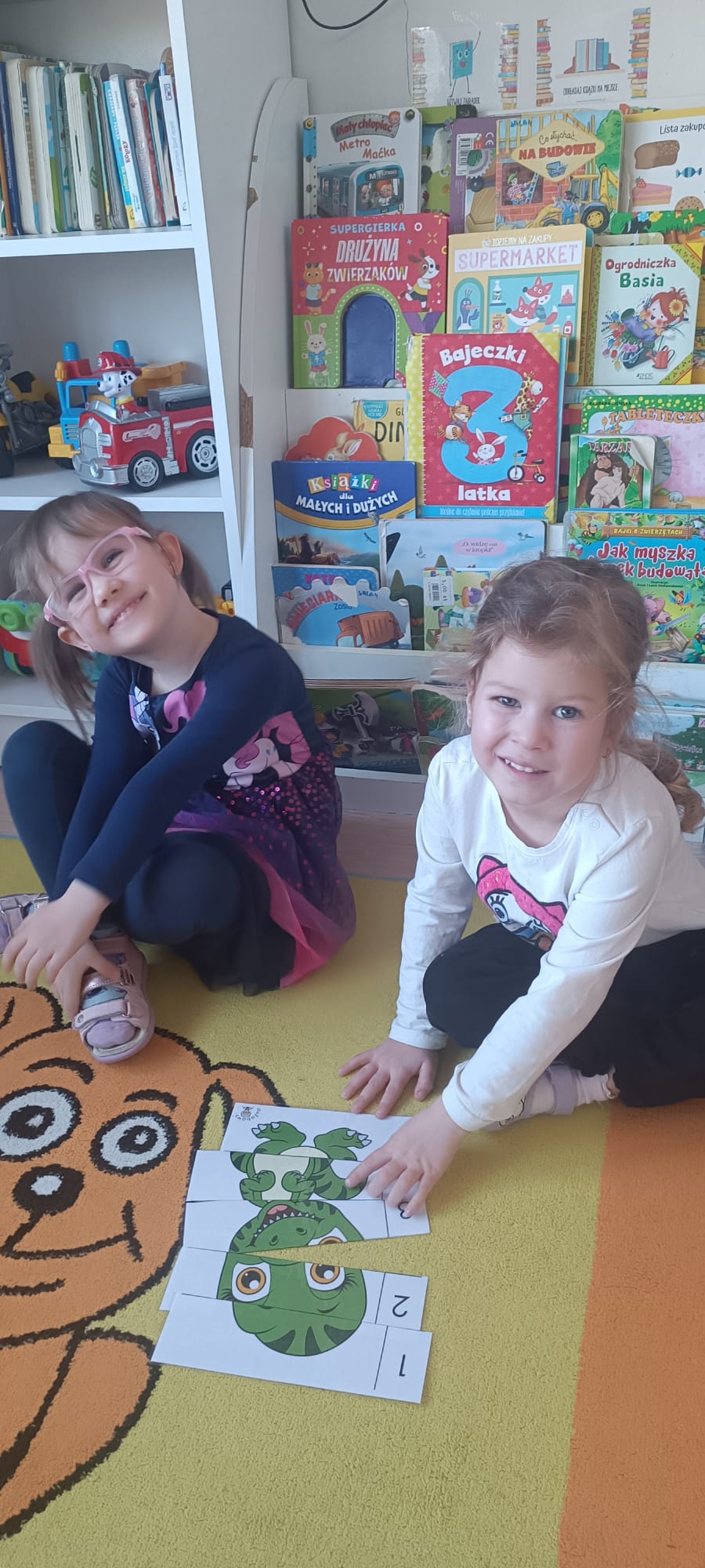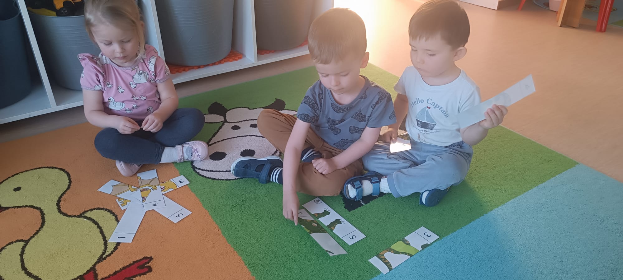 Nasze Biedroneczki udowodniły, że liczenie może być świetną zabawą! Dzieci układały specjalne puzzle z dinozaurami, wykorzystując cyfry od 1 do 5. To ćwiczenie pozwoliło nam w naturalny sposób utrwalić kolejność cyfr, ćwiczyć dopasowywanie elementów oraz rozwijać logiczne myślenie. Każdy ułożony obrazek był powodem do wielkiej dumy!