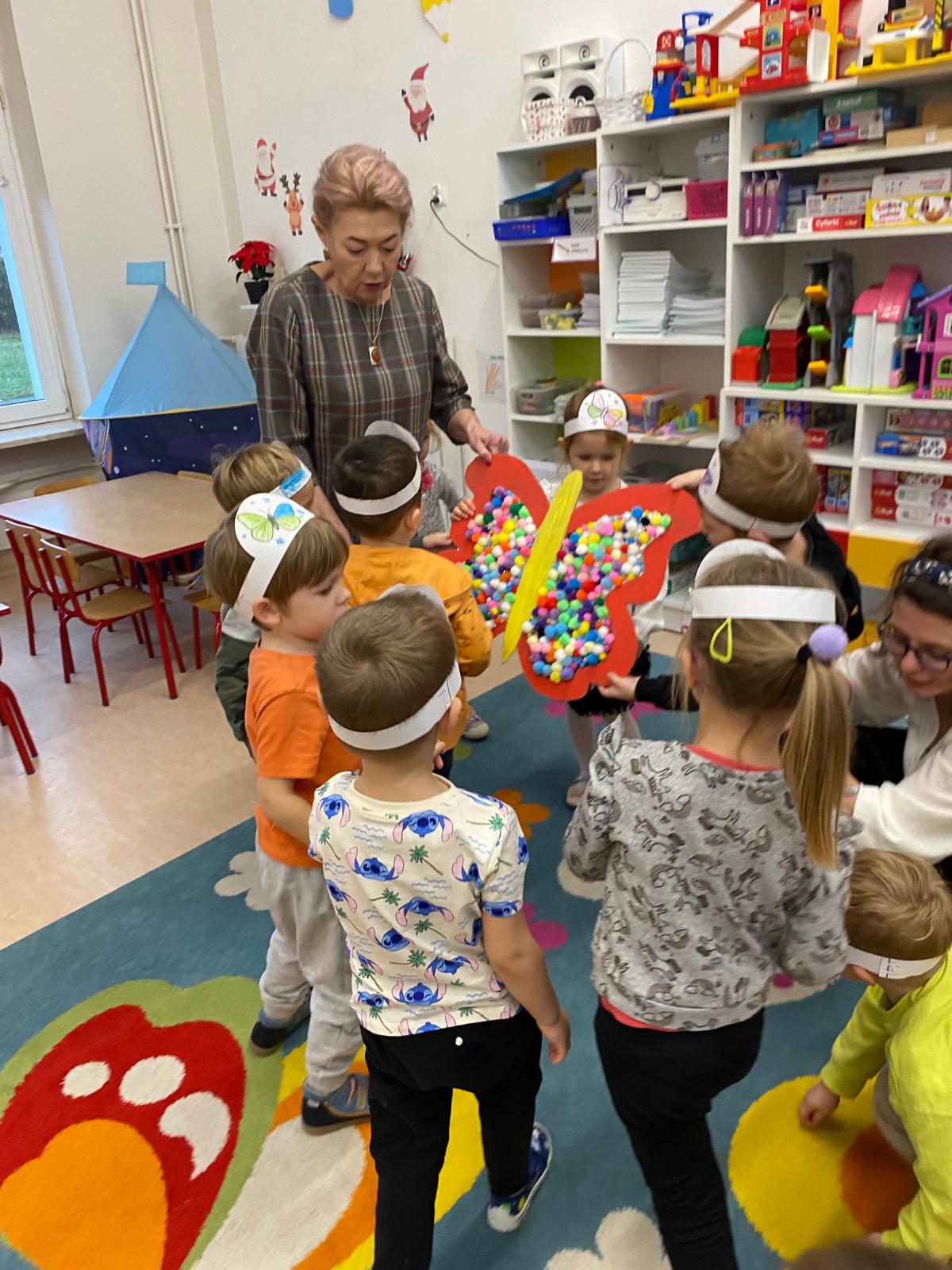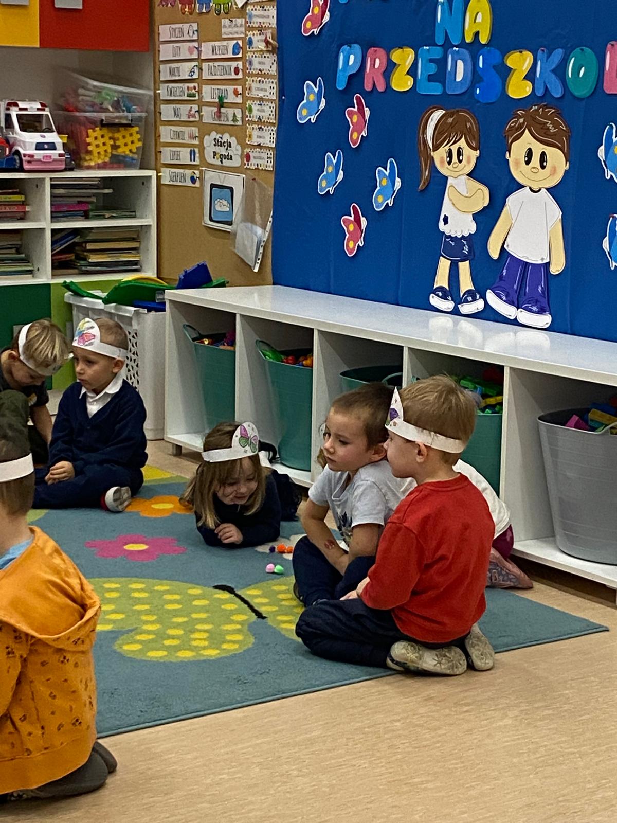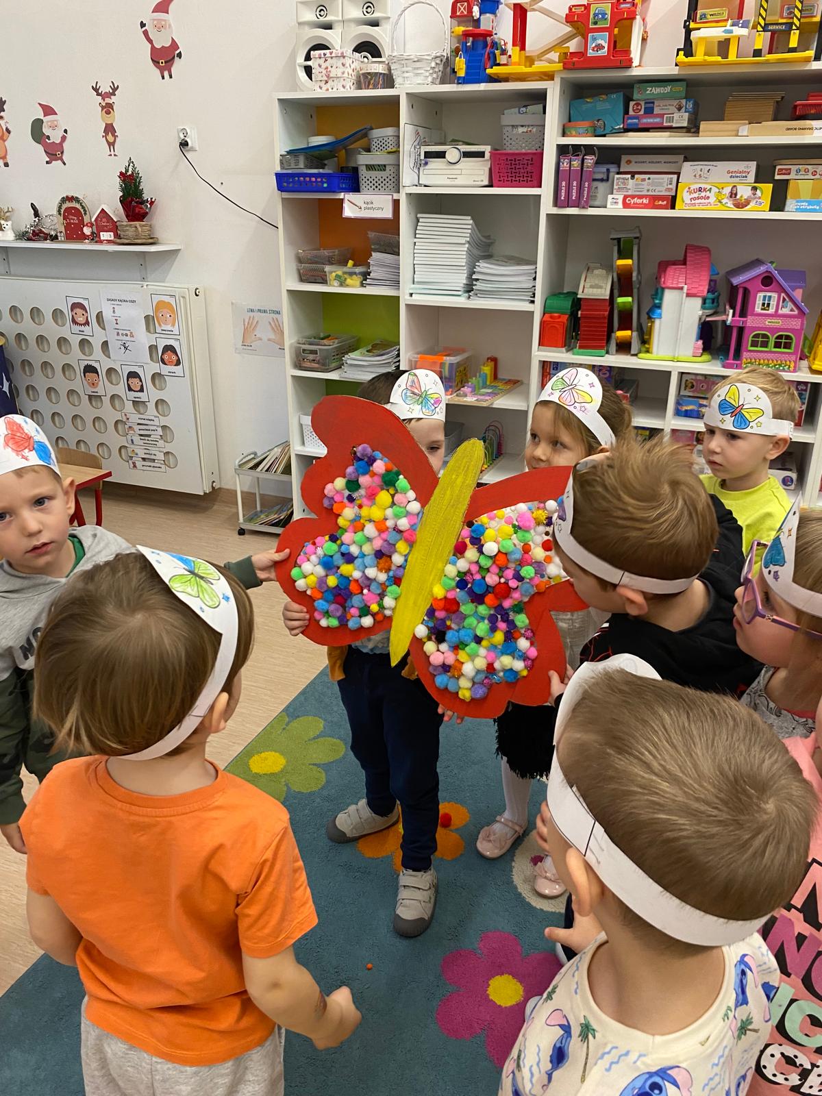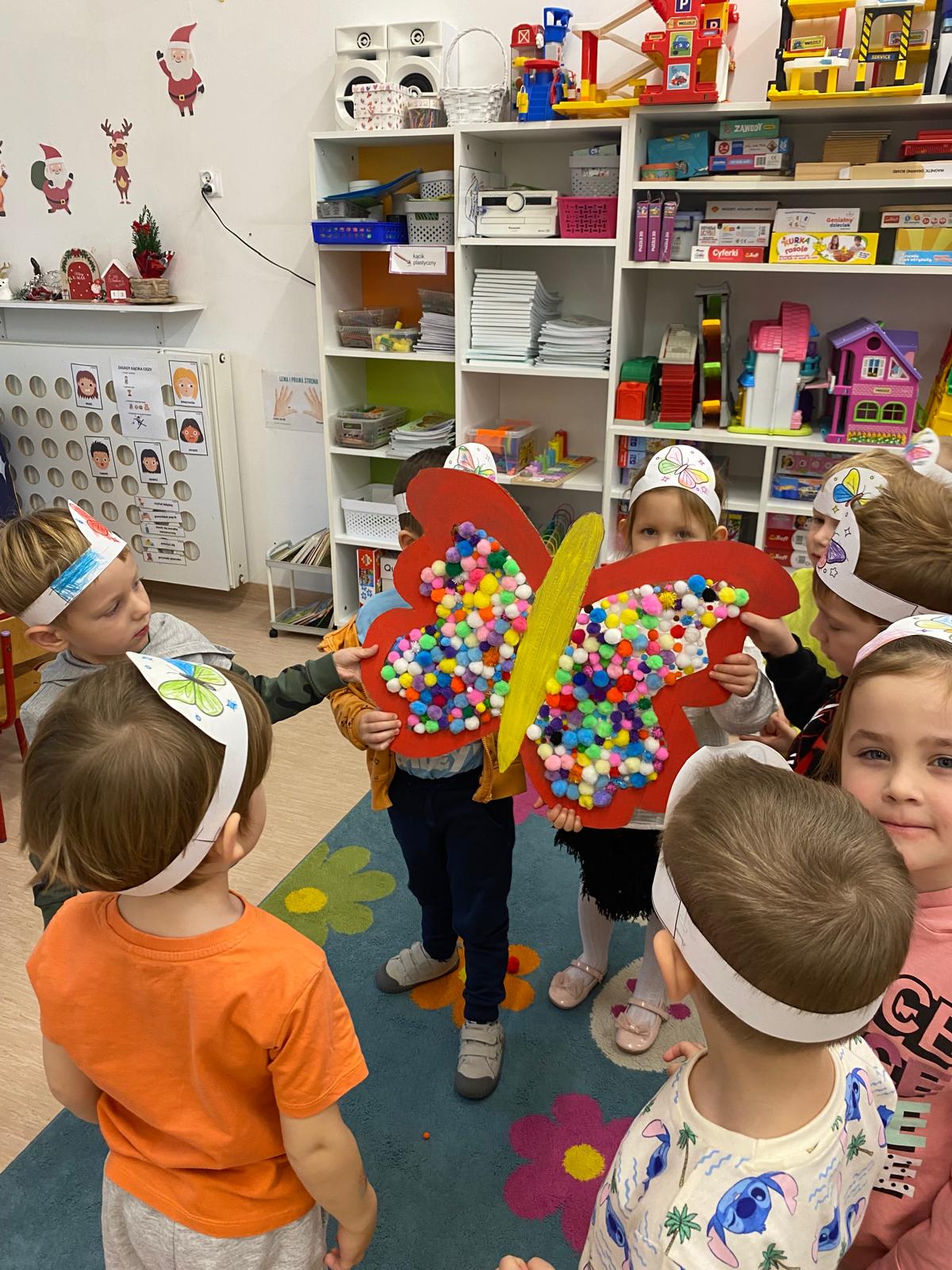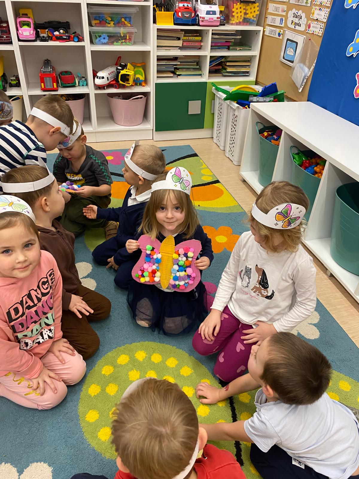 Zaczęliśmy od podróży do krainy motyli! Były tematyczne zabawy, śpiewanie wesołych piosenek i wspólne układanie skrzydeł z kolorowych pomponów.