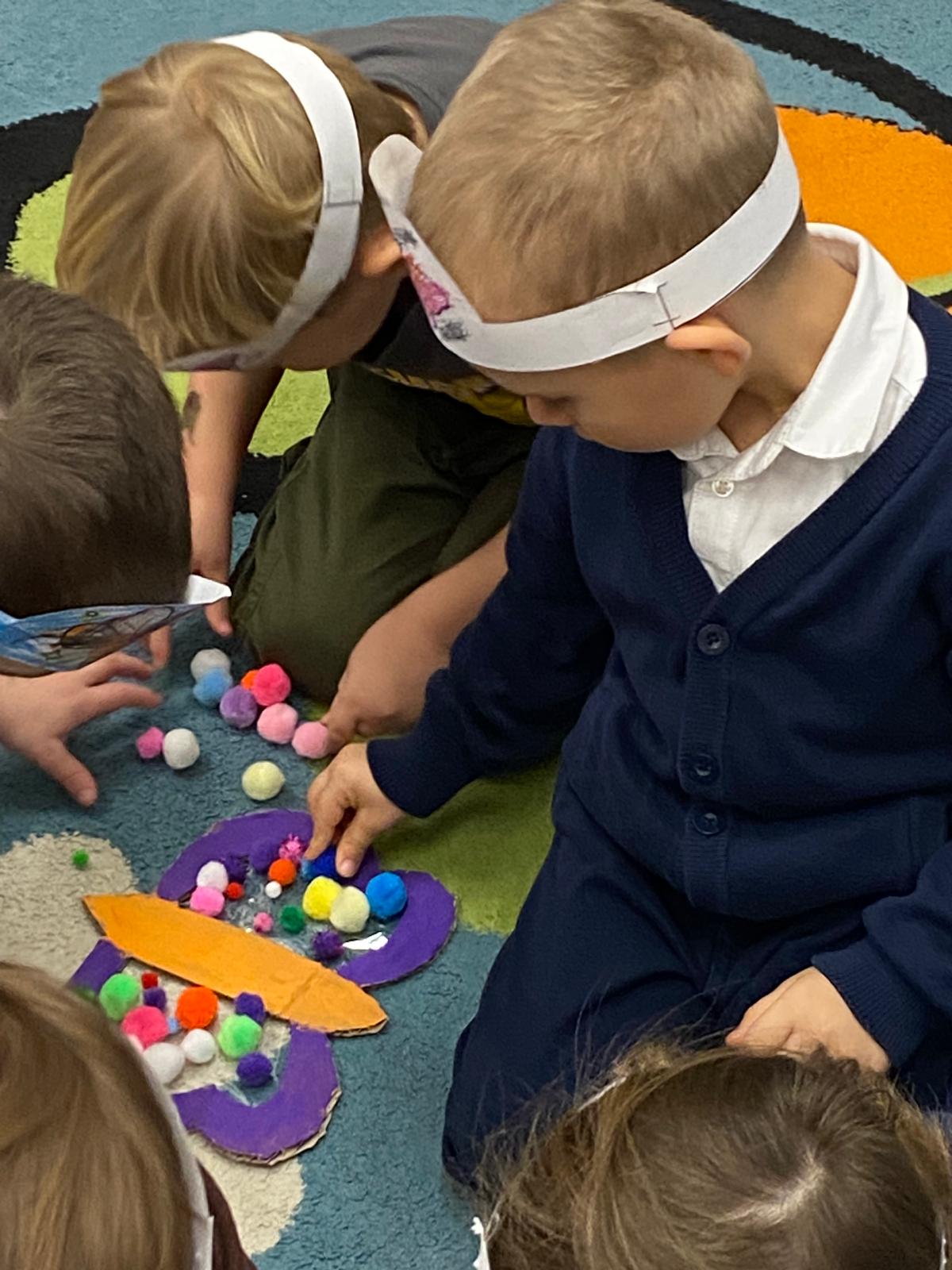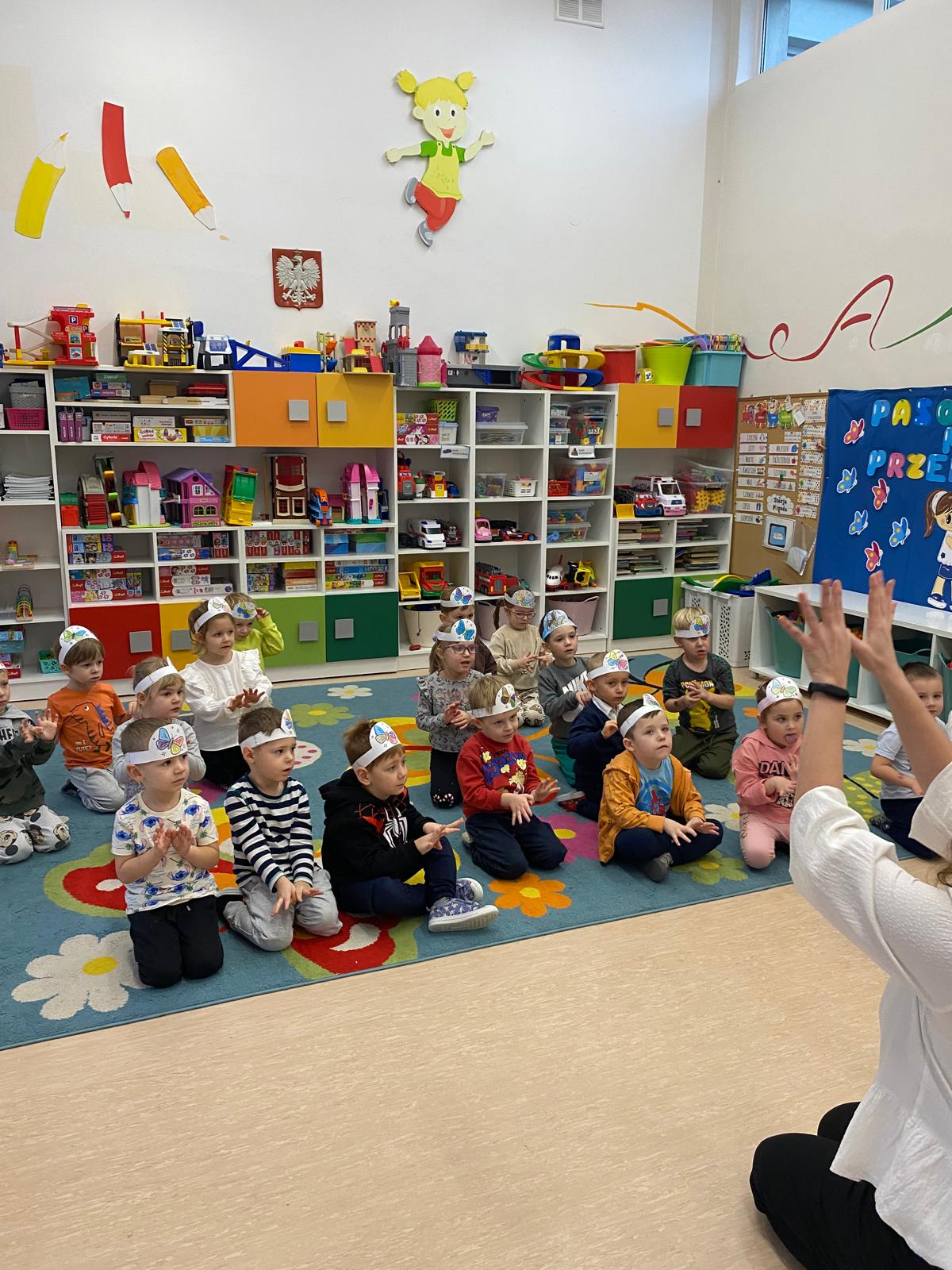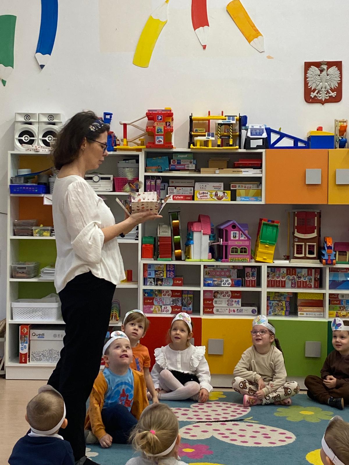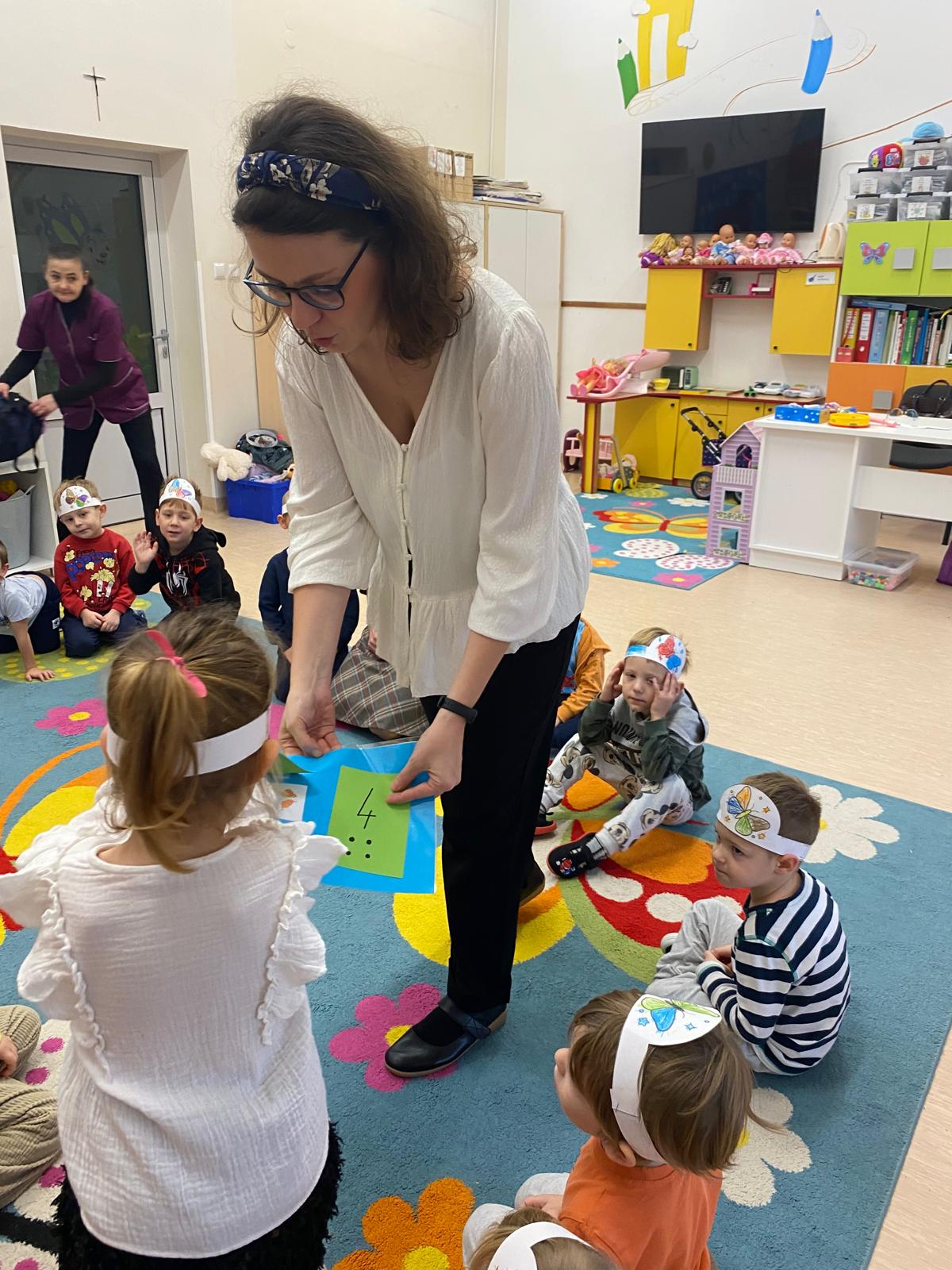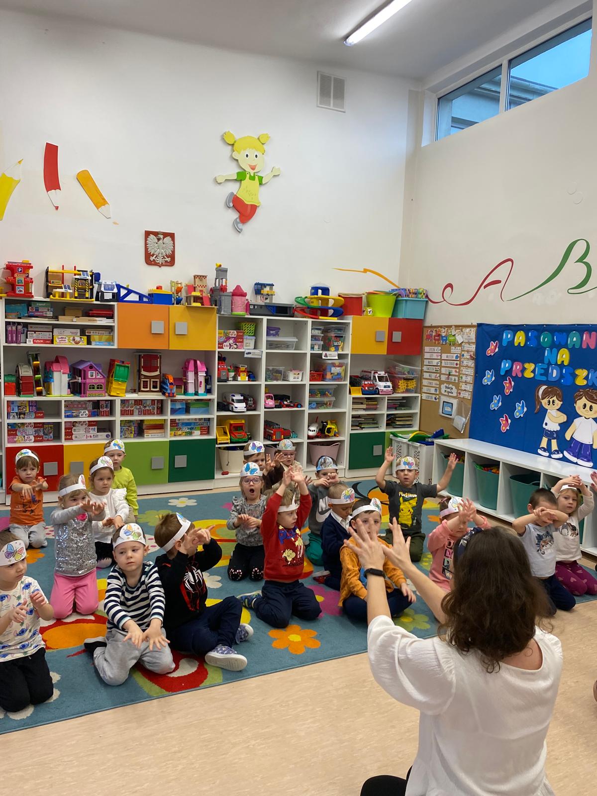 Zaczęliśmy od podróży do krainy motyli! Były tematyczne zabawy, śpiewanie wesołych piosenek i wspólne układanie skrzydeł z kolorowych pomponów.