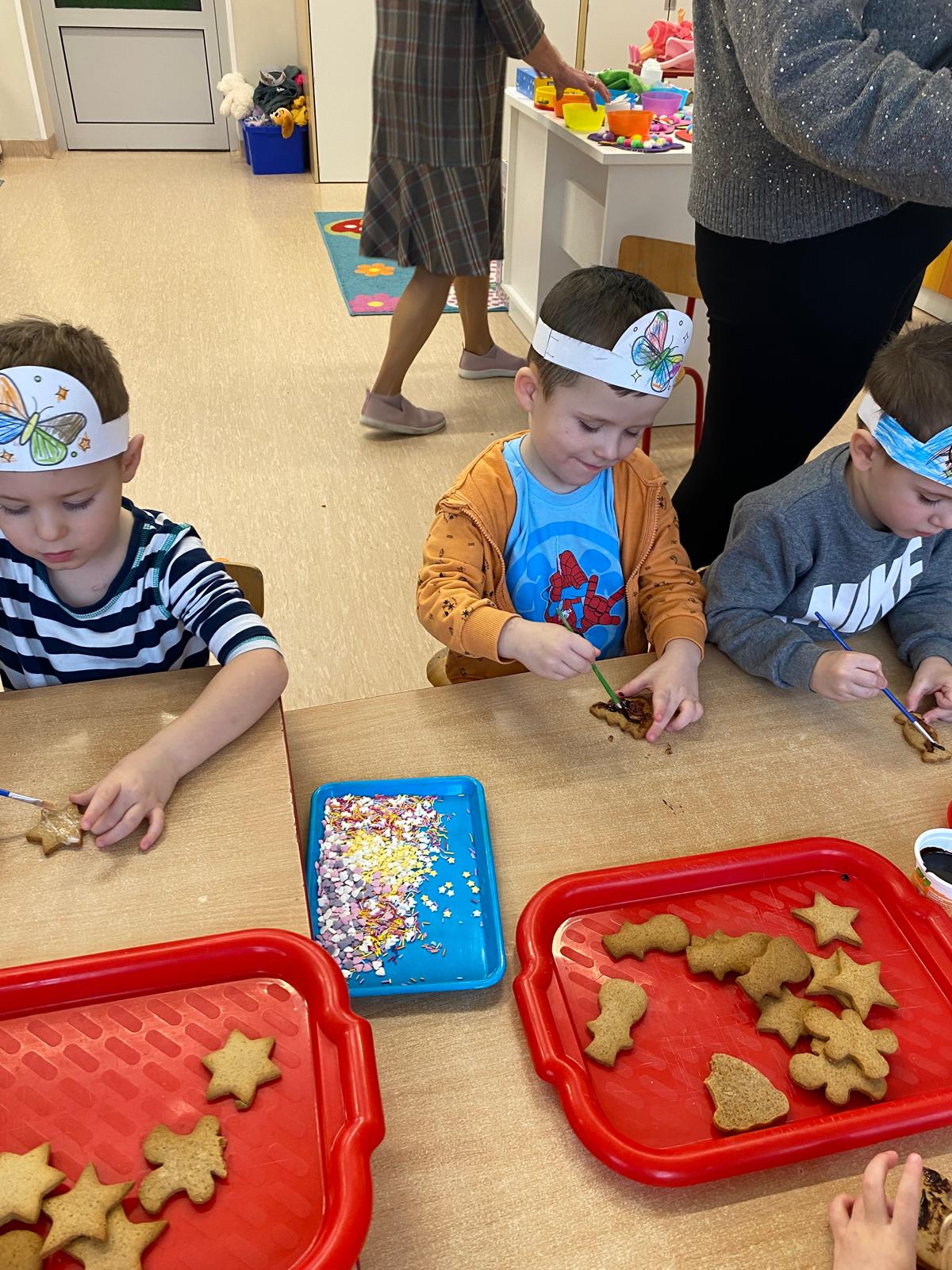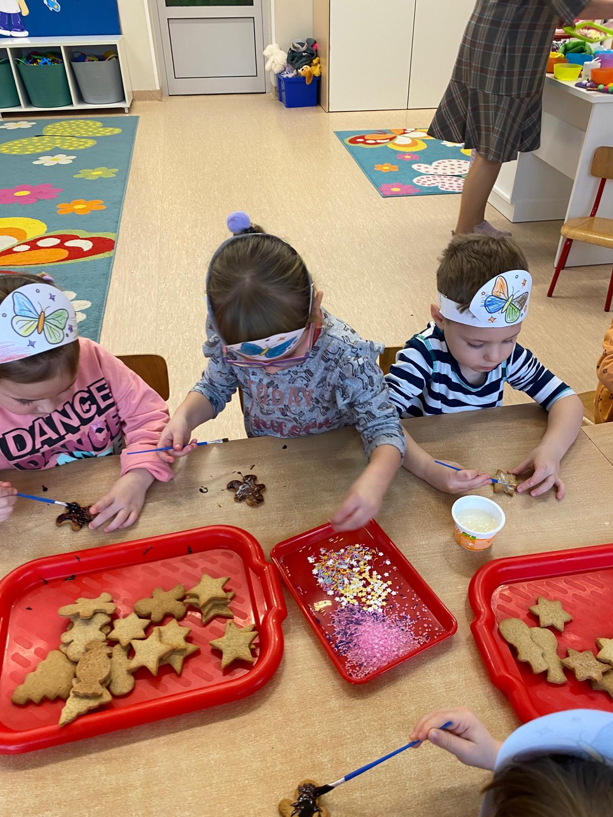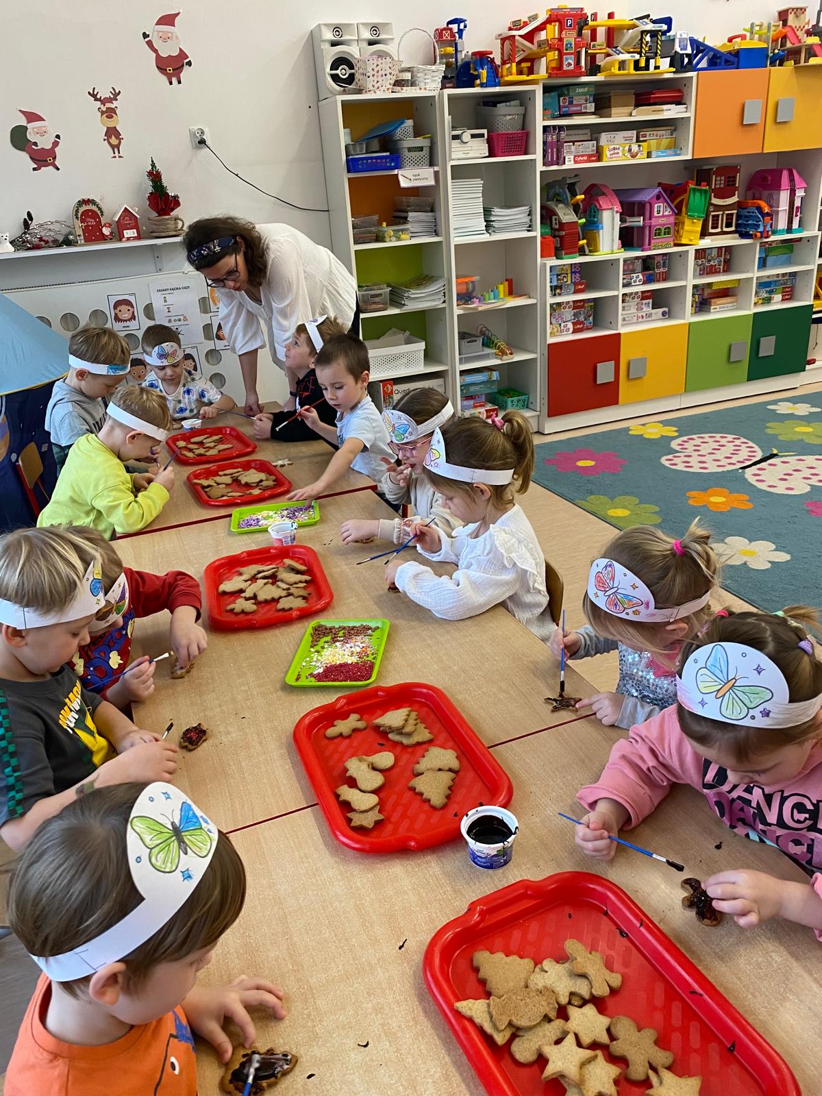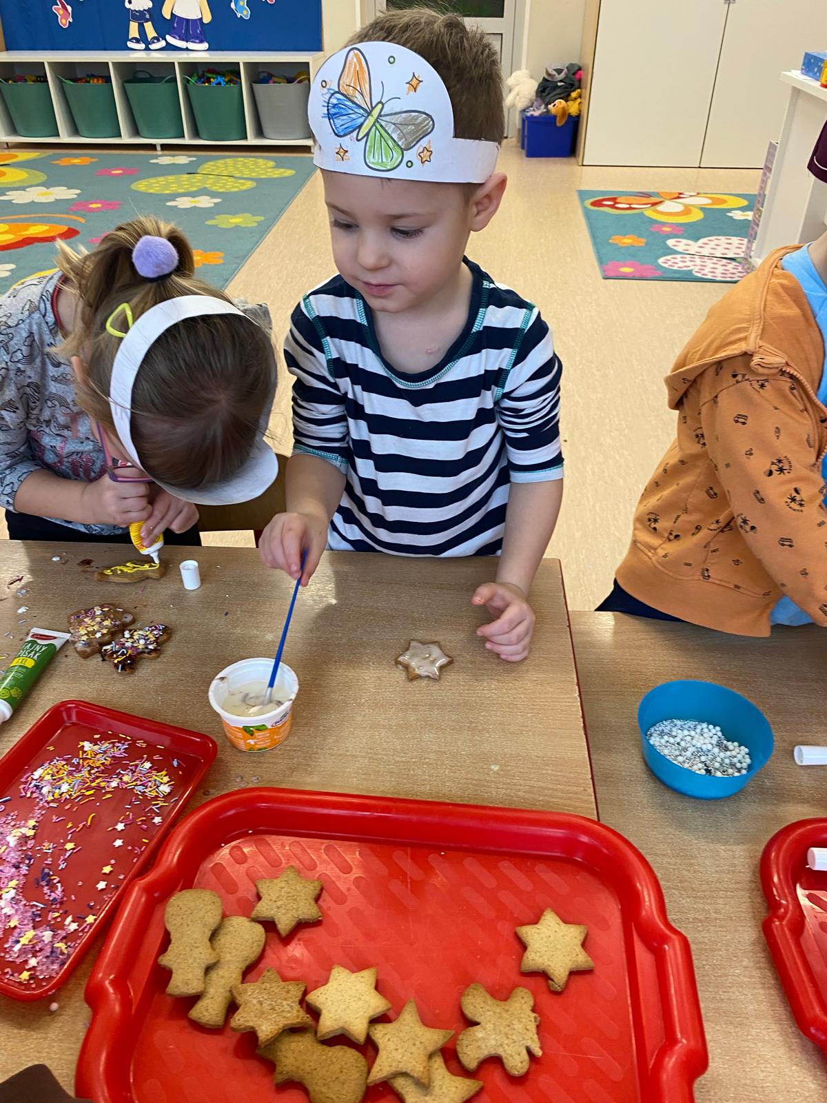 Później, nasza sala zamieniła się w pracownię małych cukierników! Wspólnie ugniataliśmy ciasto, wycinaliśmy motylkowe kształty i dekorowaliśmy nasze słodkie dzieła. To była prawdziwa aromatyczna uczta dla zmysłów i doskonała okazja do grupowej pracy!