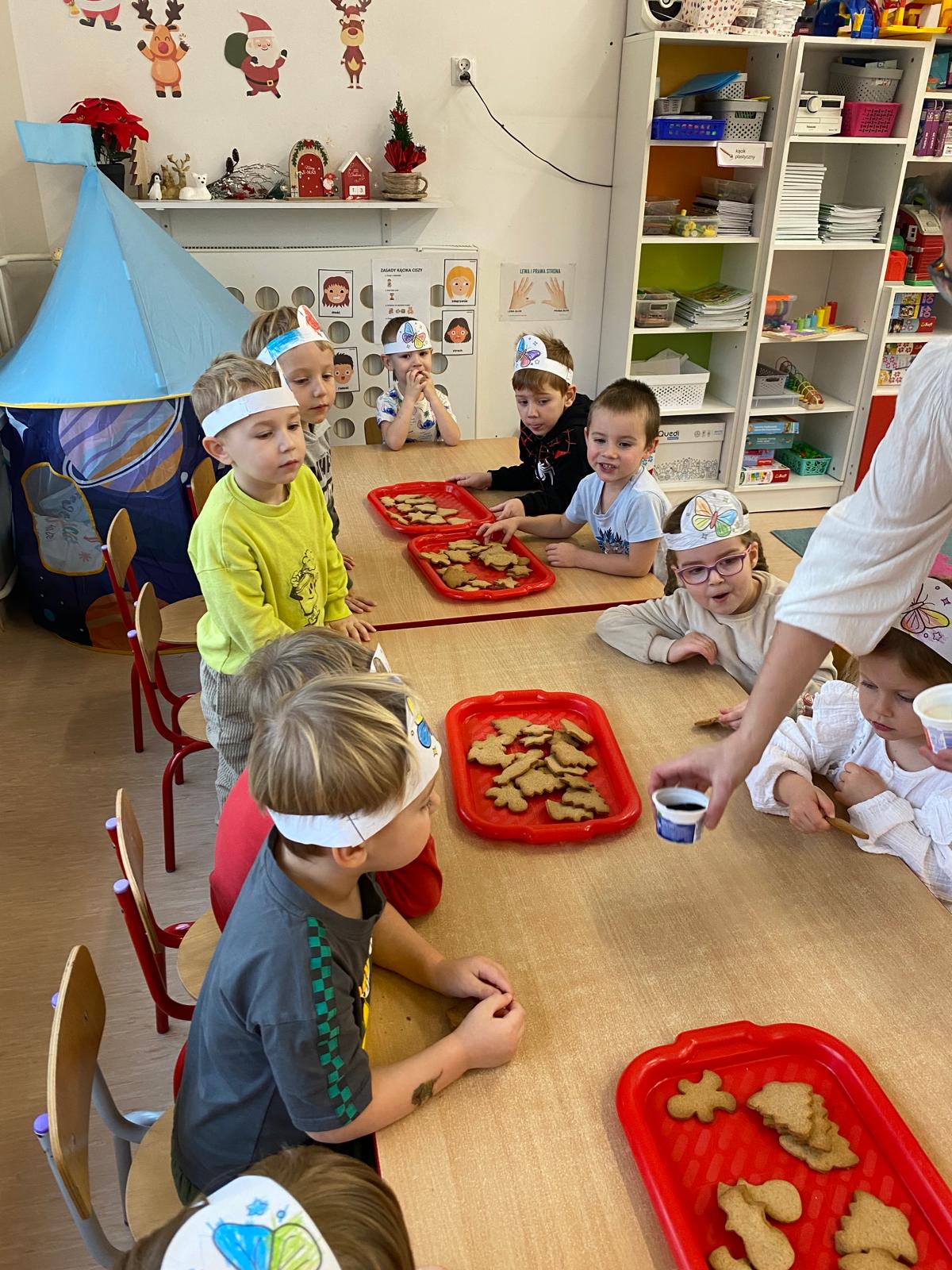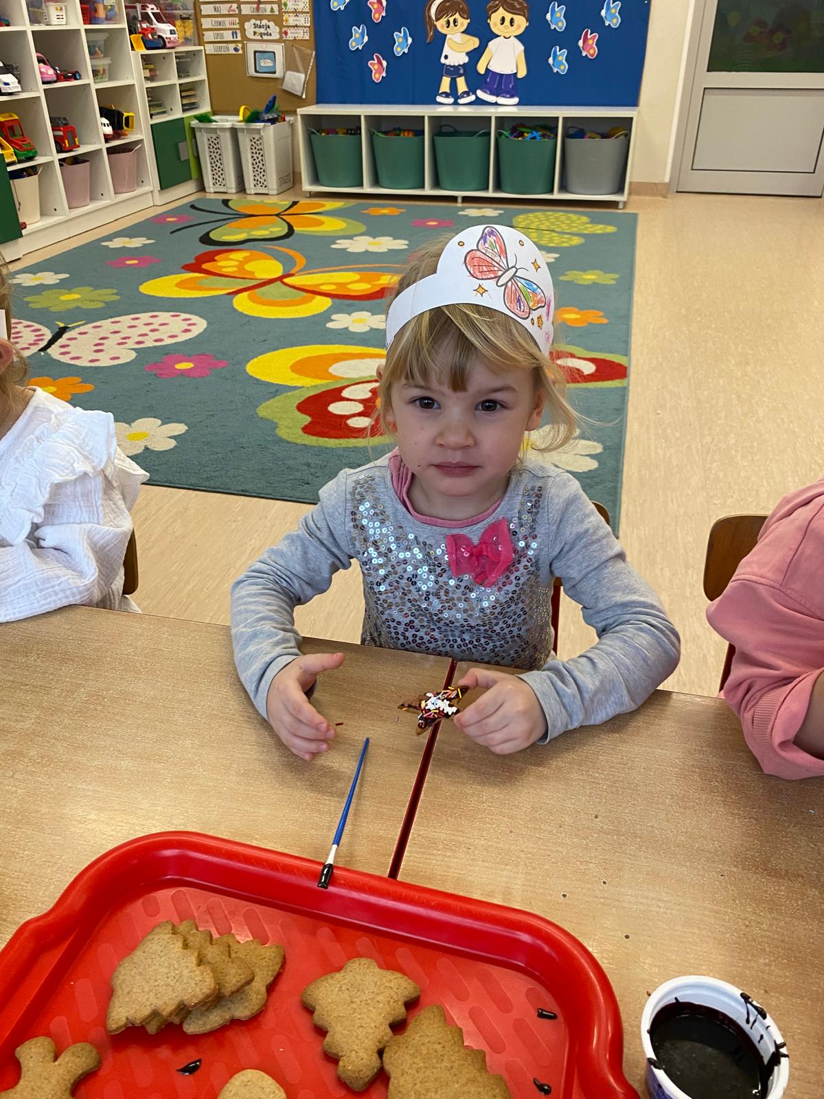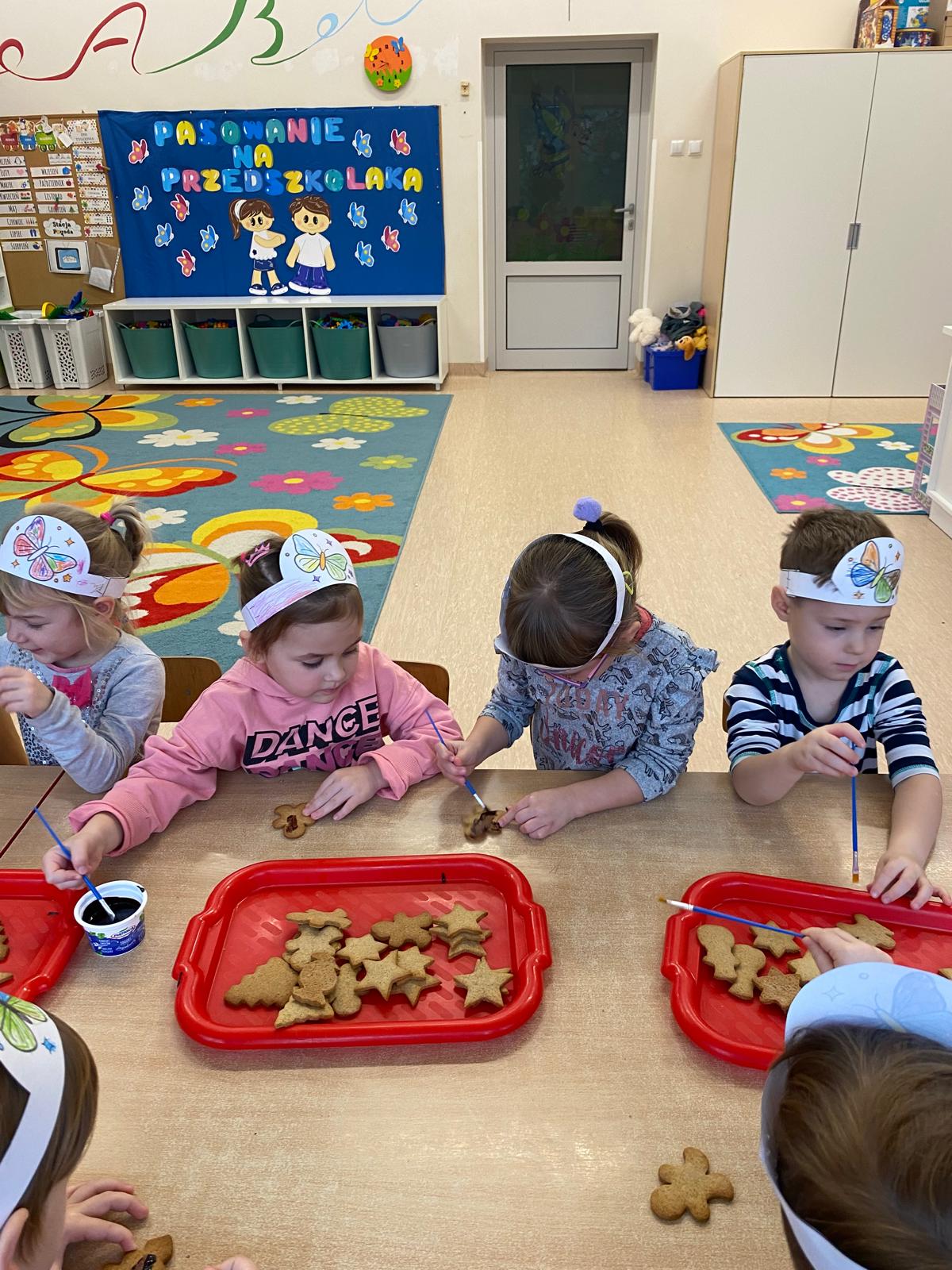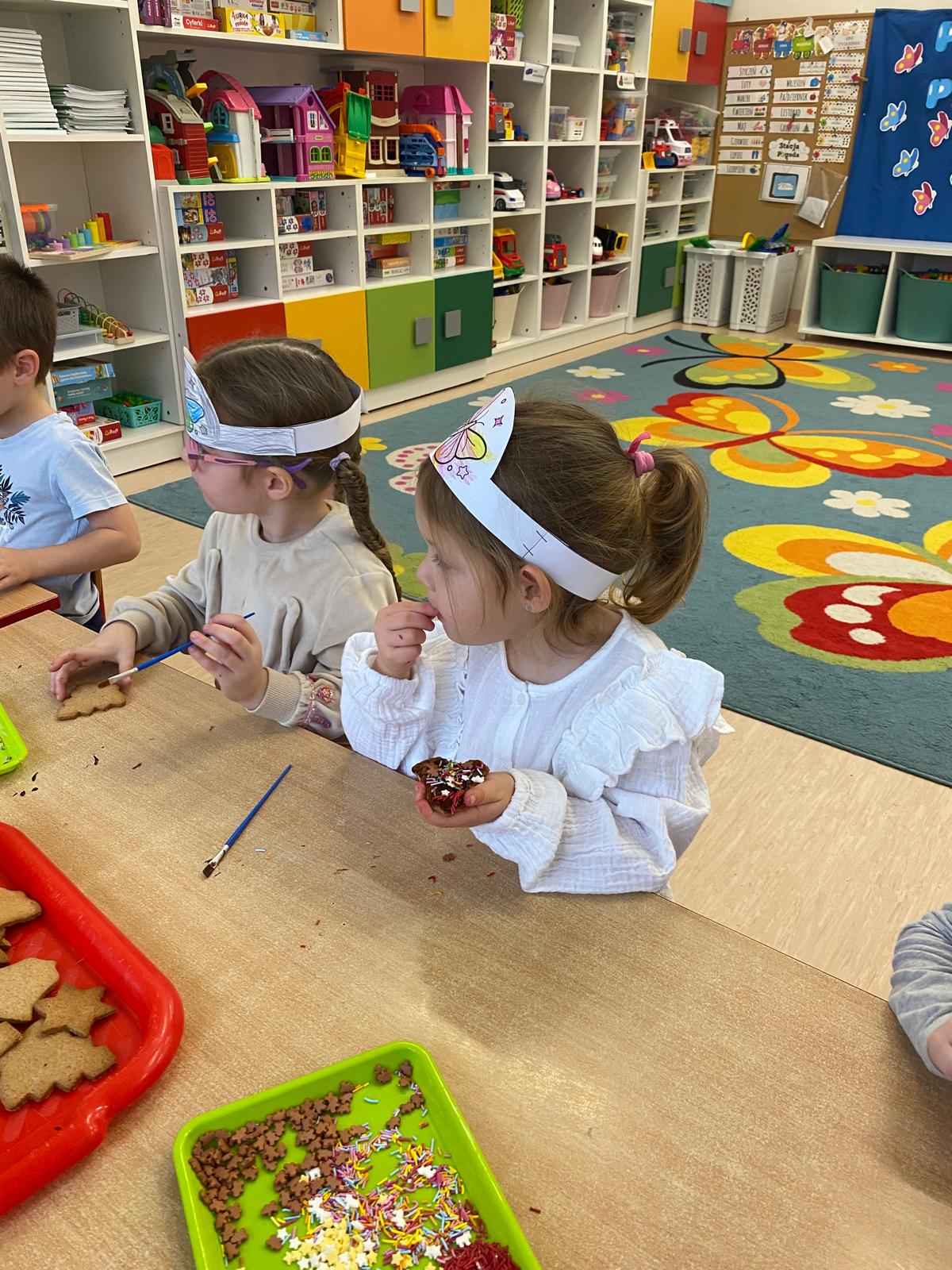 Później, nasza sala zamieniła się w pracownię małych cukierników! Wspólnie ugniataliśmy ciasto, wycinaliśmy motylkowe kształty i dekorowaliśmy nasze słodkie dzieła. To była prawdziwa aromatyczna uczta dla zmysłów i doskonała okazja do grupowej pracy!