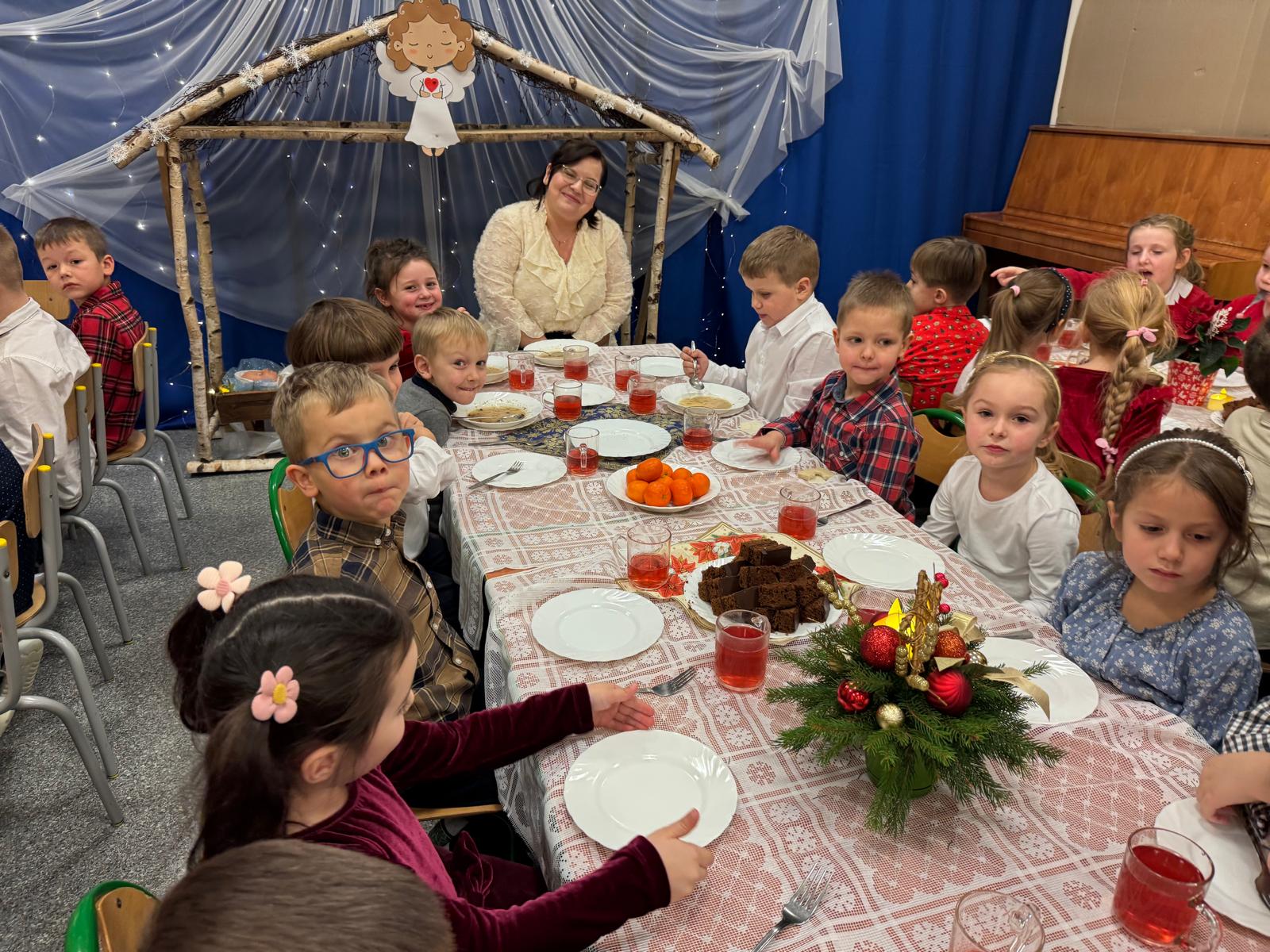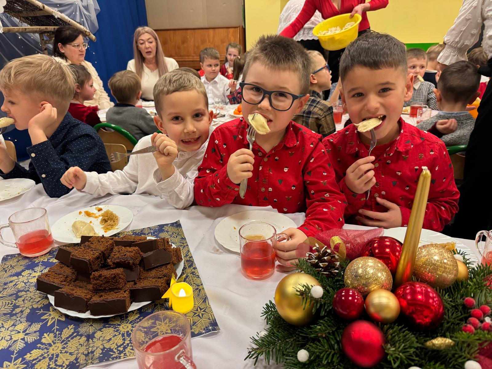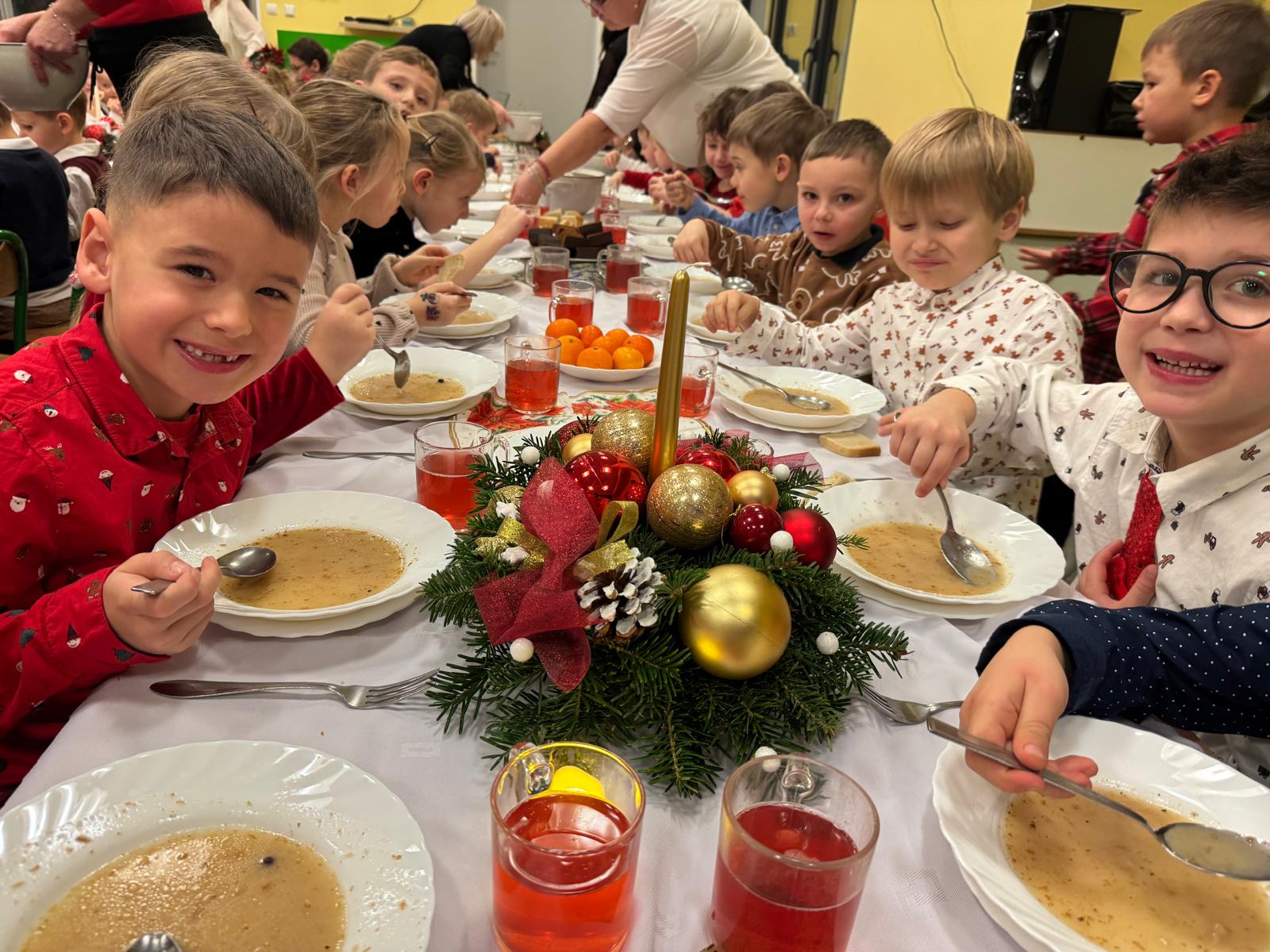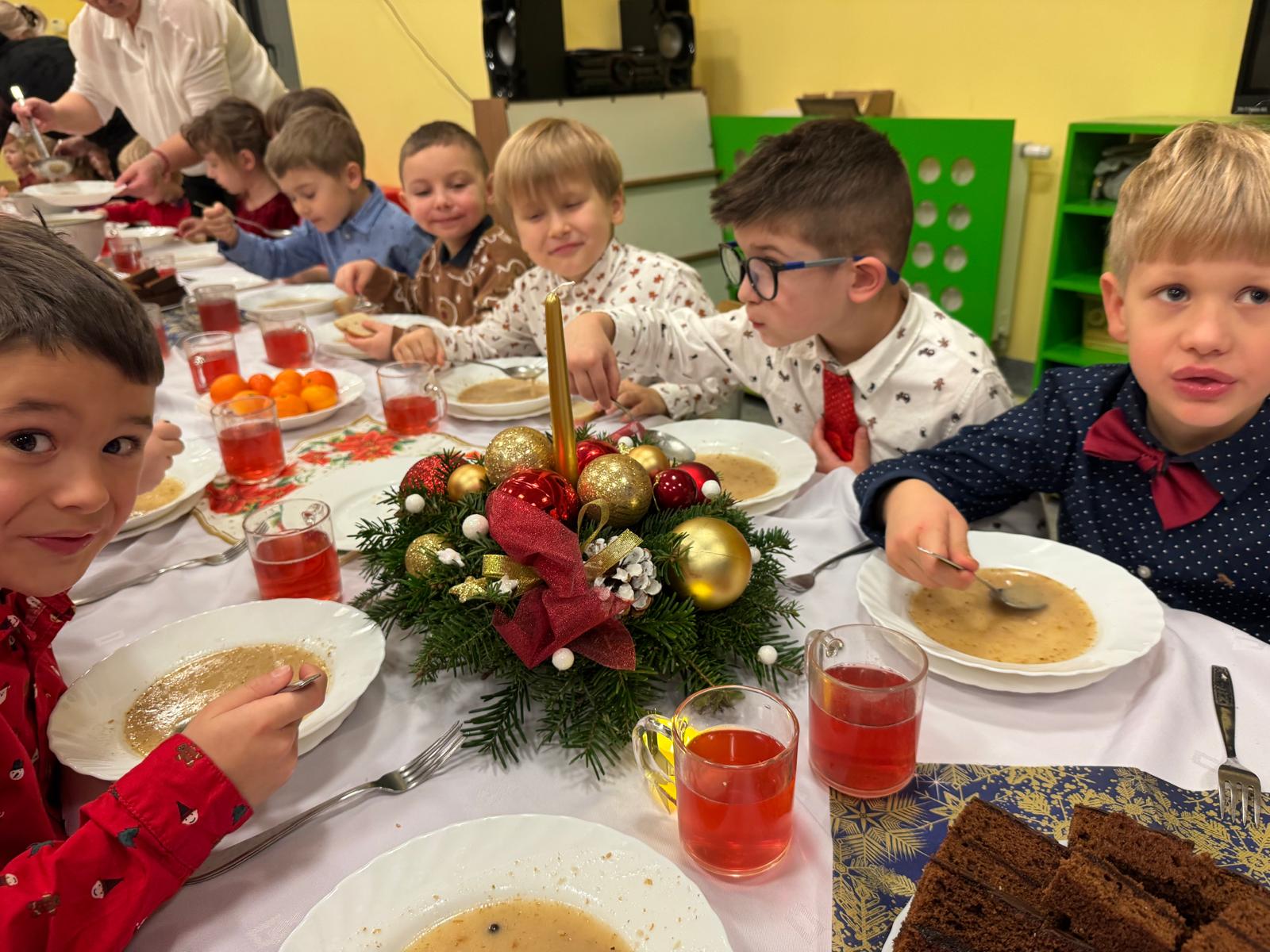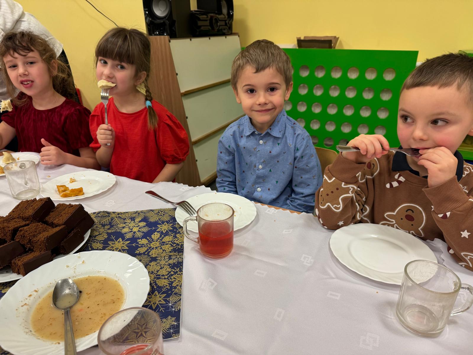 Po tej wzruszającej chwili zasiedliśmy do wspólnego stołu, by spróbować tradycyjnych potraw wigilijnych. Na naszych talerzach pojawił się aromatyczny barszcz biały, delikatne pierożki, świąteczna kapustka, smakowita rybka, a na deser — pachnący korzennymi przyprawami piernik, który dzieci zajadały z ogromną radością.