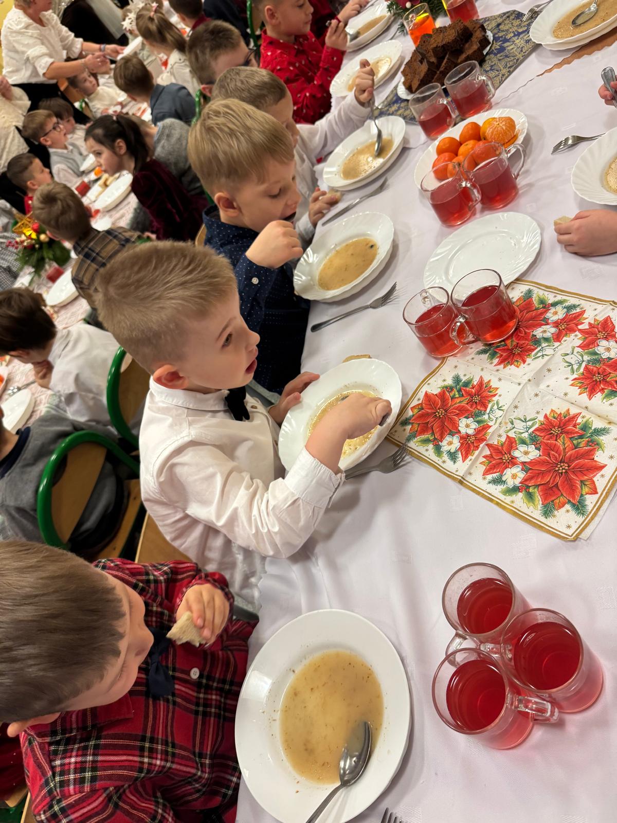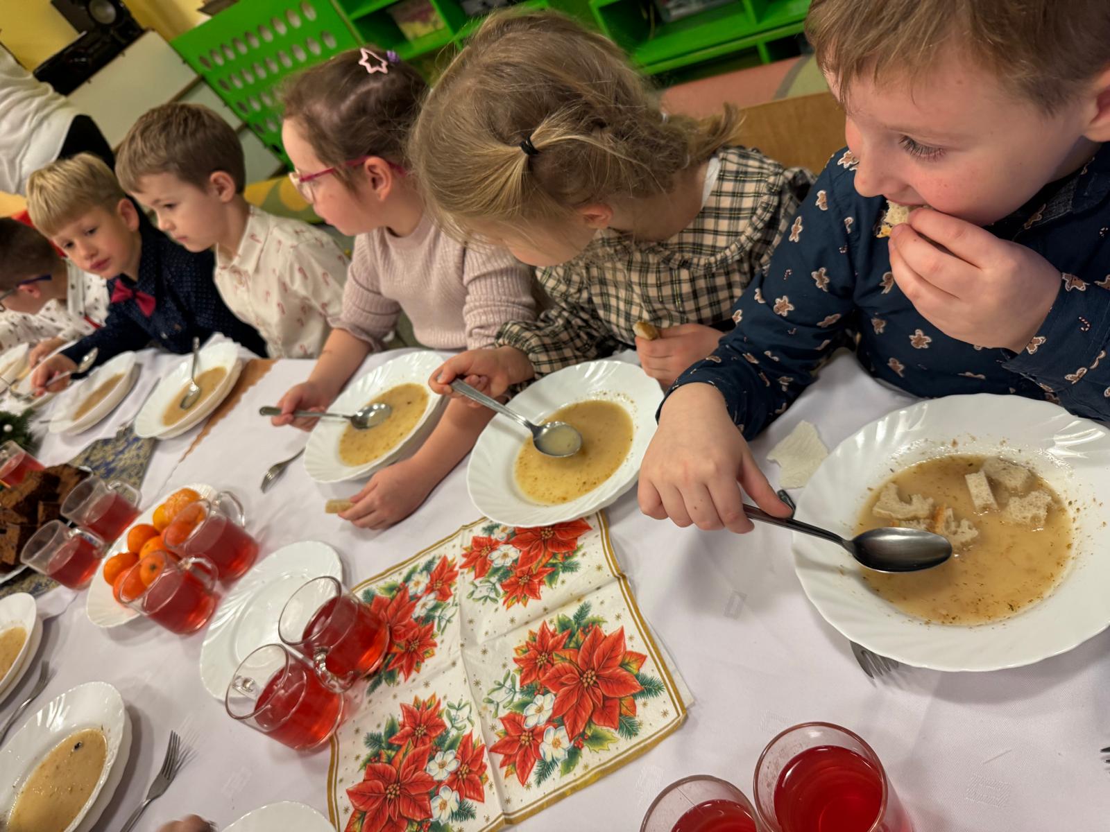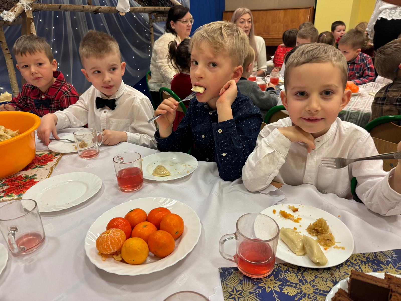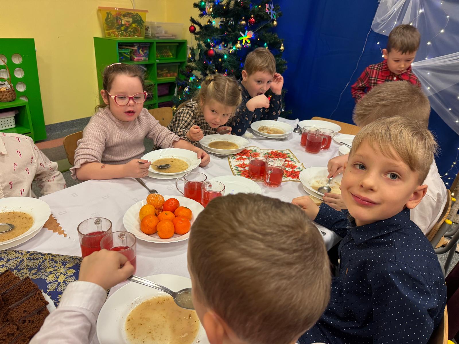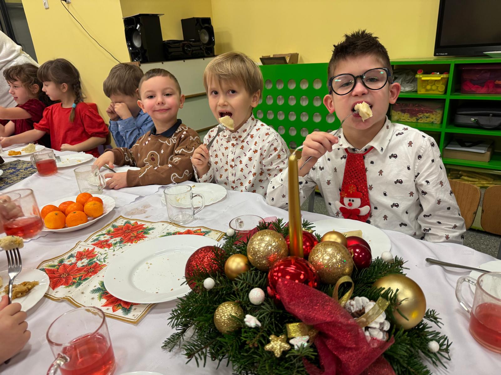 Po tej wzruszającej chwili zasiedliśmy do wspólnego stołu, by spróbować tradycyjnych potraw wigilijnych. Na naszych talerzach pojawił się aromatyczny barszcz biały, delikatne pierożki, świąteczna kapustka, smakowita rybka, a na deser — pachnący korzennymi przyprawami piernik, który dzieci zajadały z ogromną radością.