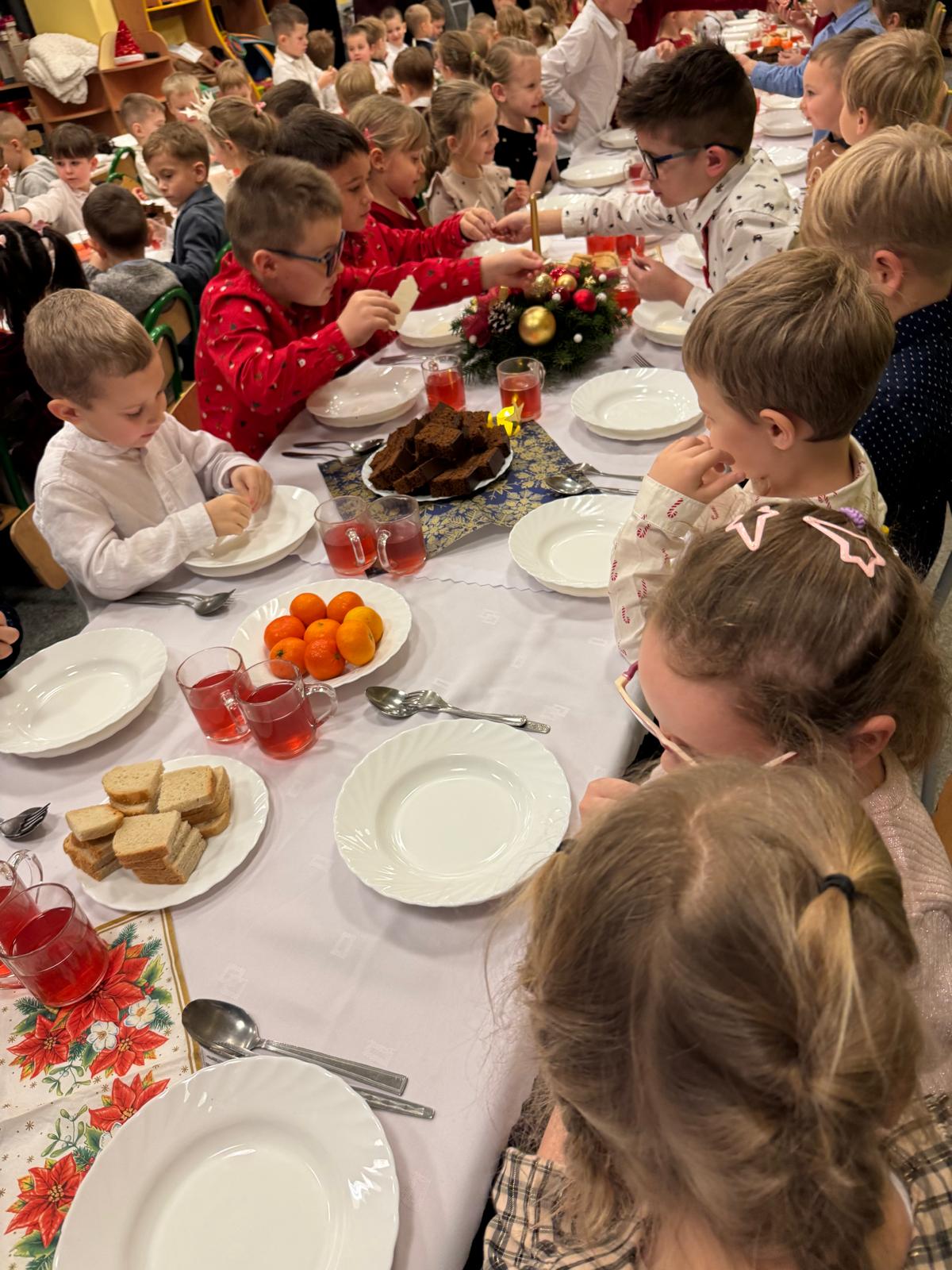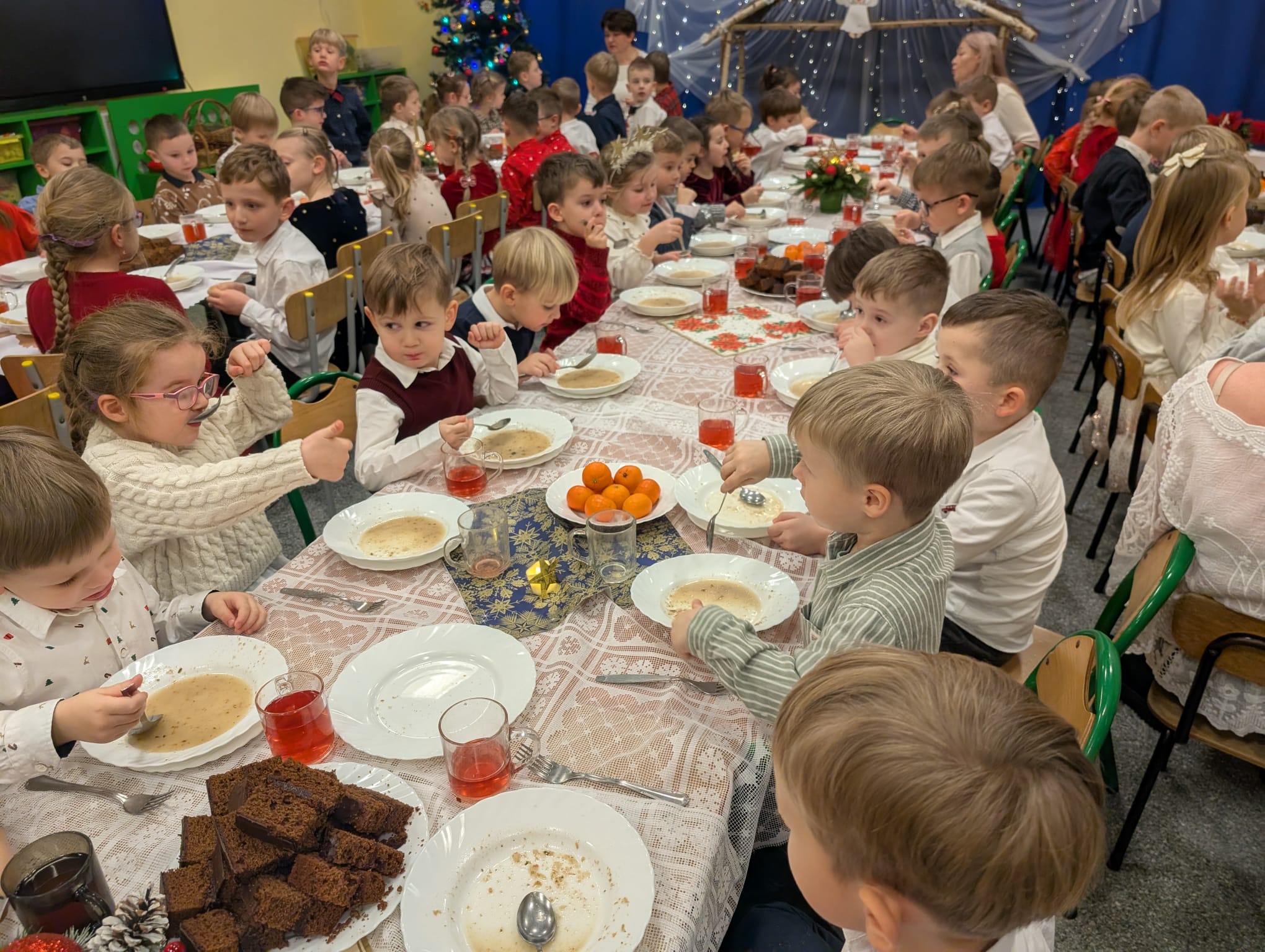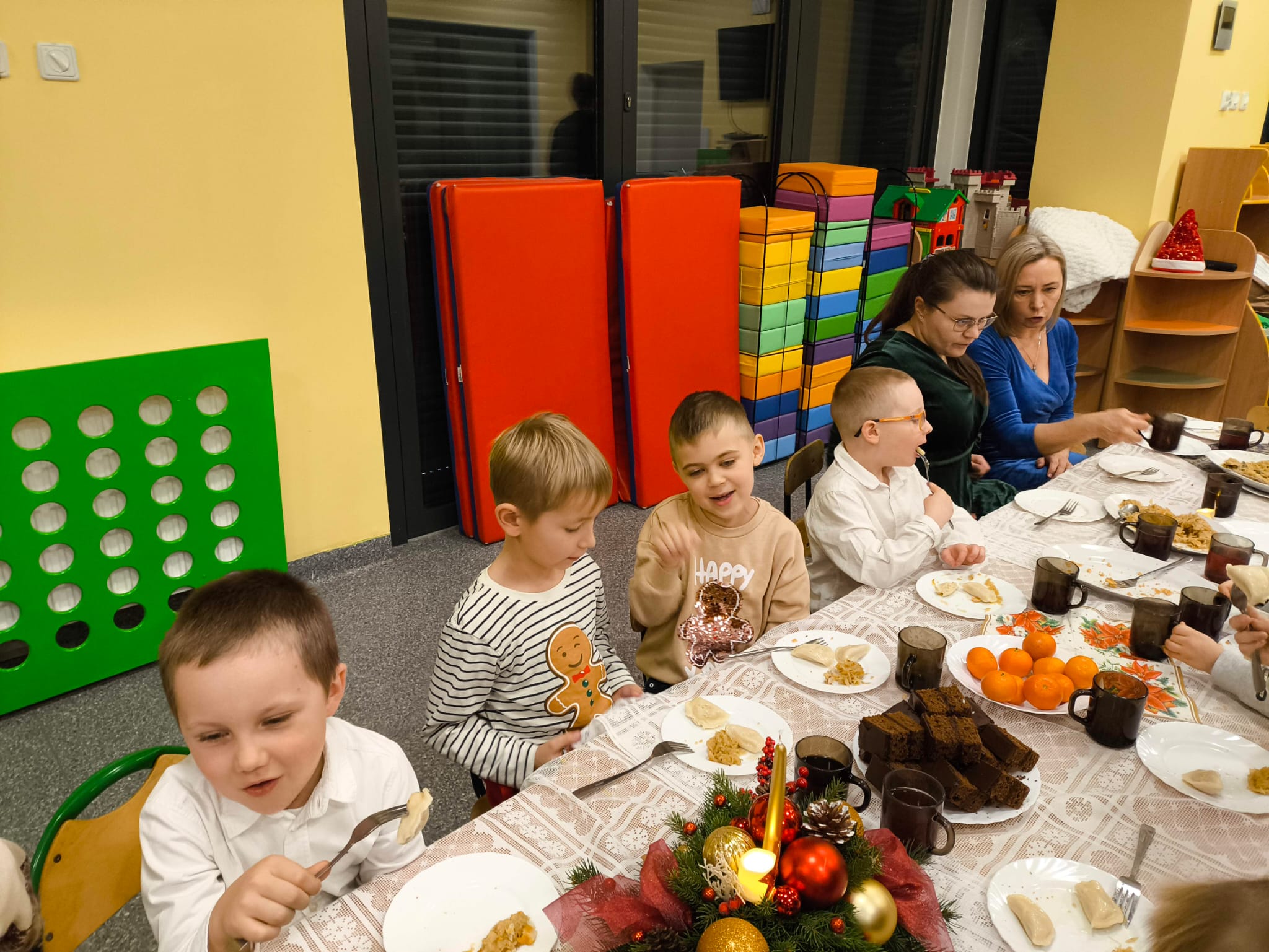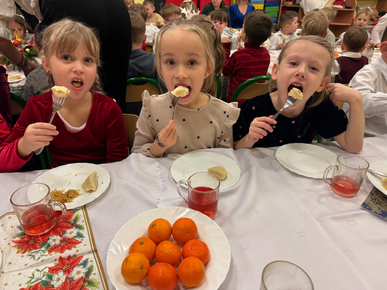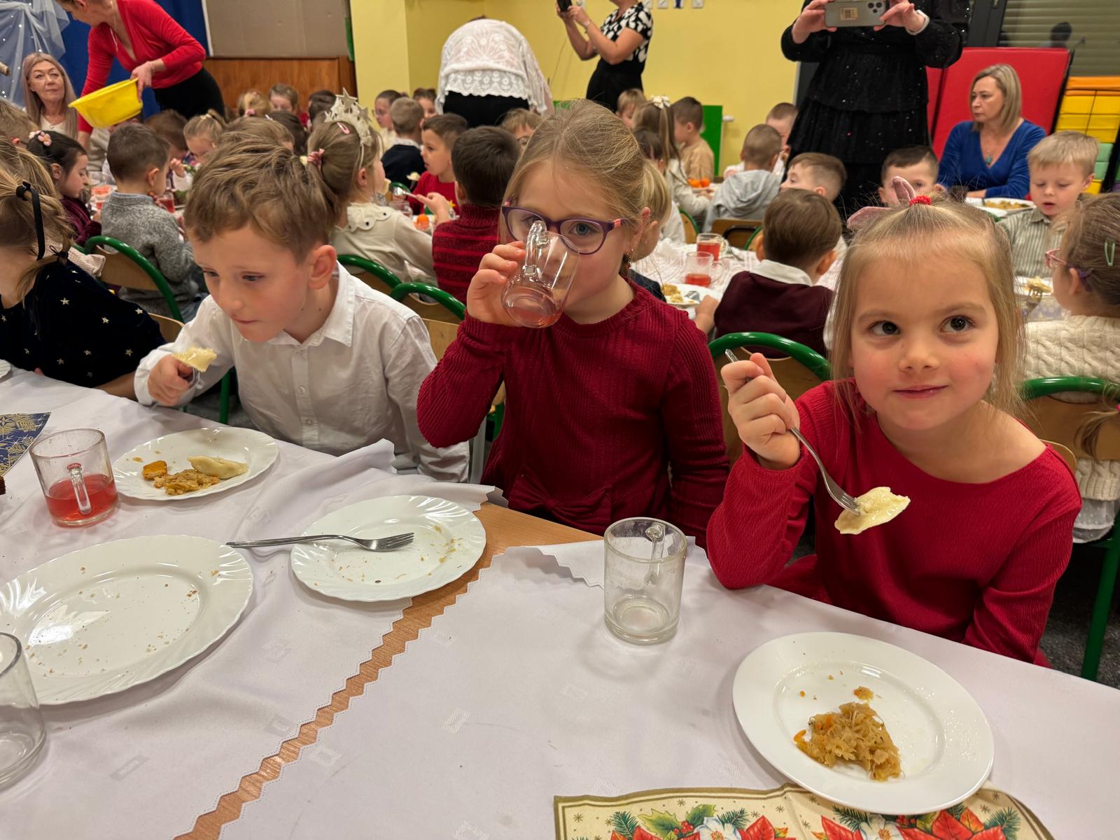 Po tej wzruszającej chwili zasiedliśmy do wspólnego stołu, by spróbować tradycyjnych potraw wigilijnych. Na naszych talerzach pojawił się aromatyczny barszcz biały, delikatne pierożki, świąteczna kapustka, smakowita rybka, a na deser — pachnący korzennymi przyprawami piernik, który dzieci zajadały z ogromną radością.