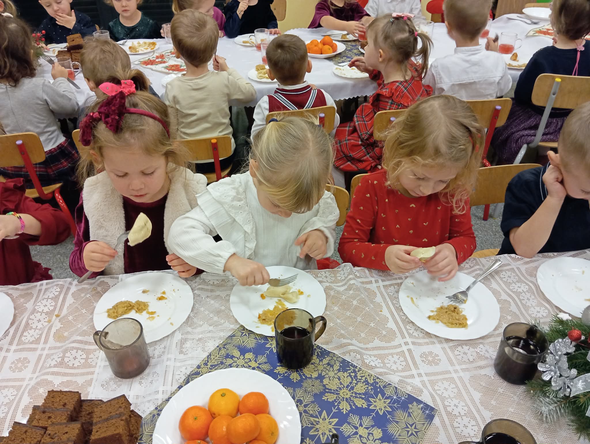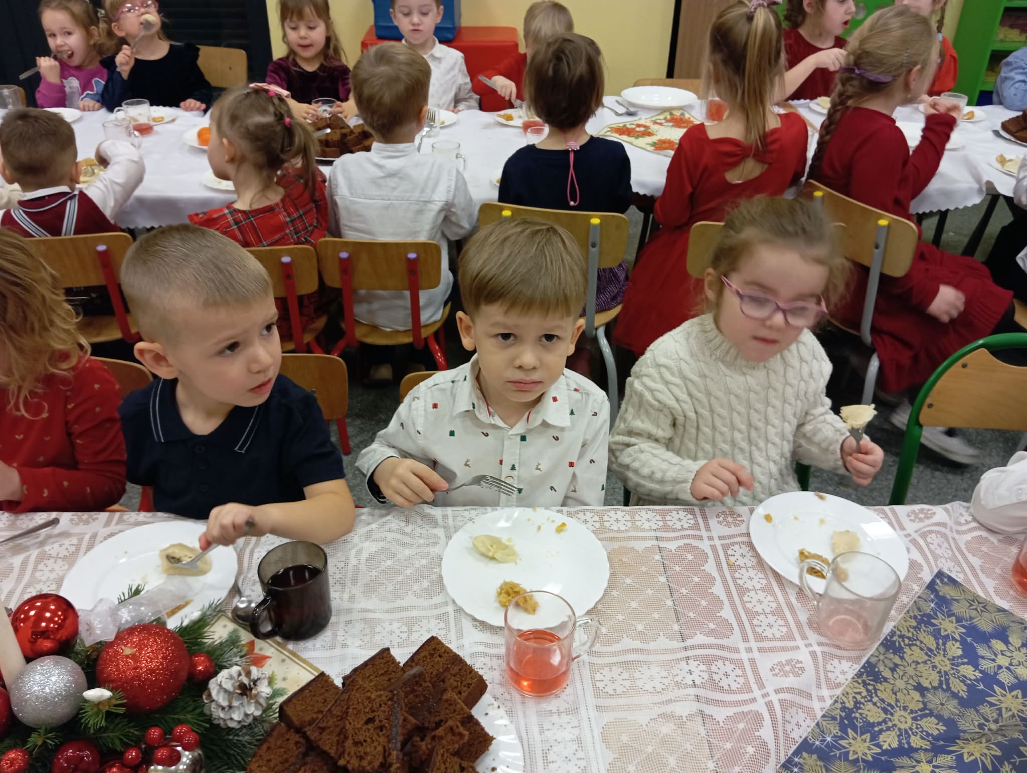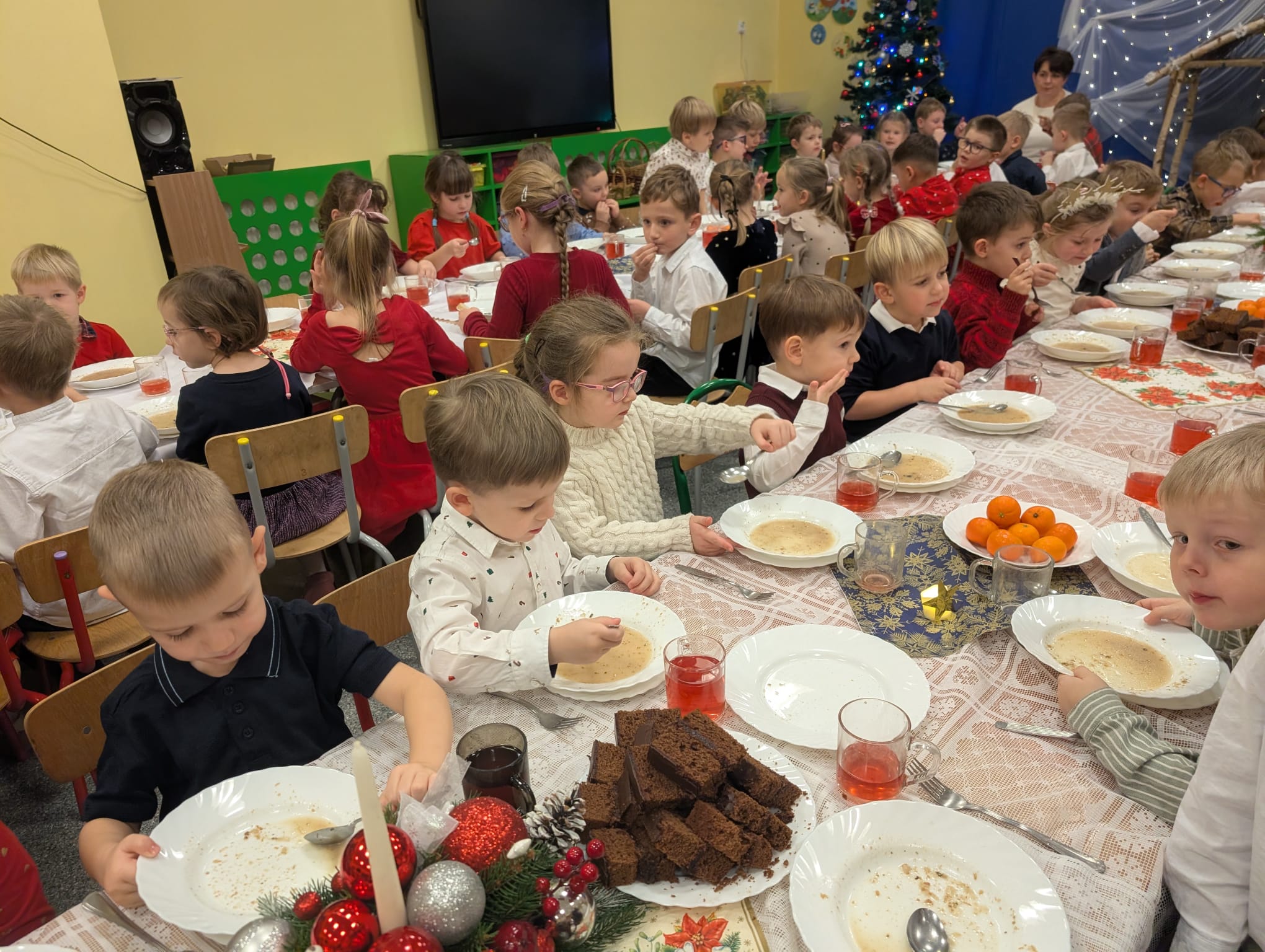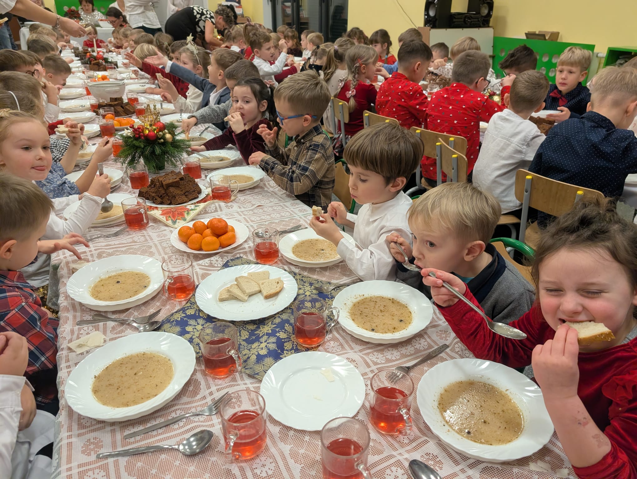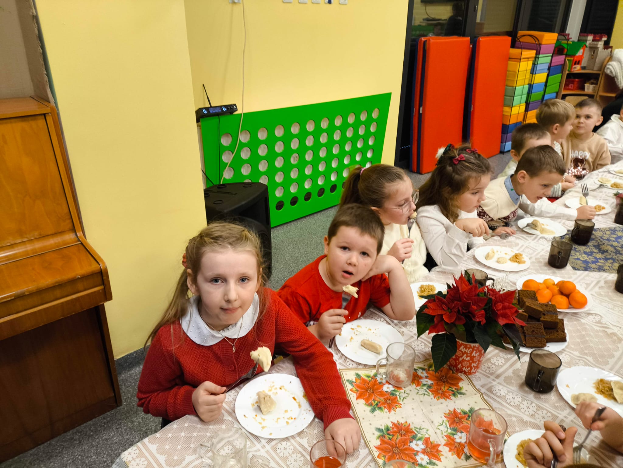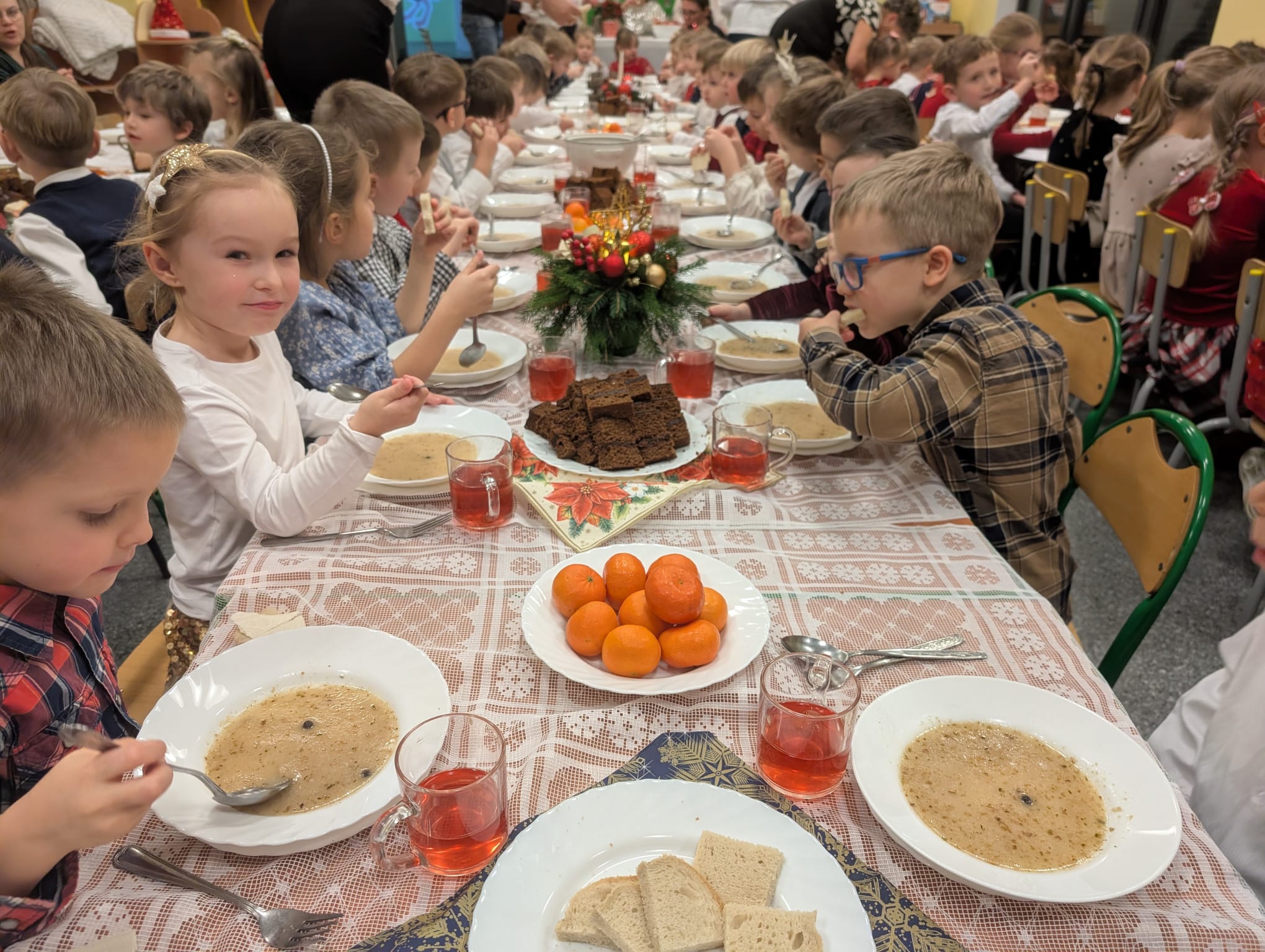 Po tej wzruszającej chwili zasiedliśmy do wspólnego stołu, by spróbować tradycyjnych potraw wigilijnych. Na naszych talerzach pojawił się aromatyczny barszcz biały, delikatne pierożki, świąteczna kapustka, smakowita rybka, a na deser — pachnący korzennymi przyprawami piernik, który dzieci zajadały z ogromną radością.