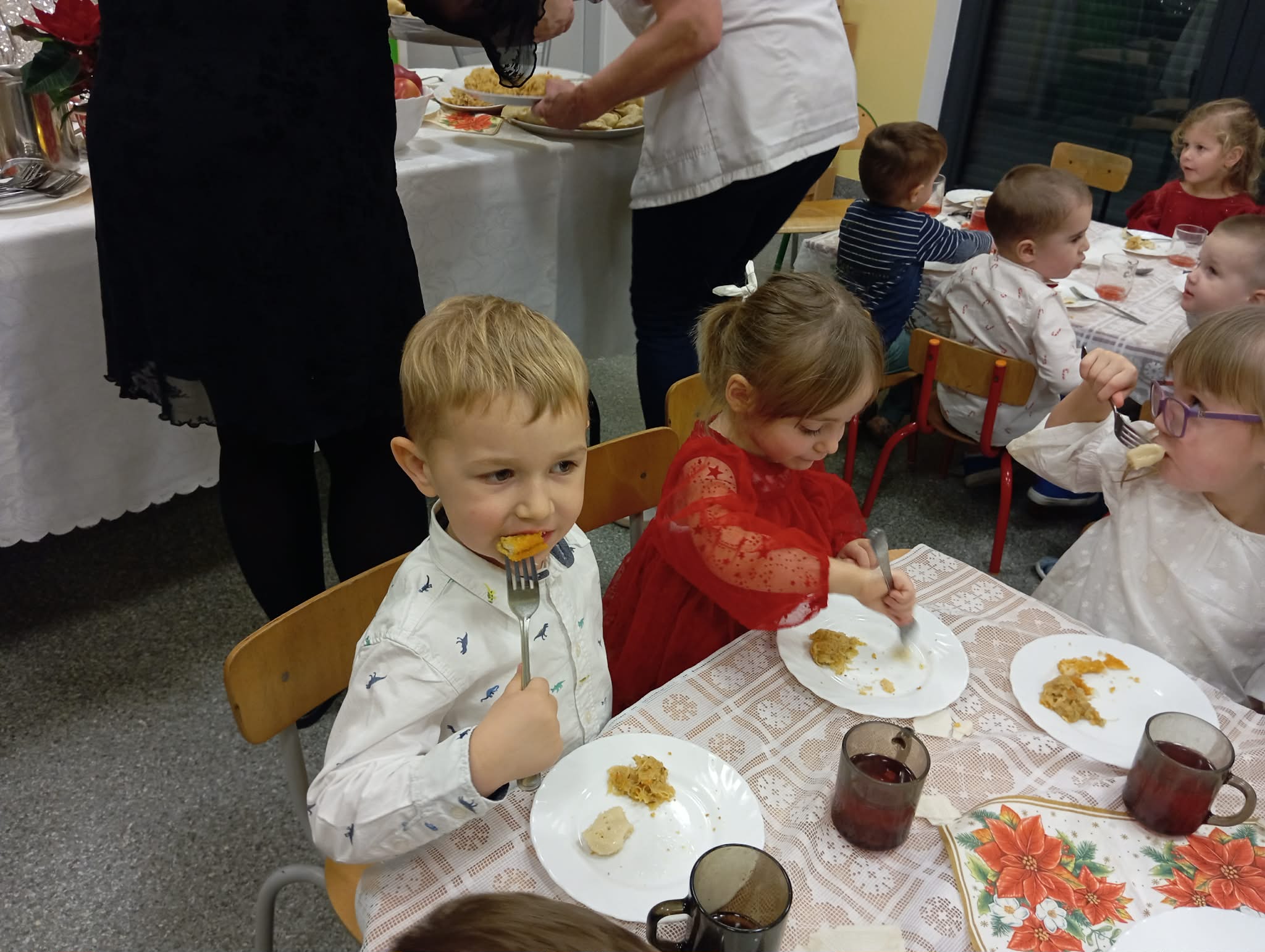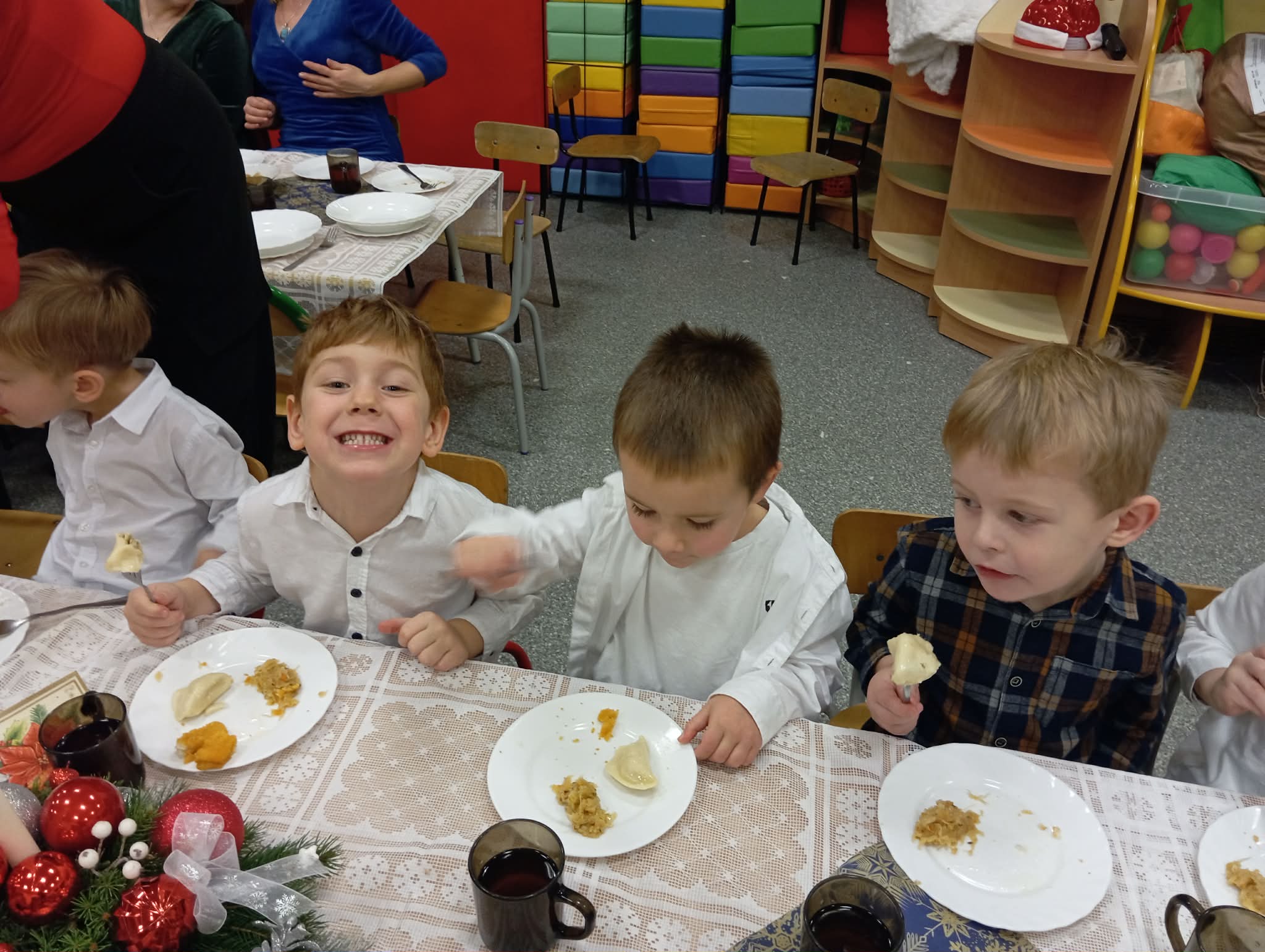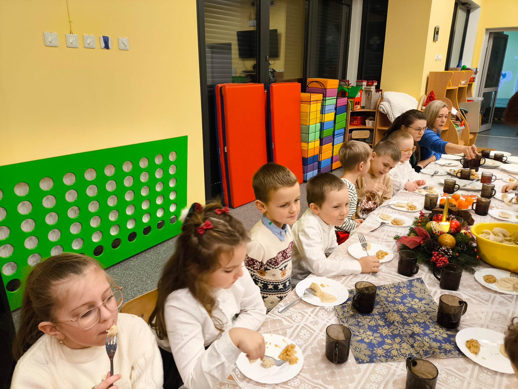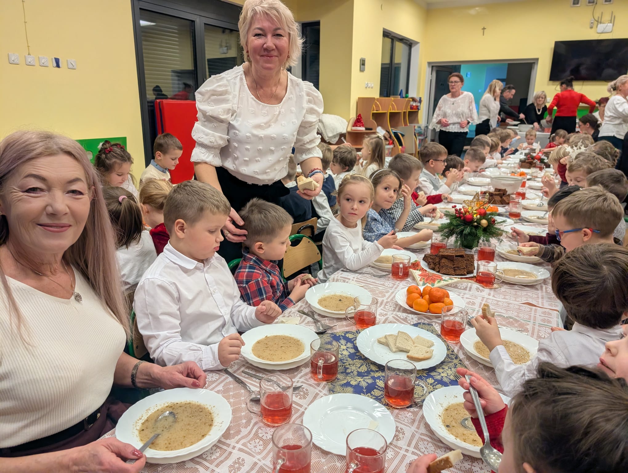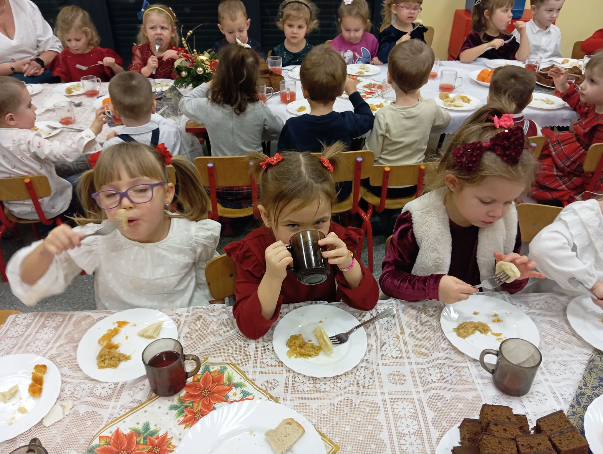 Po tej wzruszającej chwili zasiedliśmy do wspólnego stołu, by spróbować tradycyjnych potraw wigilijnych. Na naszych talerzach pojawił się aromatyczny barszcz biały, delikatne pierożki, świąteczna kapustka, smakowita rybka, a na deser — pachnący korzennymi przyprawami piernik, który dzieci zajadały z ogromną radością.