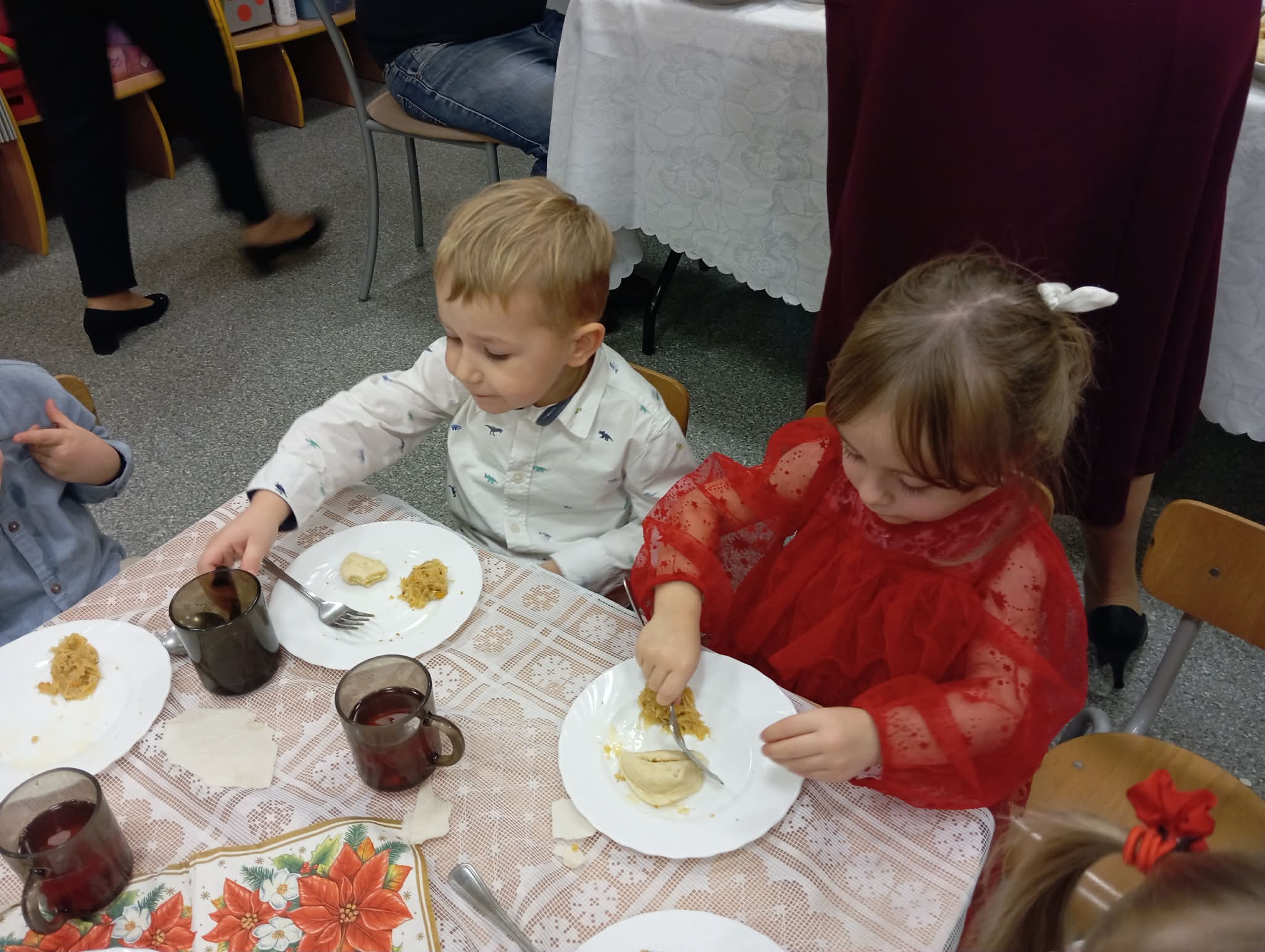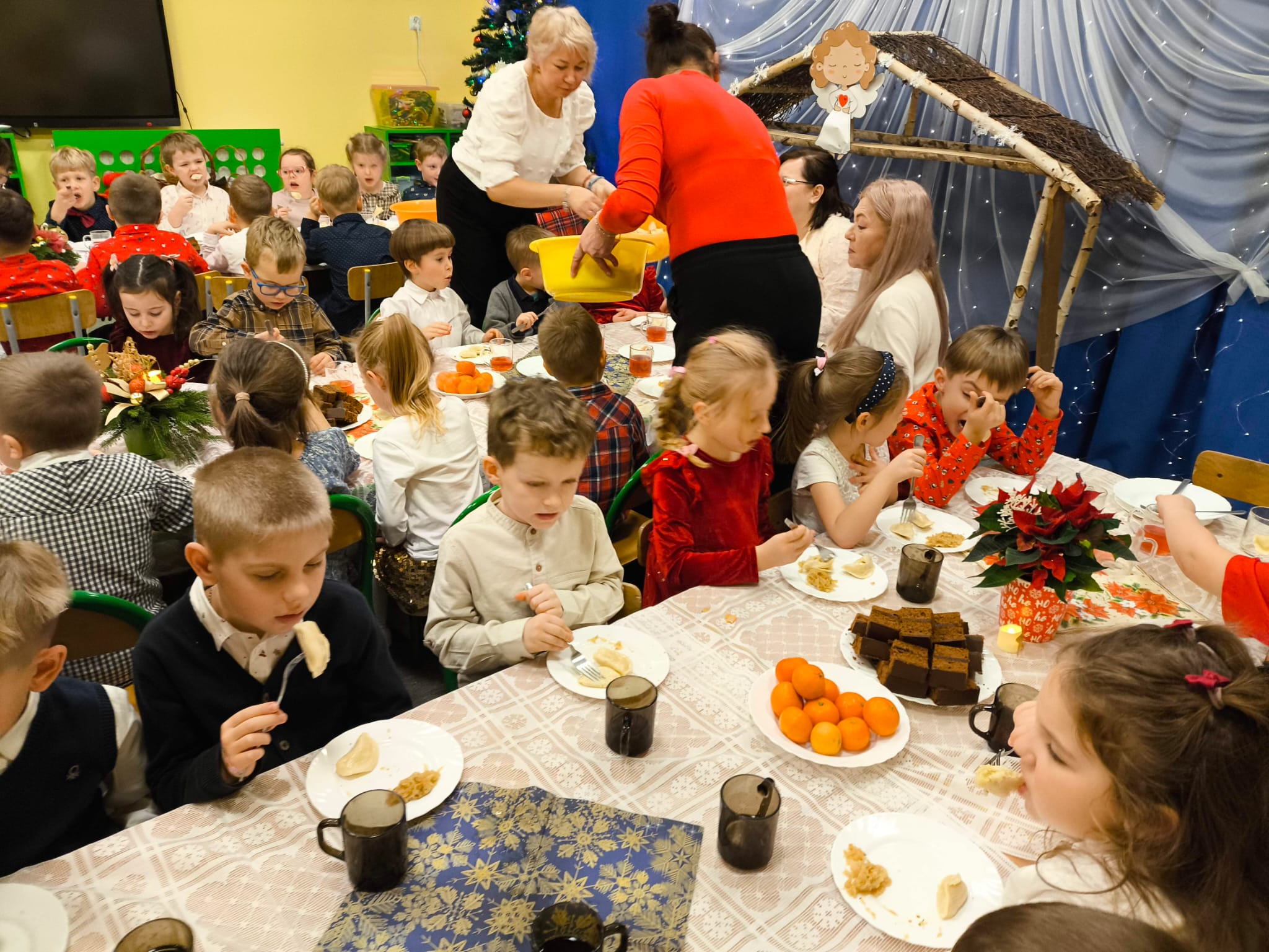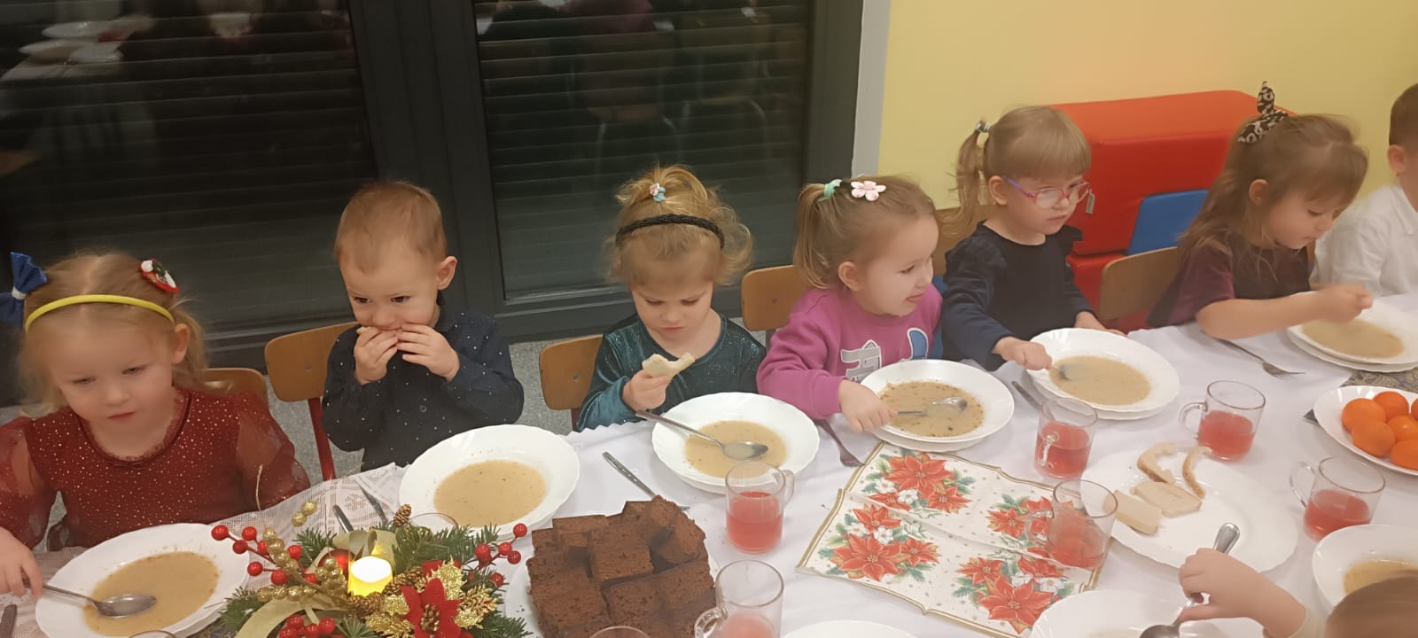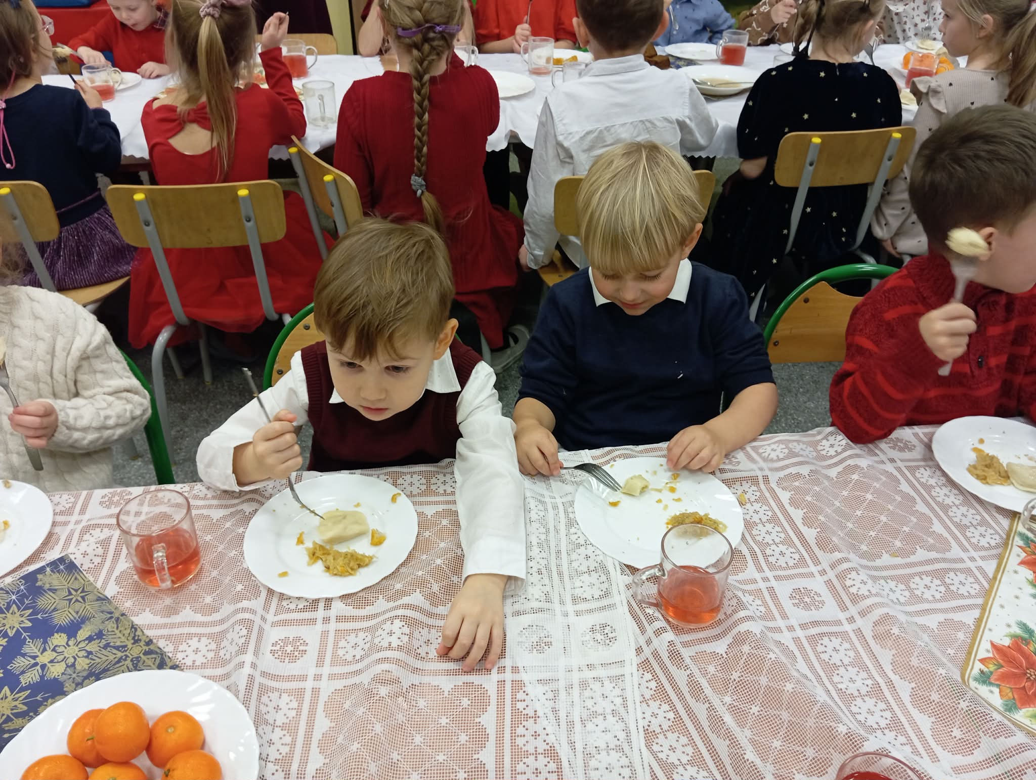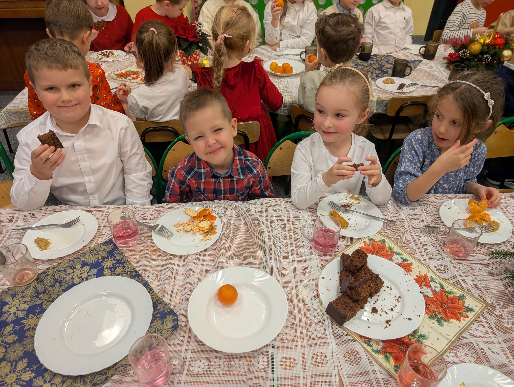 Po tej wzruszającej chwili zasiedliśmy do wspólnego stołu, by spróbować tradycyjnych potraw wigilijnych. Na naszych talerzach pojawił się aromatyczny barszcz biały, delikatne pierożki, świąteczna kapustka, smakowita rybka, a na deser — pachnący korzennymi przyprawami piernik, który dzieci zajadały z ogromną radością.