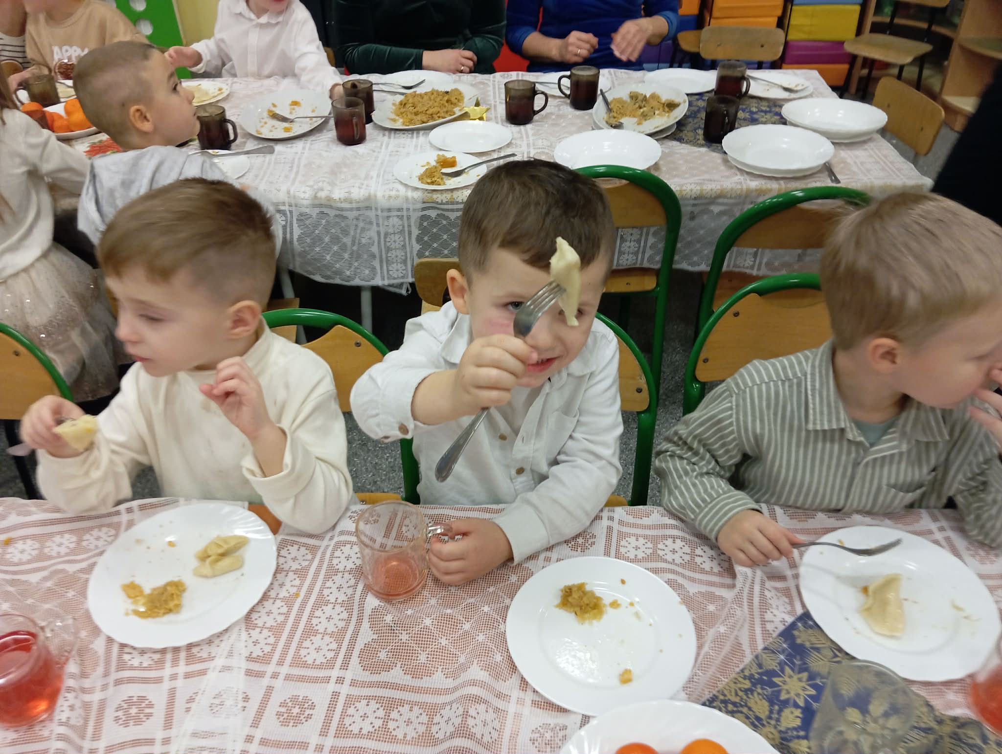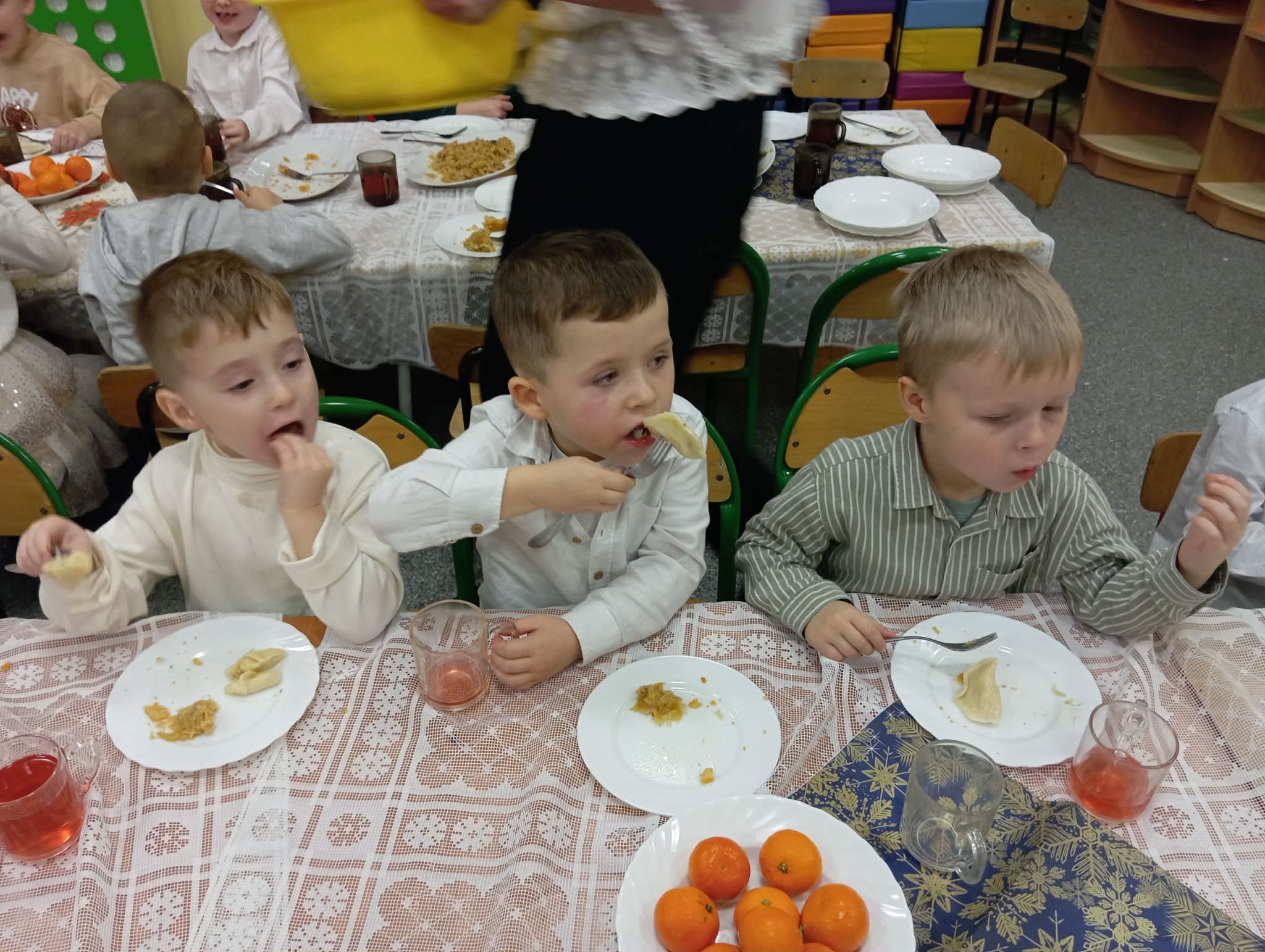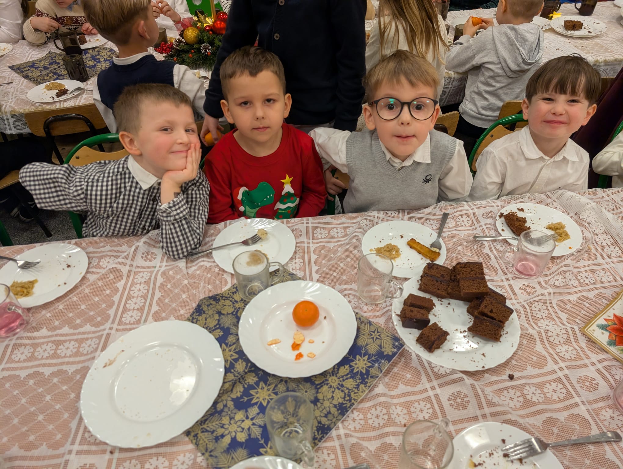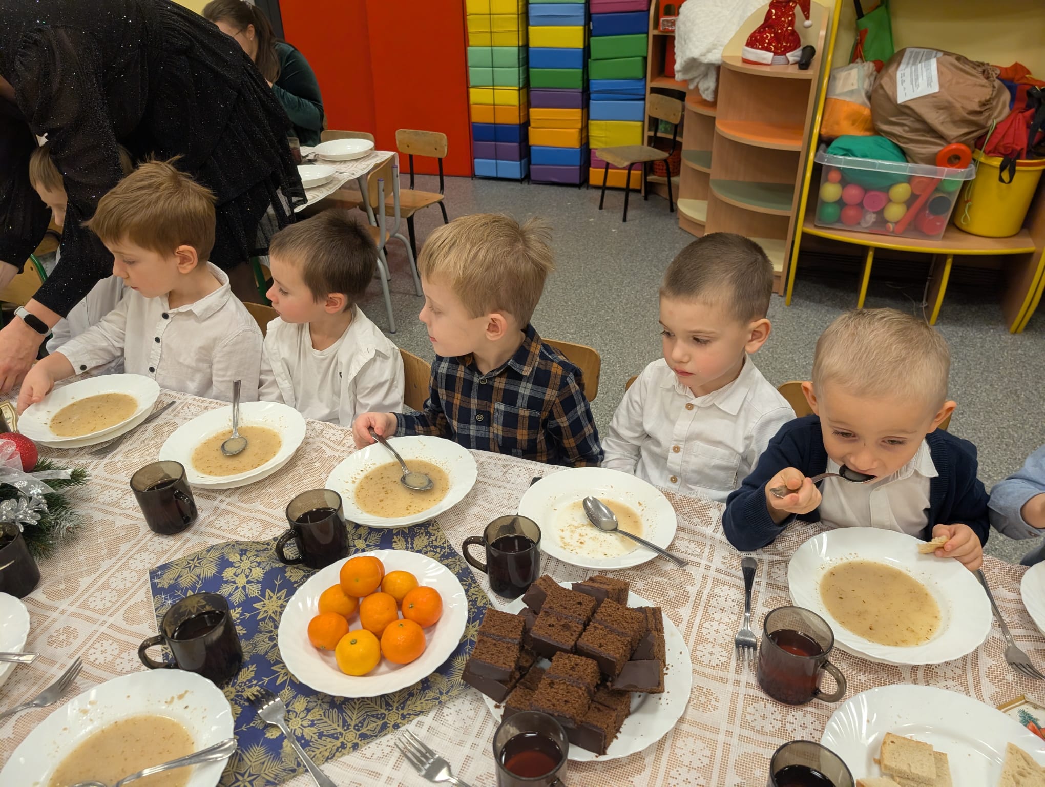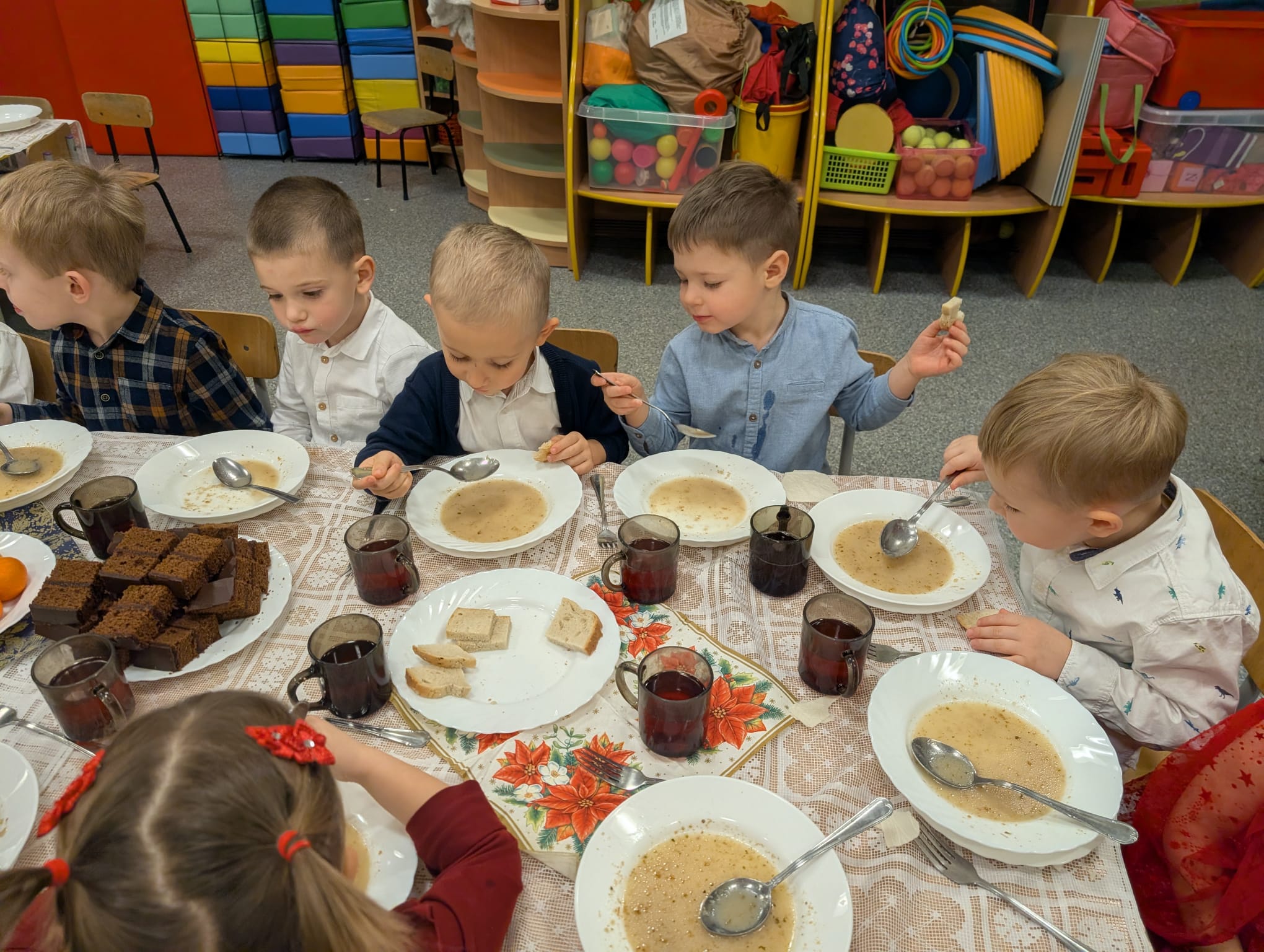 Po tej wzruszającej chwili zasiedliśmy do wspólnego stołu, by spróbować tradycyjnych potraw wigilijnych. Na naszych talerzach pojawił się aromatyczny barszcz biały, delikatne pierożki, świąteczna kapustka, smakowita rybka, a na deser — pachnący korzennymi przyprawami piernik, który dzieci zajadały z ogromną radością.