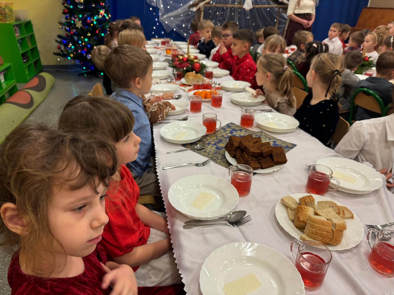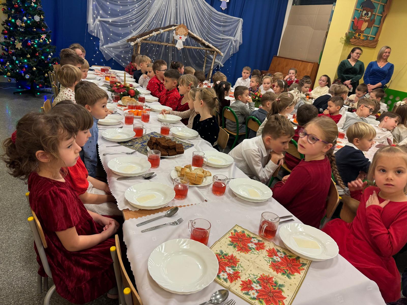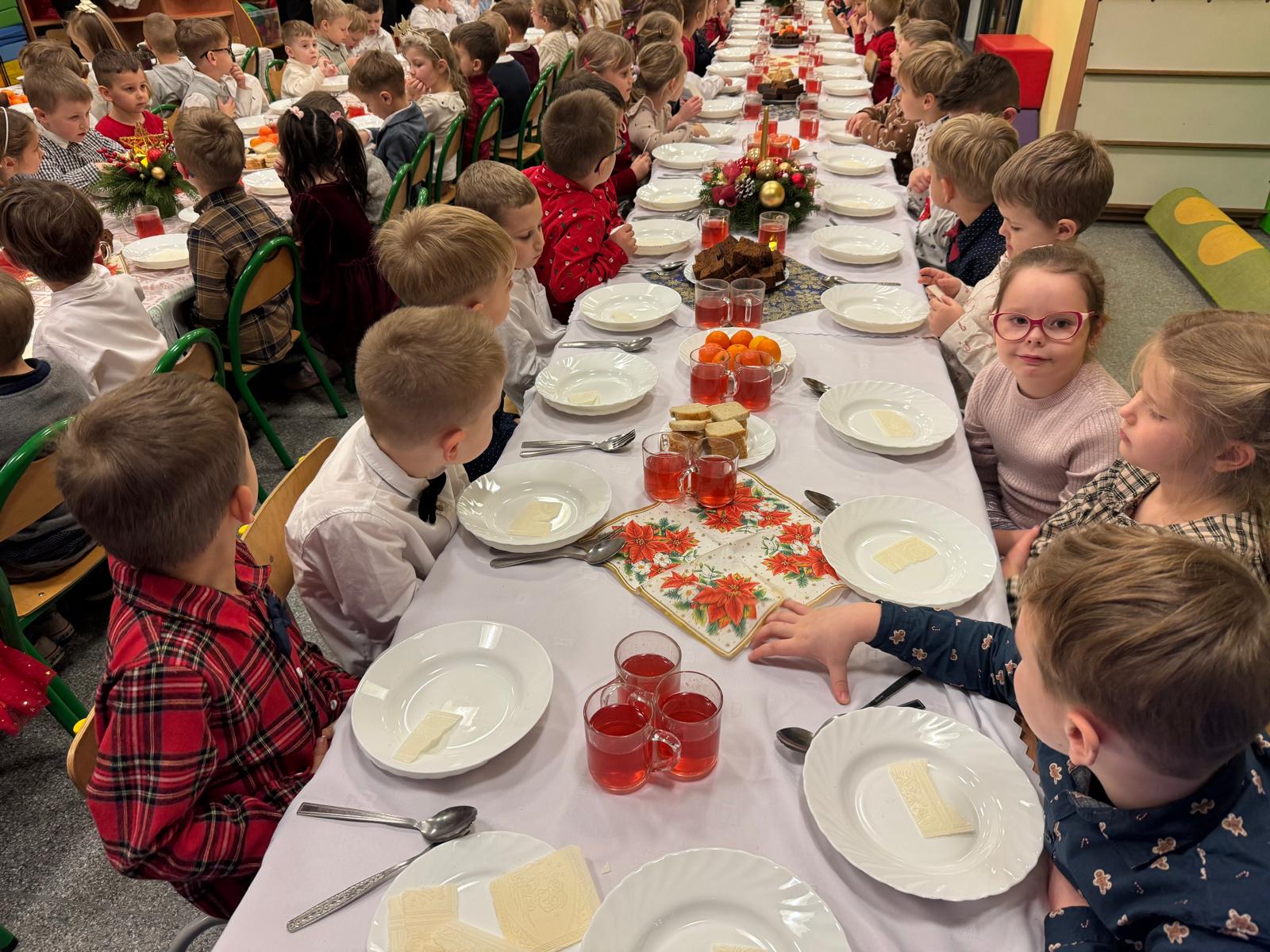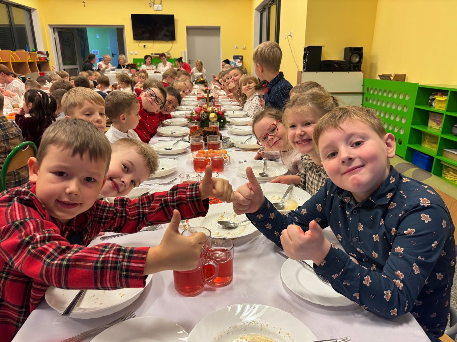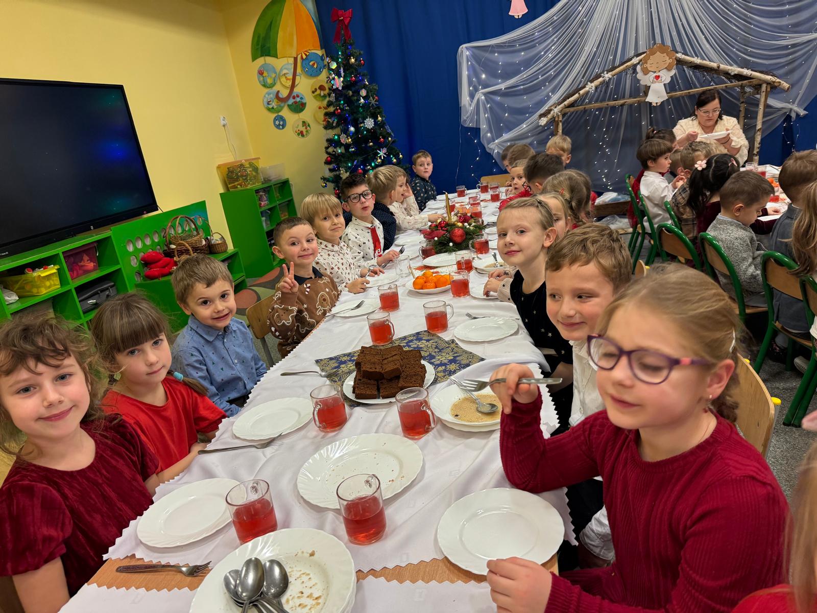 Przedszkolaki wniosły w to spotkanie mnóstwo uśmiechu, spontaniczności i ciepła. Ich rozmowy, śmiech i radosne oczekiwanie na święta sprawiły, że cała Wigilia nabrała jeszcze bardziej magicznego charakteru. Był to czas pełen bliskości, wzruszeń i wspólnego przeżywania świątecznej tradycji, która łączy nas wszystkich.