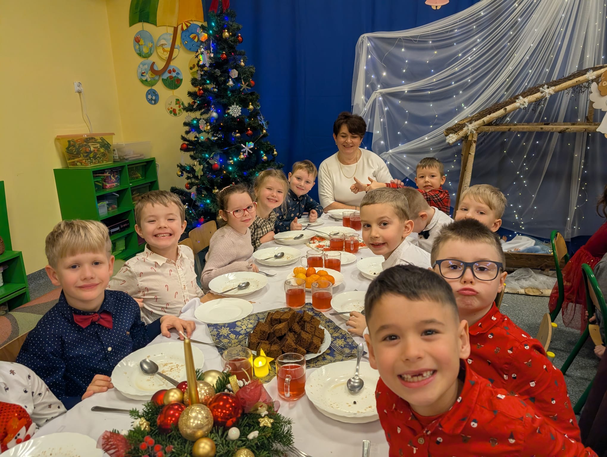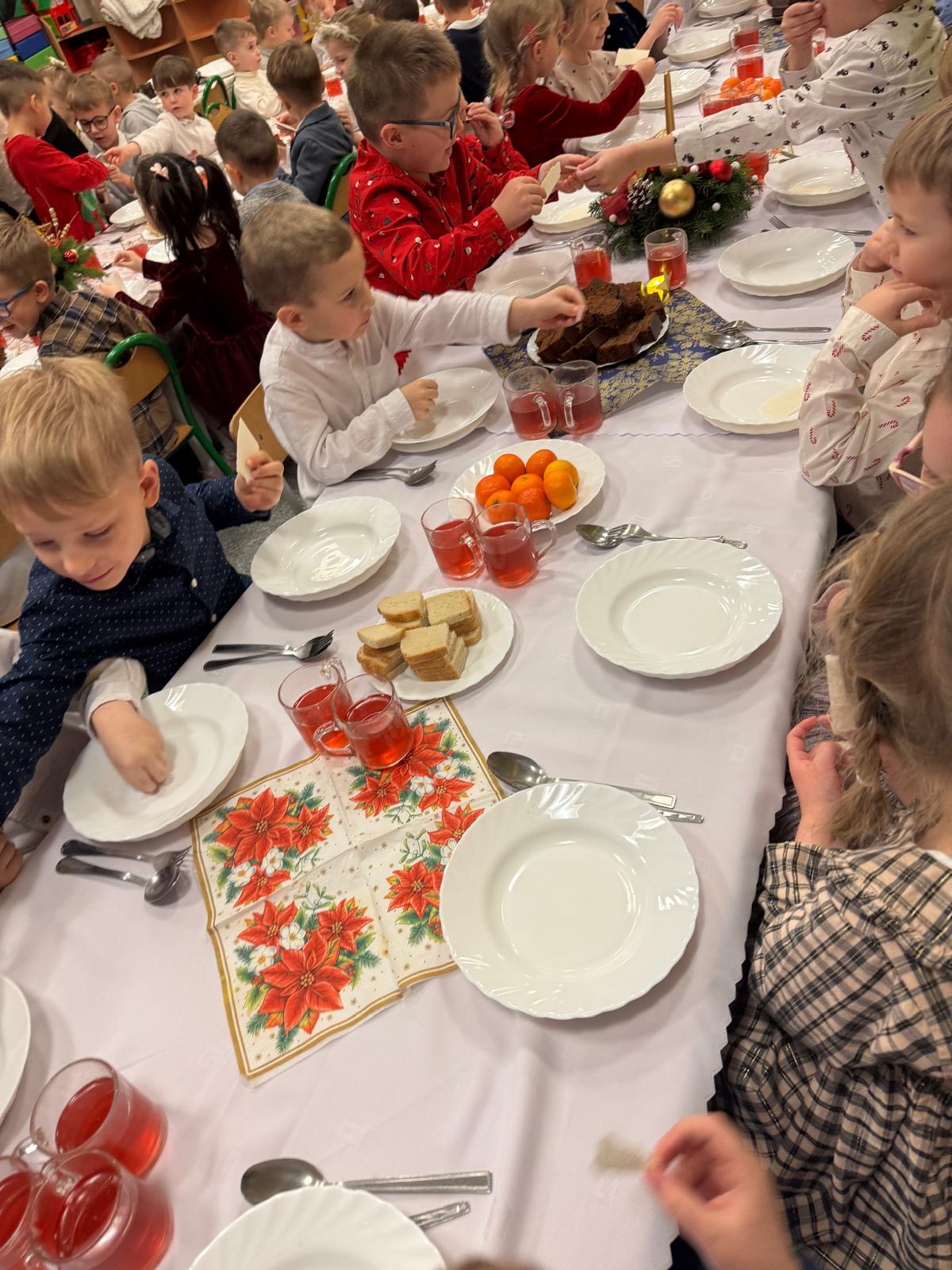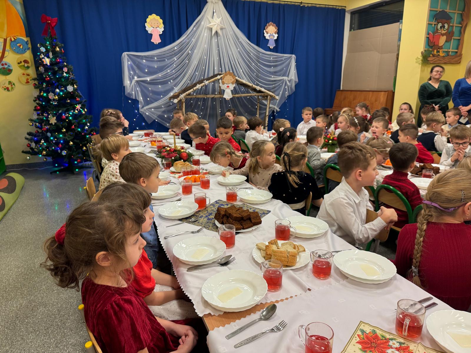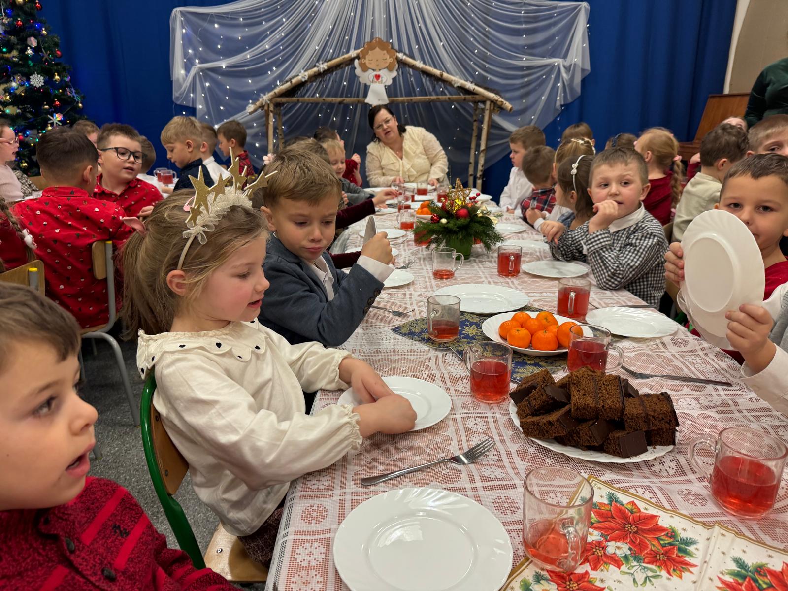 Przedszkolaki wniosły w to spotkanie mnóstwo uśmiechu, spontaniczności i ciepła. Ich rozmowy, śmiech i radosne oczekiwanie na święta sprawiły, że cała Wigilia nabrała jeszcze bardziej magicznego charakteru. Był to czas pełen bliskości, wzruszeń i wspólnego przeżywania świątecznej tradycji, która łączy nas wszystkich.