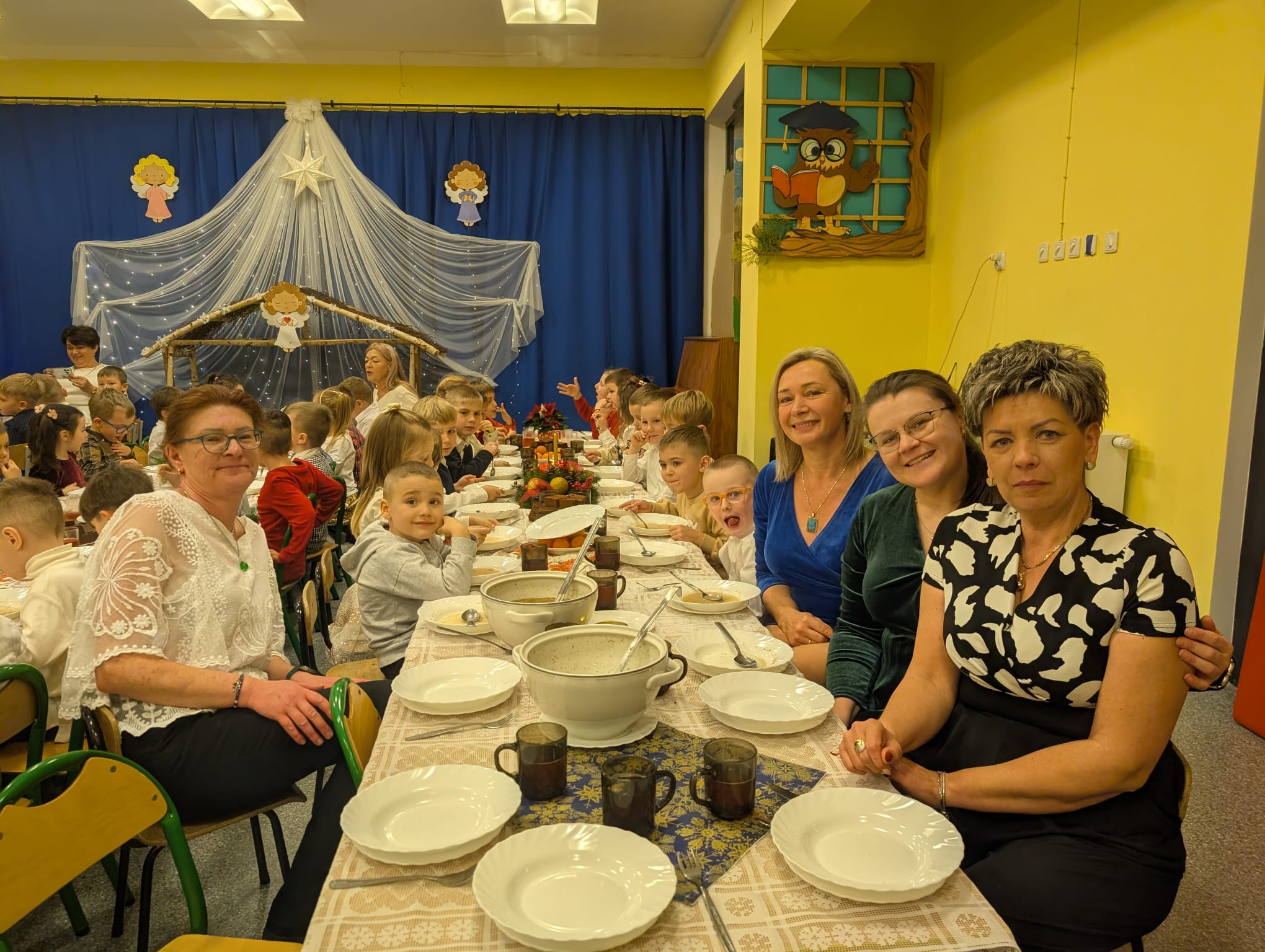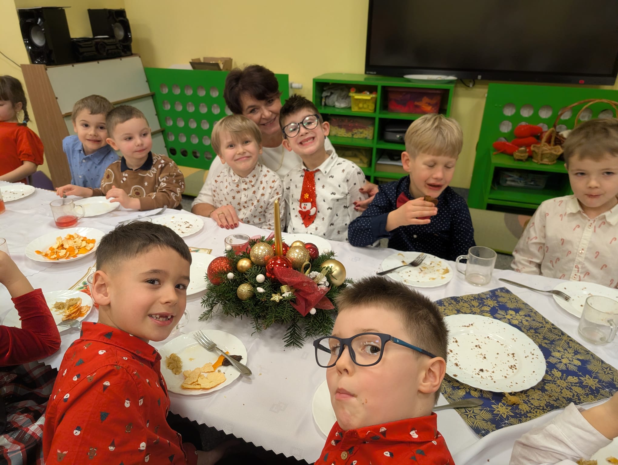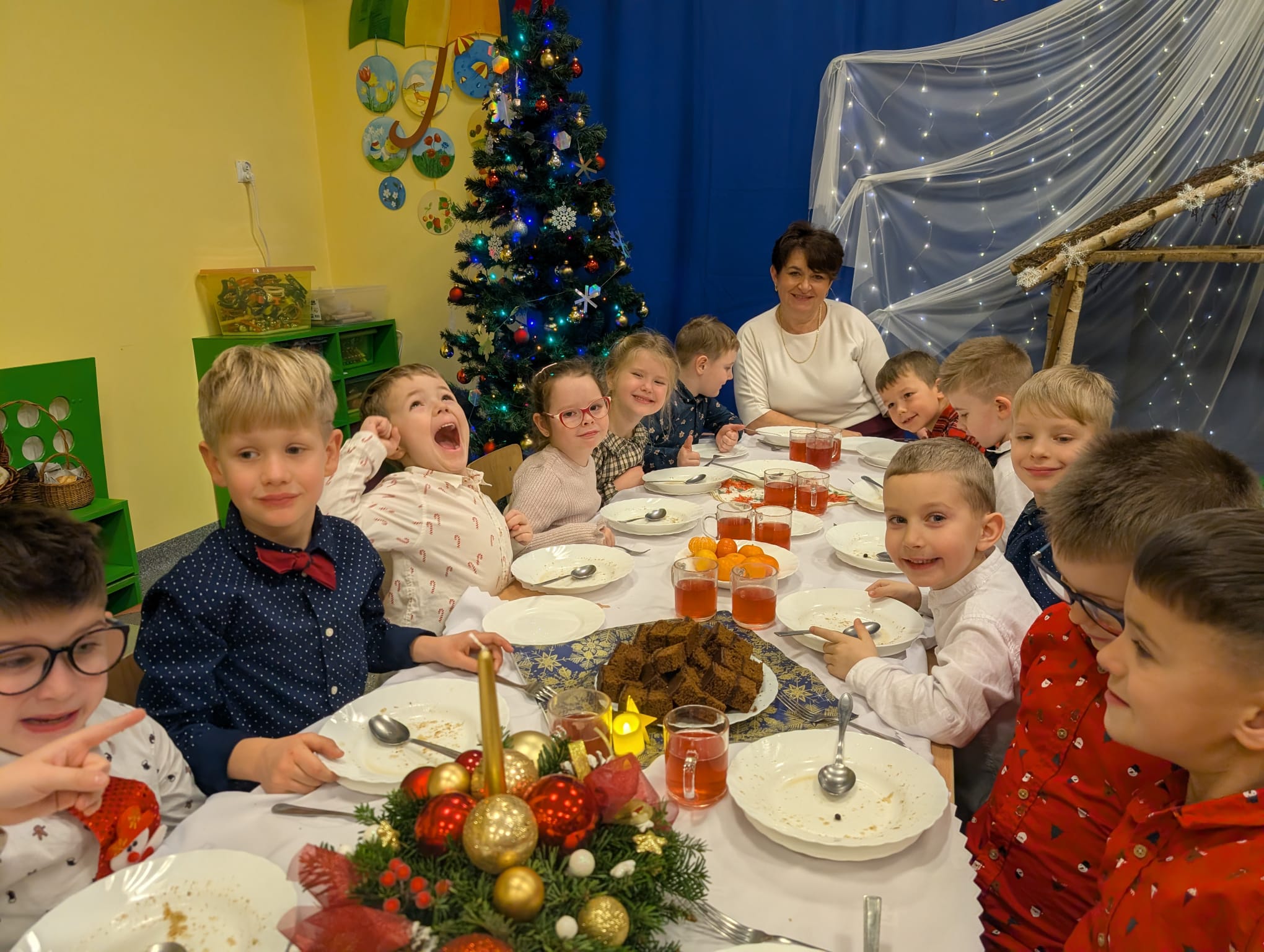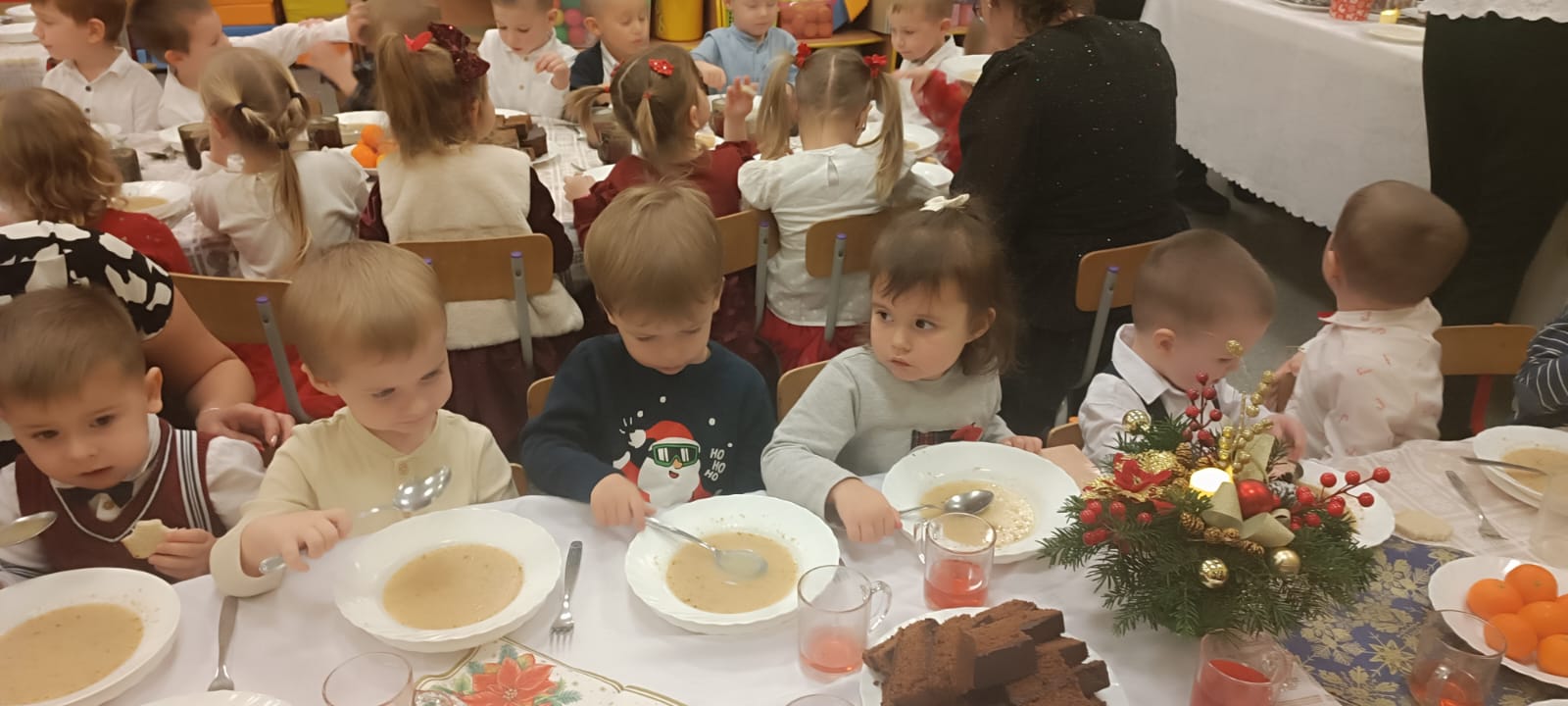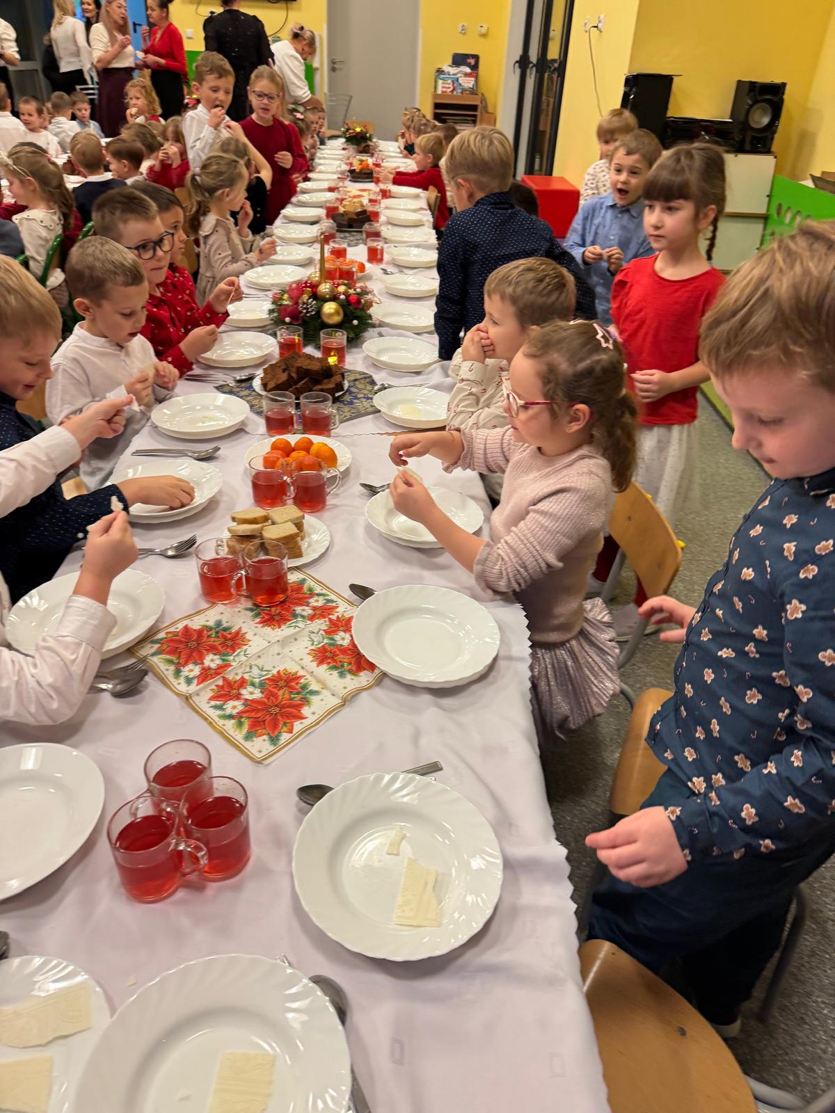 Przedszkolaki wniosły w to spotkanie mnóstwo uśmiechu, spontaniczności i ciepła. Ich rozmowy, śmiech i radosne oczekiwanie na święta sprawiły, że cała Wigilia nabrała jeszcze bardziej magicznego charakteru. Był to czas pełen bliskości, wzruszeń i wspólnego przeżywania świątecznej tradycji, która łączy nas wszystkich.