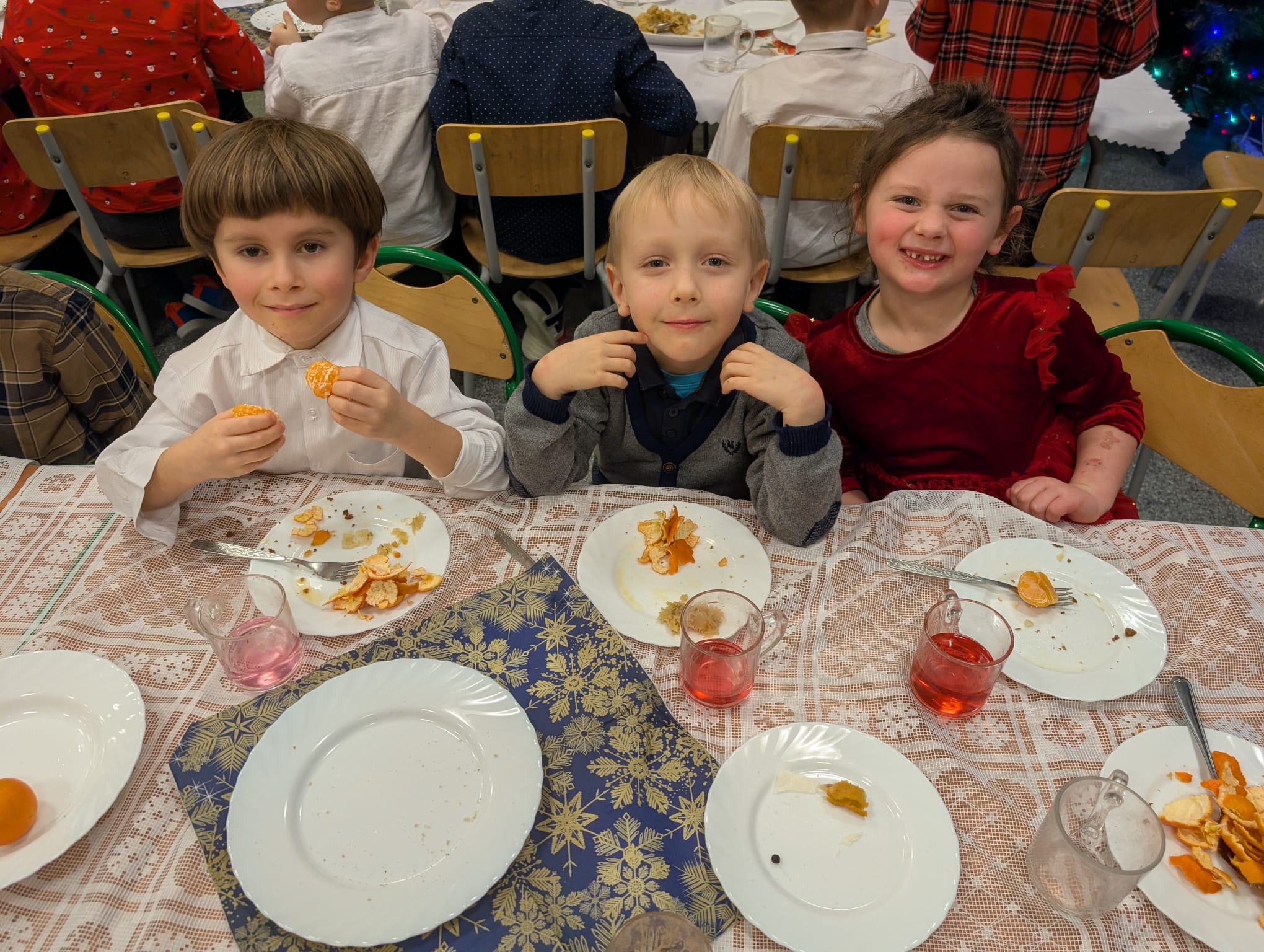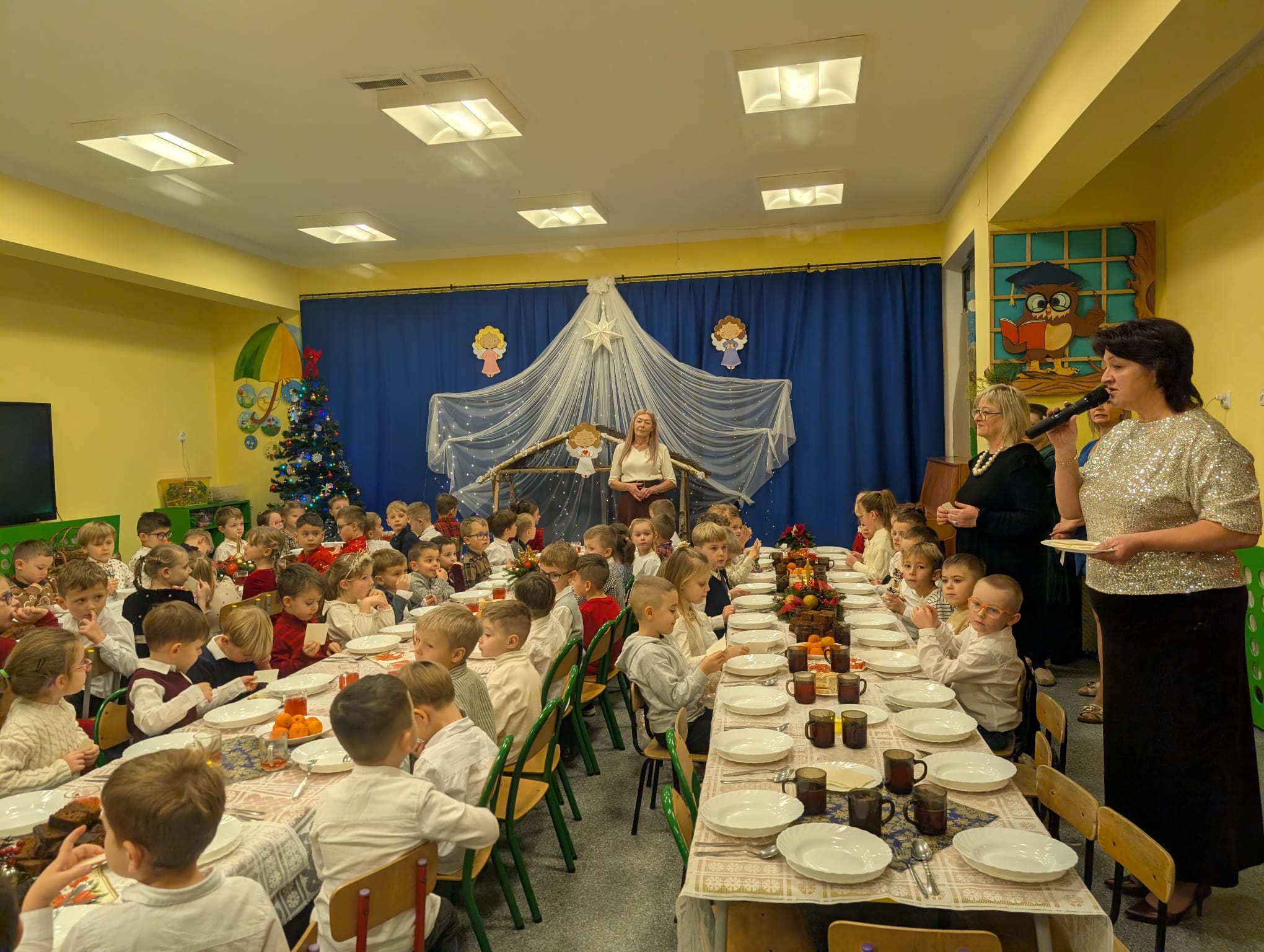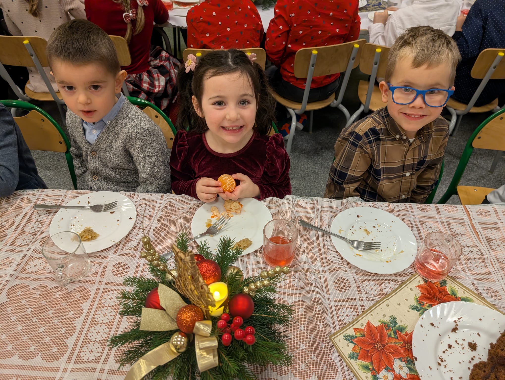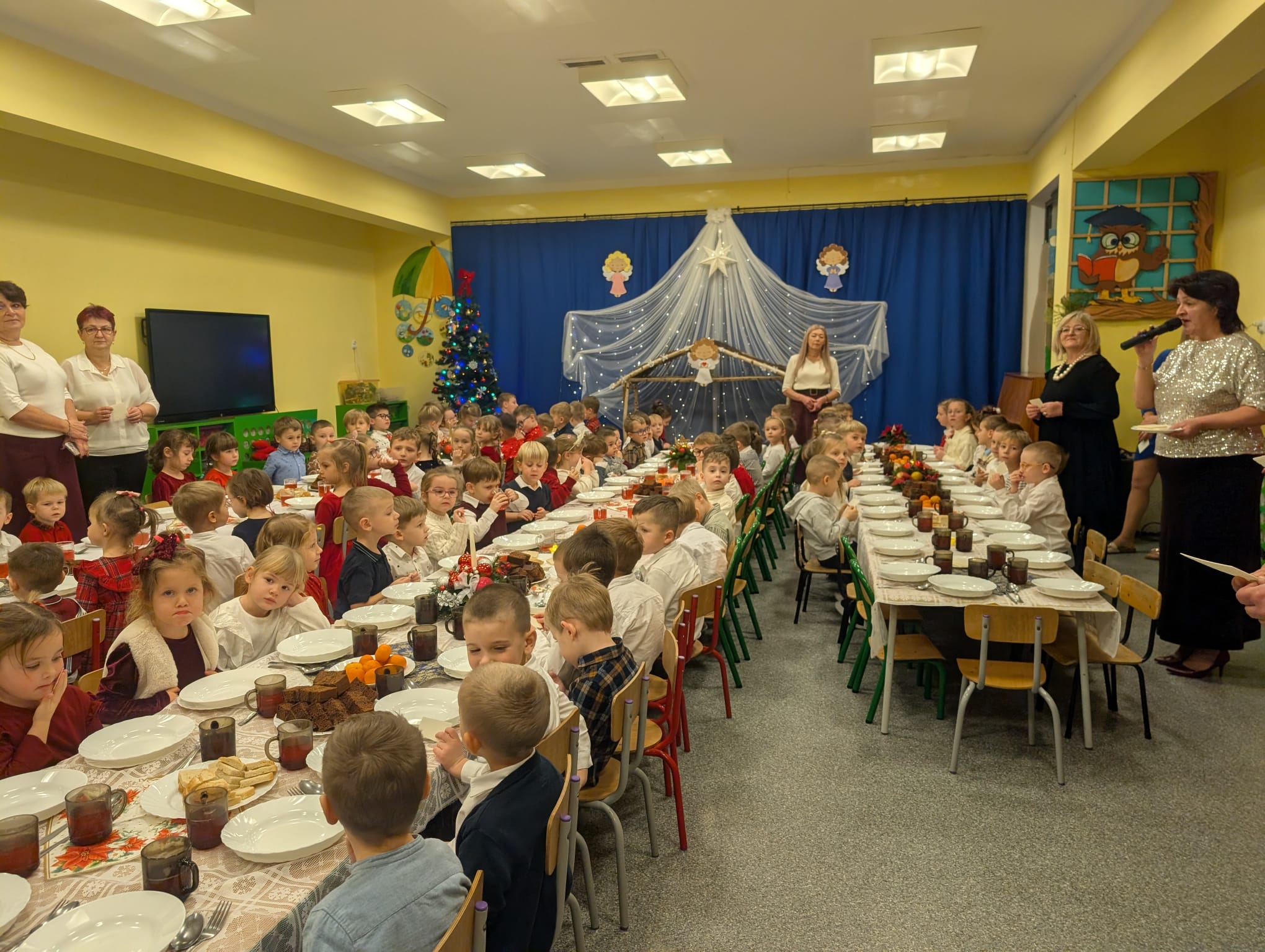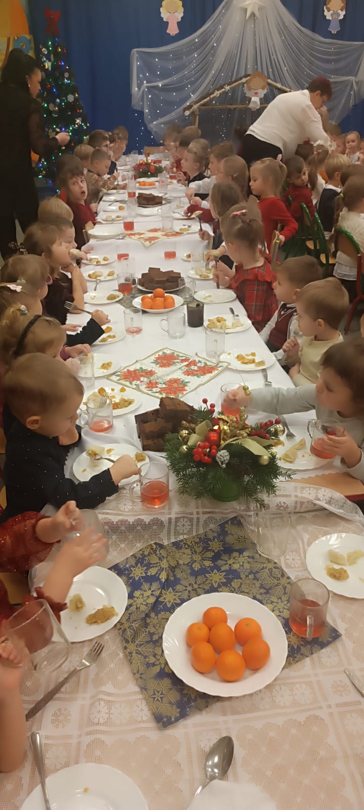 Przedszkolaki wniosły w to spotkanie mnóstwo uśmiechu, spontaniczności i ciepła. Ich rozmowy, śmiech i radosne oczekiwanie na święta sprawiły, że cała Wigilia nabrała jeszcze bardziej magicznego charakteru. Był to czas pełen bliskości, wzruszeń i wspólnego przeżywania świątecznej tradycji, która łączy nas wszystkich.