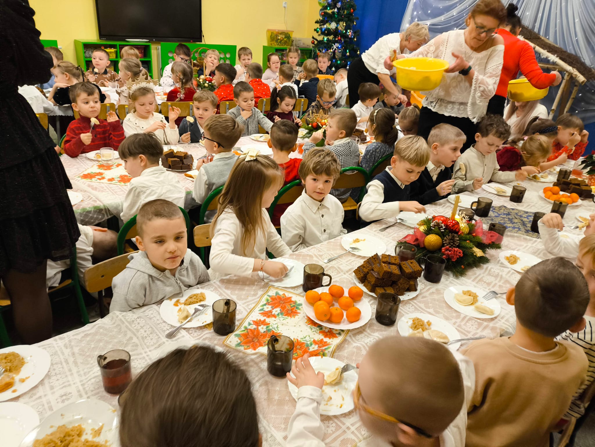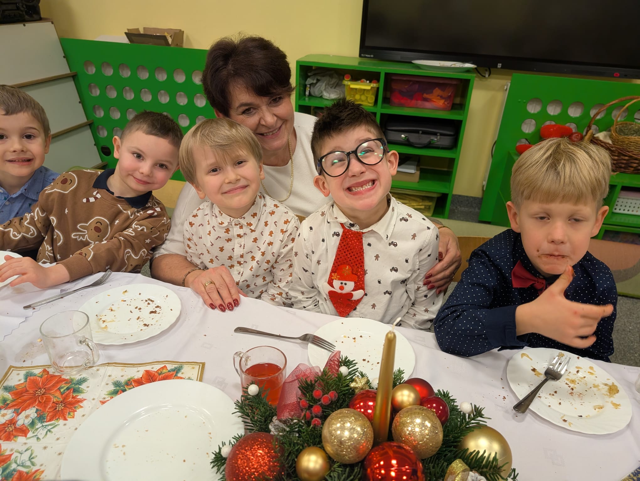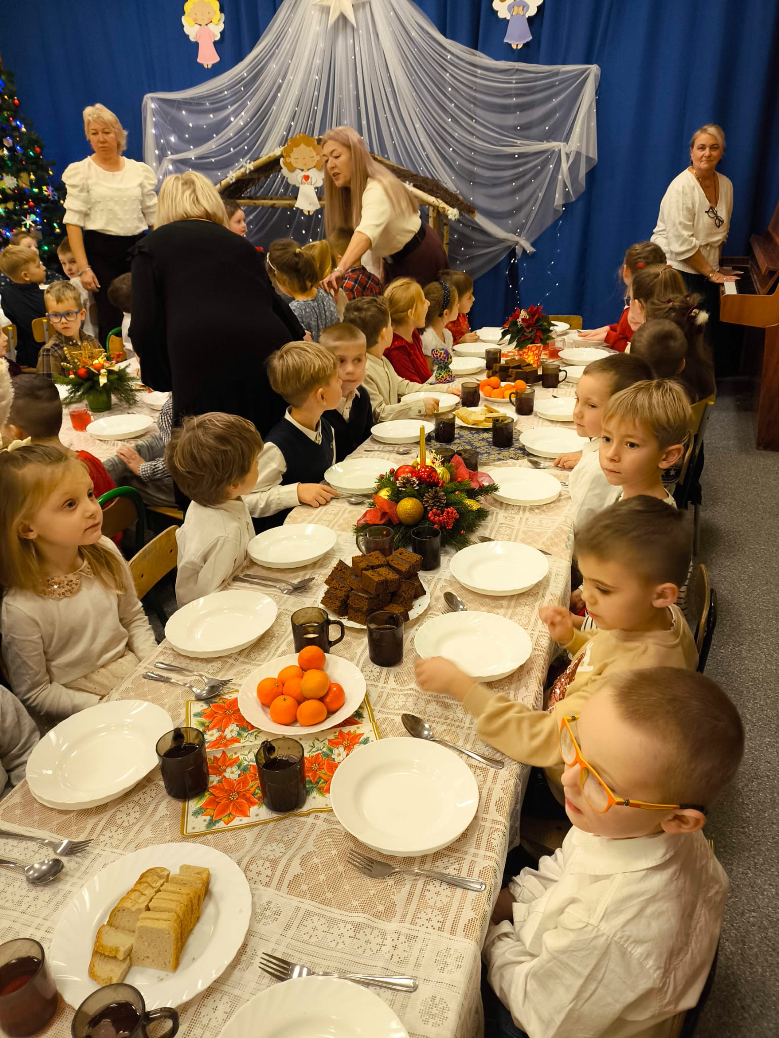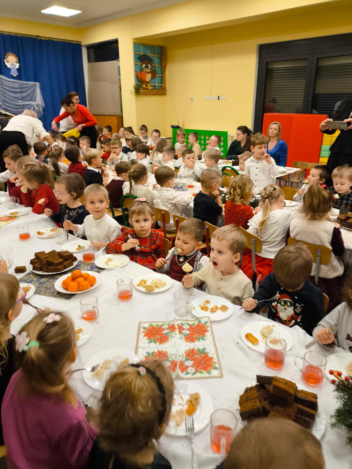 Przedszkolaki wniosły w to spotkanie mnóstwo uśmiechu, spontaniczności i ciepła. Ich rozmowy, śmiech i radosne oczekiwanie na święta sprawiły, że cała Wigilia nabrała jeszcze bardziej magicznego charakteru. Był to czas pełen bliskości, wzruszeń i wspólnego przeżywania świątecznej tradycji, która łączy nas wszystkich.